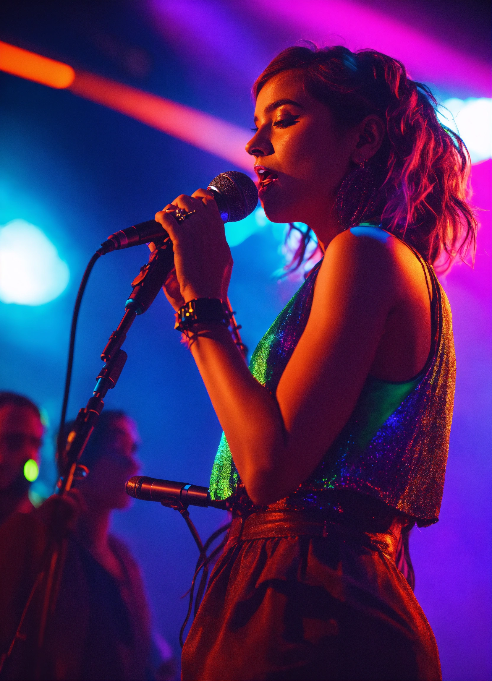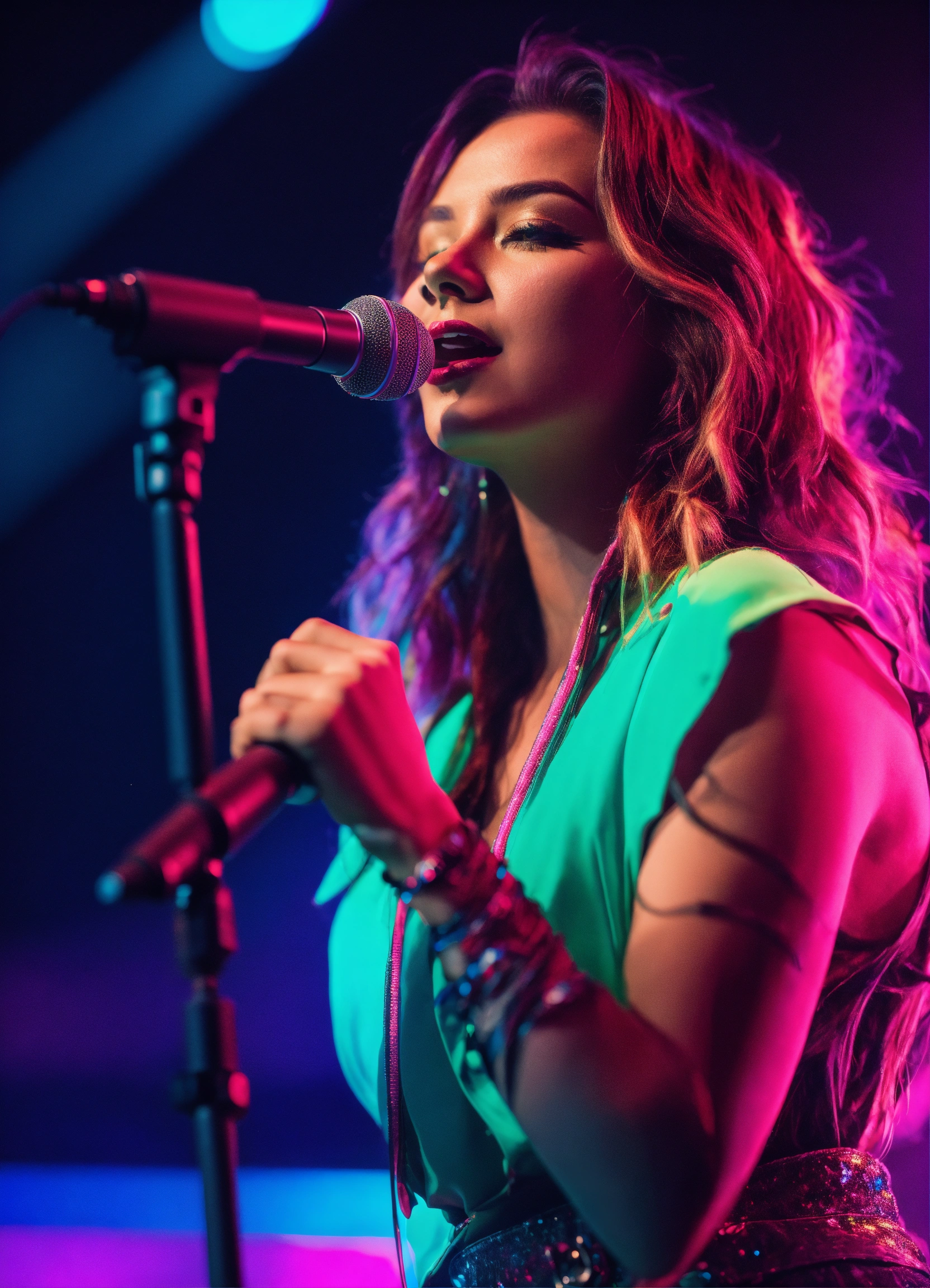 Cinematic photography, modern, female singer on stage performing, neon colors, realistic details, ultra 8k resolution