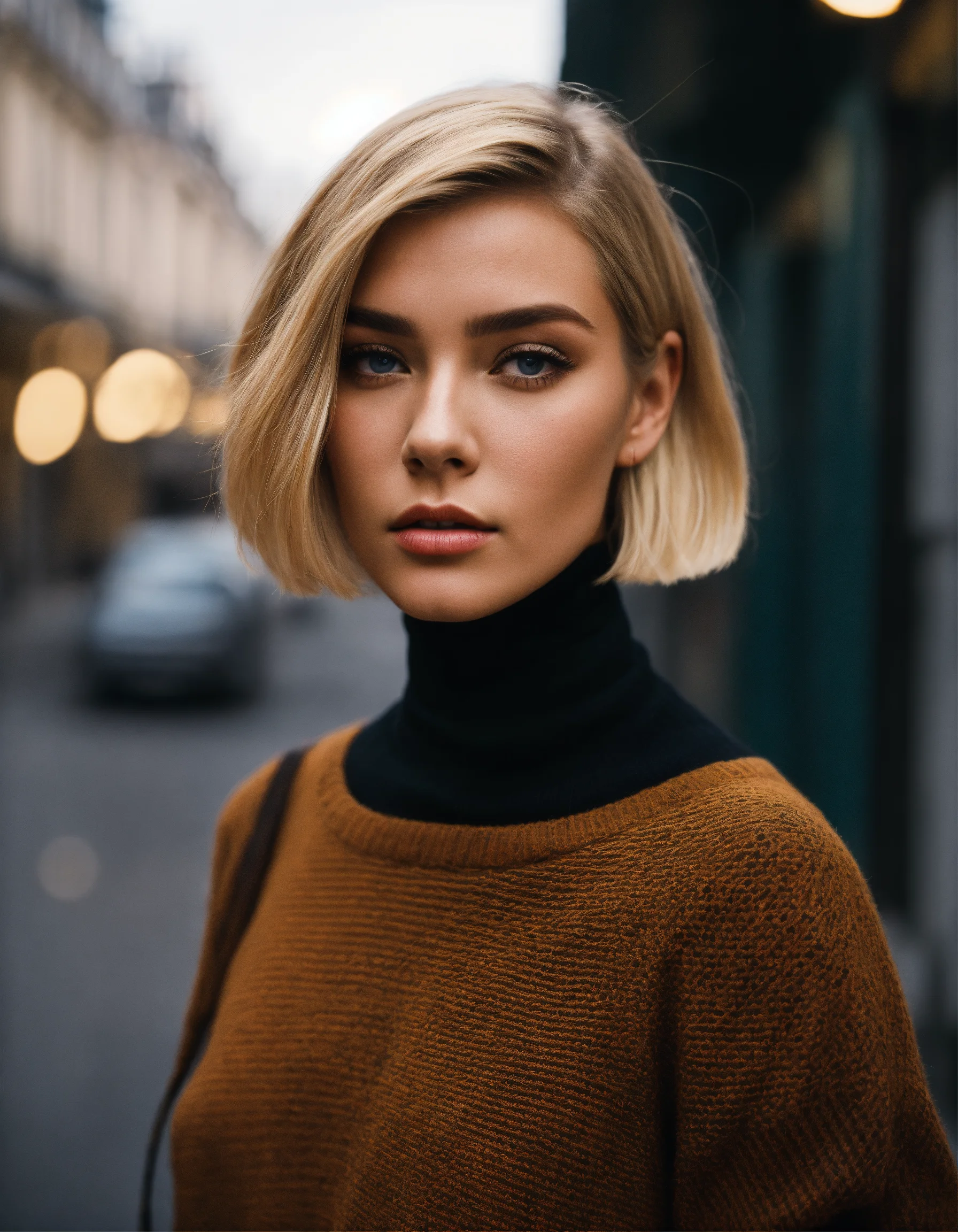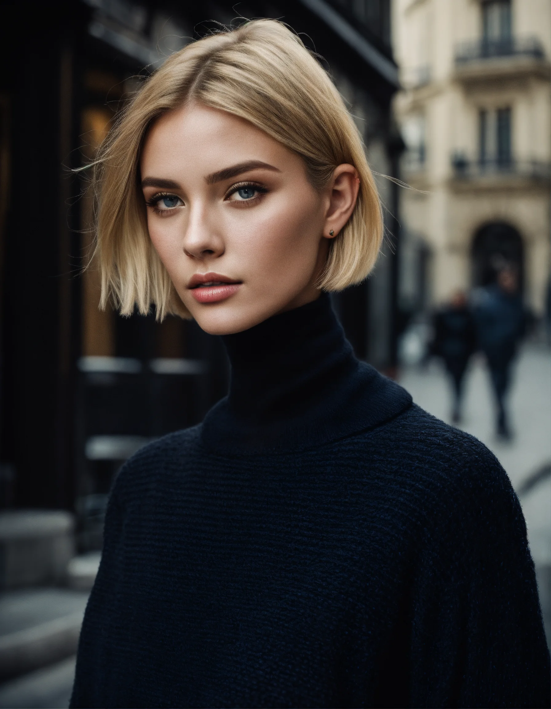 Beautiful fashion models, blonde, clear eyes, black turtleneck sweater, face view, bob haircut, portrait close up, paris street background, film, photography quality, high detail, high quality.