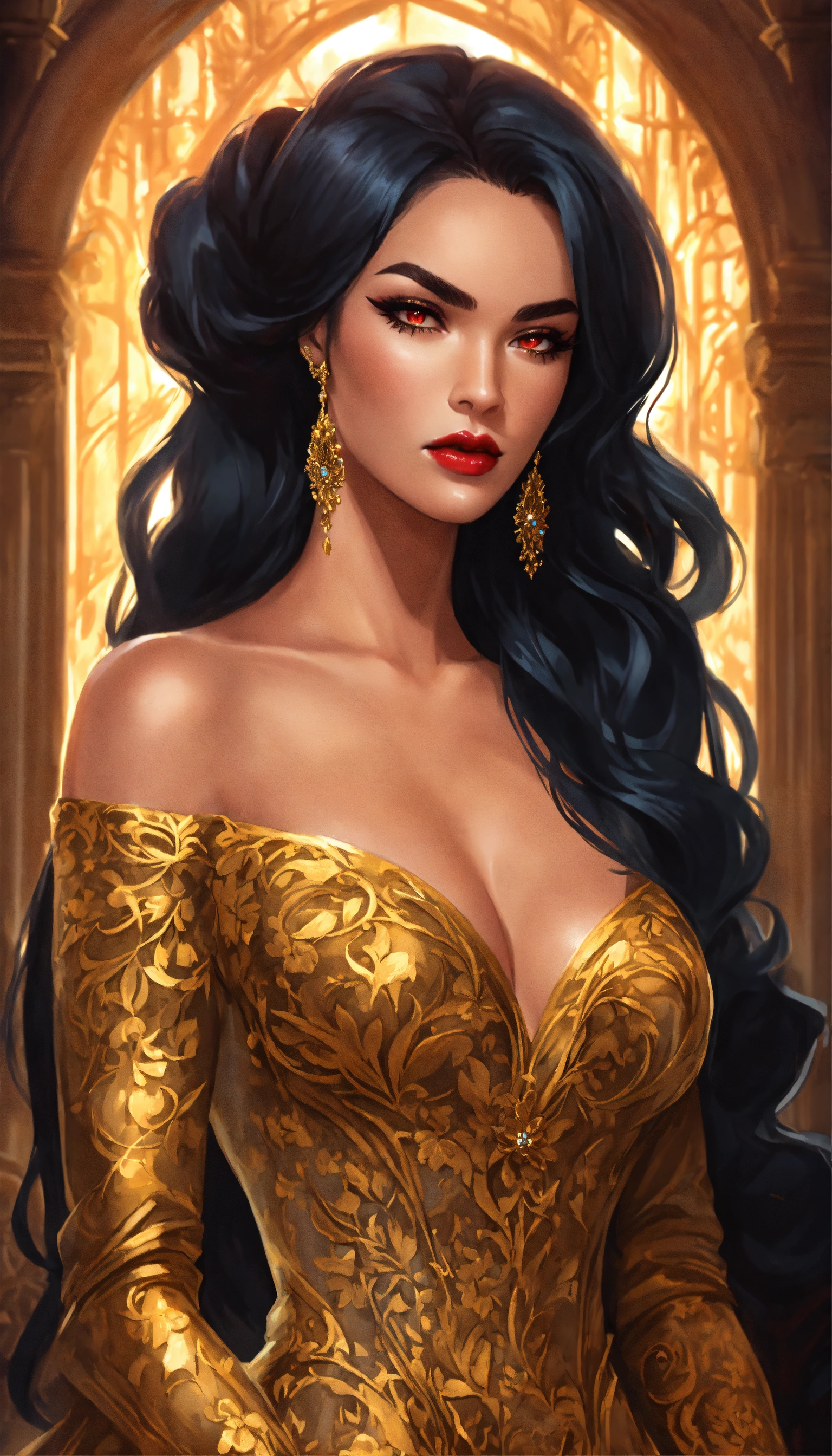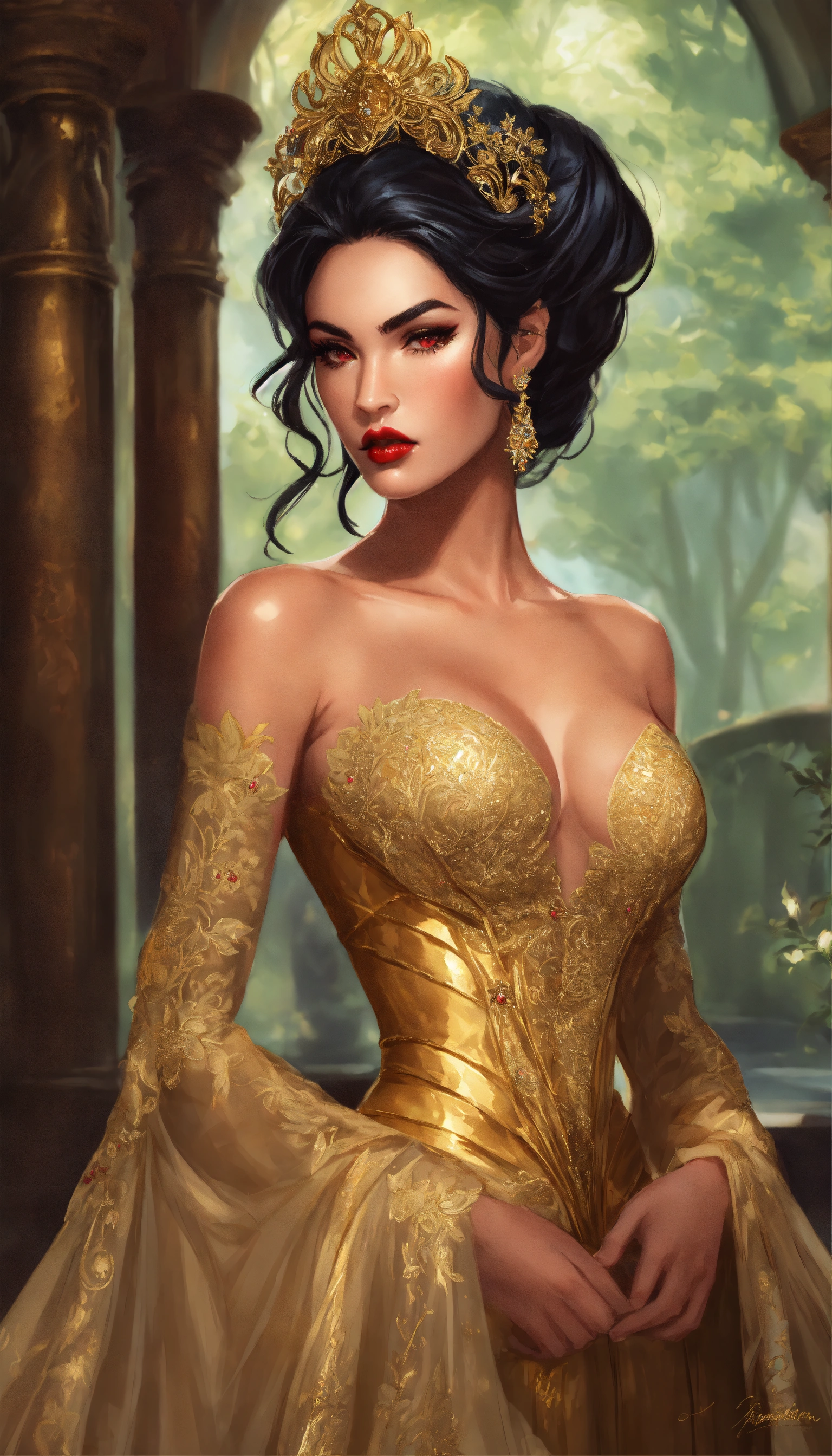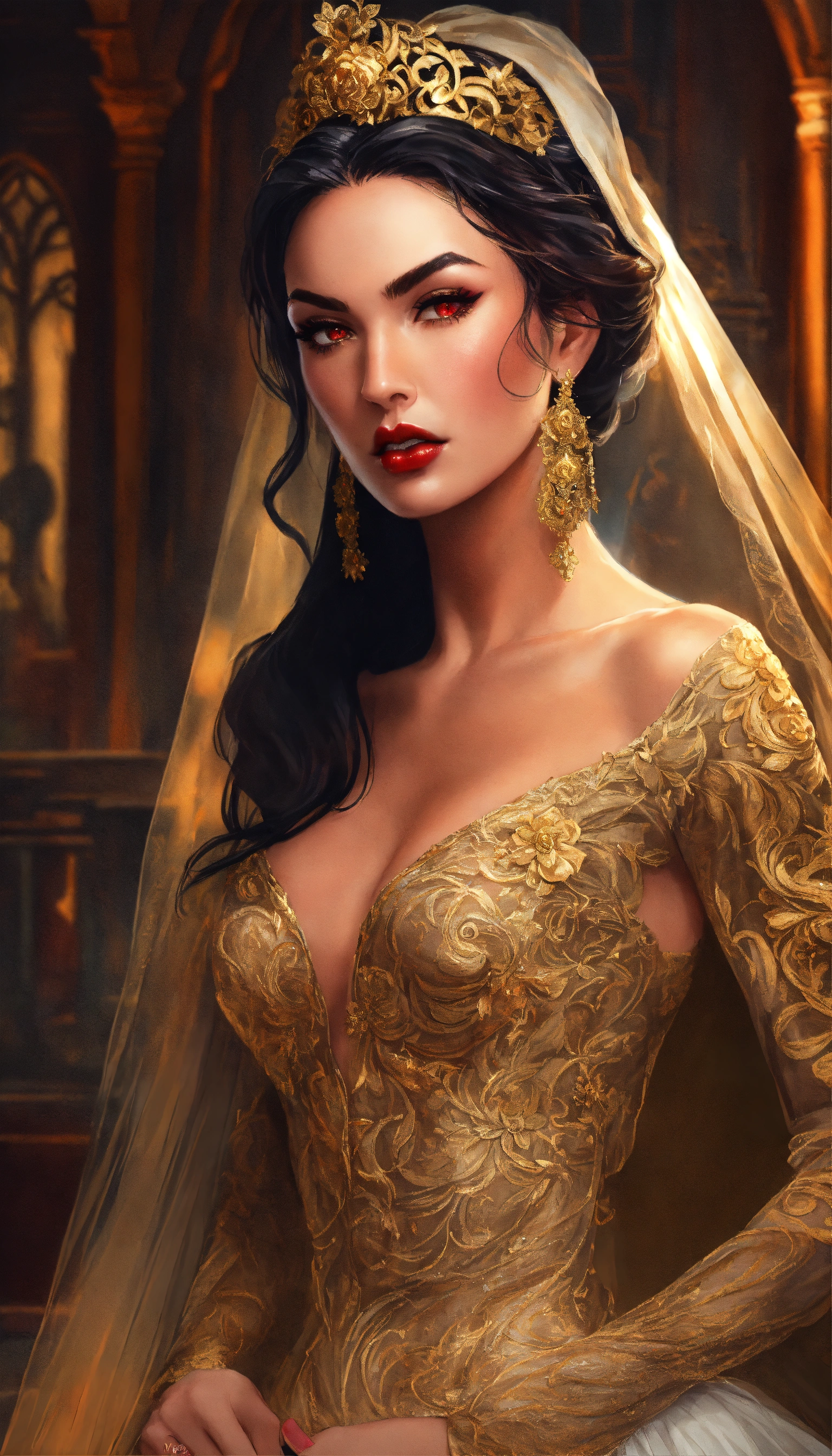 Concept art of ravenna, megan fox, glowing red eyes, curled voluminous flowing black hair in a formal wedding updo, hair in a bun, updo, bun, curled black hair tied up in a wedding bun, beautiful, tan skin, realistic, sabine rich, artgerm, j scott campbell, artgerm, perfect body, detailed, intricate, round face, slim nose, long black eyelashes, red lips, sharp jawline, perfect detailed face, realistic, gold veil, full body view, evil sorceress, dark sorceress, gloomy grey castle background, gloomy dark flowers forest castle, gold floor length tight fitted full skirts bridal gown, low cut neckline, gold high heels, voluminous curled long hair, gold long veil, golden wedding gown, very long transparent golden veil and hair tied up, golden fitted bridal gown, big voluminous long train full skirt gown, forest, yennefer, zuhair murad bridal, zuhair murad bridal ball gown, all gold patterned textured shimmer fabric embroidered dress, extravagant gold long train wedding dress, silk, sleeves