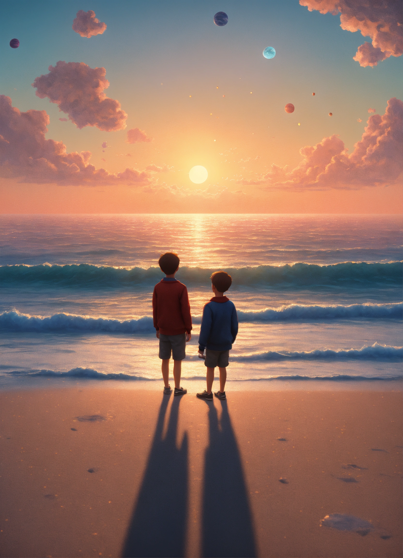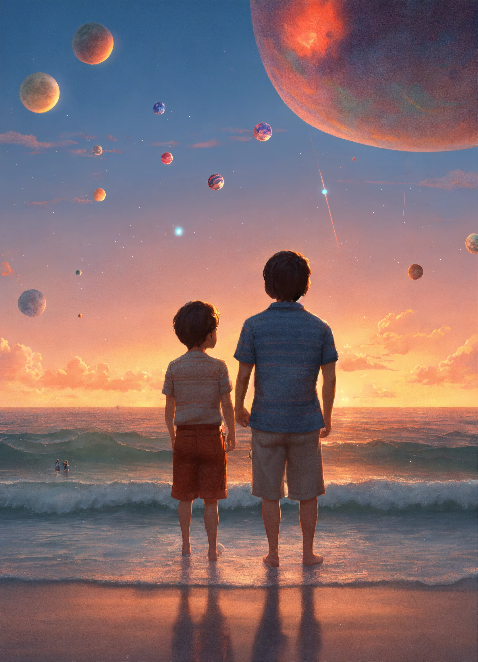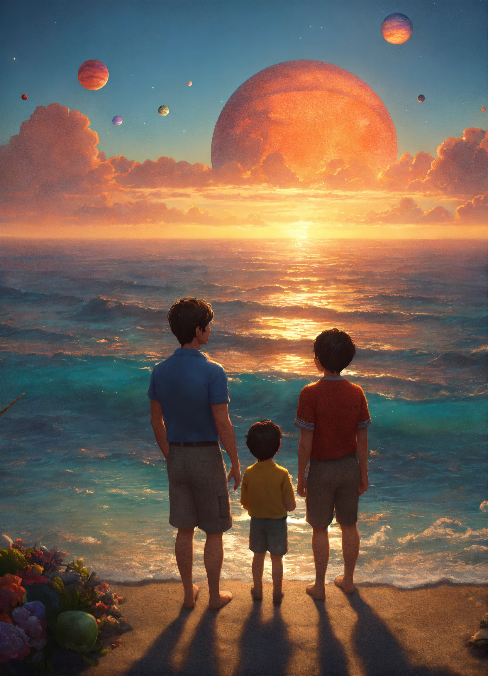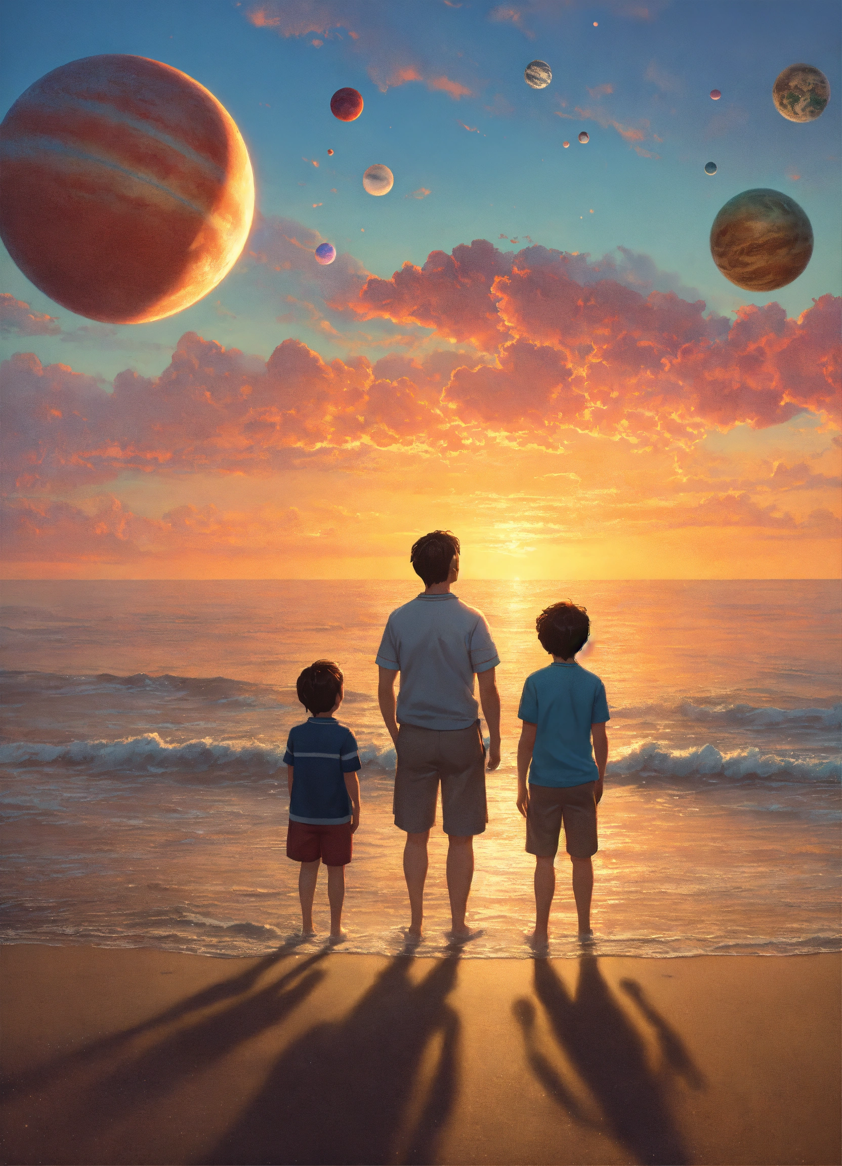 A husband and wife with two sons stand on the ocean shore and watch the sunset, calm, crystal blue water, a parade of planets is visible far in the sky, unreal engine, cozy indoor lighting, artstation, detailed, digital painting, cinematic, character design by mark ryden and pixar and hayao miyazaki, unreal 5, daz, hyperrealistic, octane render