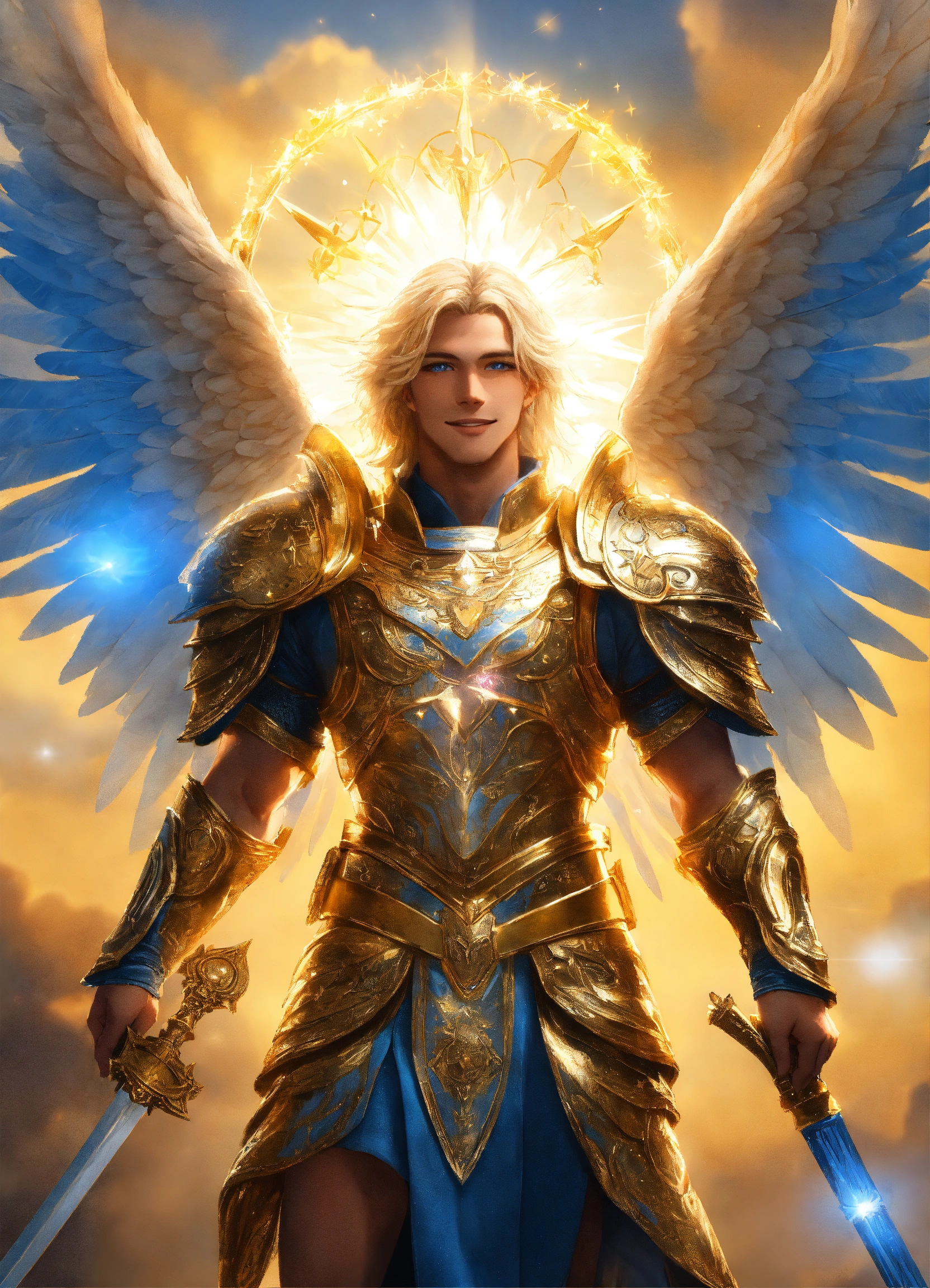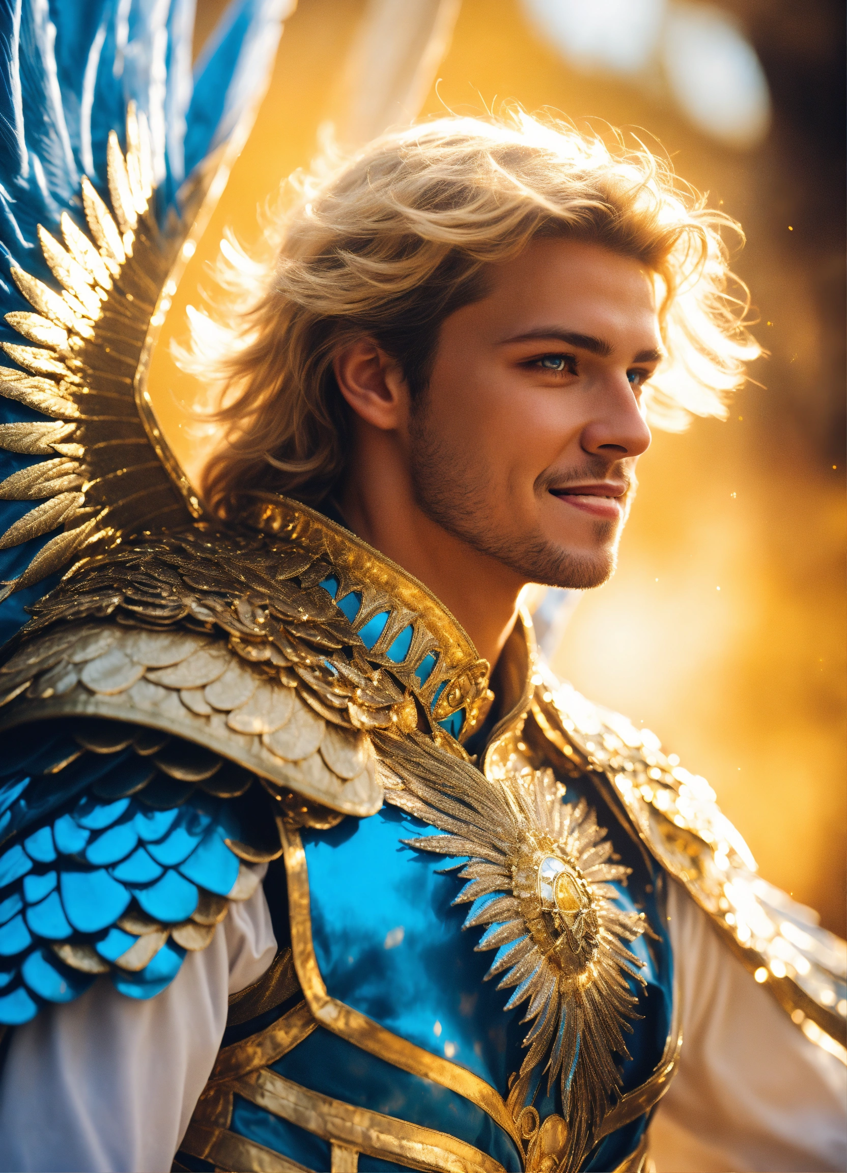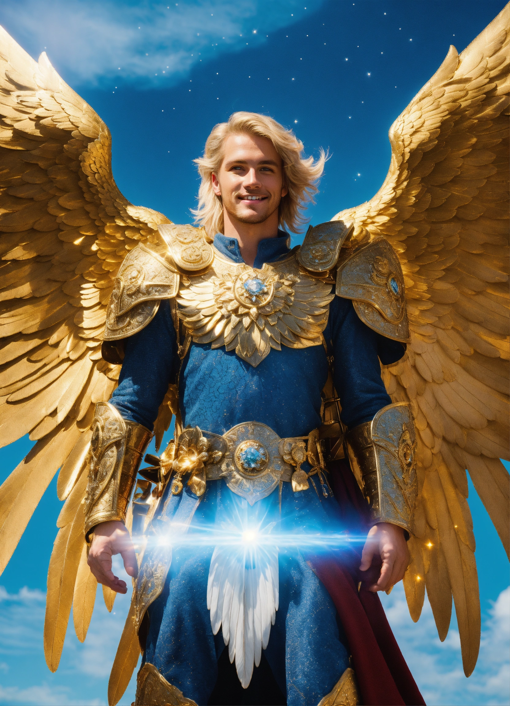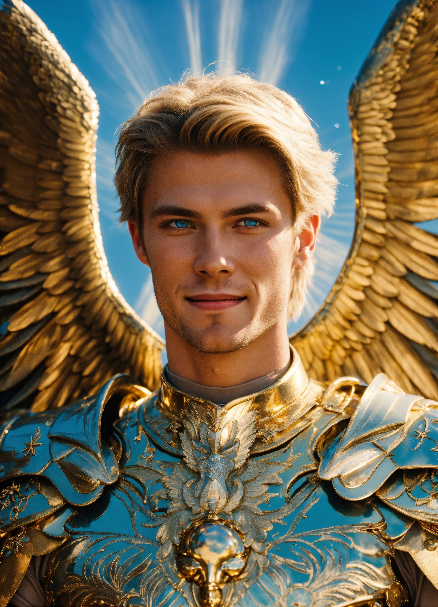 3/4 portrait photo of an archangel with massive full angel wings, a young white powerful warrior male, very handsome, amazing smile and staring directly forward into camera, beaming with the sun's energy, staring lovingly straight ahead directly into camera at me with glowing bright blue eyes, blond hair, eyes centred directly on me, wearing intricate gold and diamond armour with sun details, background is holy spirit explosion of suns and stars and sparkles in bright blue sky. photograph by albi, details anatomy, cinematic lighting, photographic, eastman kodak color negative film 5251 50t shot on panavision super ps .
