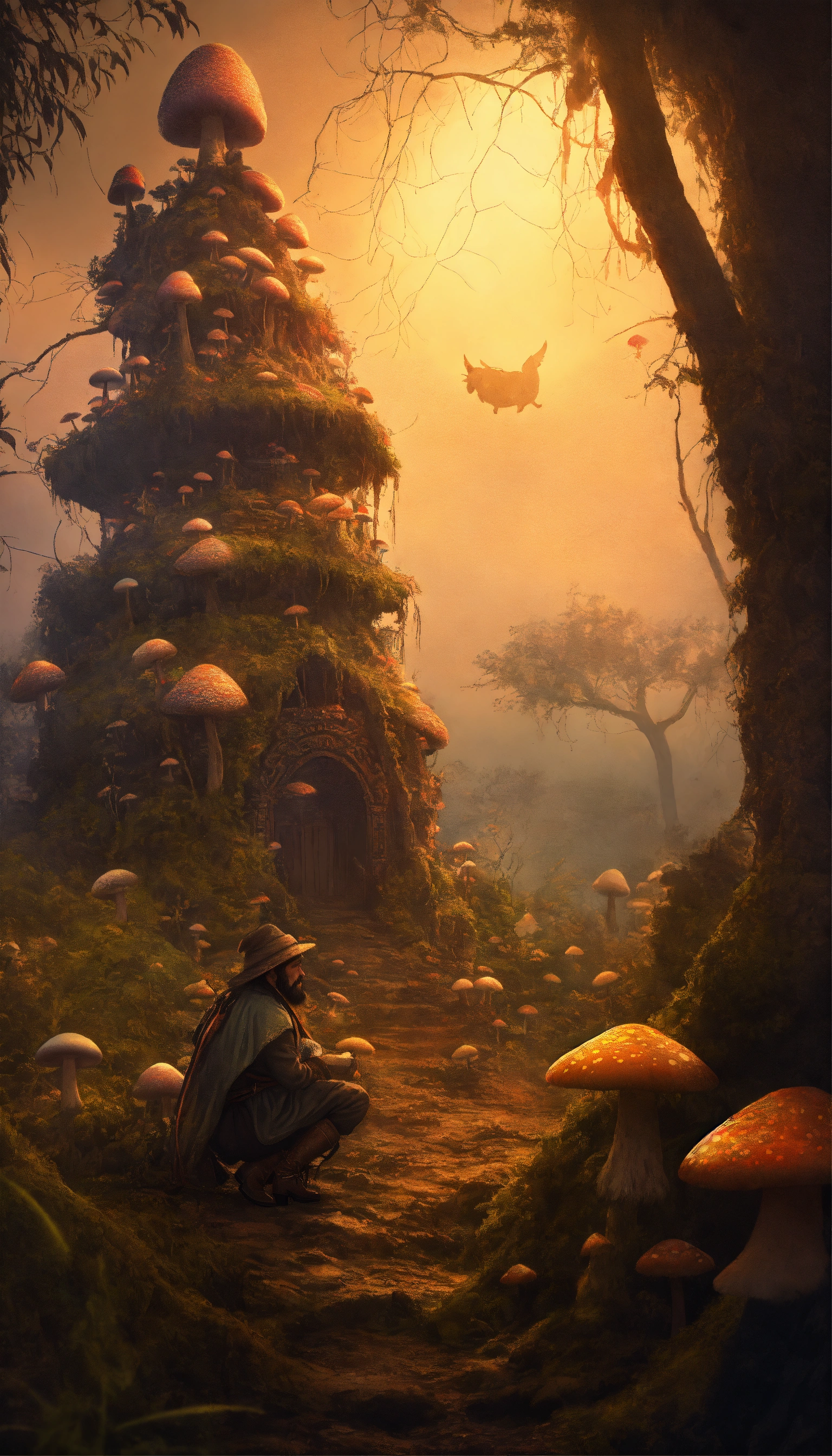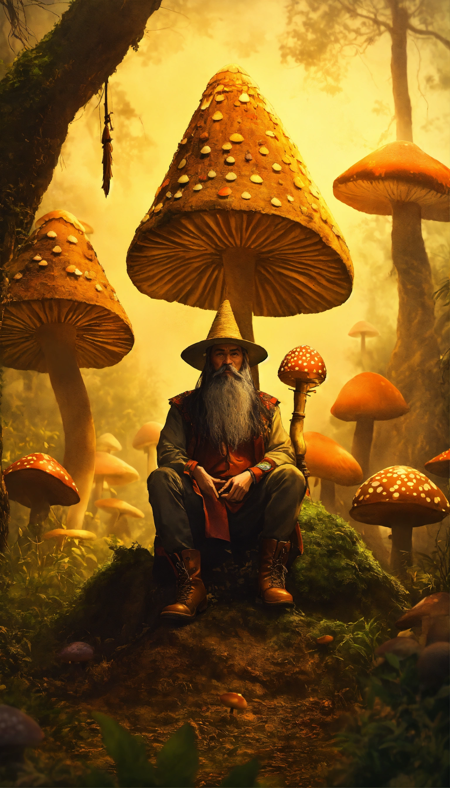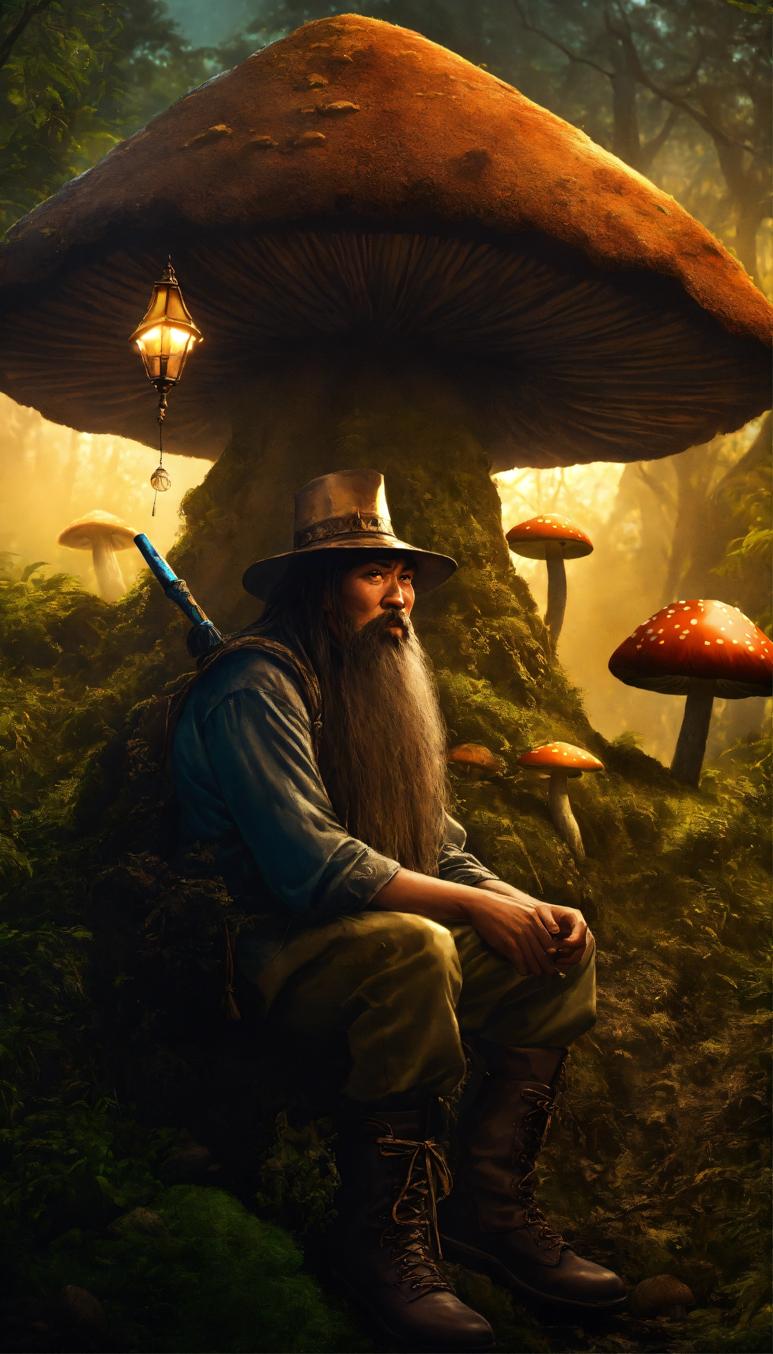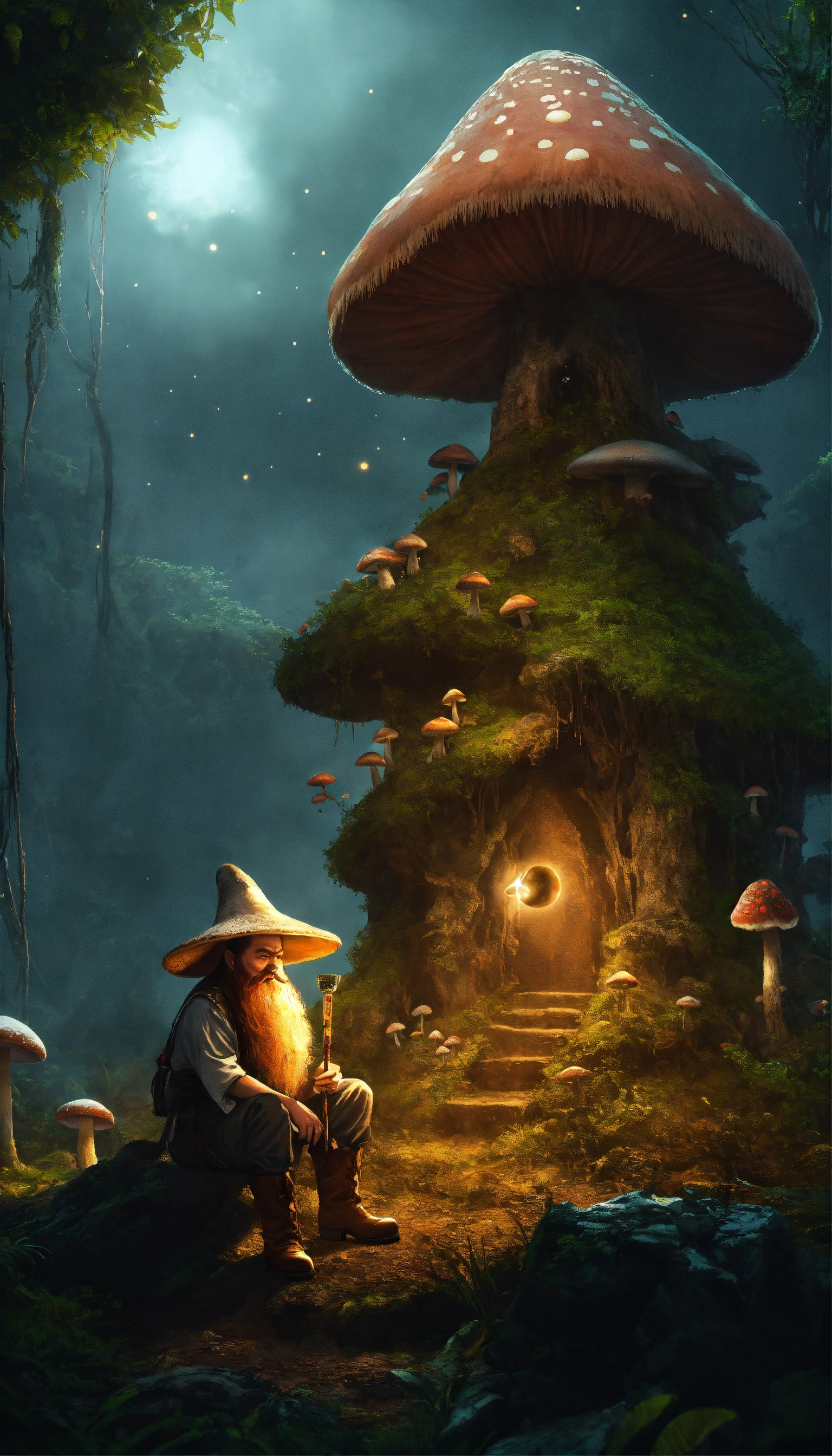 Scary philippines duwende, nuno sa punso, tiny dwarf being with long beard, wearing a salukot hat, wearing pointed boots, sitting by a termite mound, with big mushrooms surrounded the place, night light, foggy weather, intricate, fantasy, with orbs of light, with fairy's on background, trees, and other mythical creature from philippines, cinematic