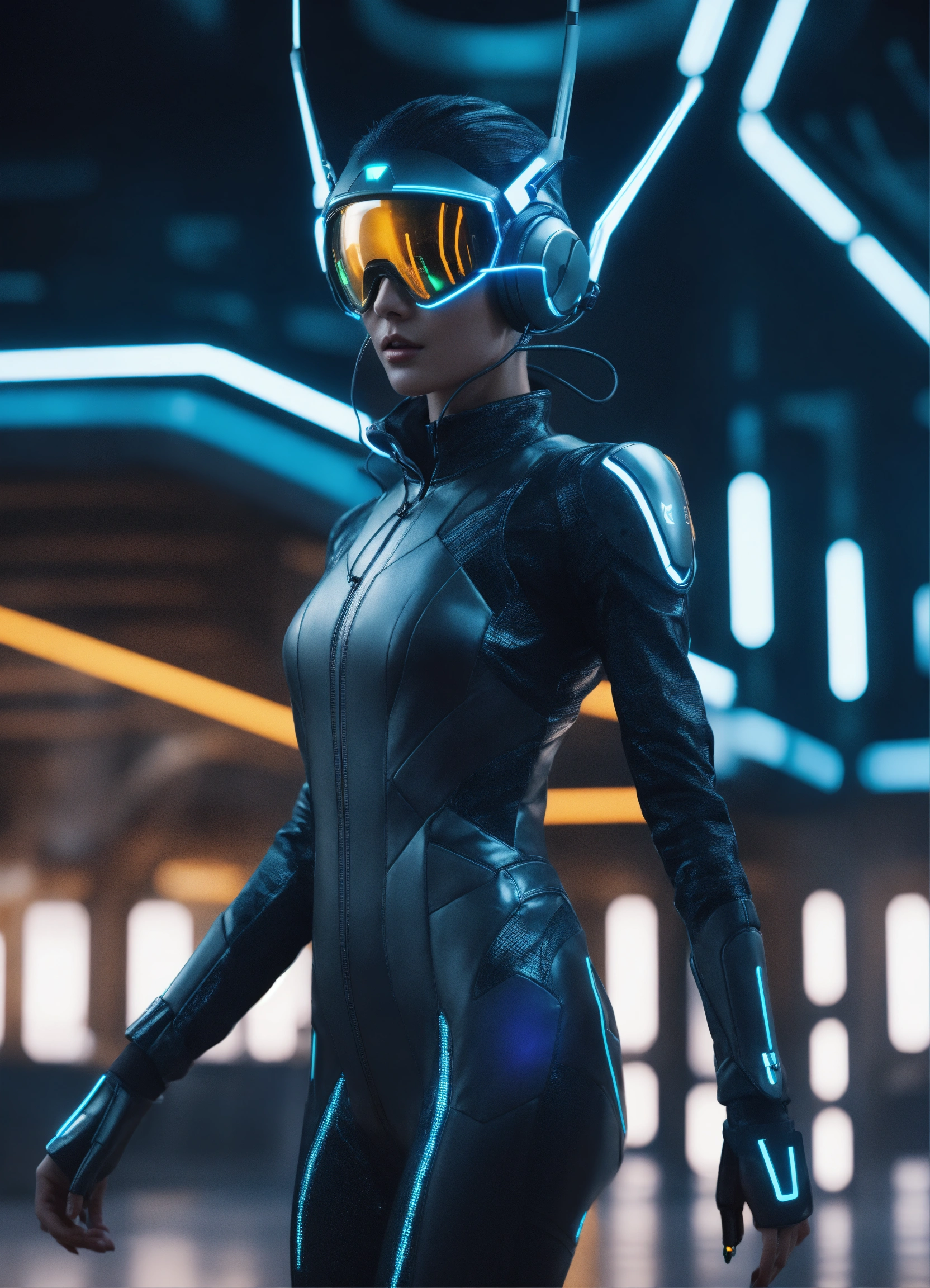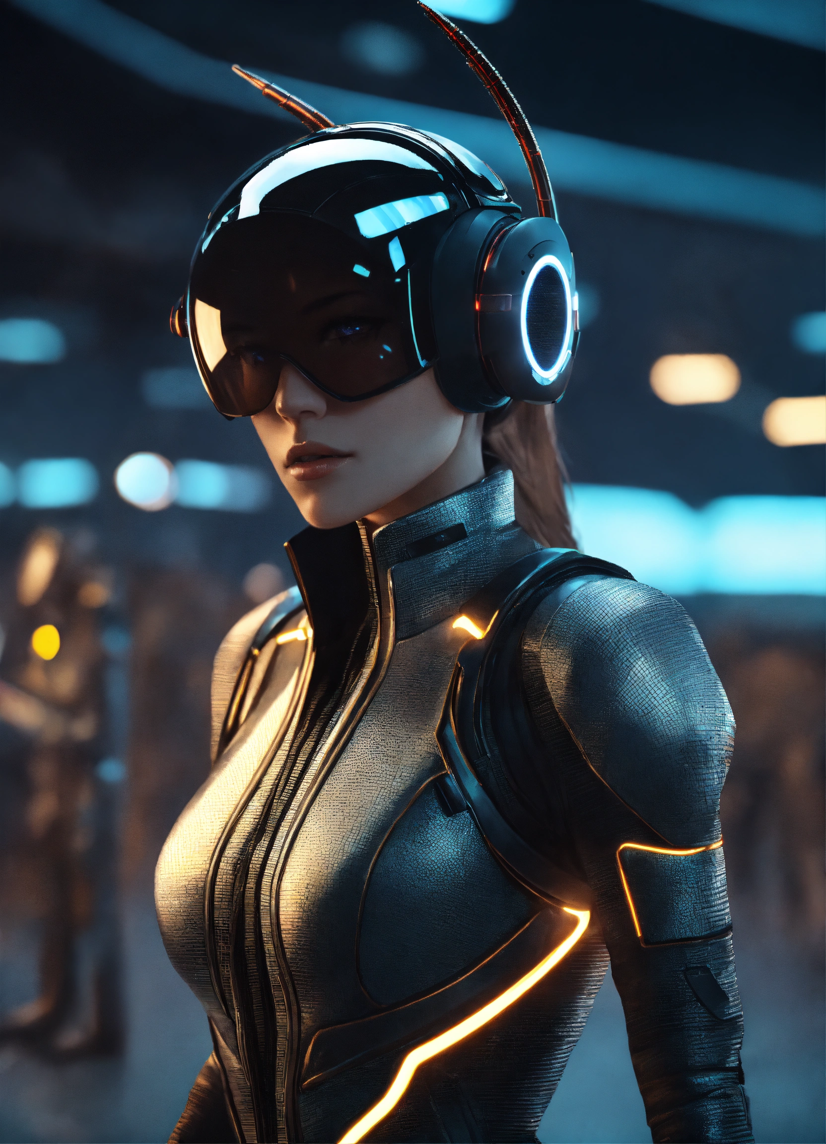 Wide shot of a female super spy wearing a tight futuristic spy suit and alien earphones with long pointy antennas, hacking on the controls at a spaceport of a space port, realistic, futuristic, sci-fi, 8k, tron, unreal engine