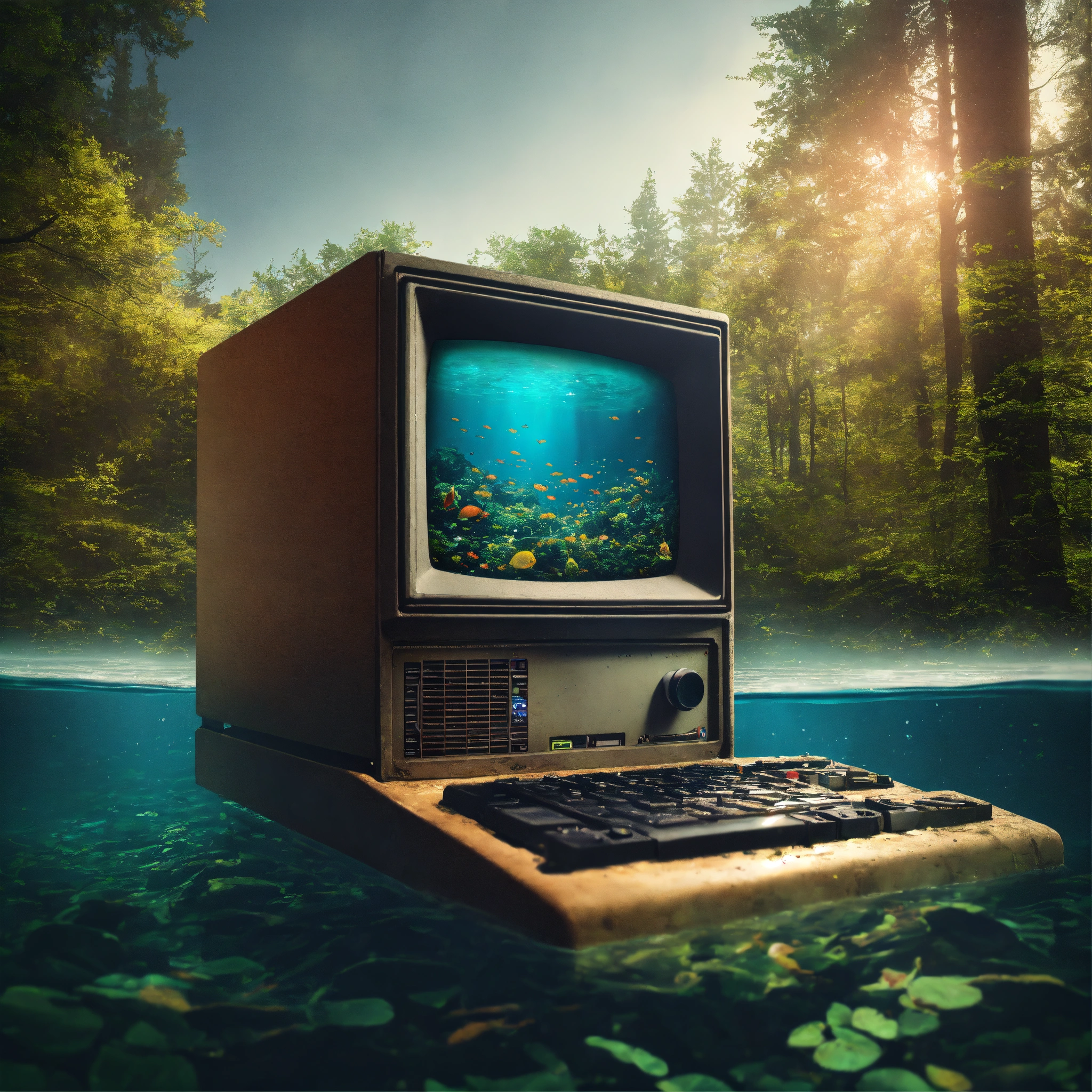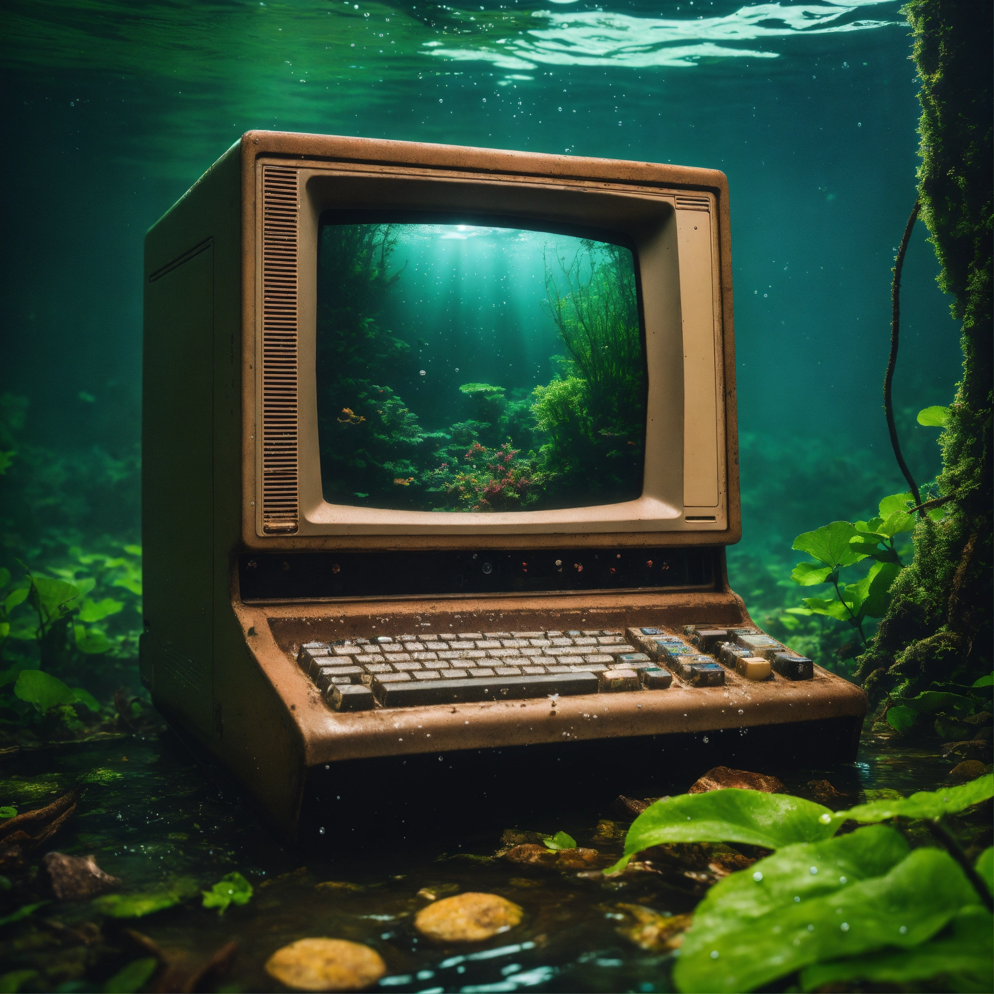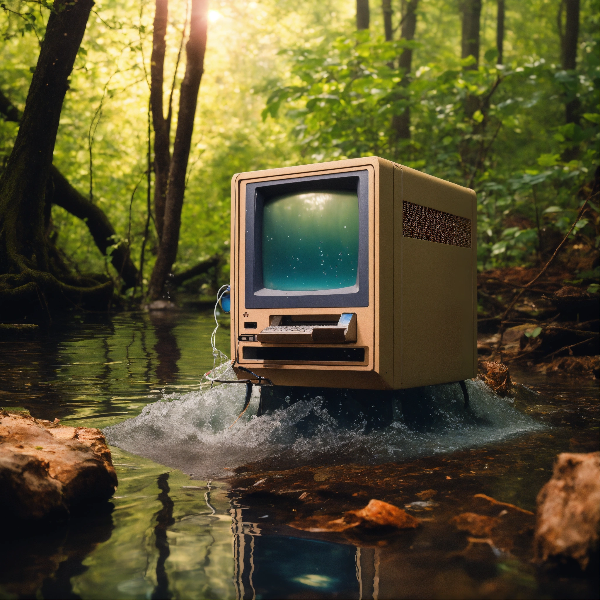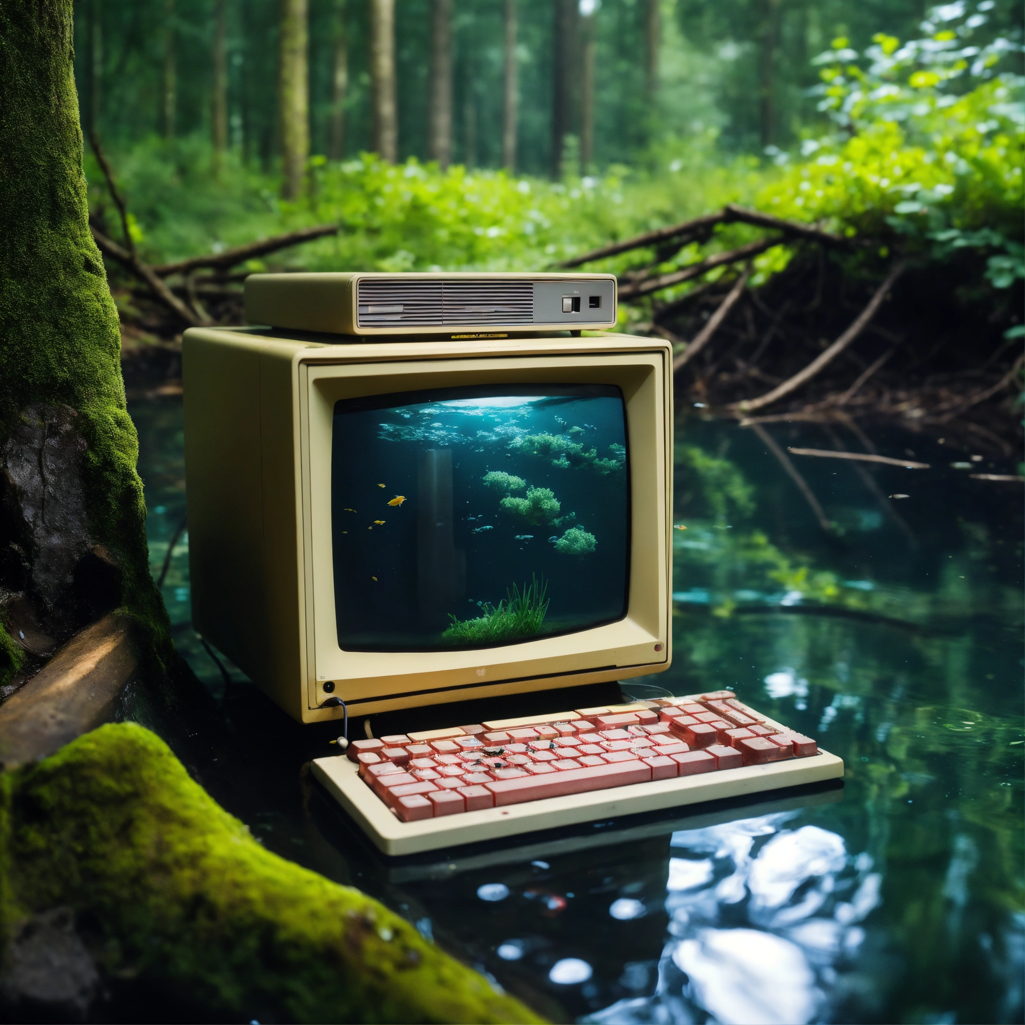 Realistic professional photography of a retro macintosh desktop computer under water abandoned in the woods, are, extremely detailed, realistic photo, 4k realistic photo.