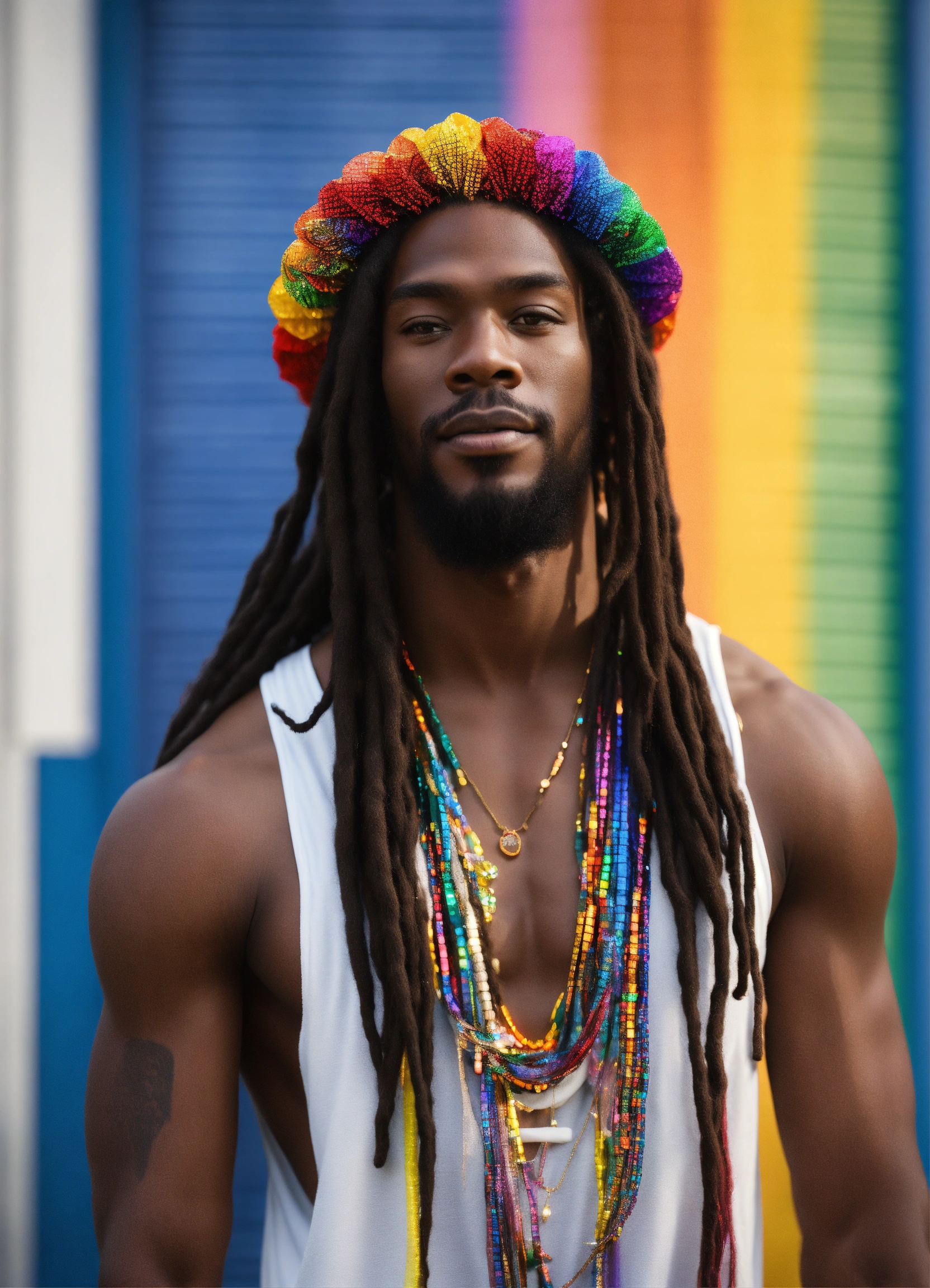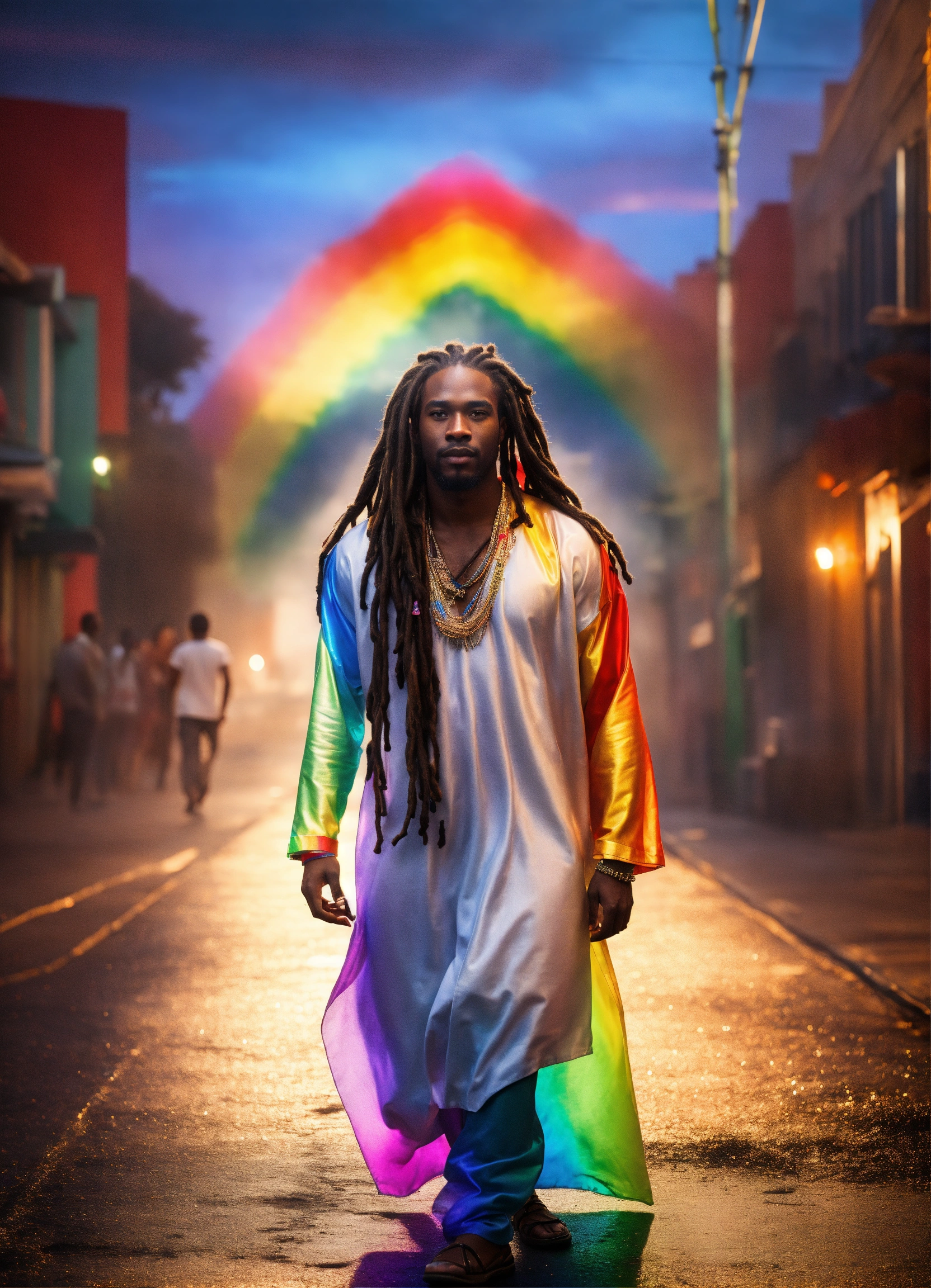 Black man with long flowing dreadlocks, well-built, 6' 5" tall, he has iridescent black skin that reflects all the colors of the rainbow, full body shot, striding up the street confidently, arms outstretched to the sides ready to hug someone, looking directly into camera, wearing all white iridescent clothing, african style white iridescent clothing that reflects all the colors of the rainbow, 3d render