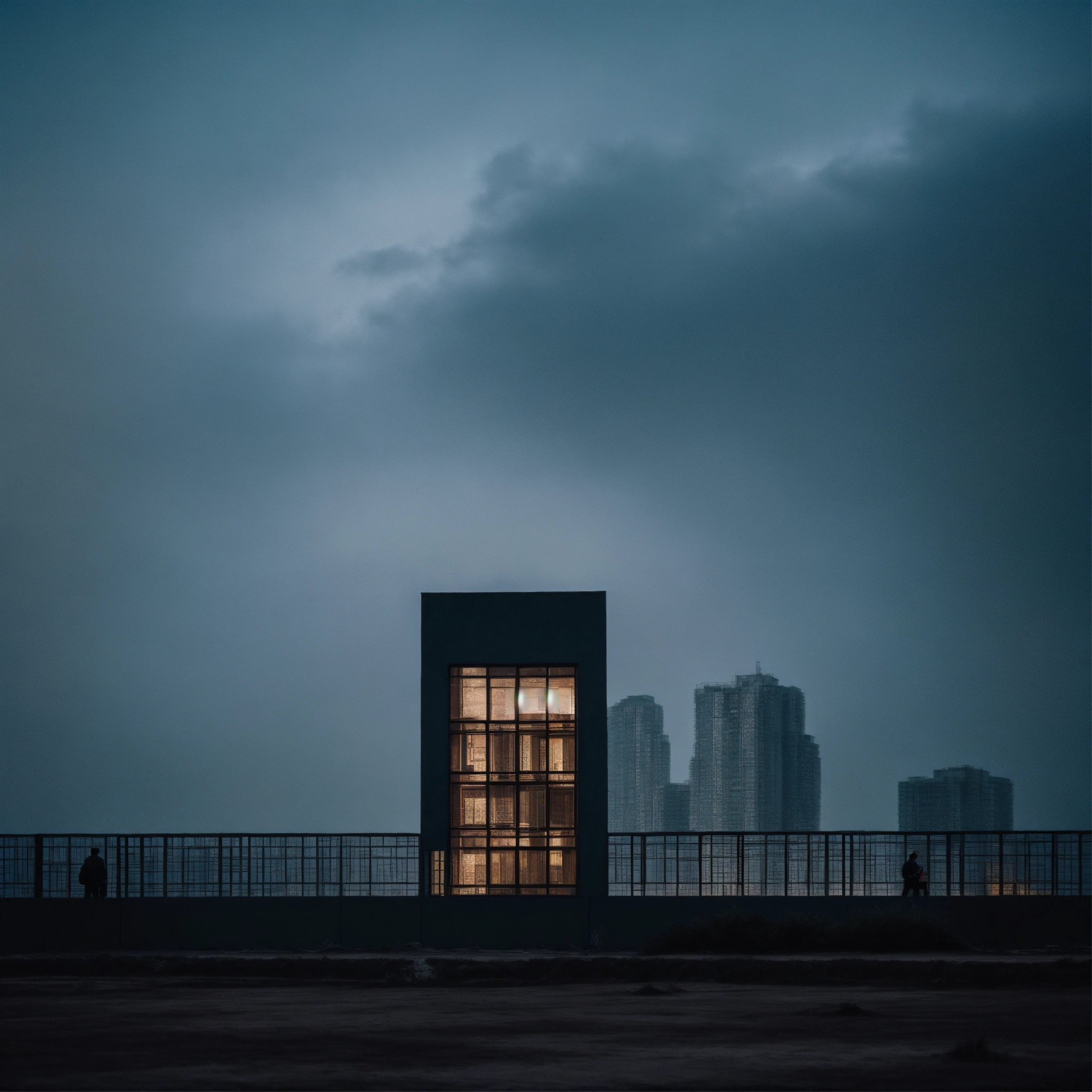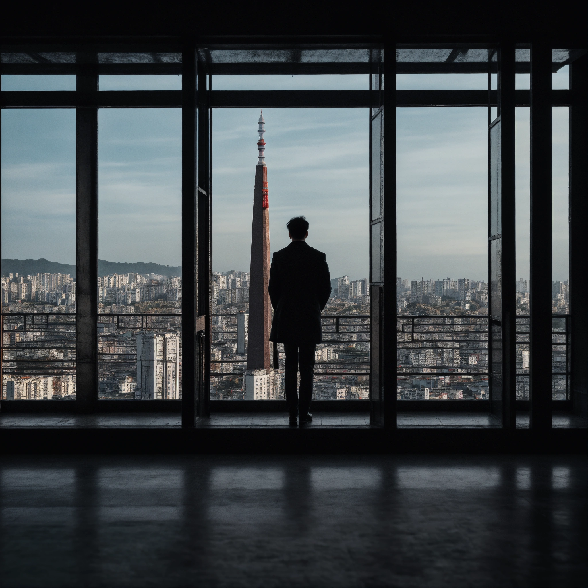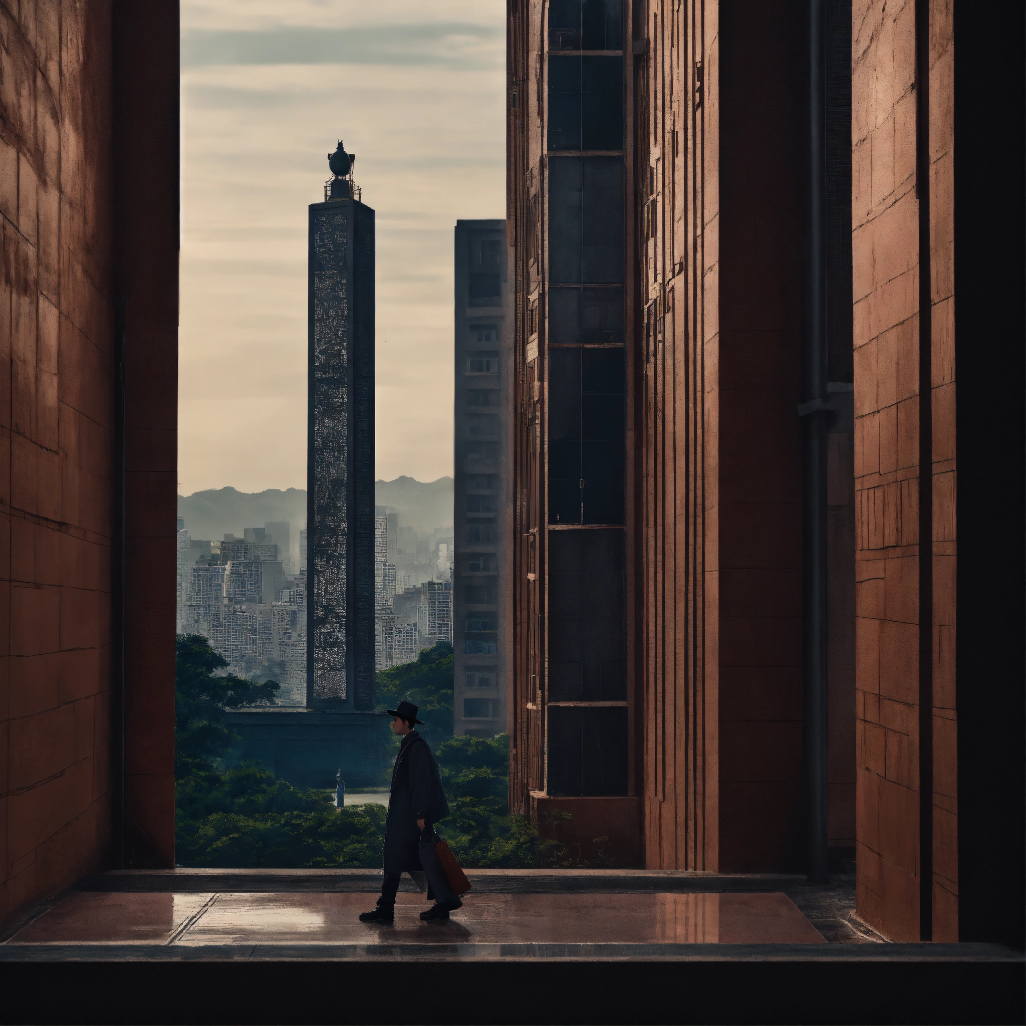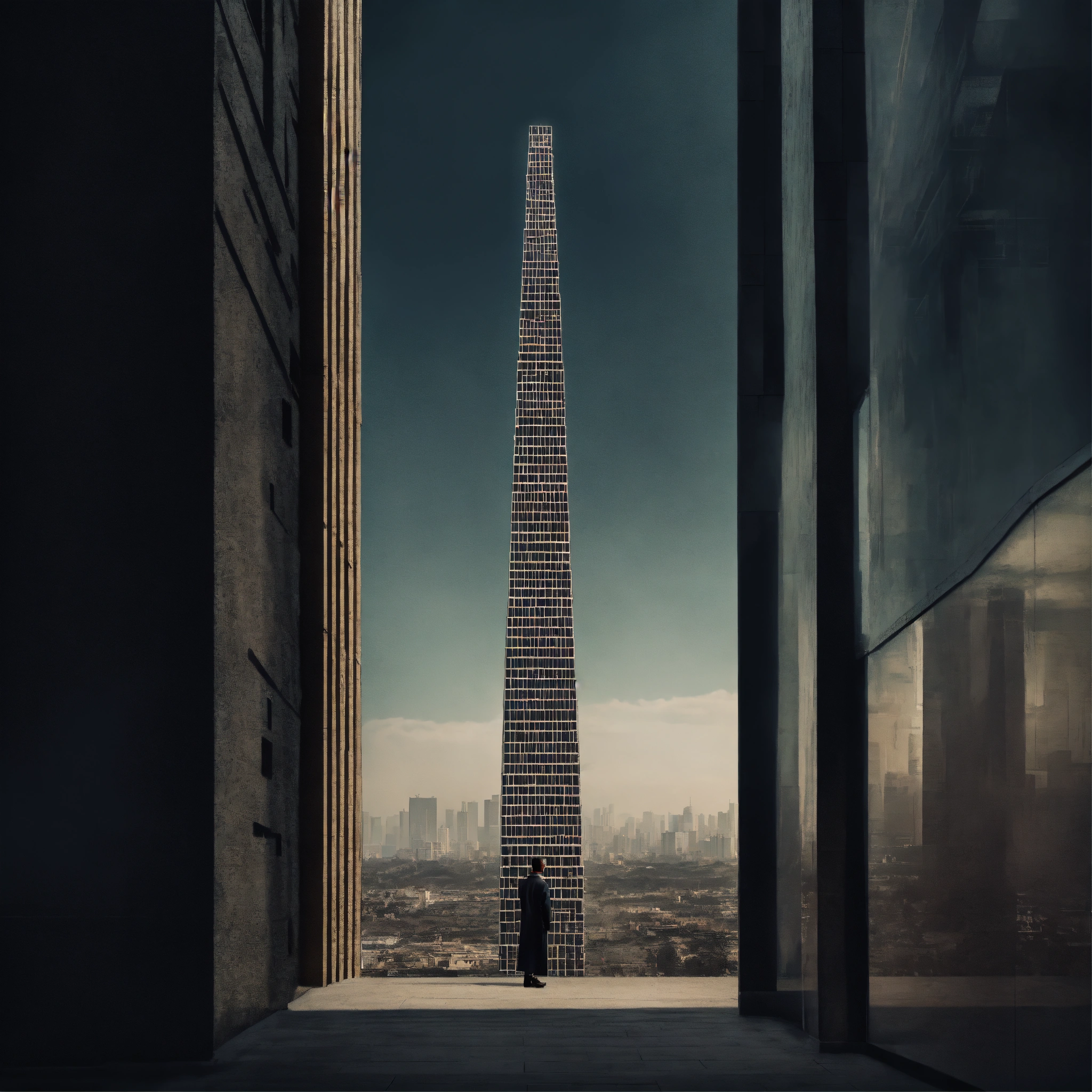 (isolated human) look over tall building windows, obelisk, in the style of dark hues, rural china, buenos aires, coded patterns, sparse and simple, uhd image, urbancore, sovietwave, vastness of space, negative space, award-winning design, leica