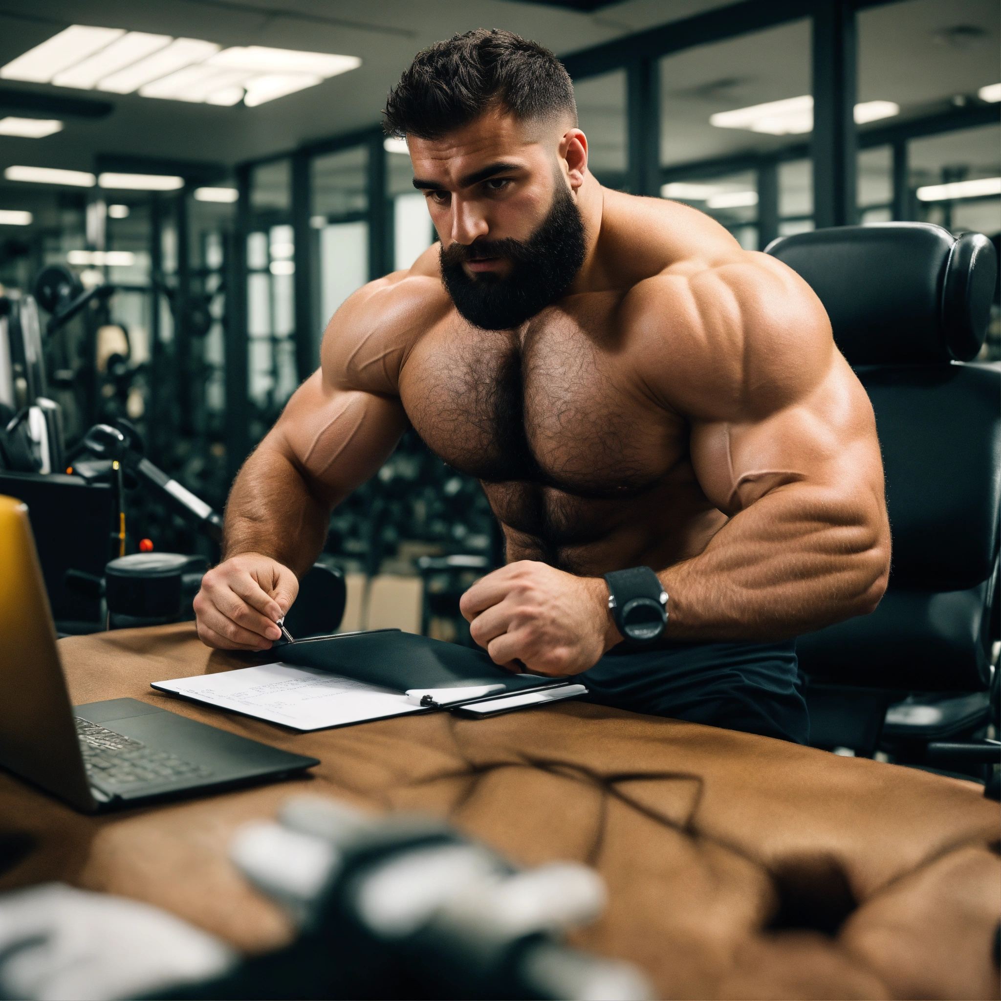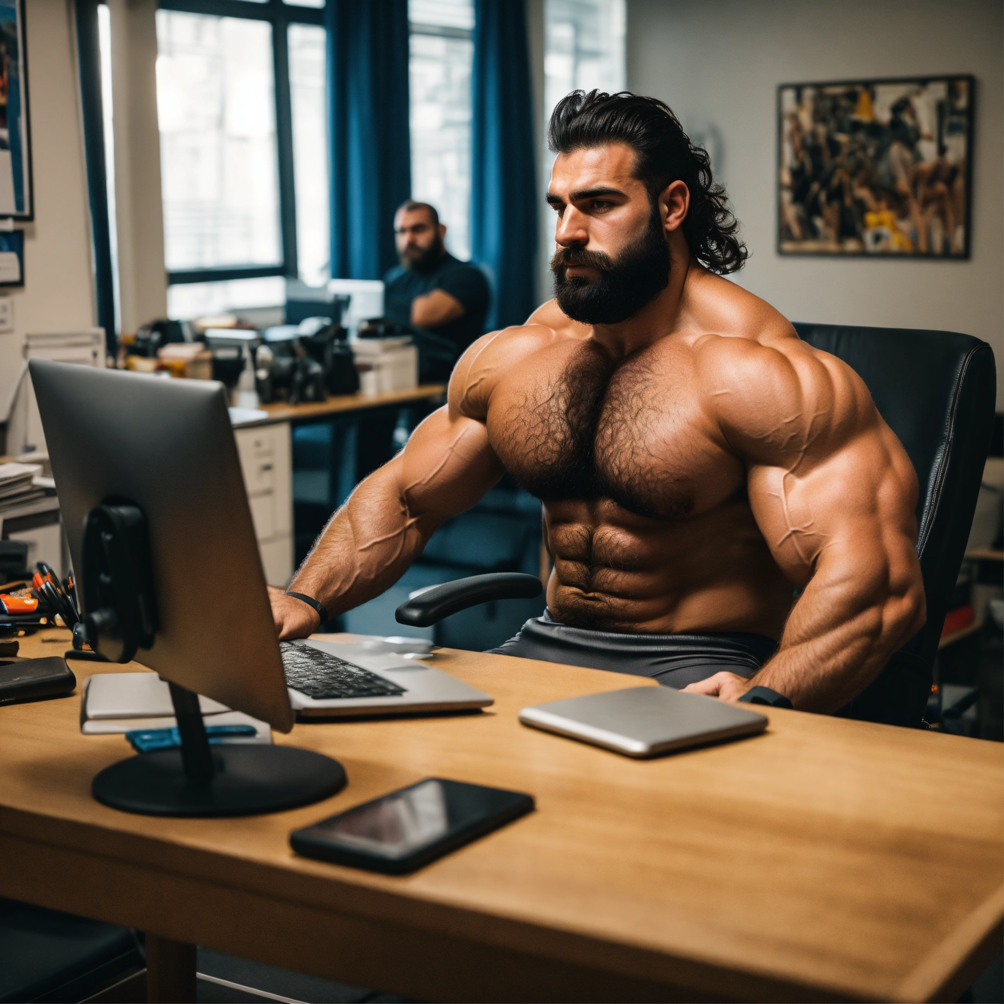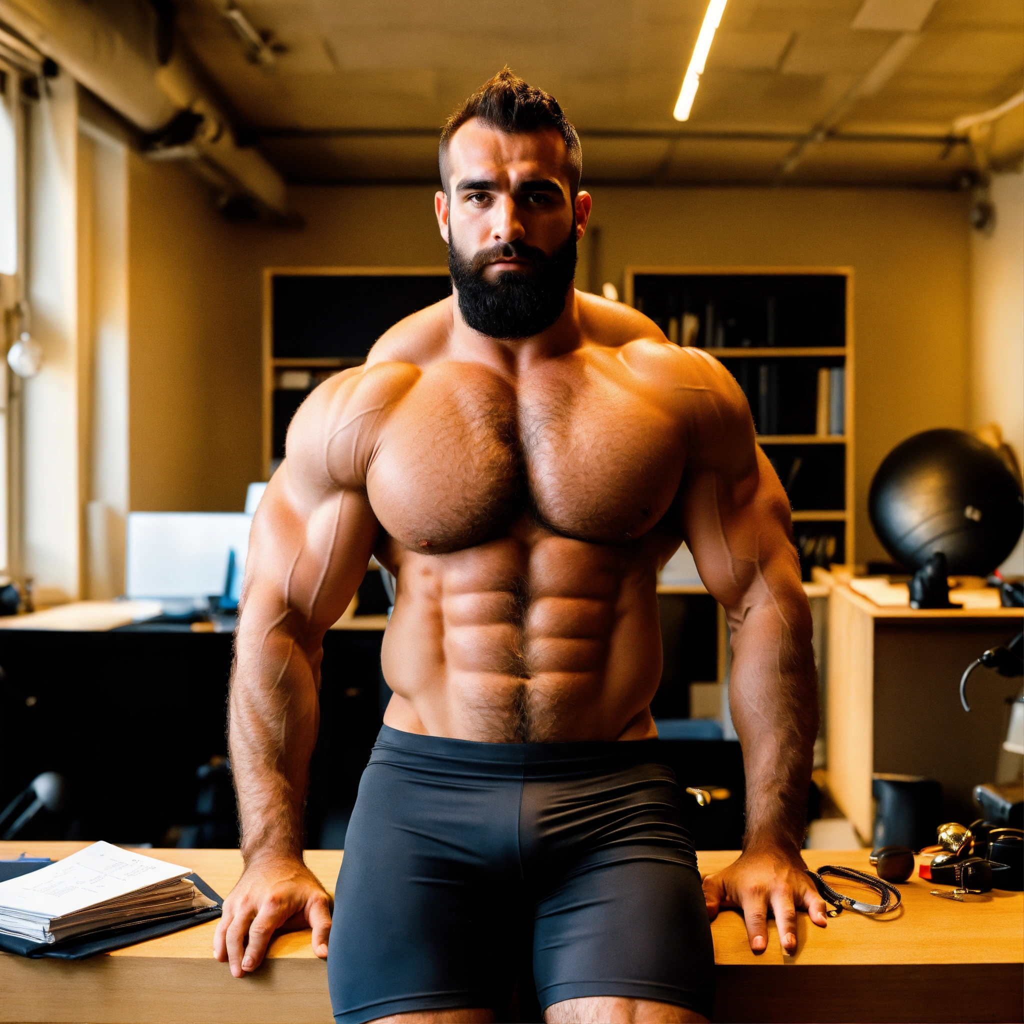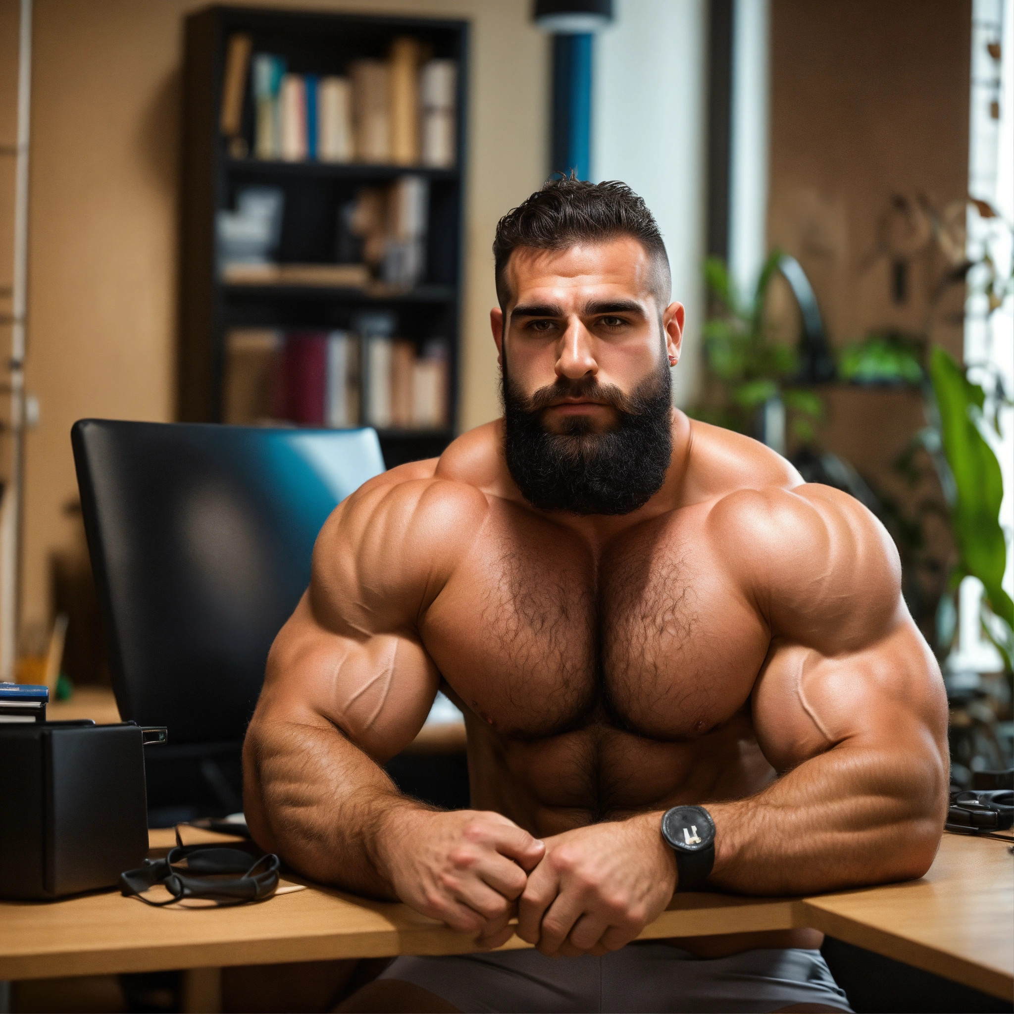 30-year-old hairy greek man with big muscles, big bodybuilder, body like a wrestler, at work in his office
