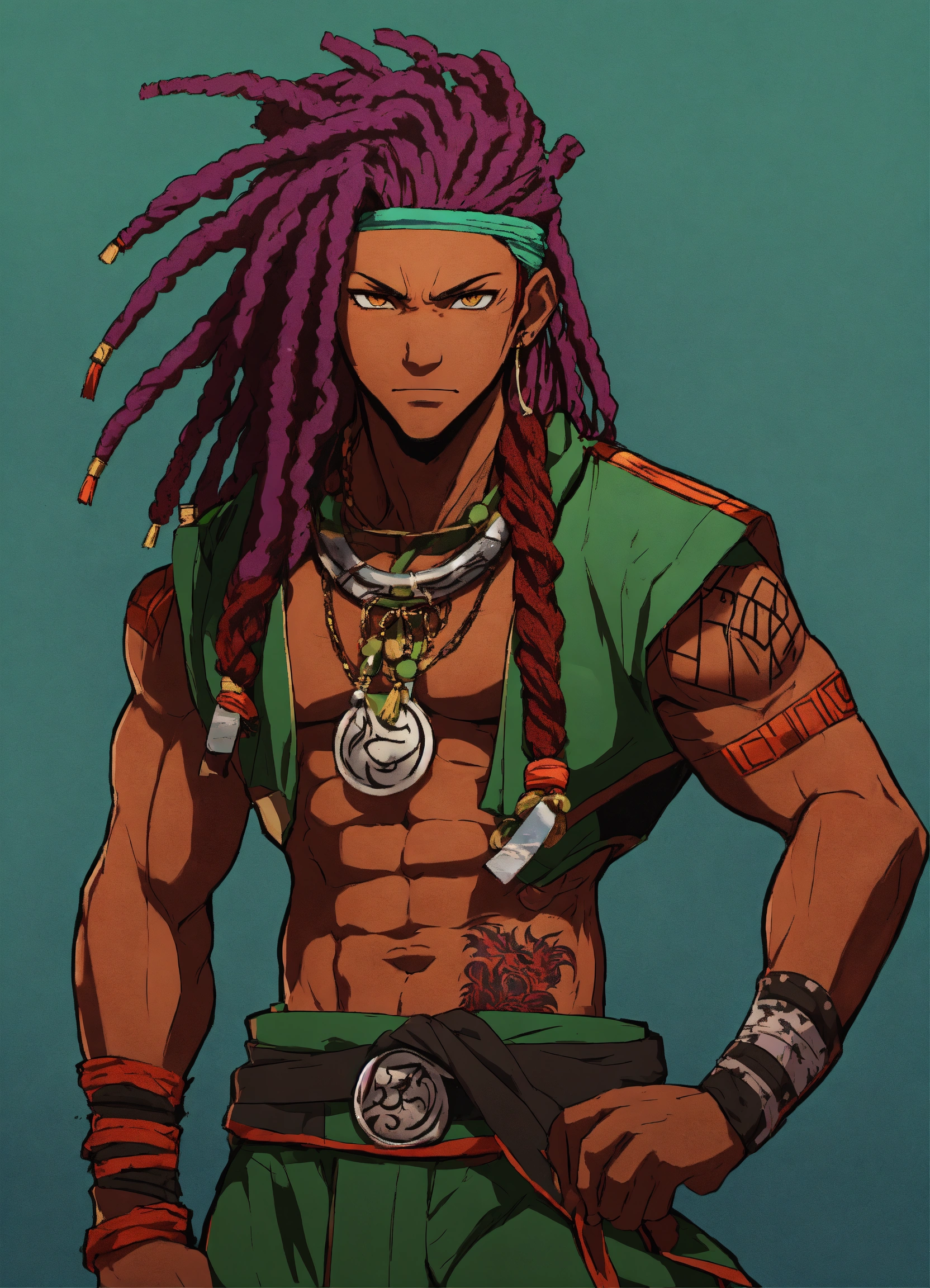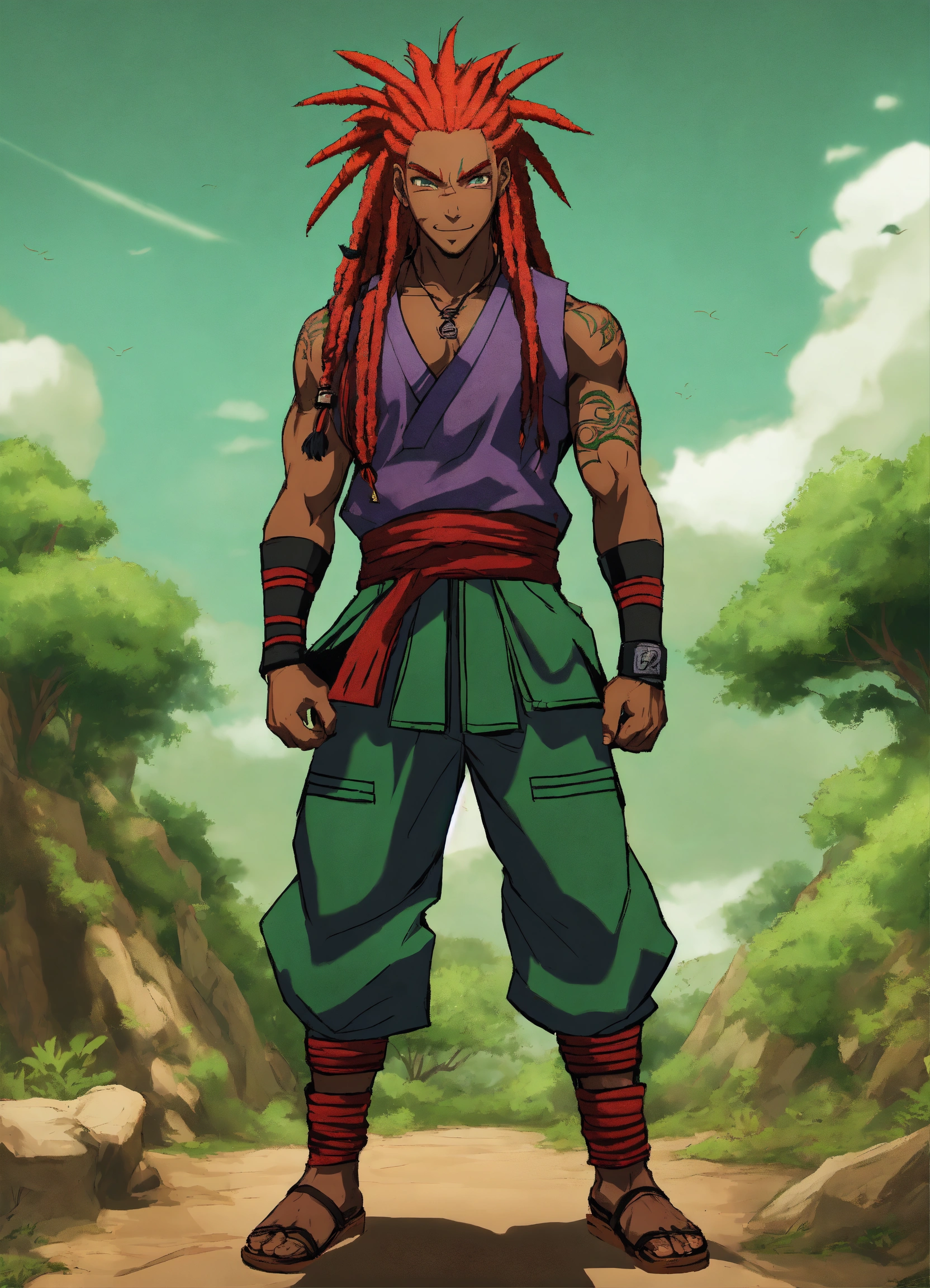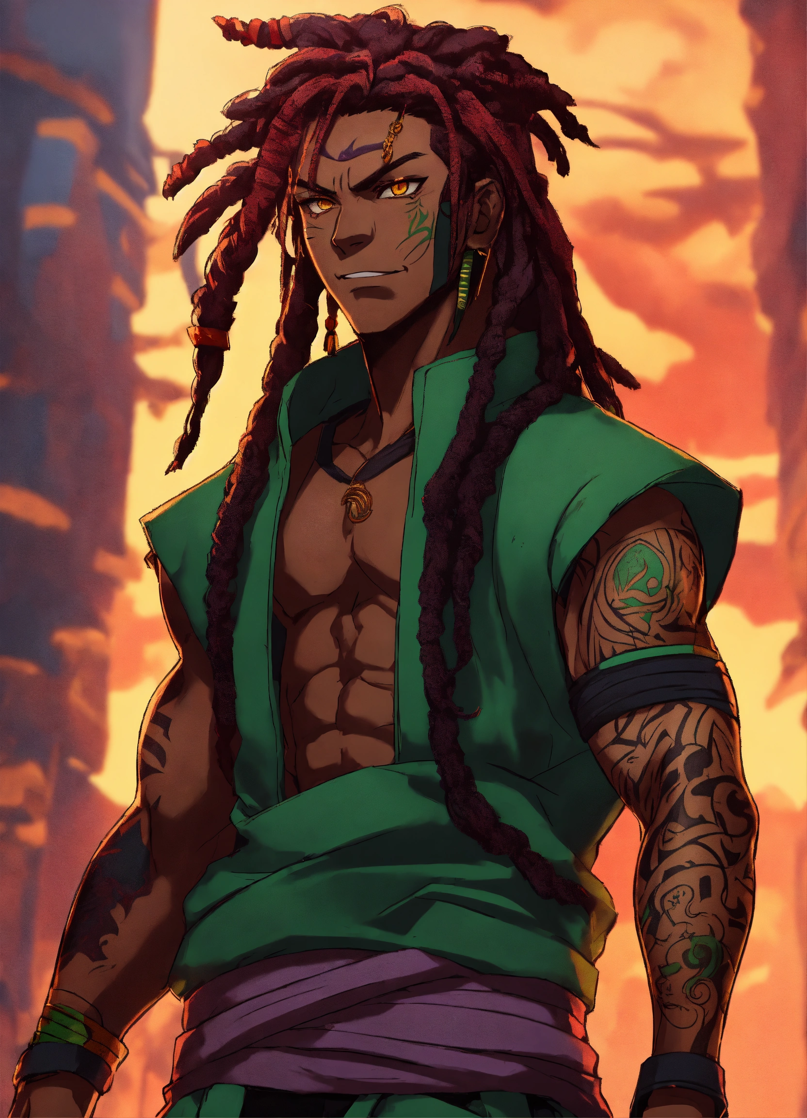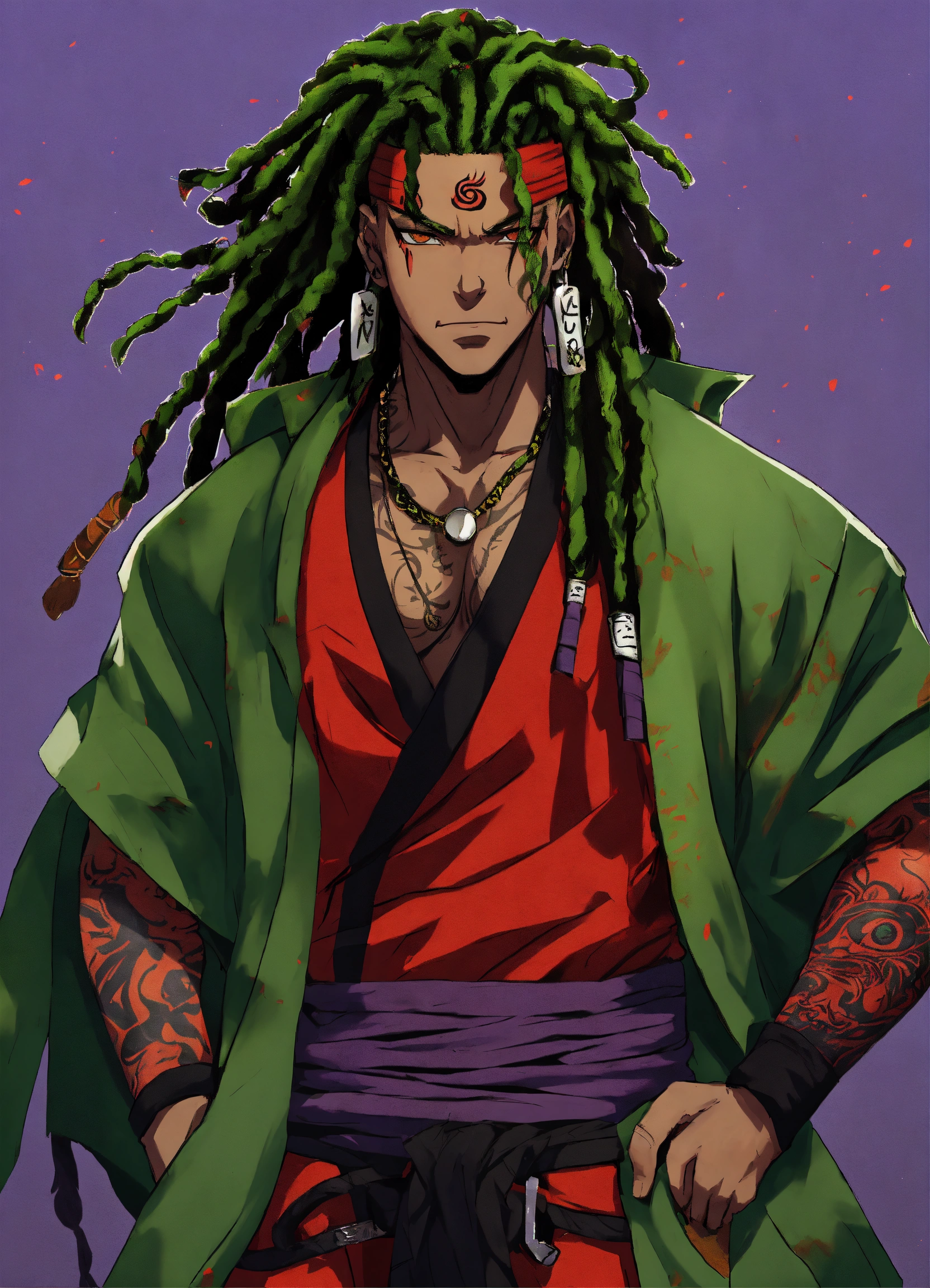 African naruto anime styled character, muscular physique, long purple or green hair, which is styled in a wild dreads and untamed manner, red dragon eyes, he wears a green and black martial arts uniform, anime style, male, has a smirk on his face, has tribal tattoos, full body picture.