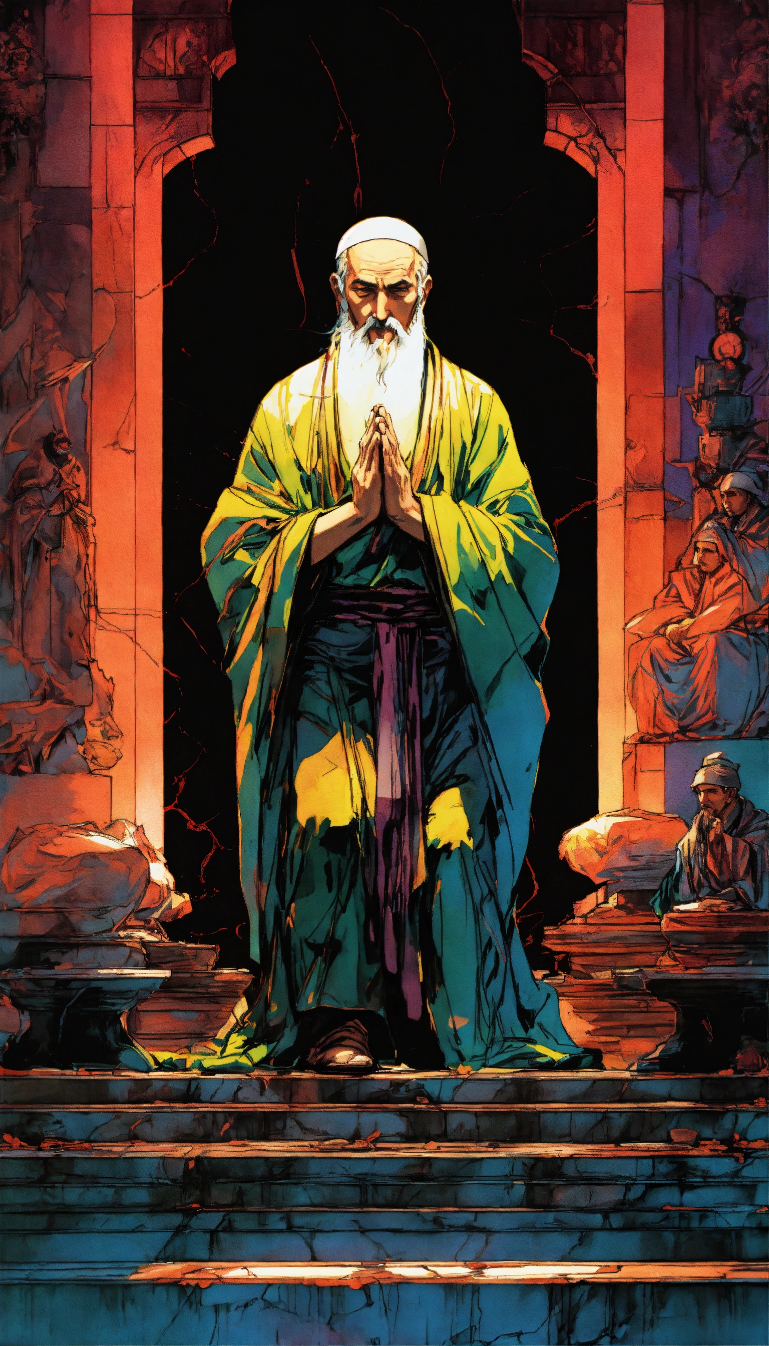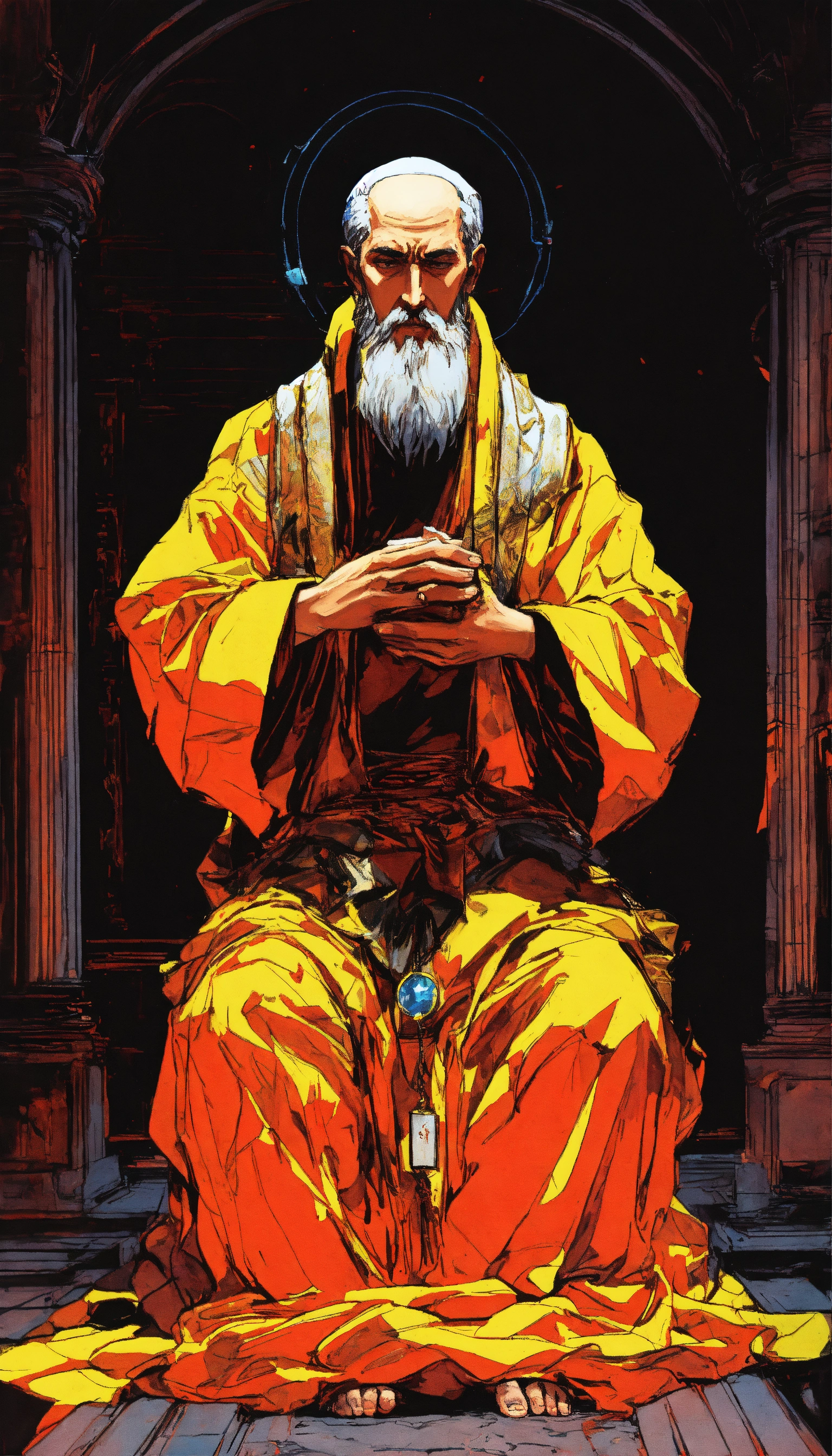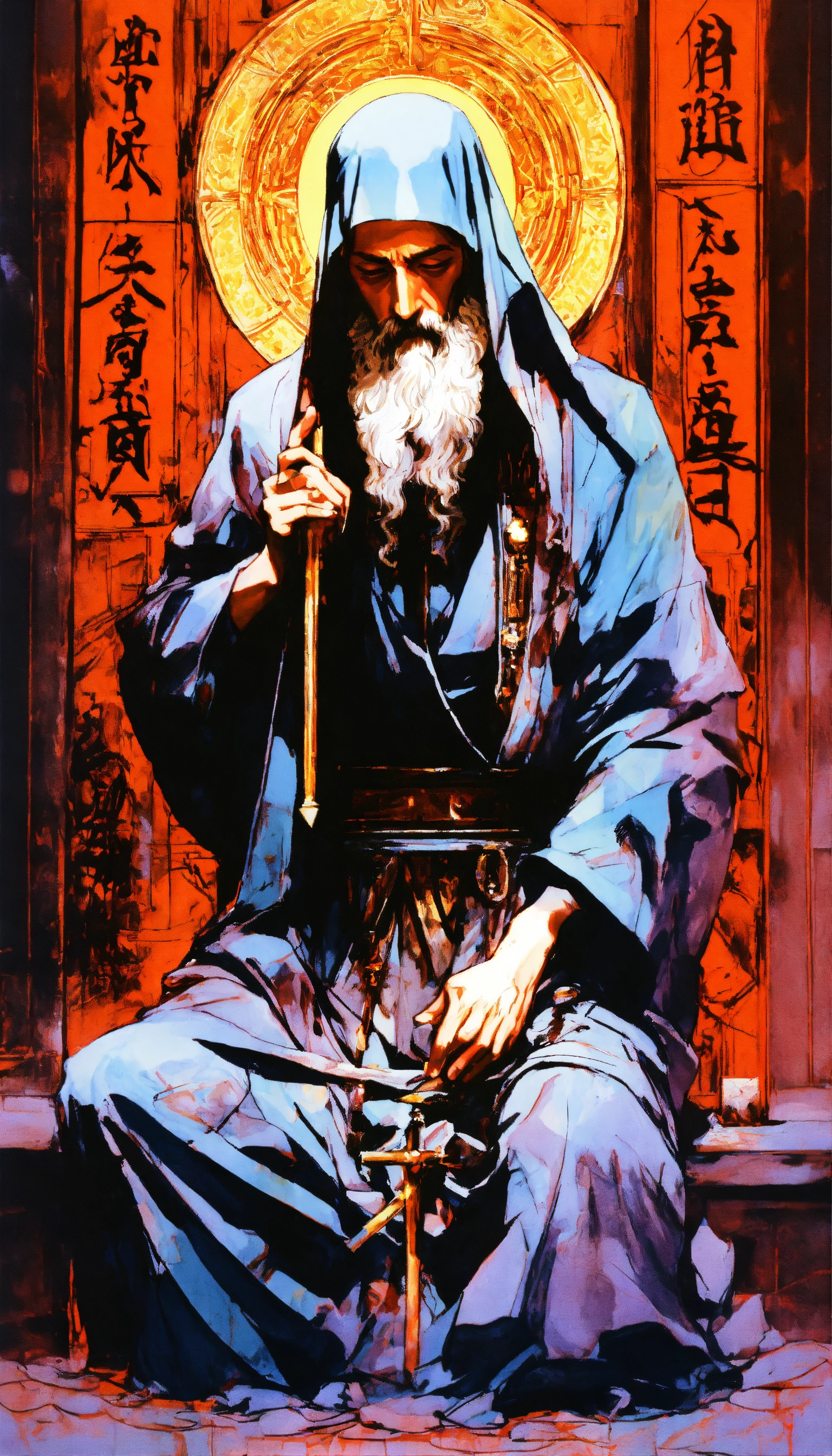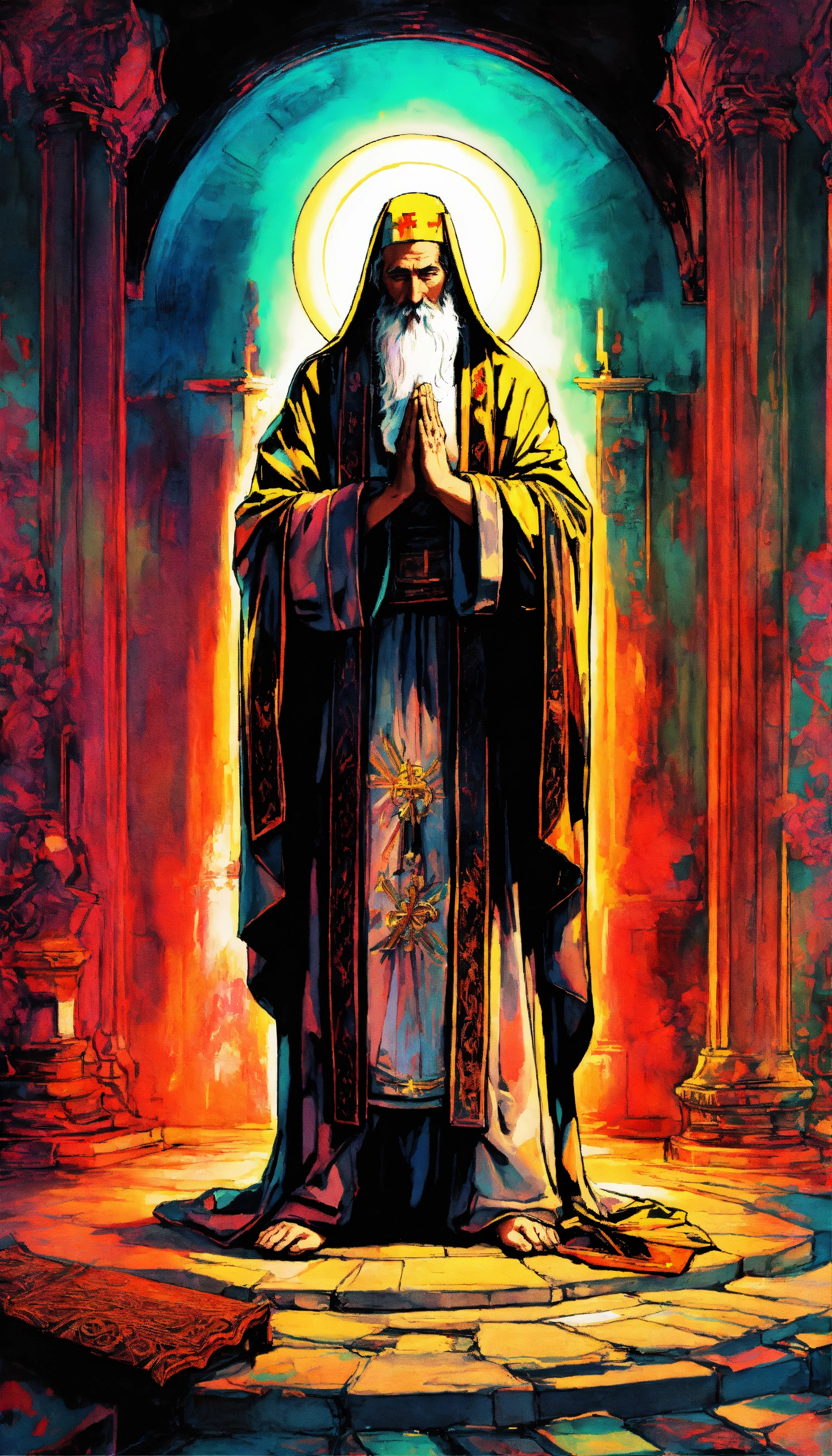 Saint isaac the syrian christian ortodox priest, god aided, praying on his knees in dark fantasy style, 90s drawing, neon colors, yoji shinkawa and katsuhiro otomo graphics and hiroyuki sawano epicness.