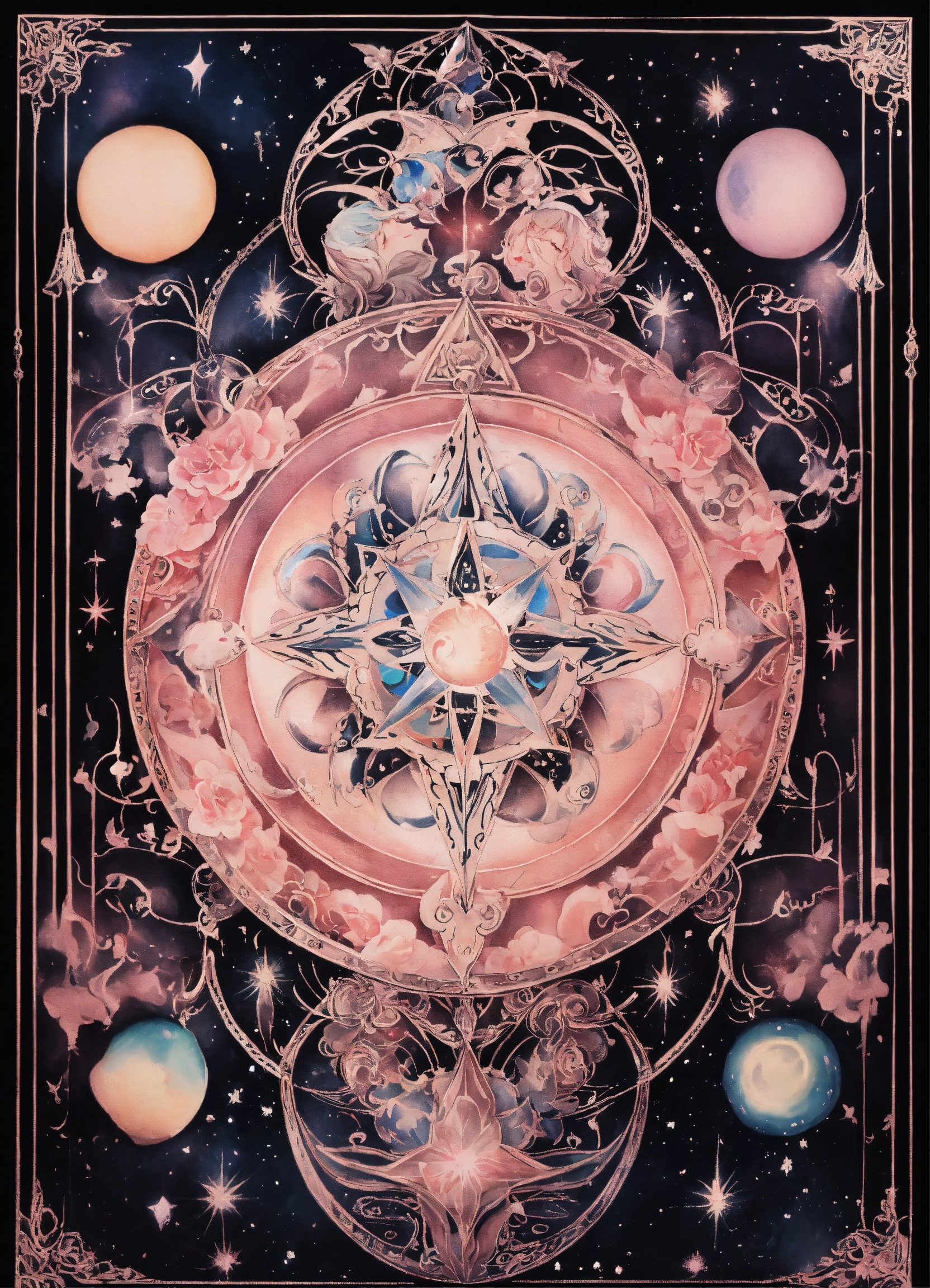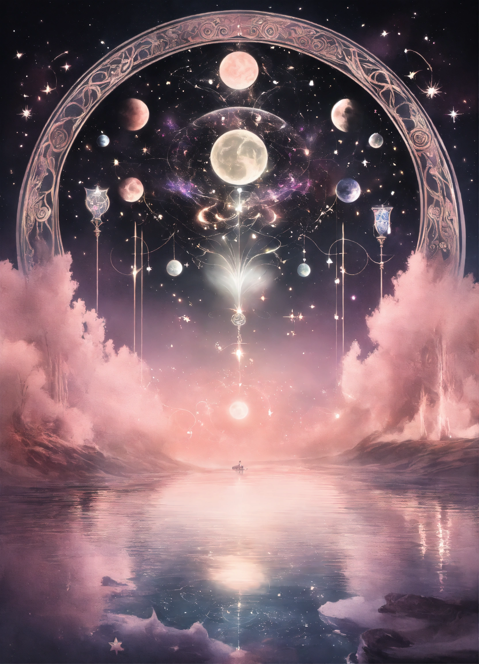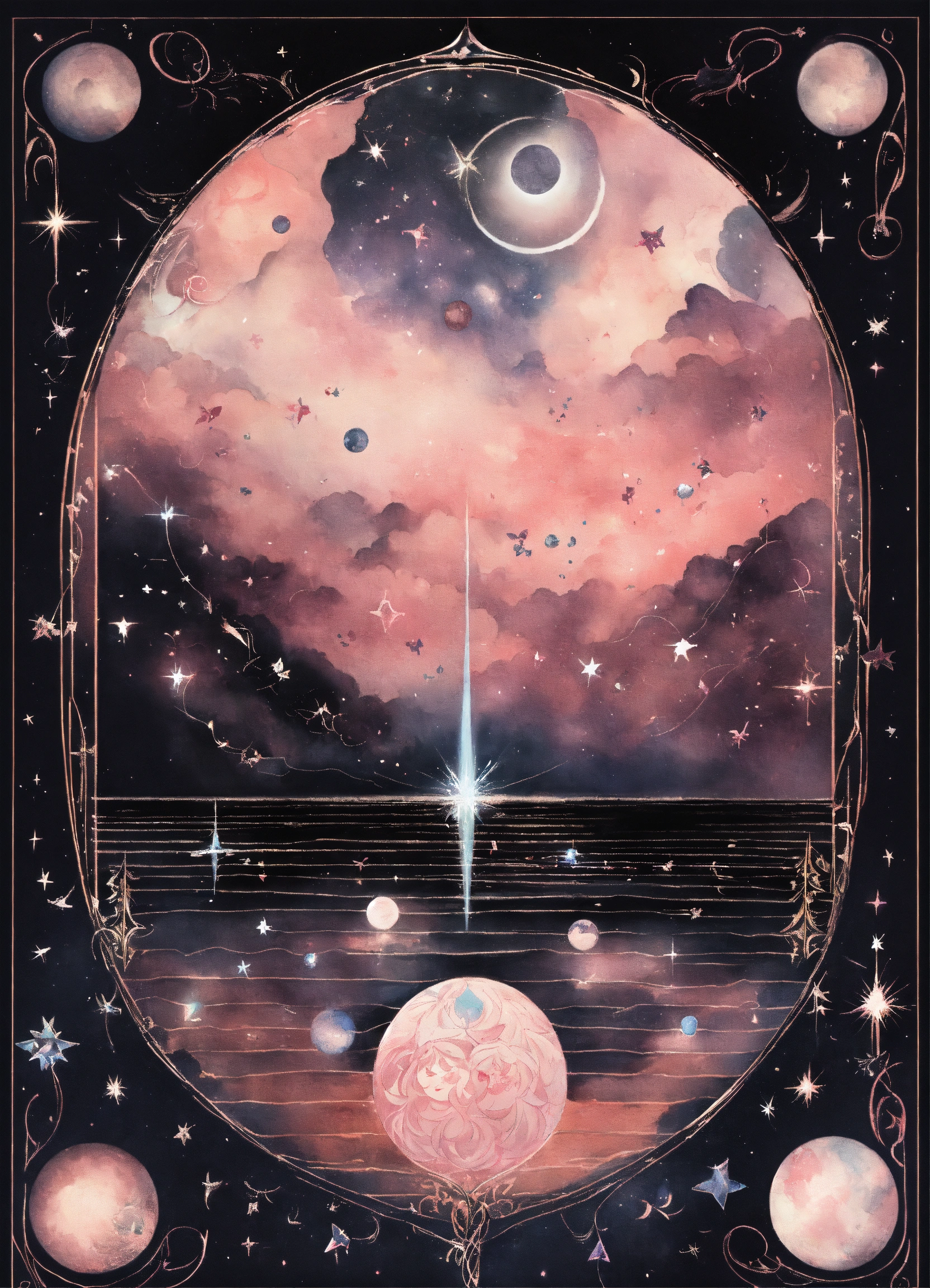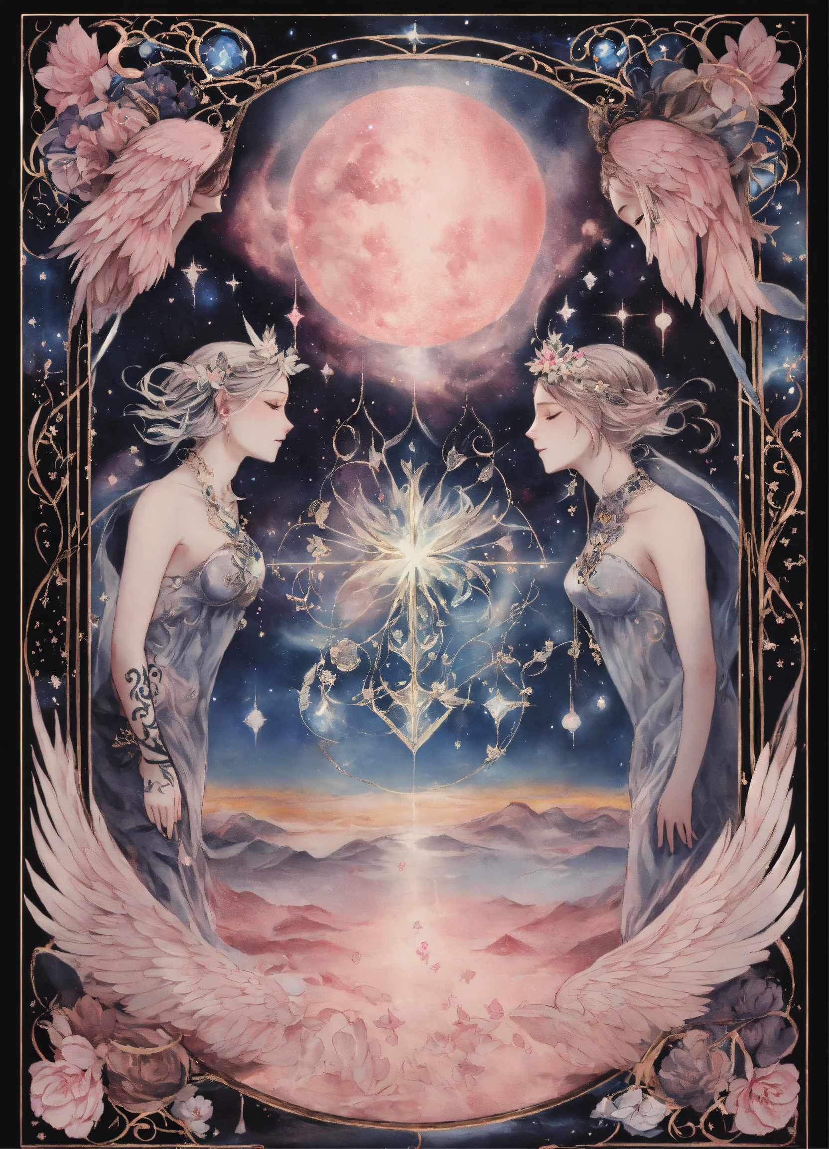 Tattoo style image of celestial souls with reflections all around like mirrors in the cosmos and the mystical, magical, feelings of deep love, spirit and soul, hues of white, black with touch of pale pink, twinkling stars as frame