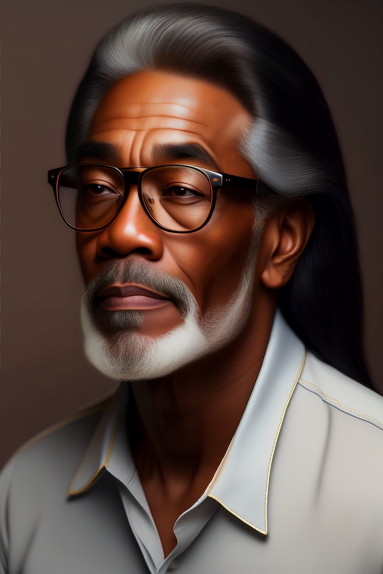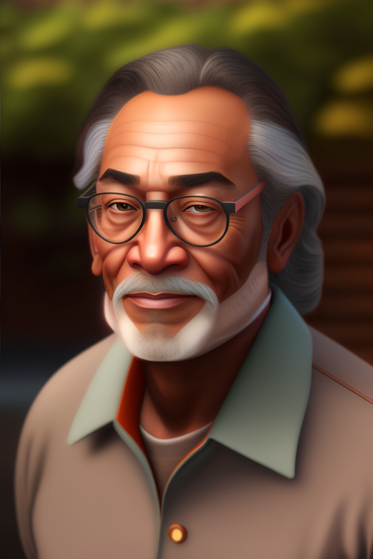 Old man with brown skin, long greasy black hair, goatee beard, round black lens glasses, wrinkles on his face, skinny, polo shirt