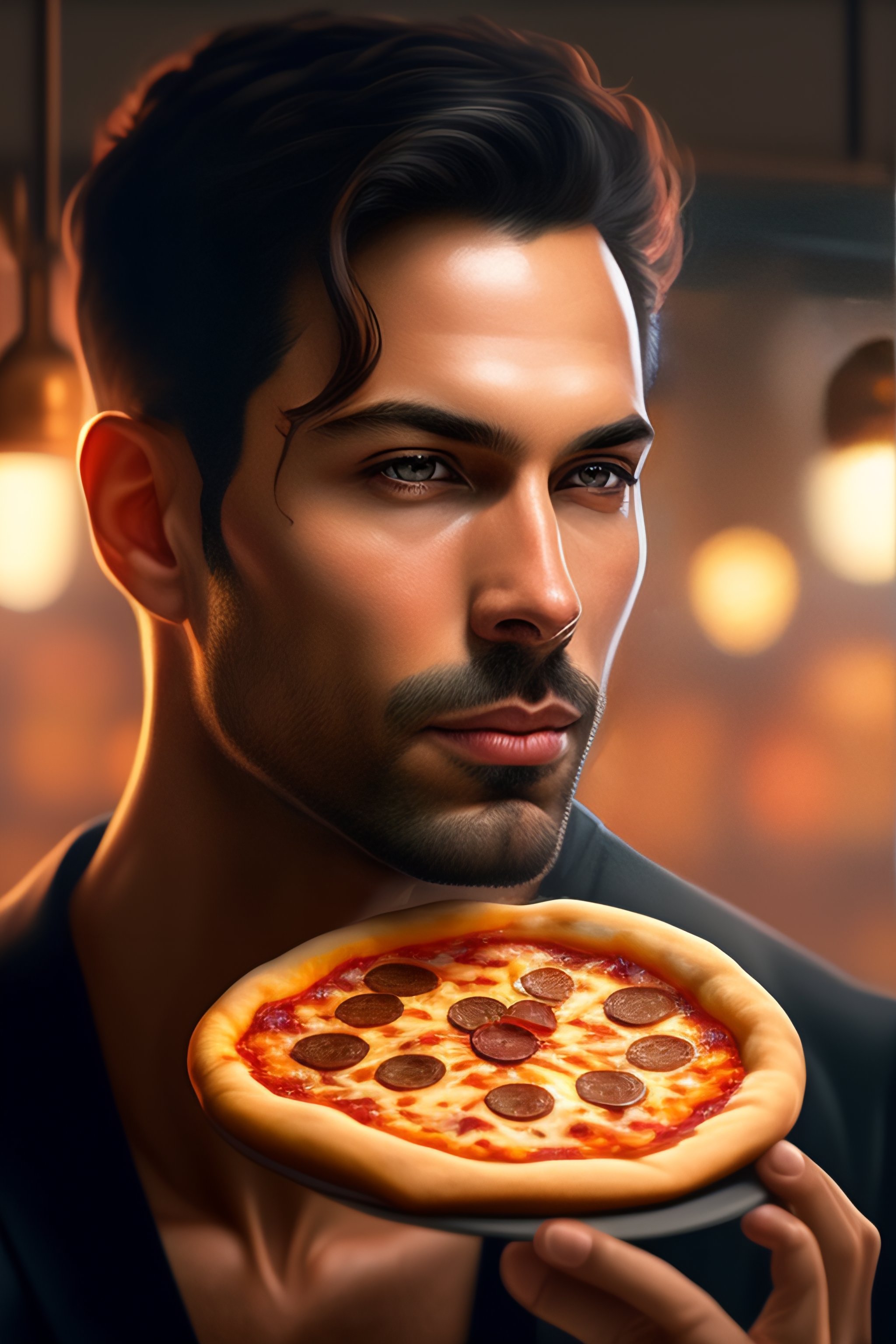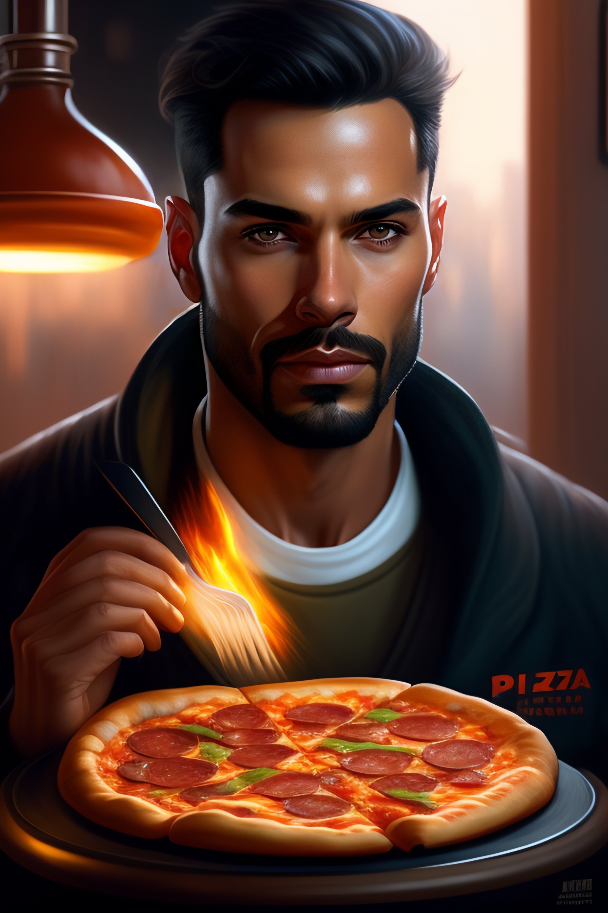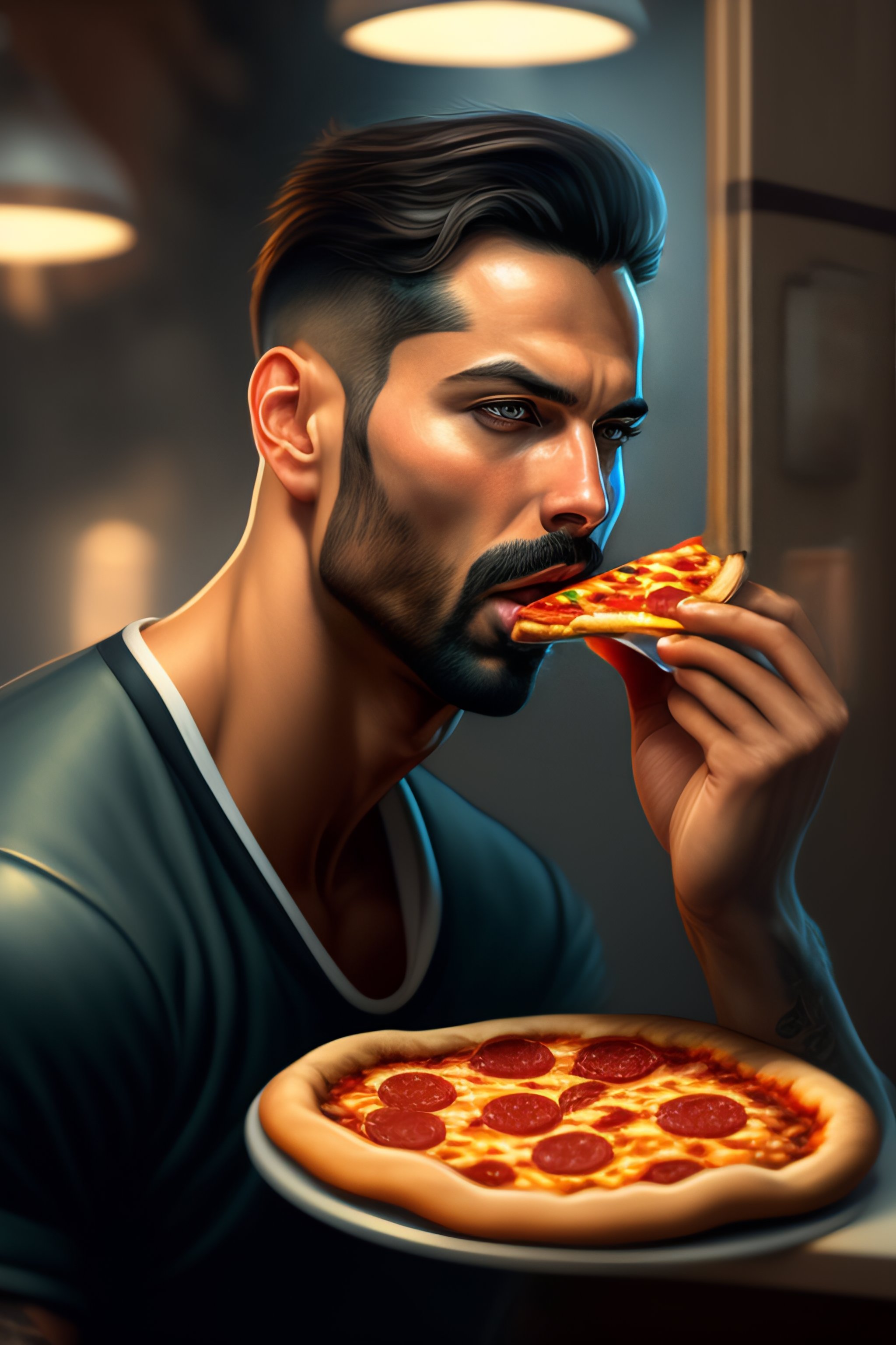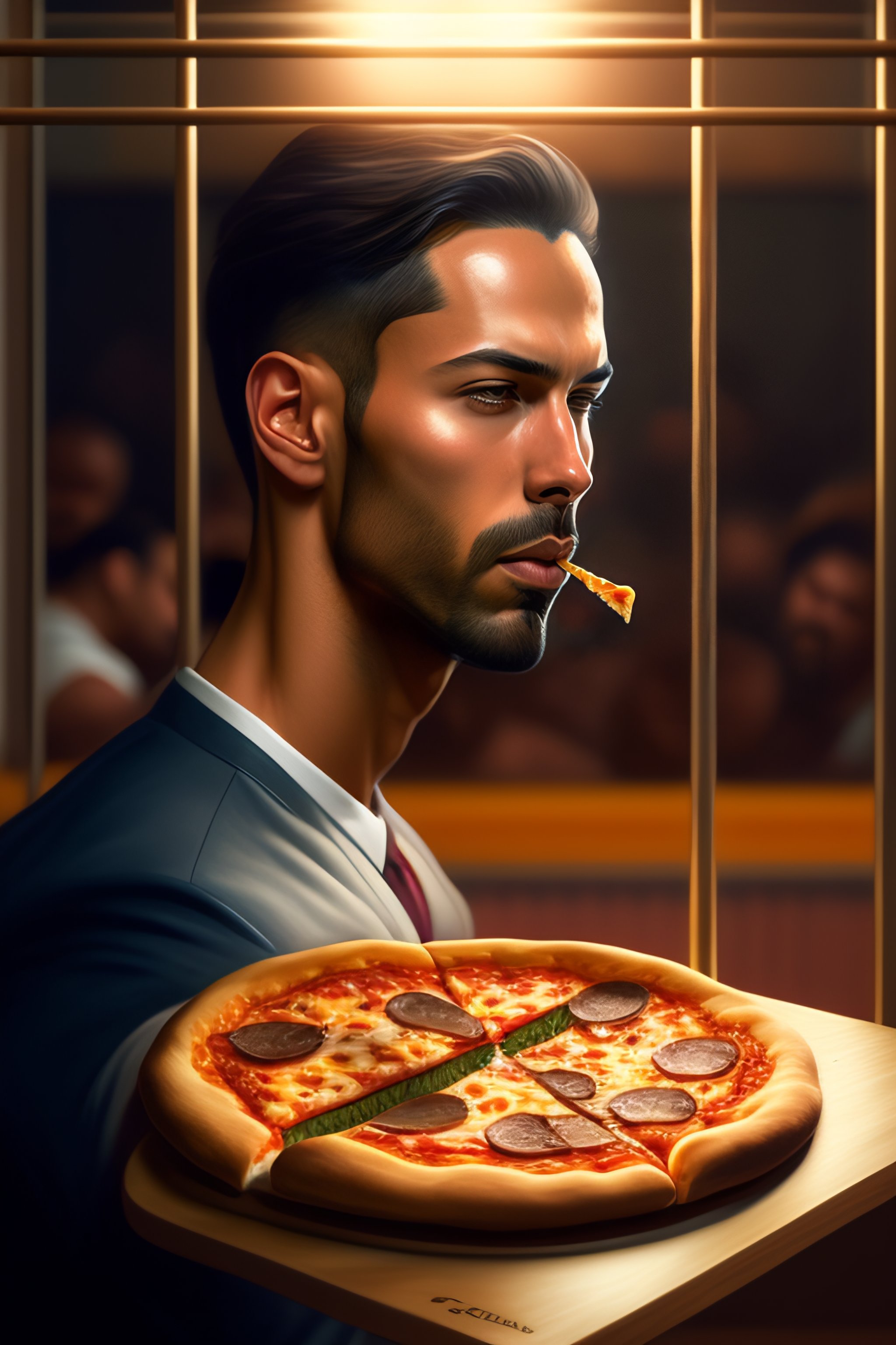Andrew tate eating pizza in jail, realistic portrait, symmetrical, highly detailed, digital painting, artstation, concept art, smooth, sharp focus, illustration, cinematic lighting, art by artgerm and greg rutkowski and alphonse mucha