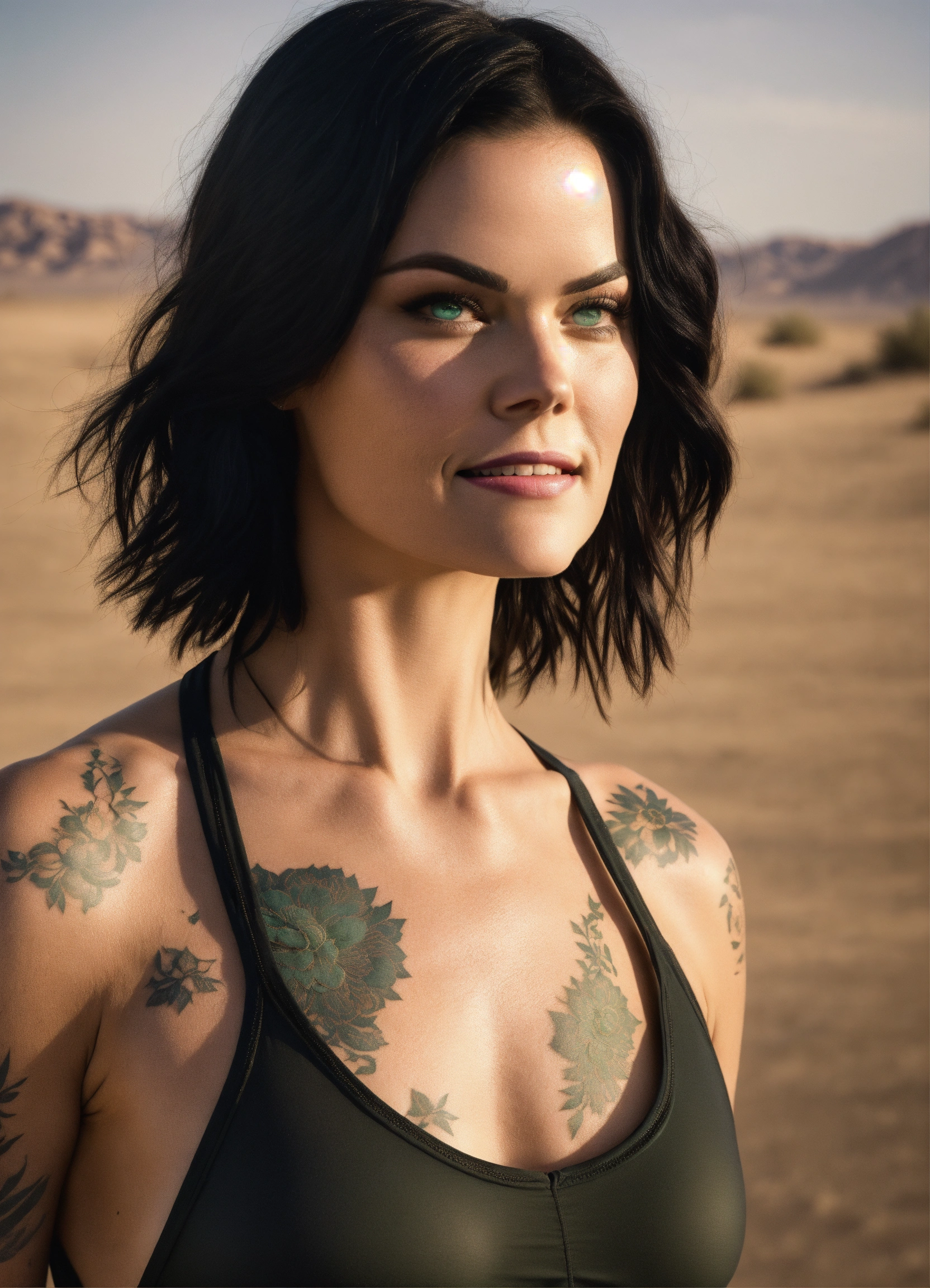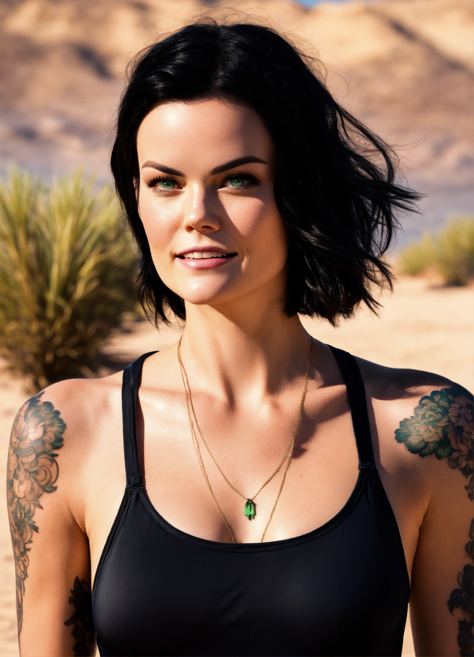 Beautiful jaimie alexander with light green eyes and face with dark makeup as jane doe in blindspot tv series, dressed with two pieces black swimsuit, smiling, full body, tatooed, walking in a desert, 8k resolution, photorealism, hard light photo, hyper detailed, intricately detailed