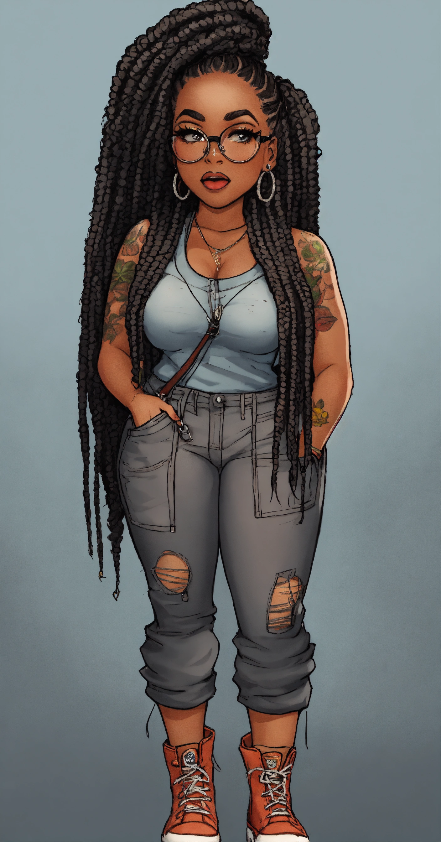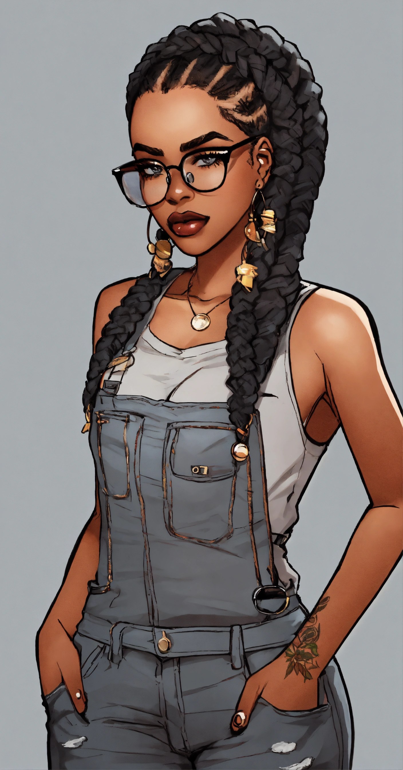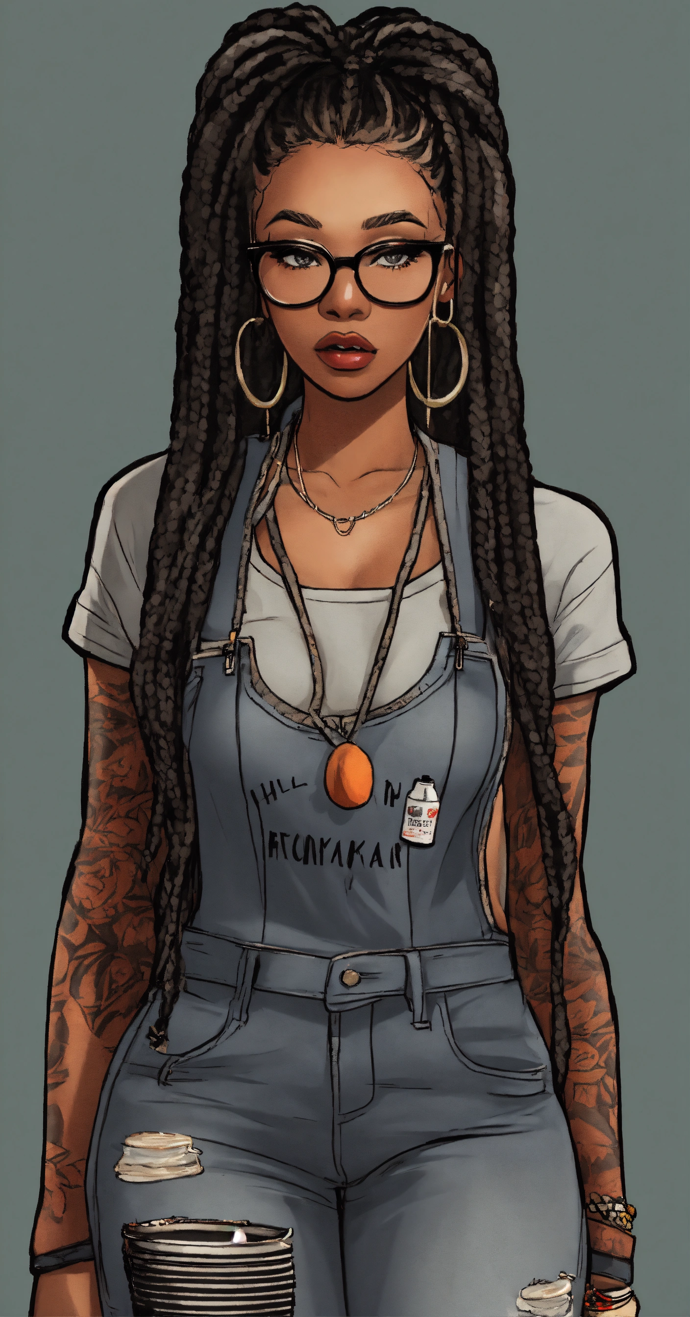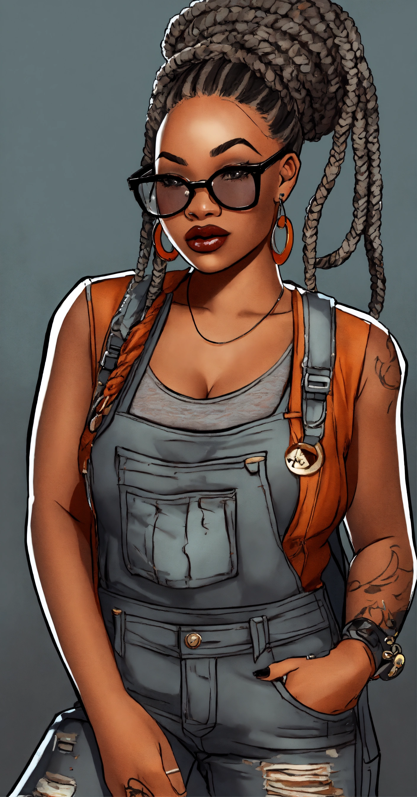 Cartoon, illustration, african american goth rockabilly full figure woman wearing glasses frayed and distressed work jumpsuit over a grey ribbed tank top box- braid long hairstyle autumn theme