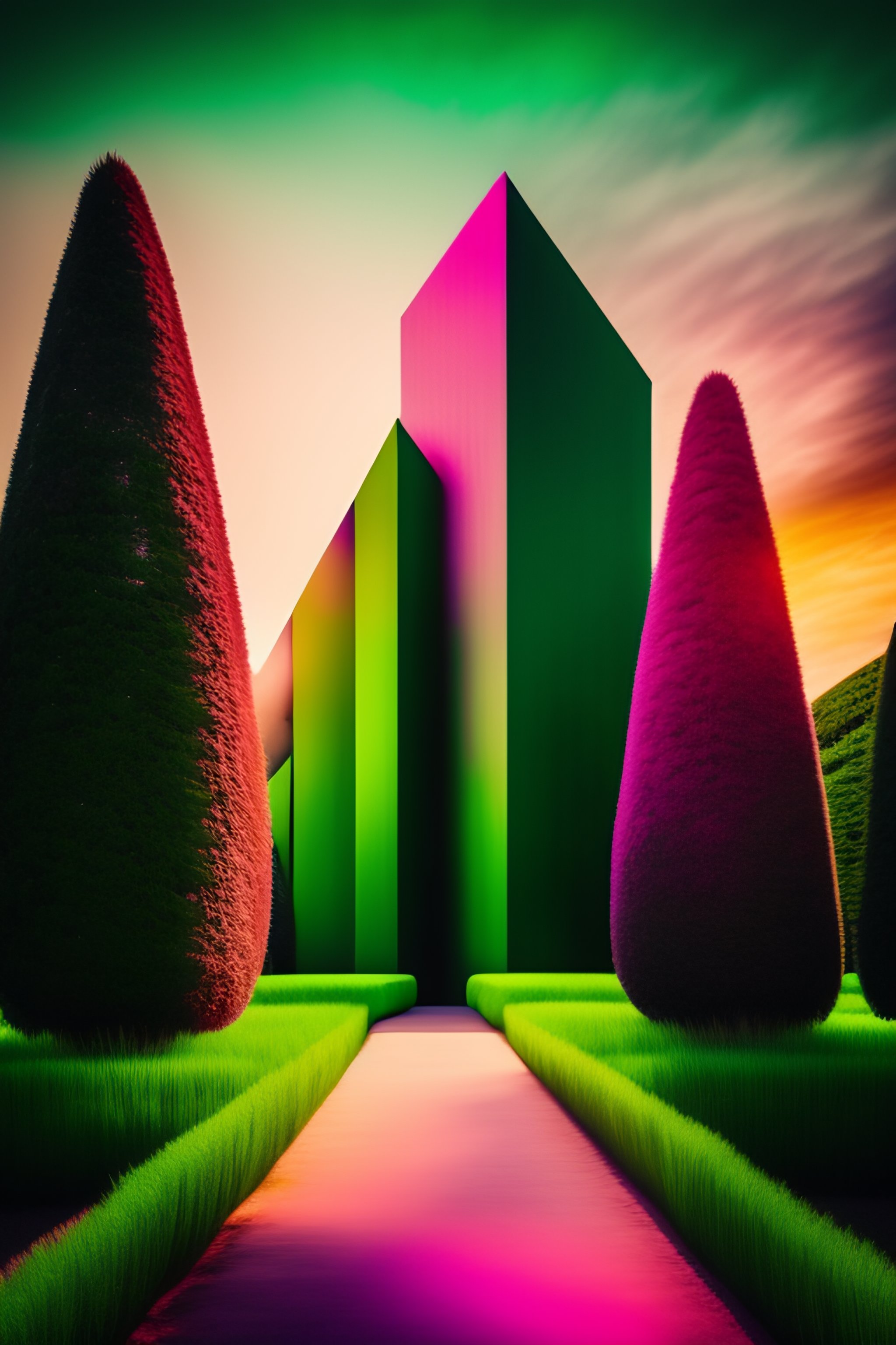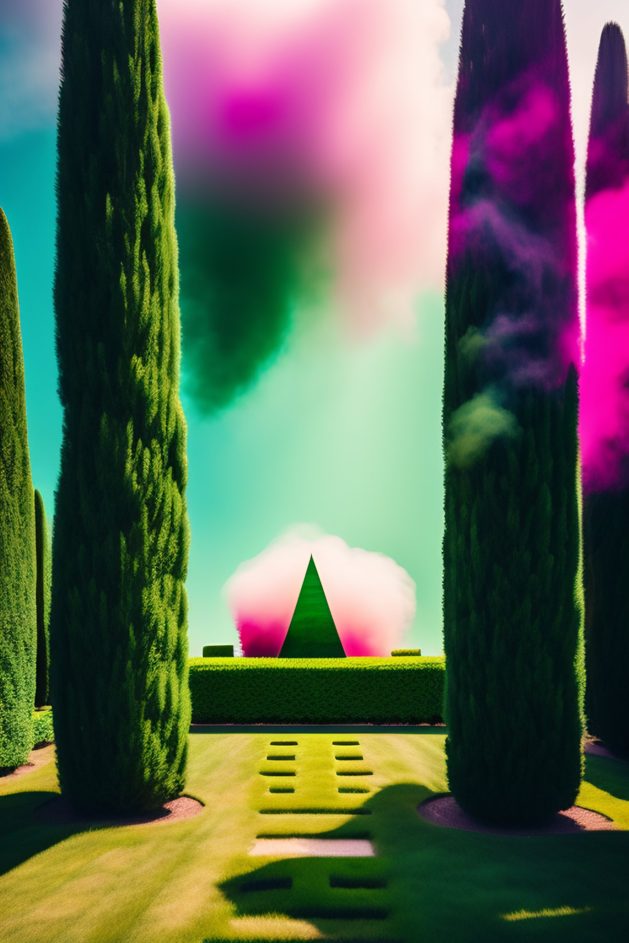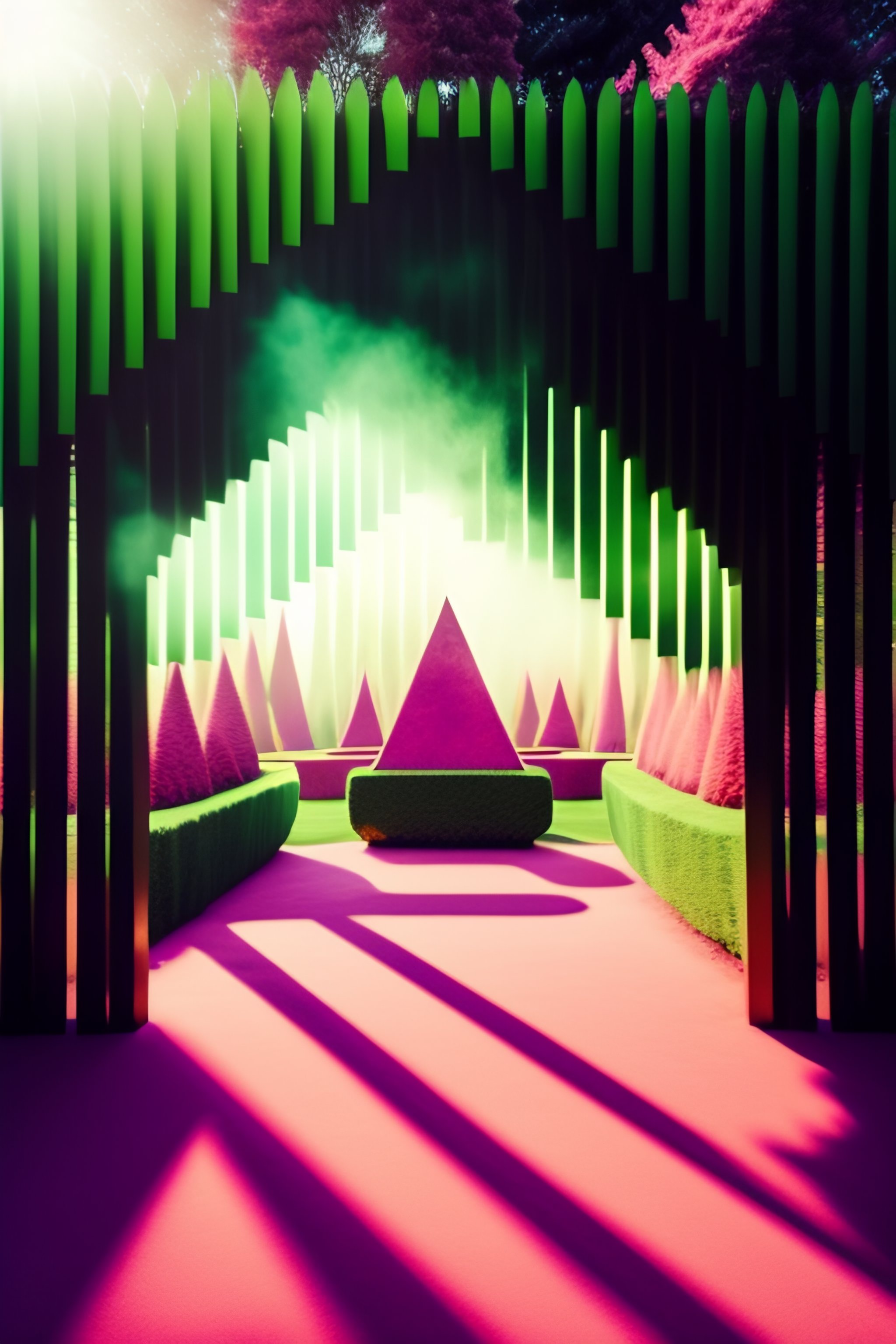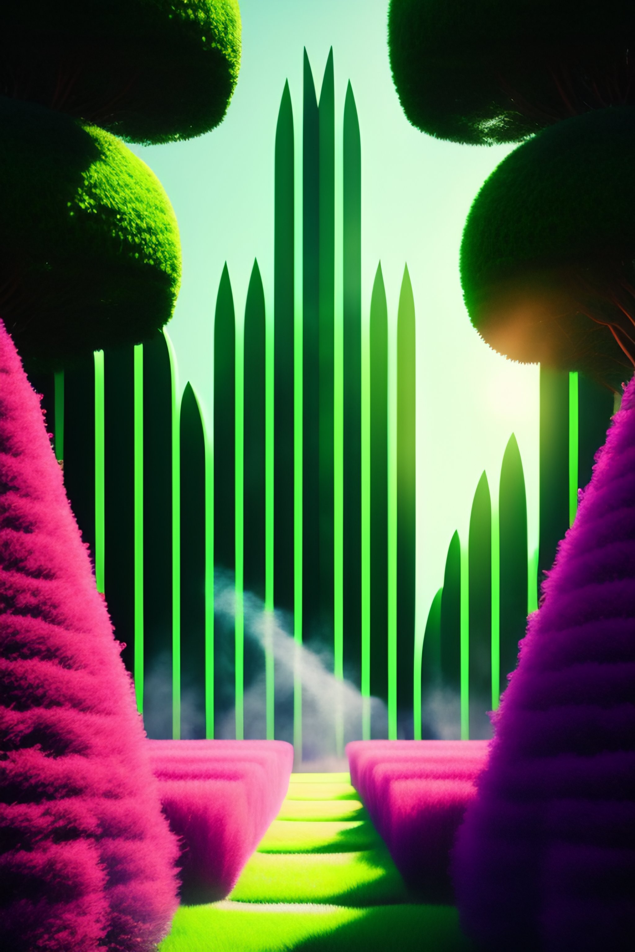 Tall green hedge maze, green grass, evil monster in shadows, light pink smoke, geometric, minimal, vintage, creepy