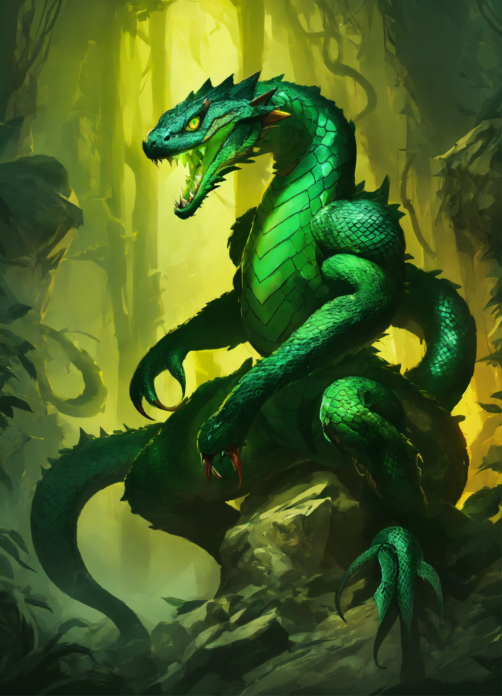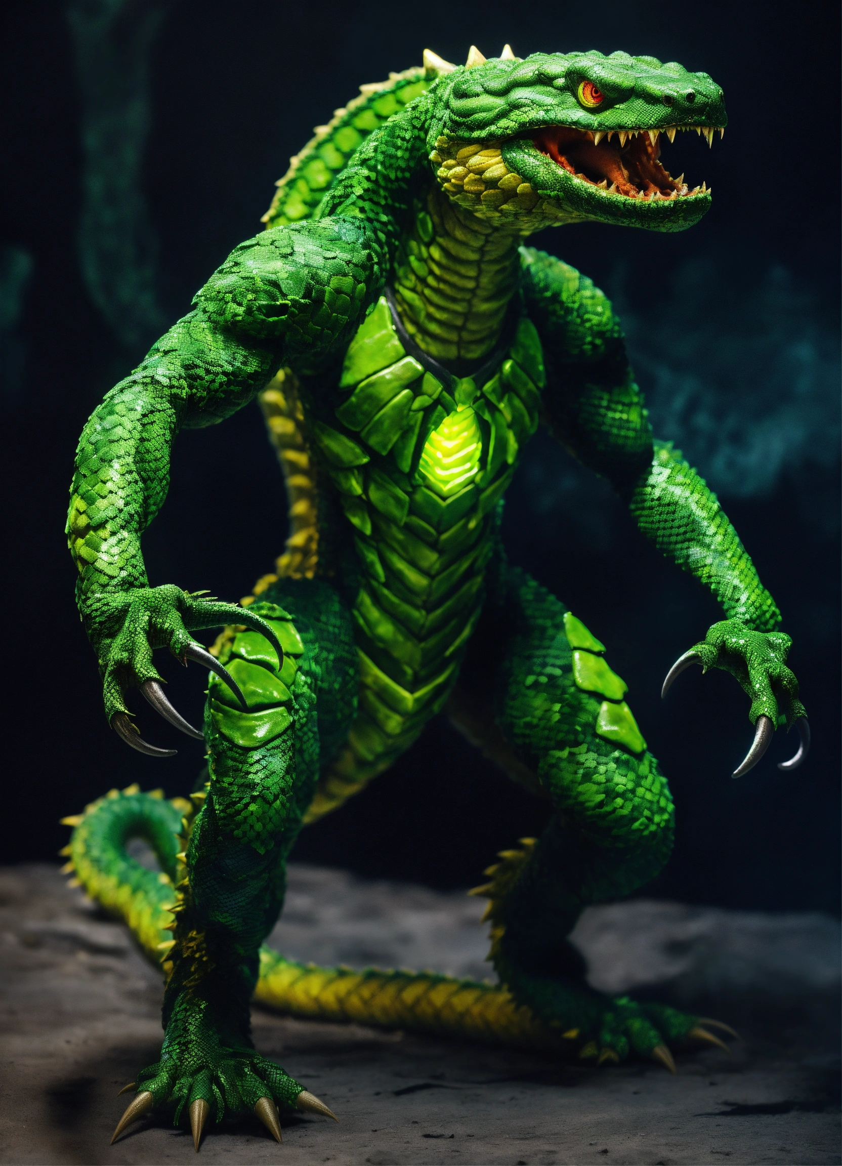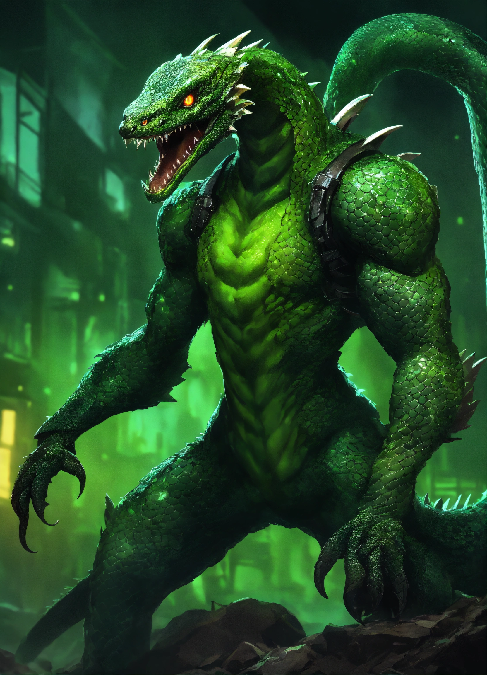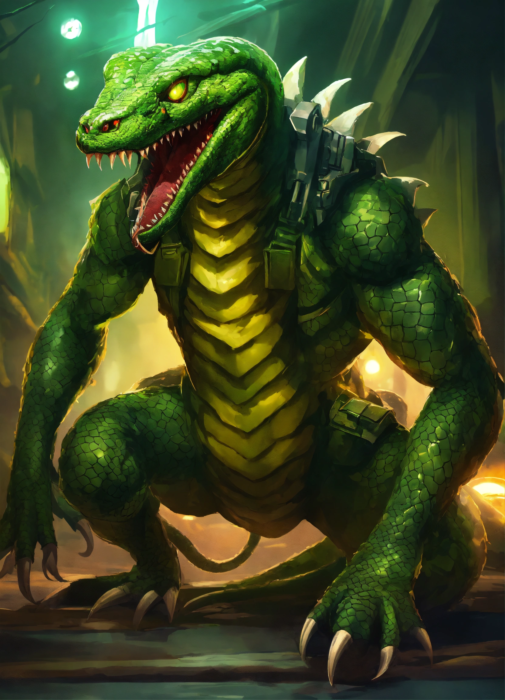 A bipedal snake monster with arms and leg, dark green scales, sharp fangs, and glowing green eyes. the snake monster is wearing up torn up green military gear