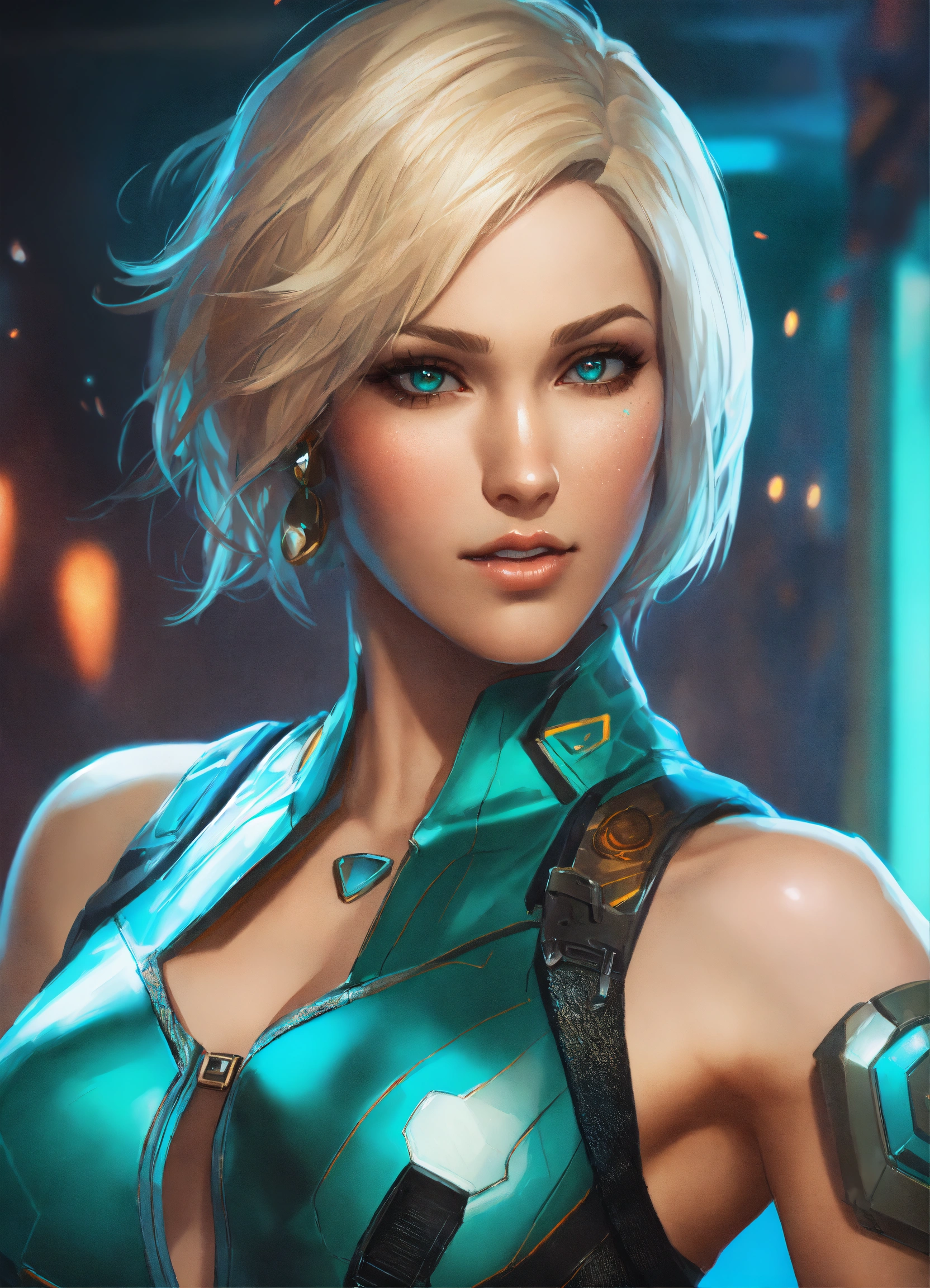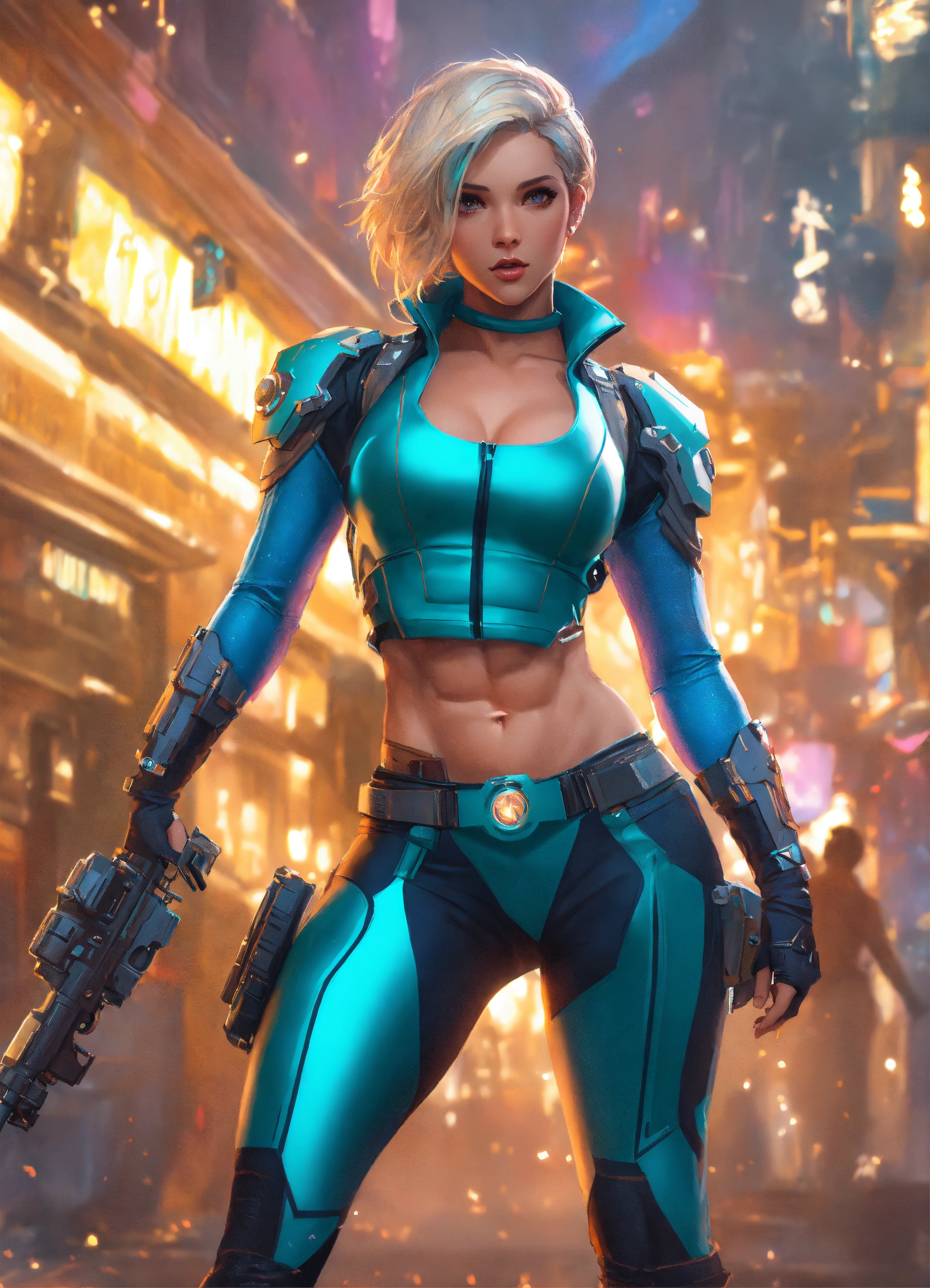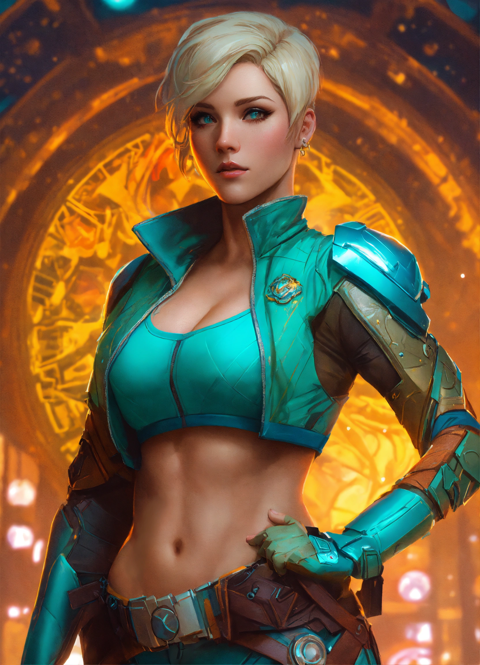 Meg turney, beautiful super villain woman with platine blonde short hair, extremely muscular, lazer eyes, big muscles, wearing turquoise clothes clan attire crop top, with tattoos on body, on full-body view, greg rutkowski, ultra detailed, volumetric lighting, tracer from overwatch, cosmic goddess, suit made out of stars and galaxies and cosmic energy, intricate, headshot, highly detailed, digital painting, artstation, concept art, sharp focus, cinematic lighting, illustration, art by artgerm and greg rutkowski, alphonse mucha, cgsociety