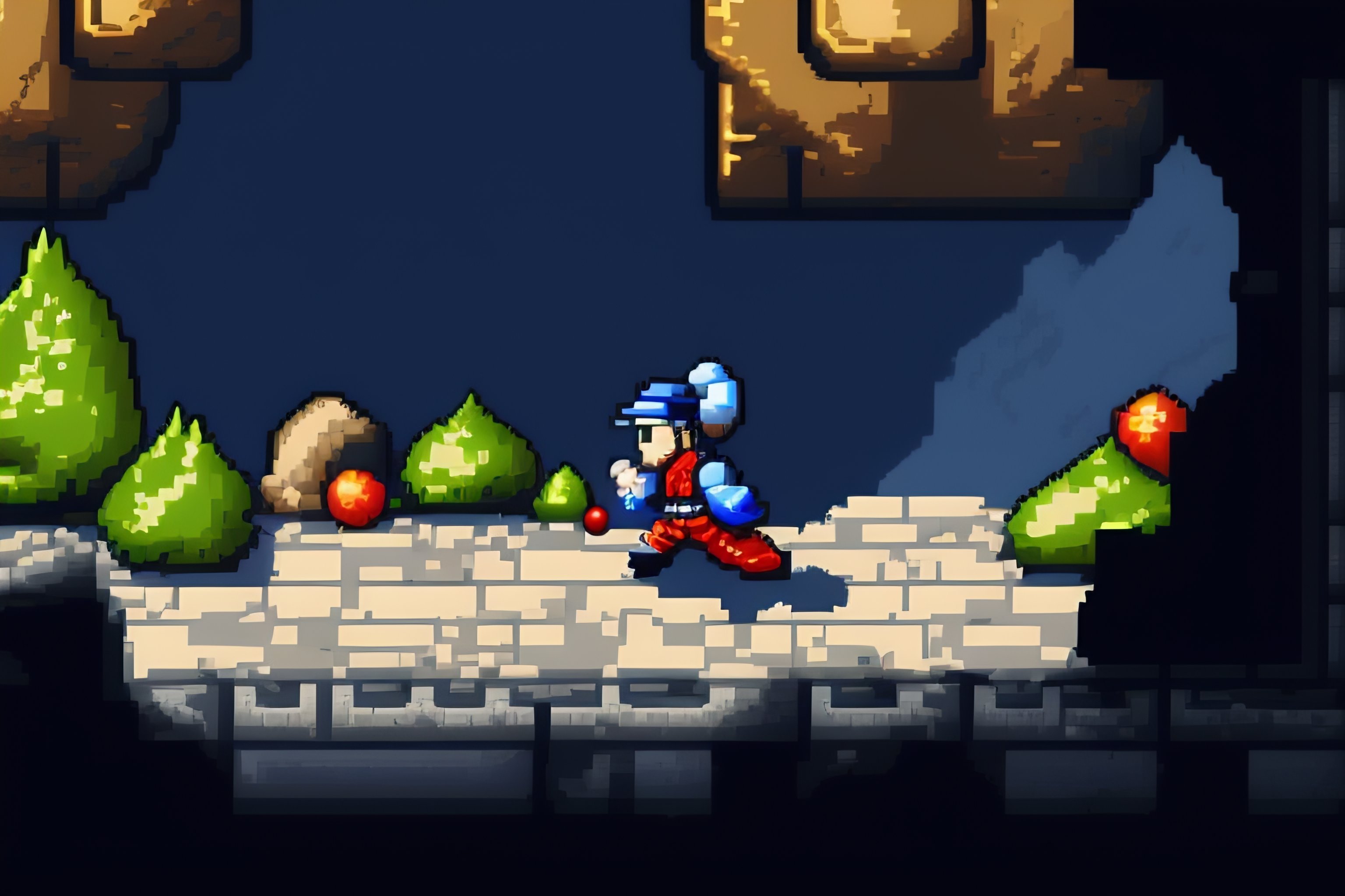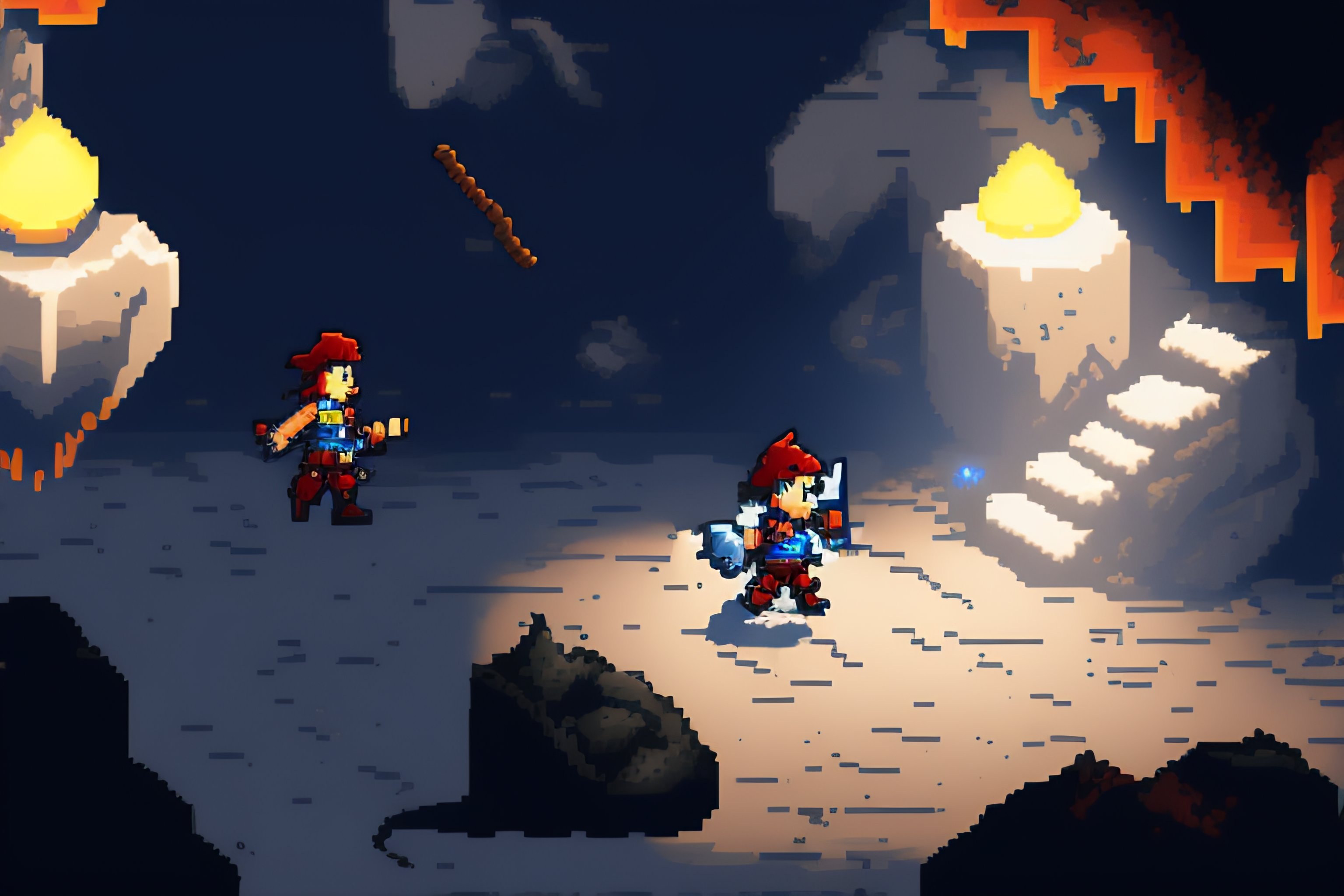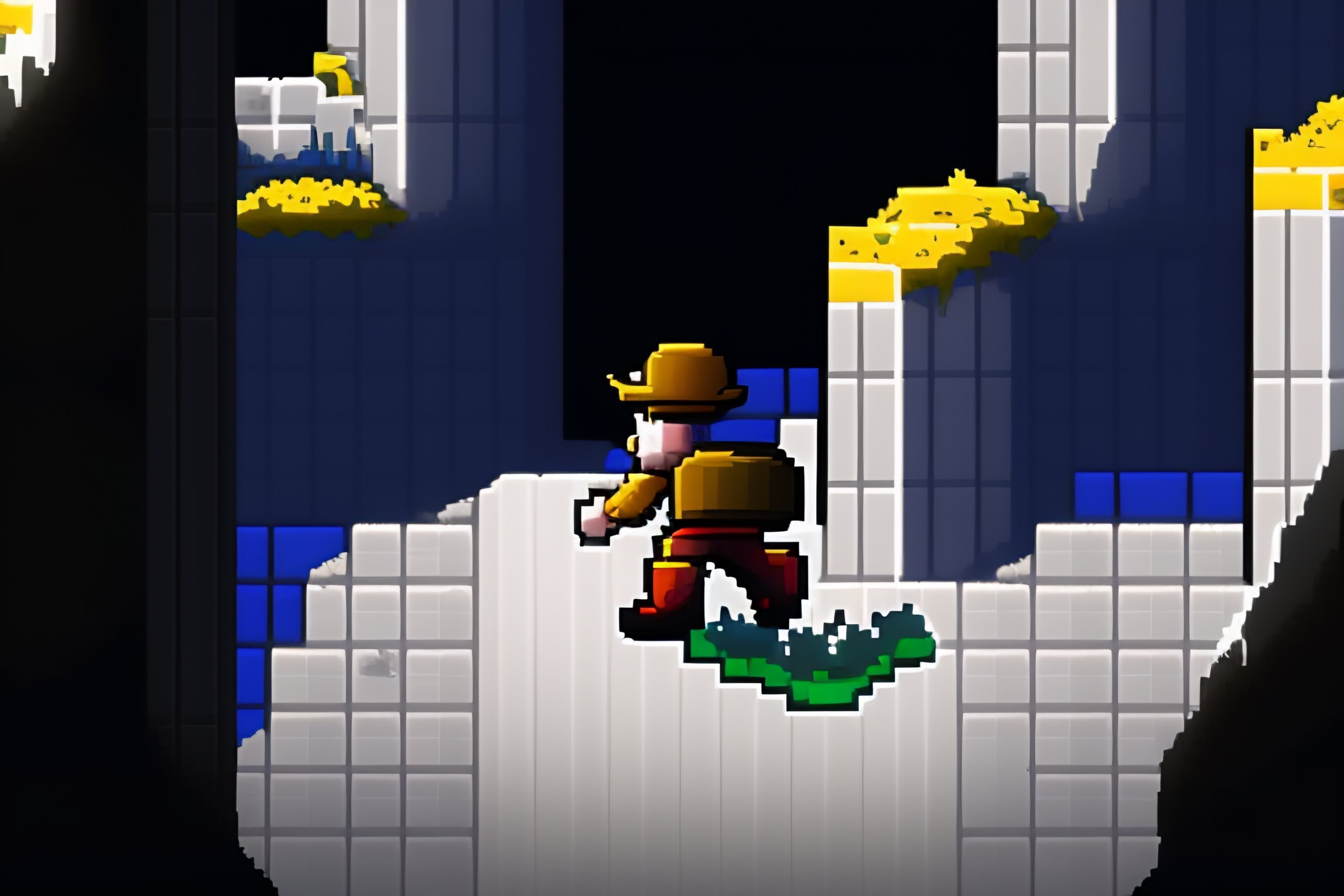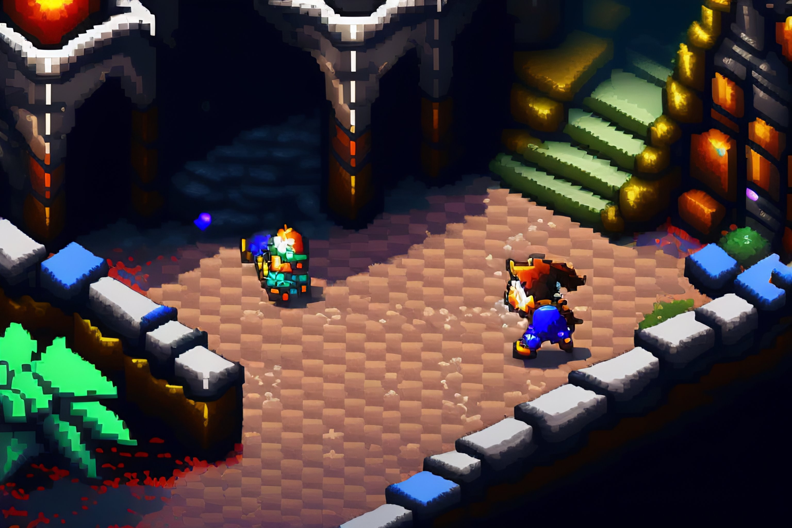 Pixel art top down video game screenshot character fighting through a stone dungeon in mostly black, white, gray, and blue