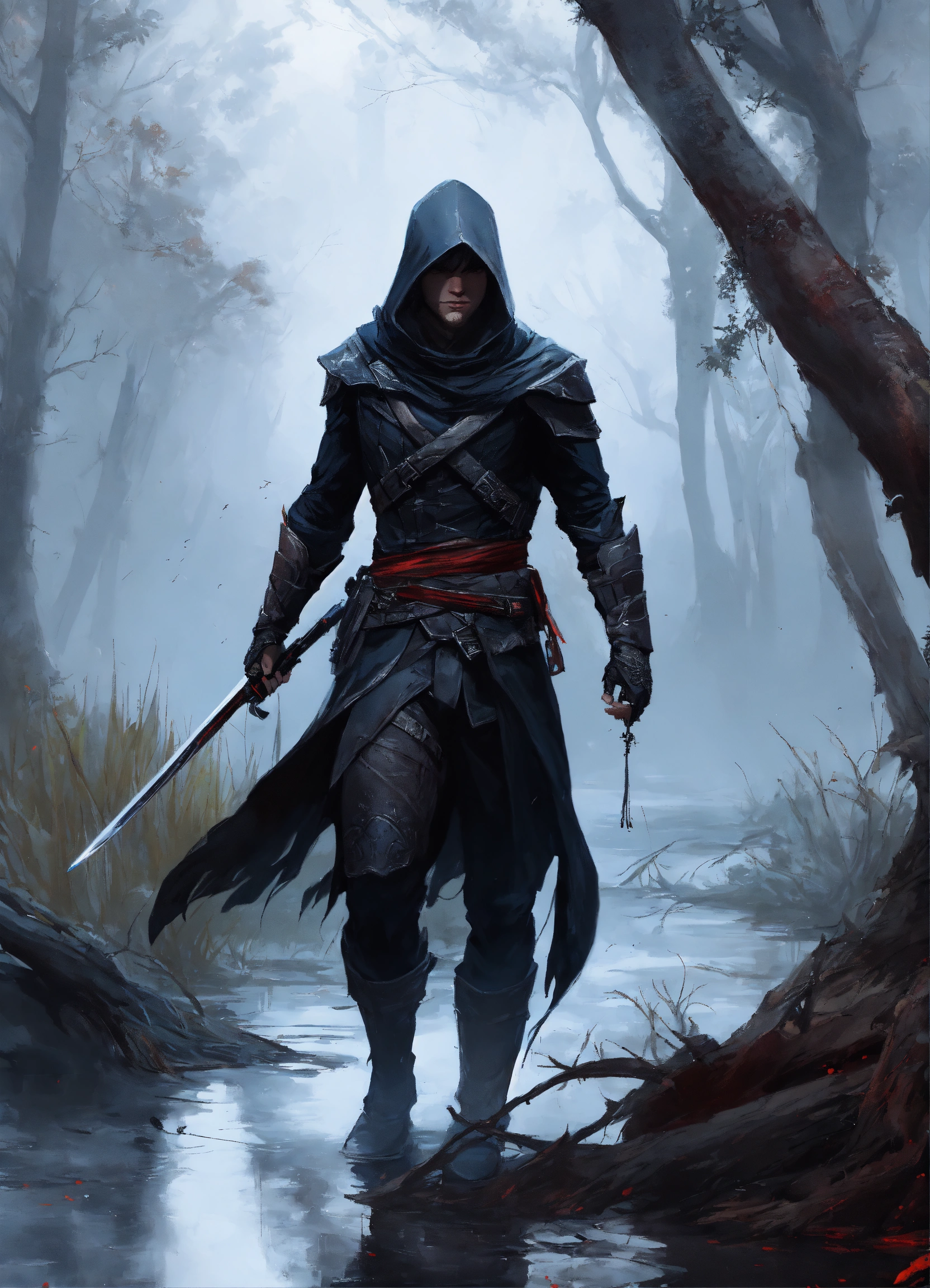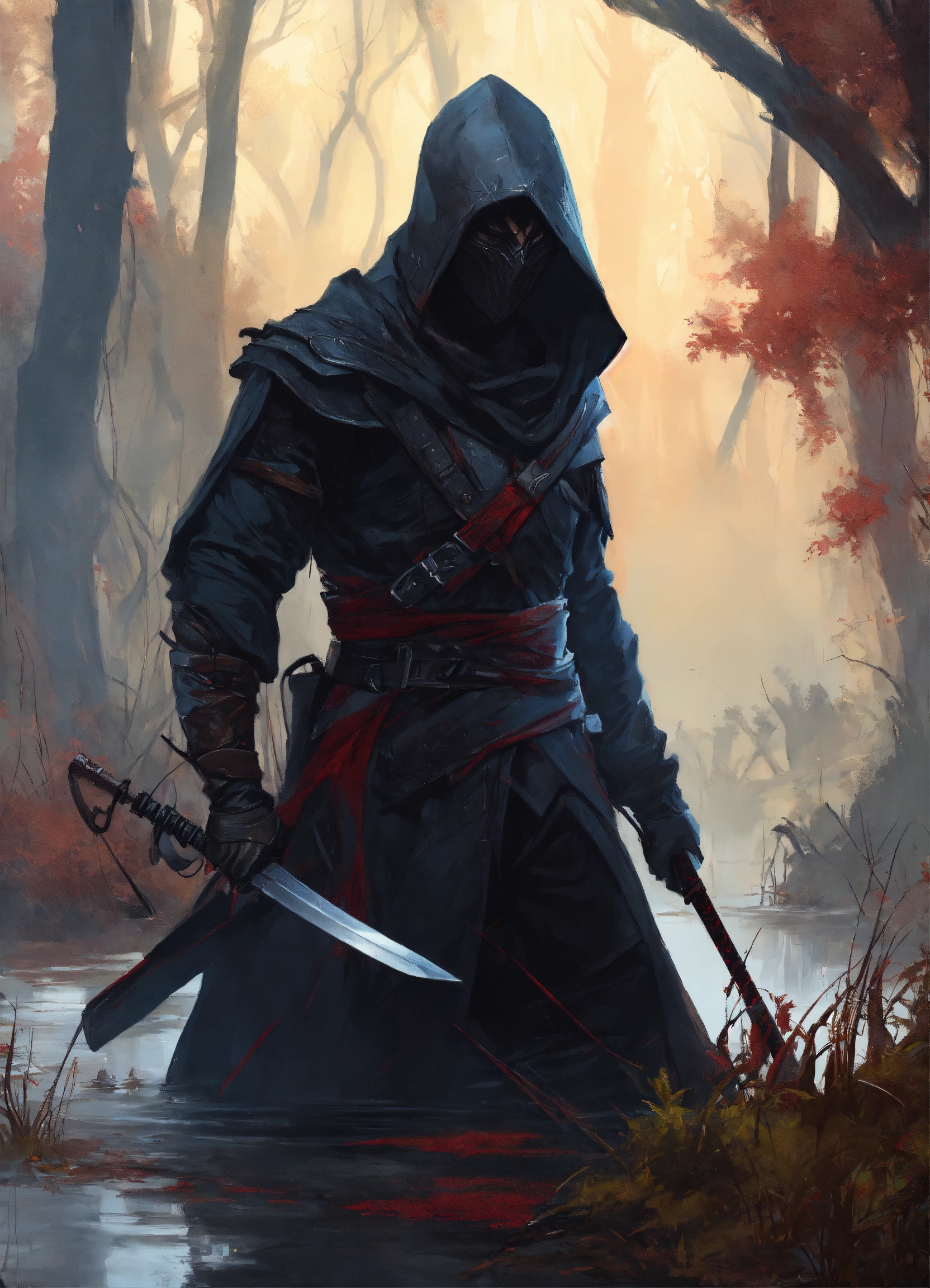 Vivid painting, sideview of an male assassin in attack stance with black compat cowl, in a swamp covered by corpses. the surrounding is foggy and dead trees, by artgerm, intricate detail, trending on artstation, 8k, fluid motion, stunning shading, by wlop