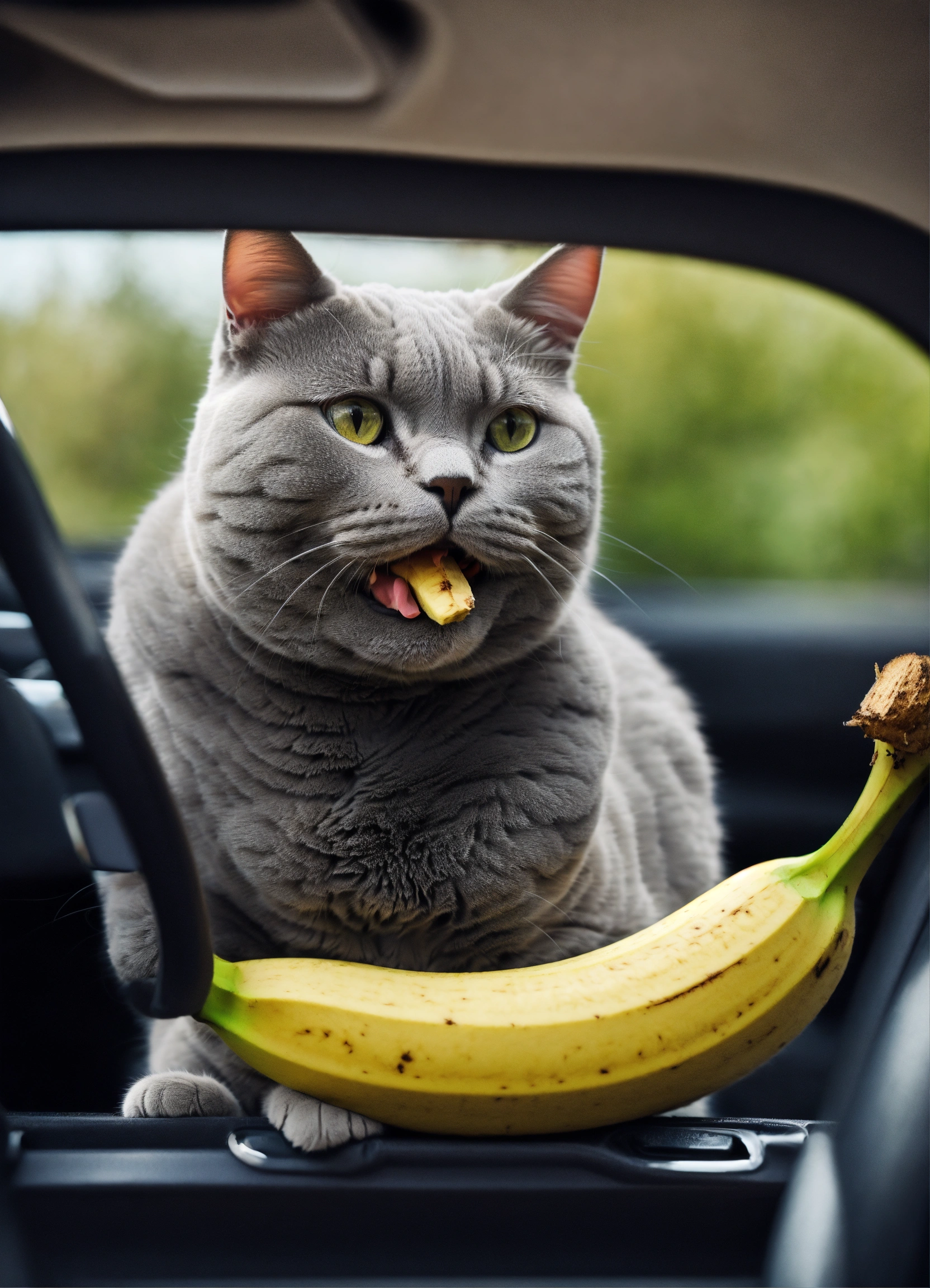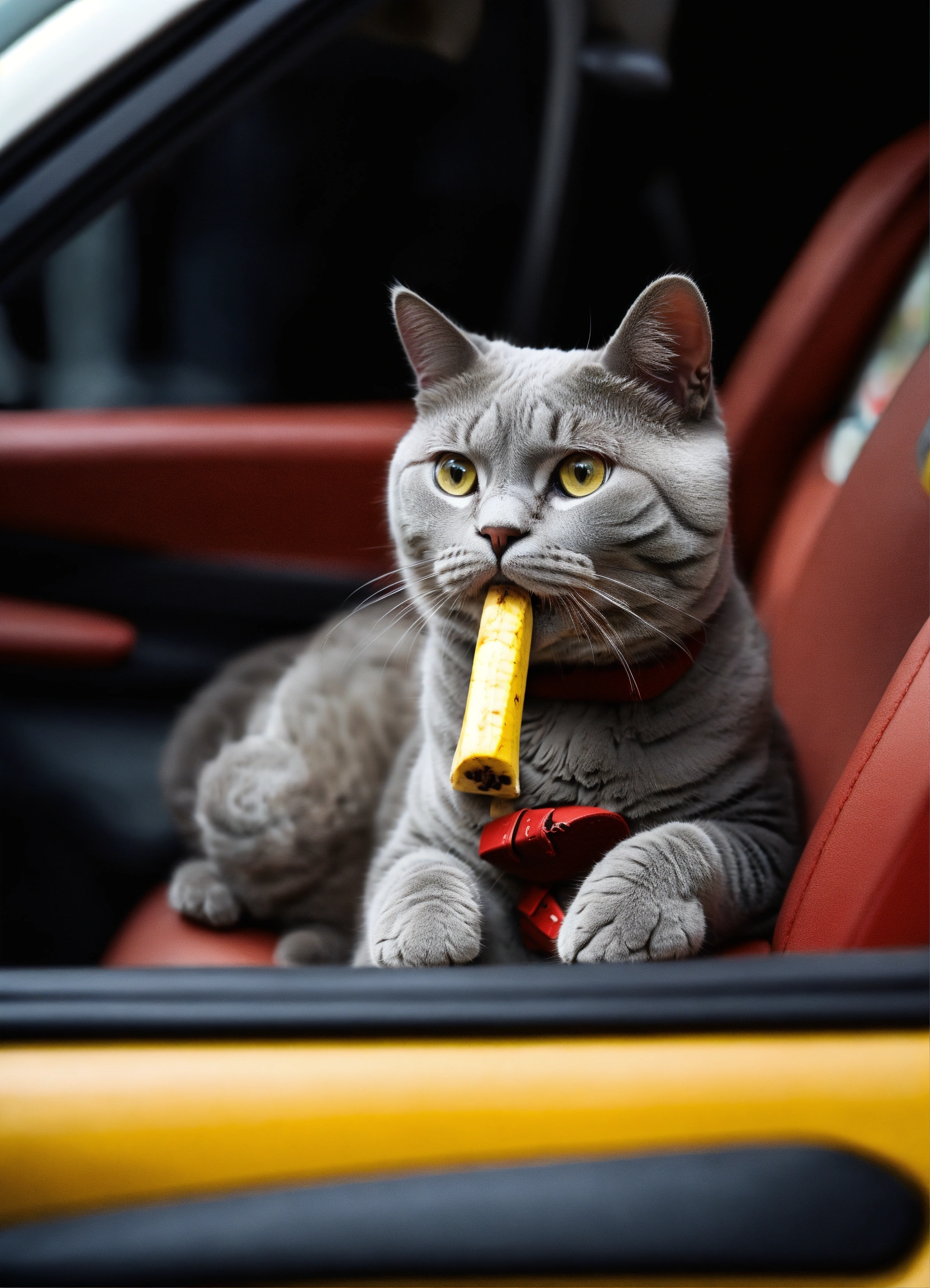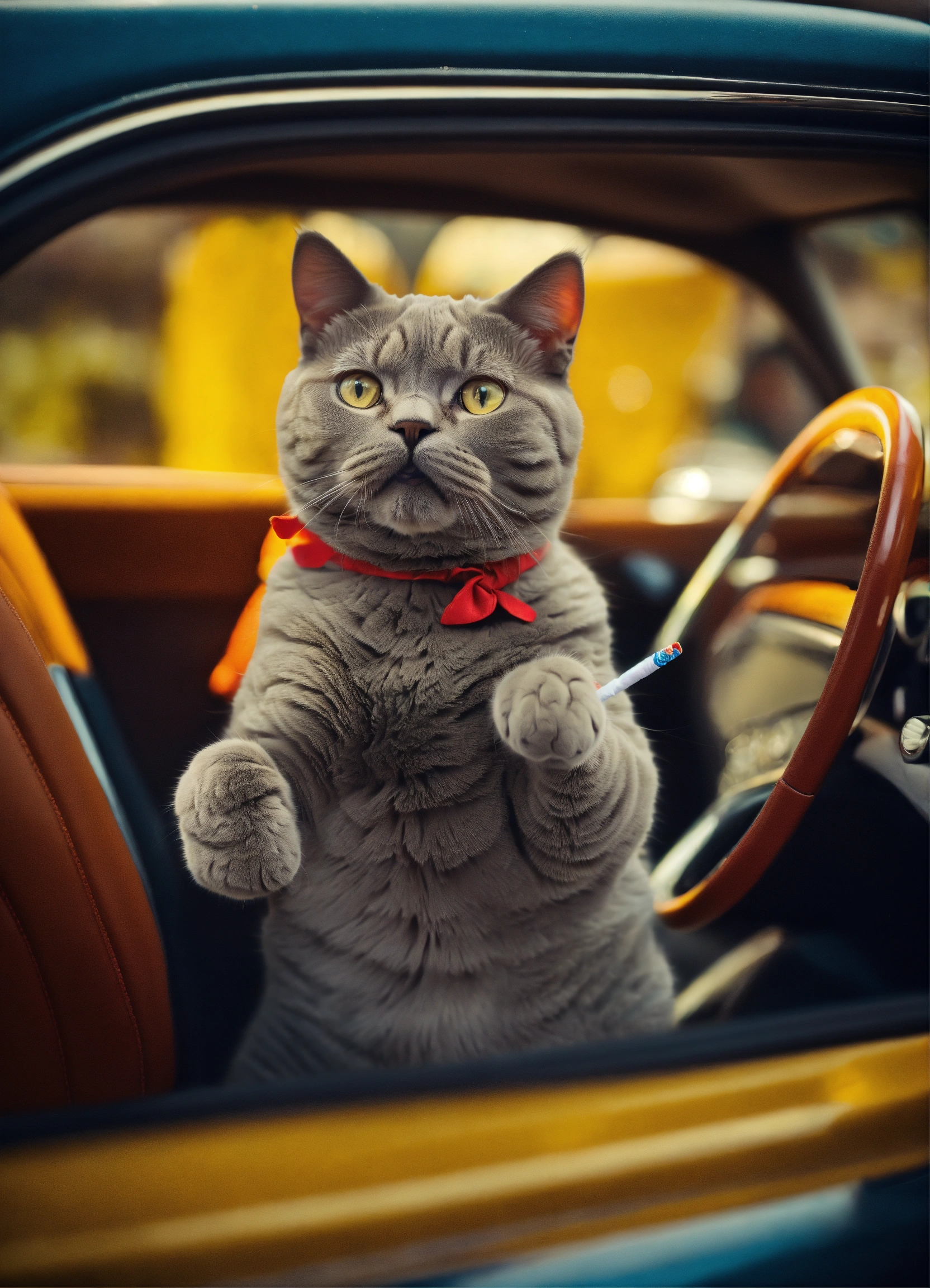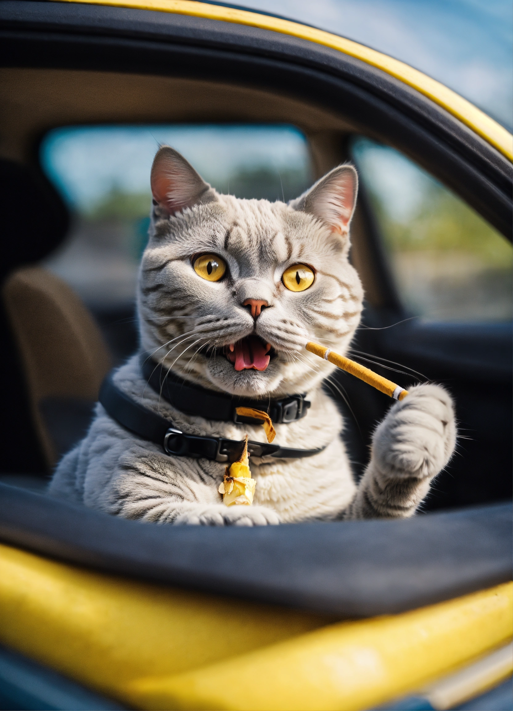 Human acting british shorthair cat in car with cigarette in mouth, phoneing with banana like telephone, 100 cats dancing arround he car