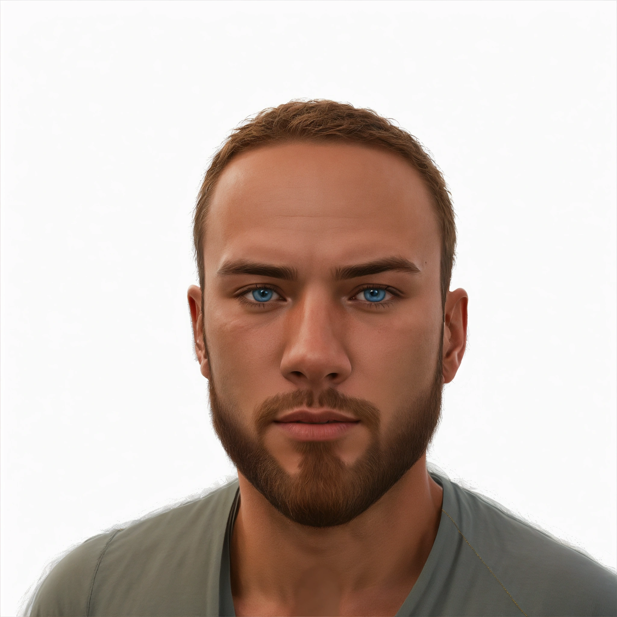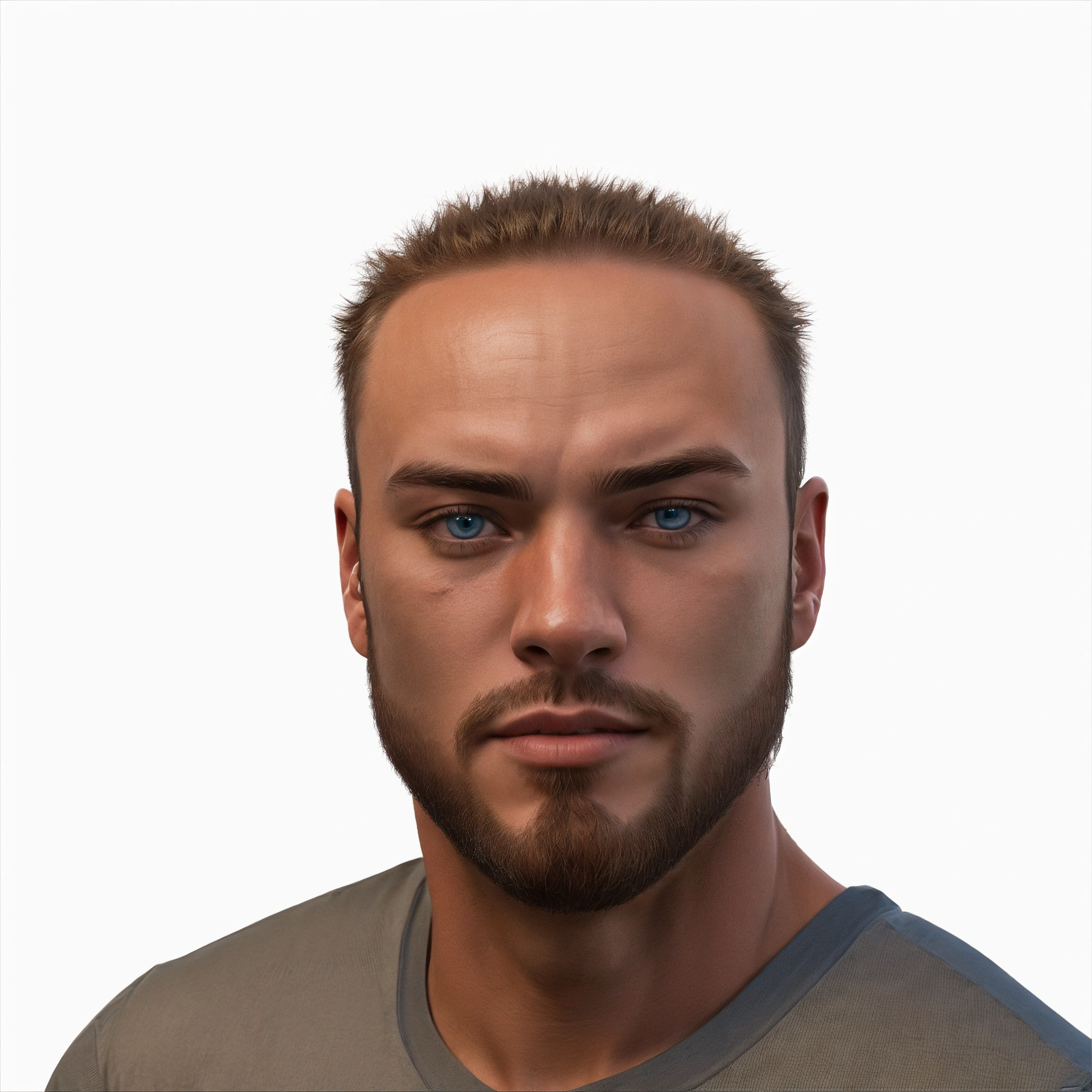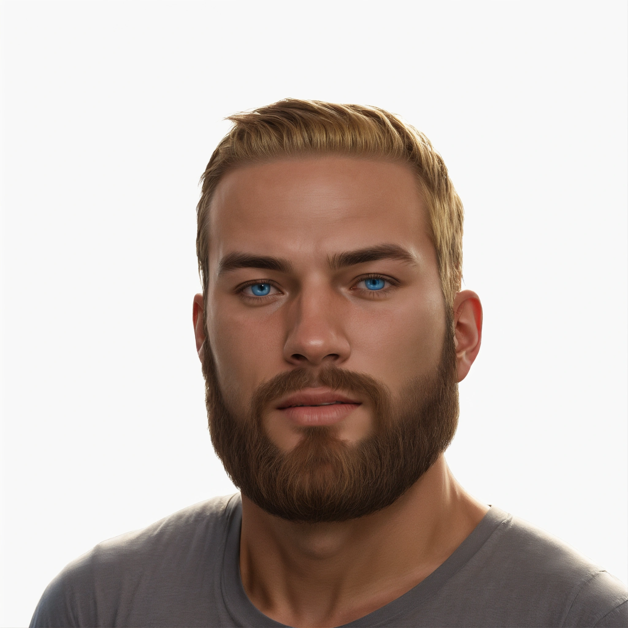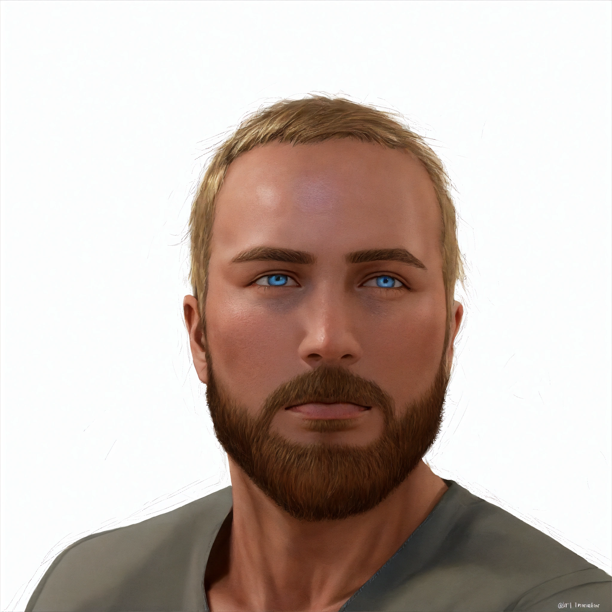 Use the uploaded photo to generate an avatar that finely tunes the subject's features while retaining his original likeness. enhance the blonde hair, giving it depth and a subtle sheen. brighten the blue of his eyes to a crisp, engaging hue, but keep their shape true to the photo. render the skin flawless, with a realistic texture that mirrors natural skin tones. the avatar's build should be athletic, dressed in a dark t-shirt that fits well to suggest a strong, yet not overly muscular physique. the final image should reflect a polished, handsome version of the man, with each enhancement amplifying his natural features without altering his recognizable identity.