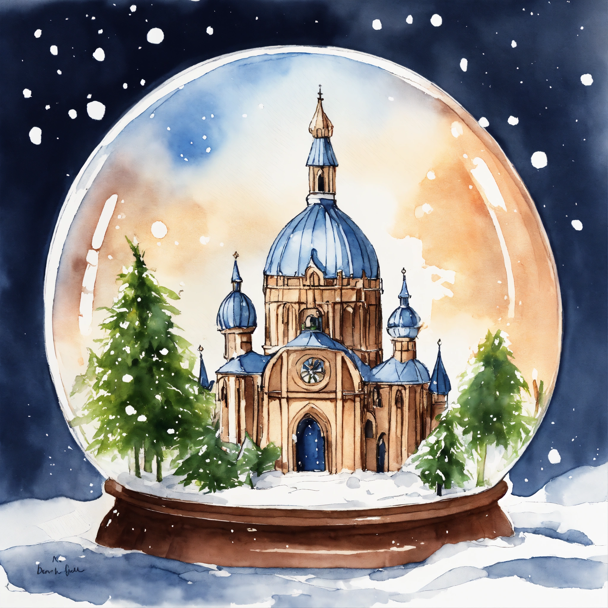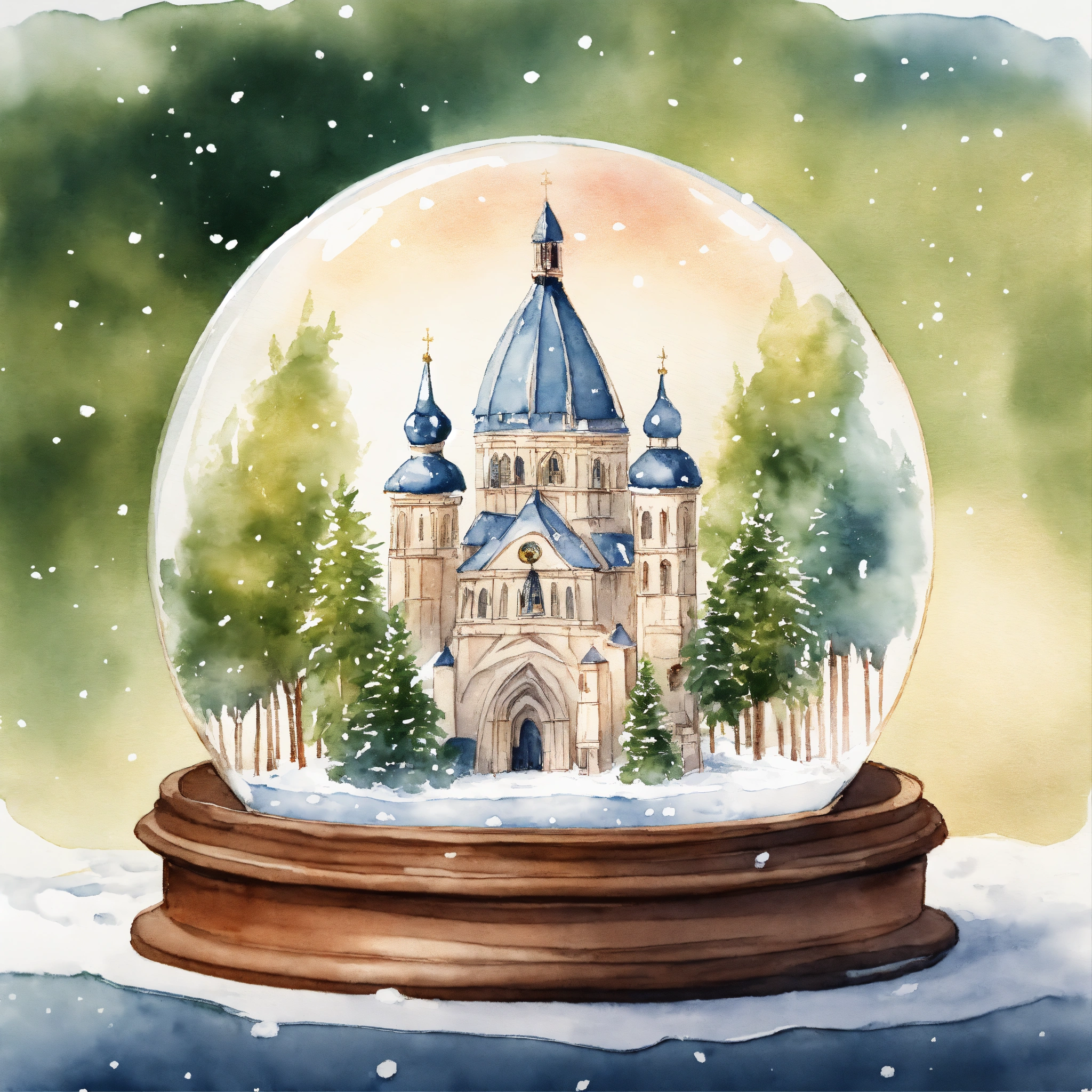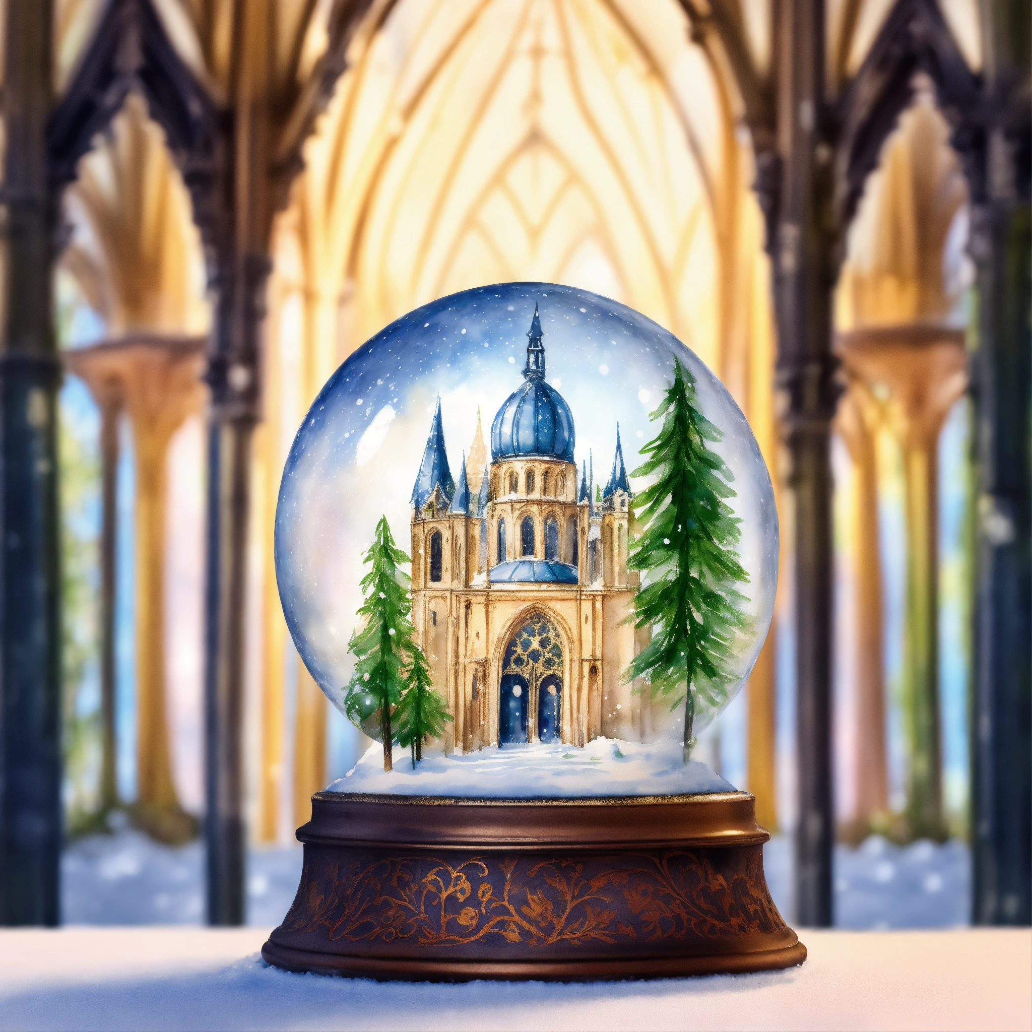 Draw a miniature spherical snowglobe, with giant bamboos inside, and a 12th century french gothic cathedral with a single bell tower on its side amid the bamboos. it's snowing in the snowglobe. light watercolor painting style, plain white background, 8k