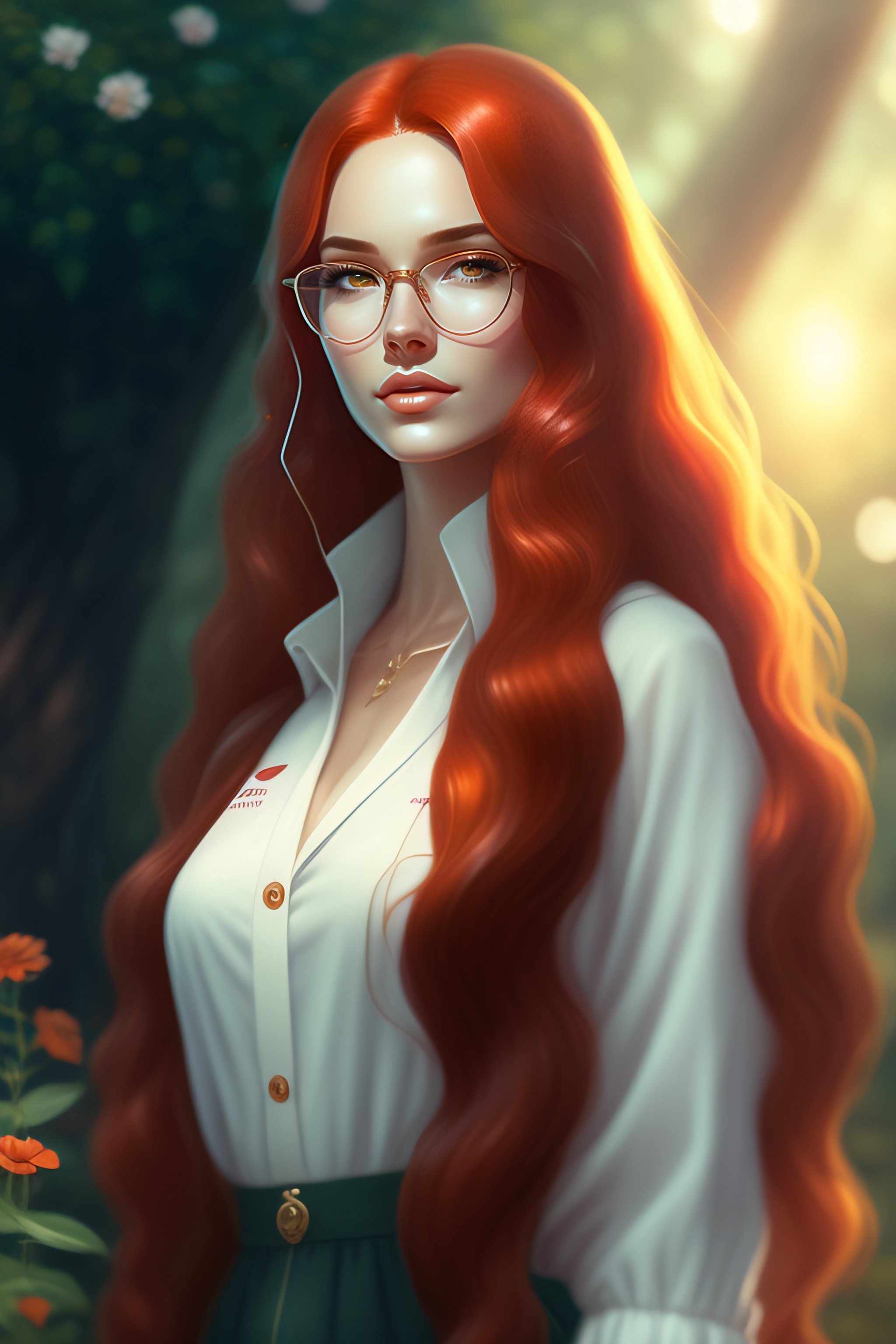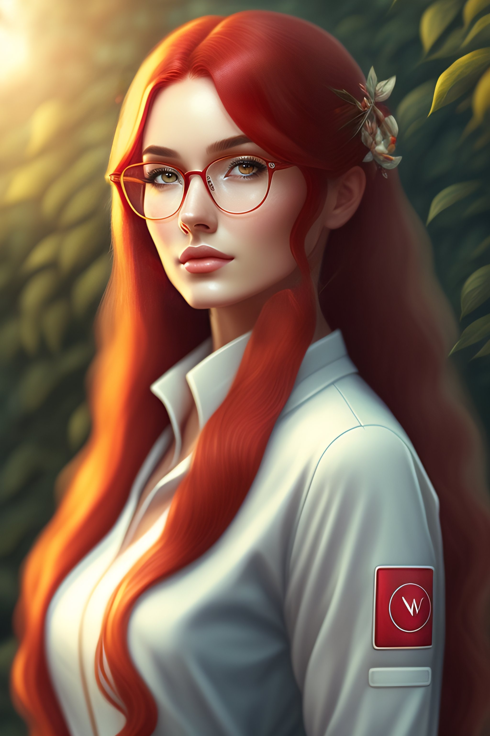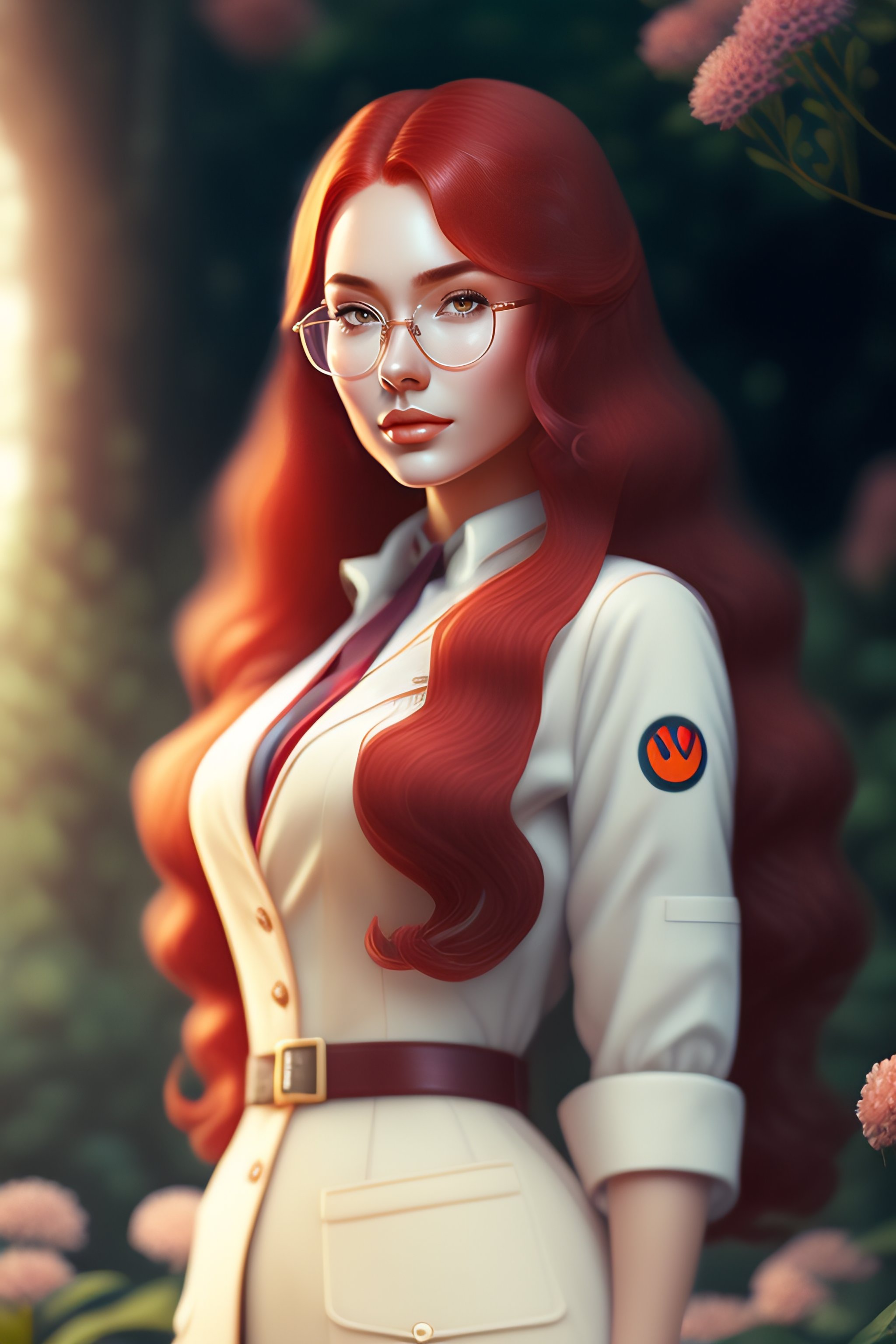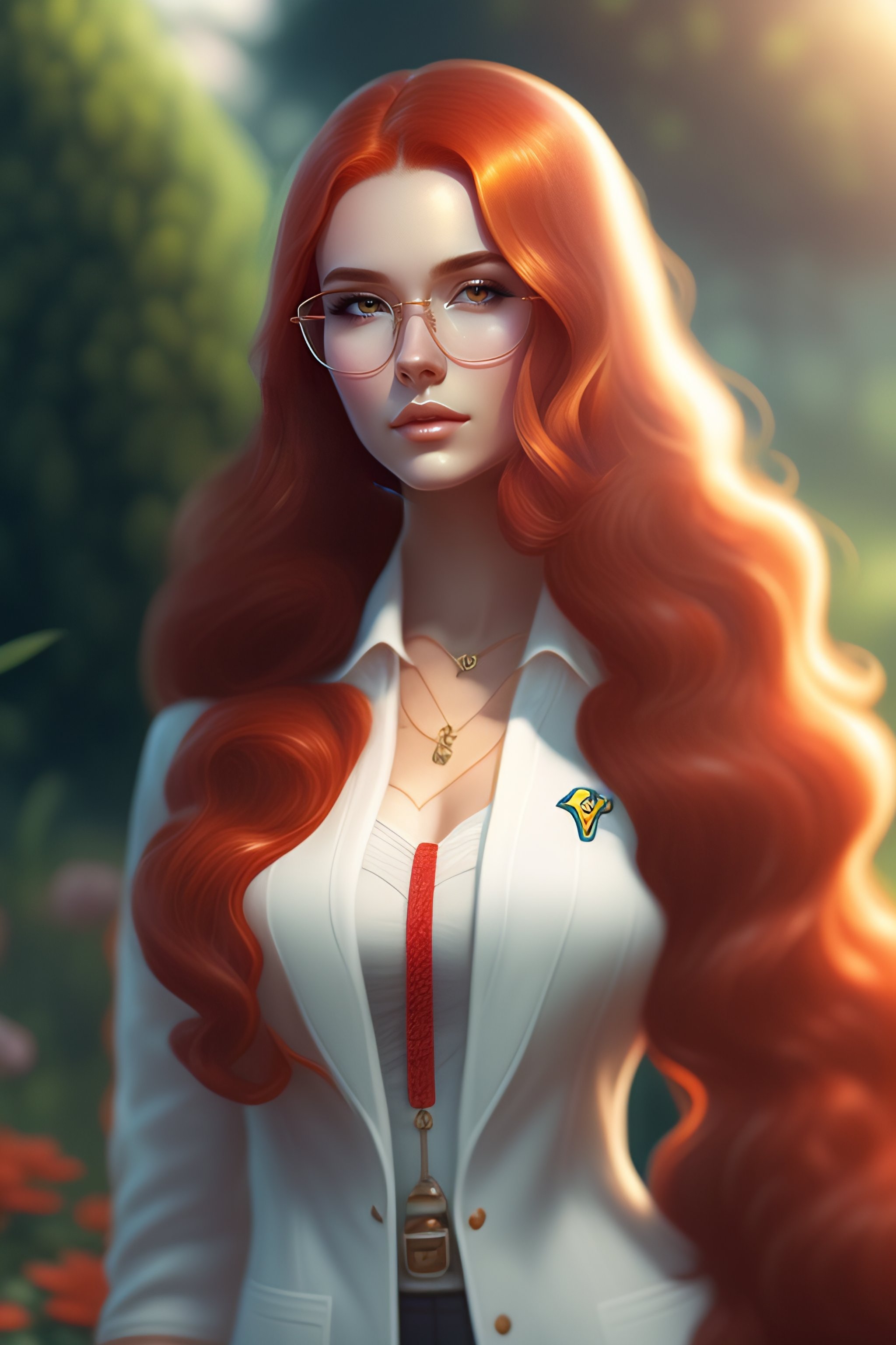 Beautiful real girl with long red hair, wearing lab coat and glasses, pokemon misty, standing inside a garden, character portrait, 1 9 6 0 s, long hair, intricate, elegant, highly detailed, artstation, smooth, sharp focus, illustration, art by wlop, charlie bowater and alexandra fomina
