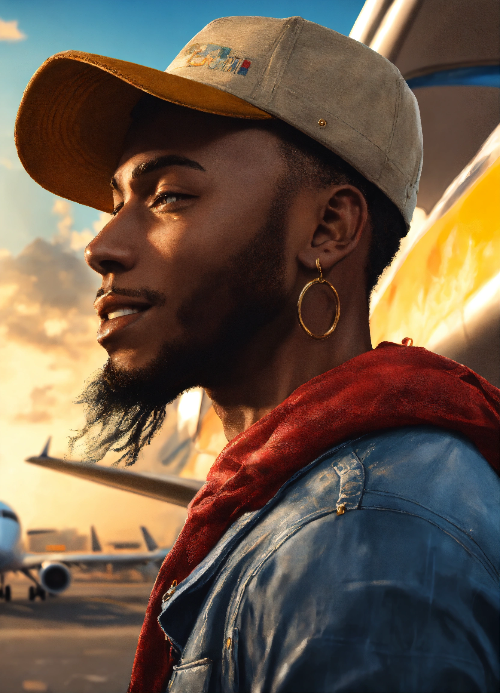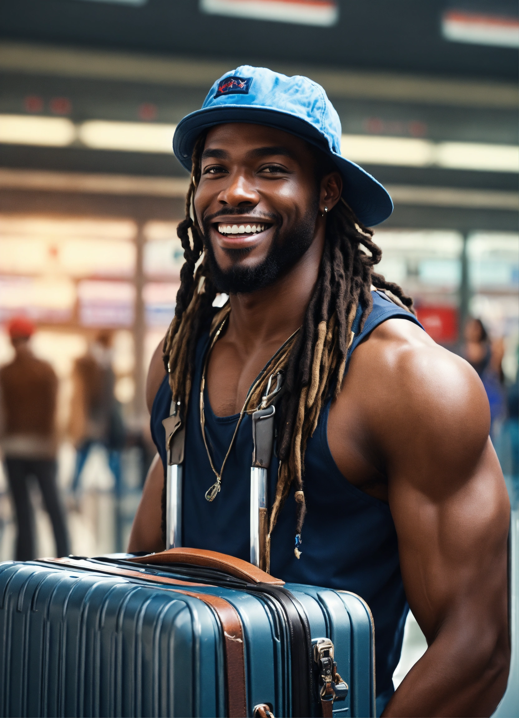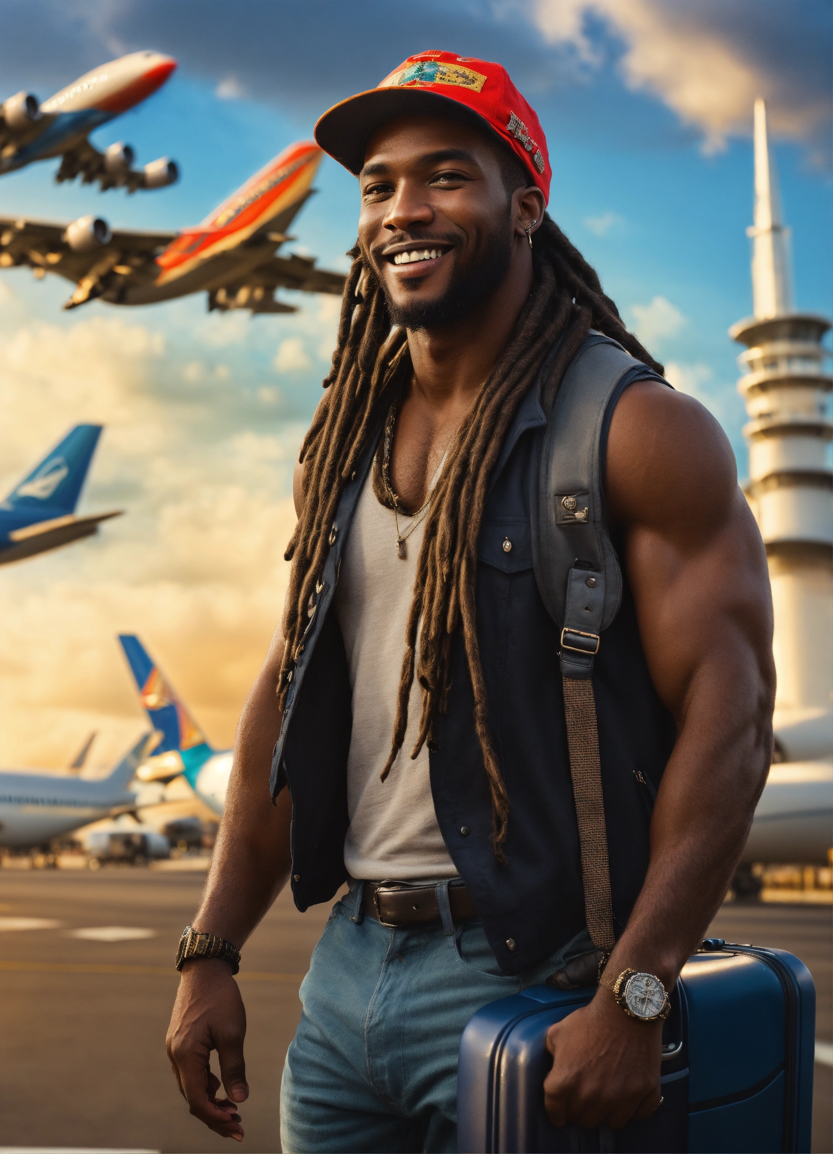 Handsome black caribbean man at the airport with his luggage, wearing a cap, dreadlocks, muscles, big lips, smiling, art painting, very detailed, 8k resolution, highly detailed, cinematic productions