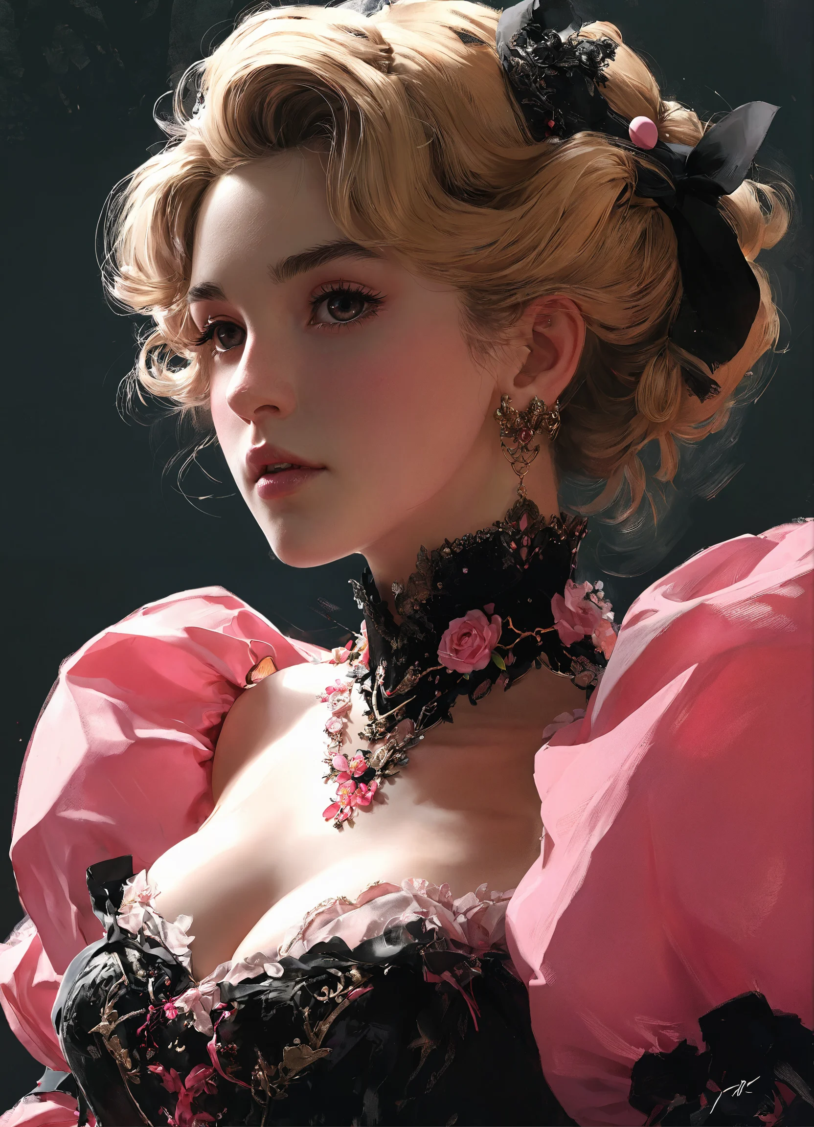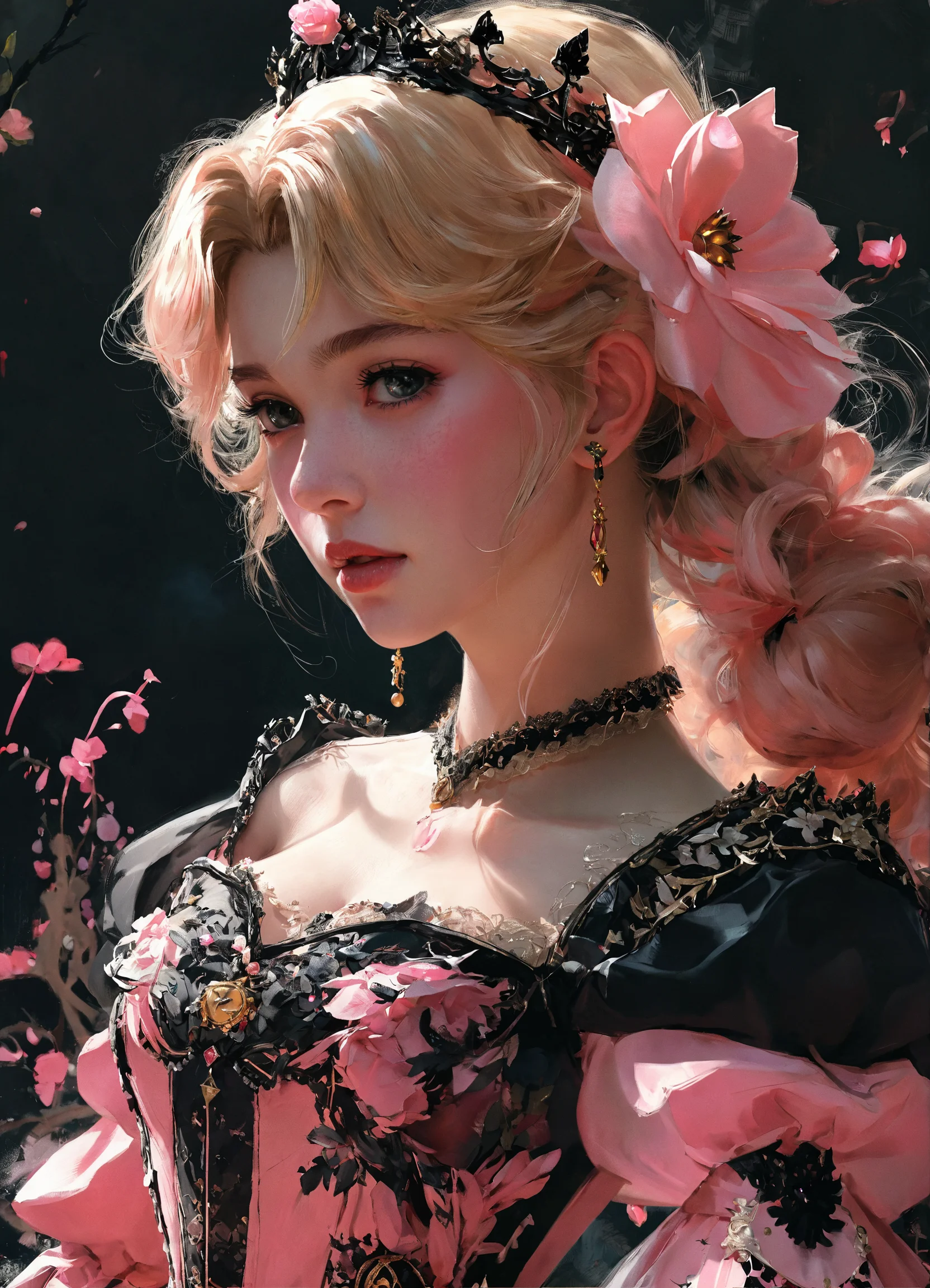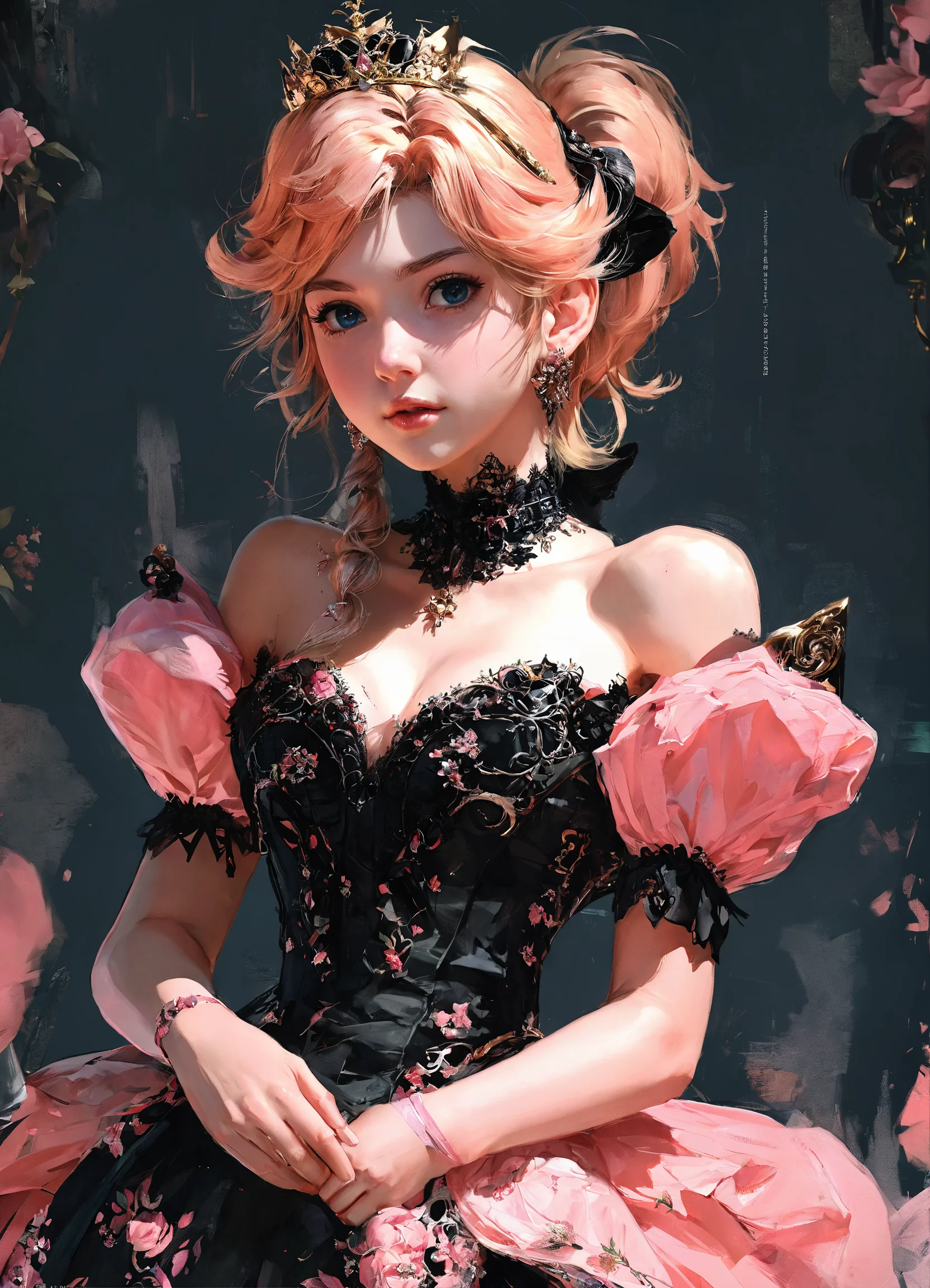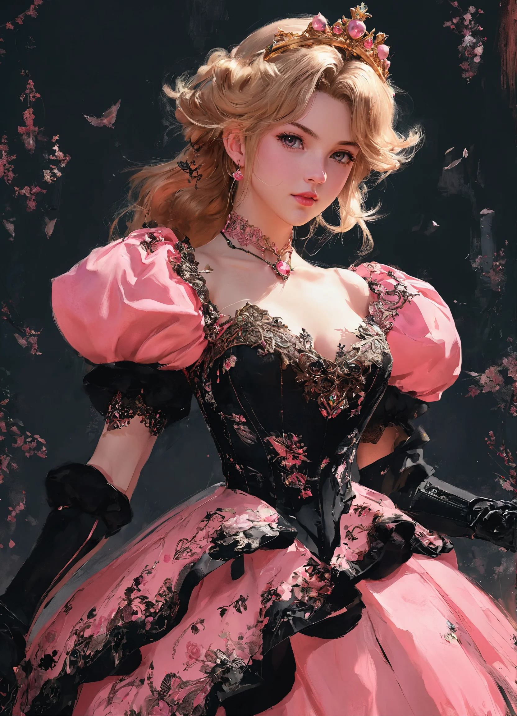 Anime artwork of princess peach in a detailed intricate pink and black dress