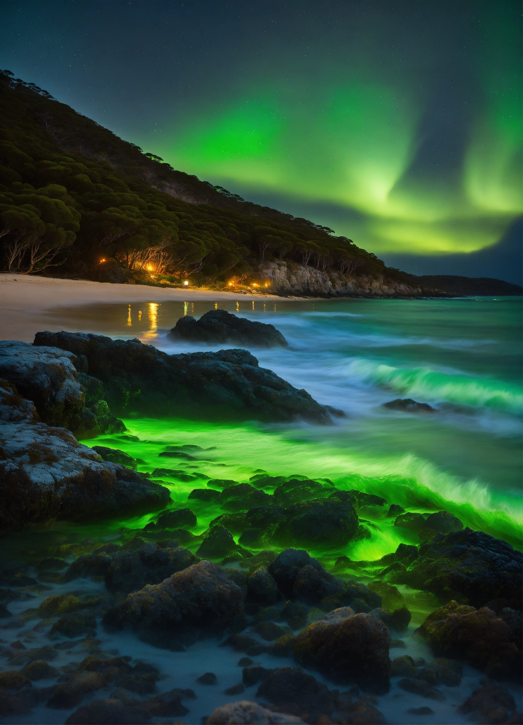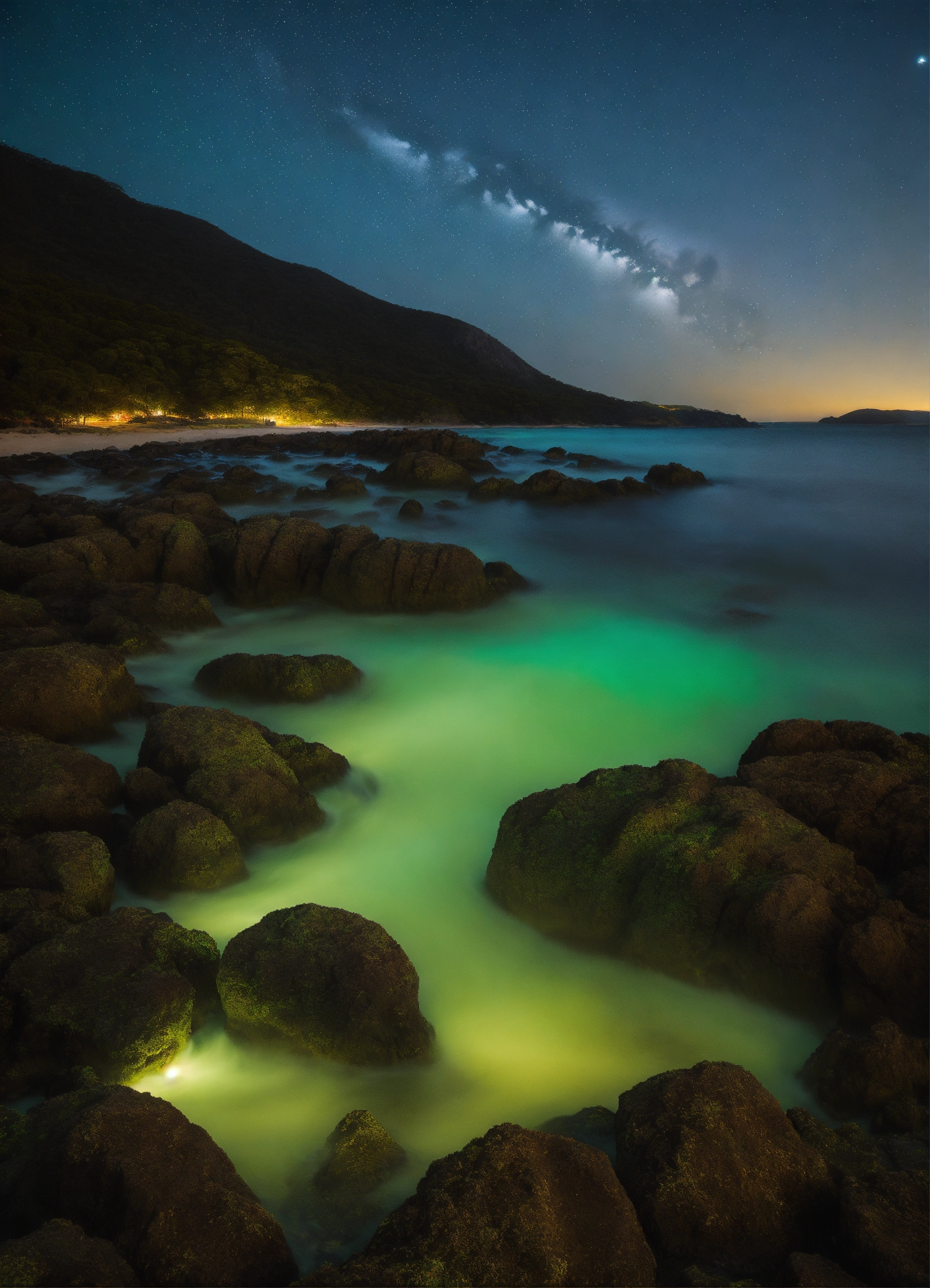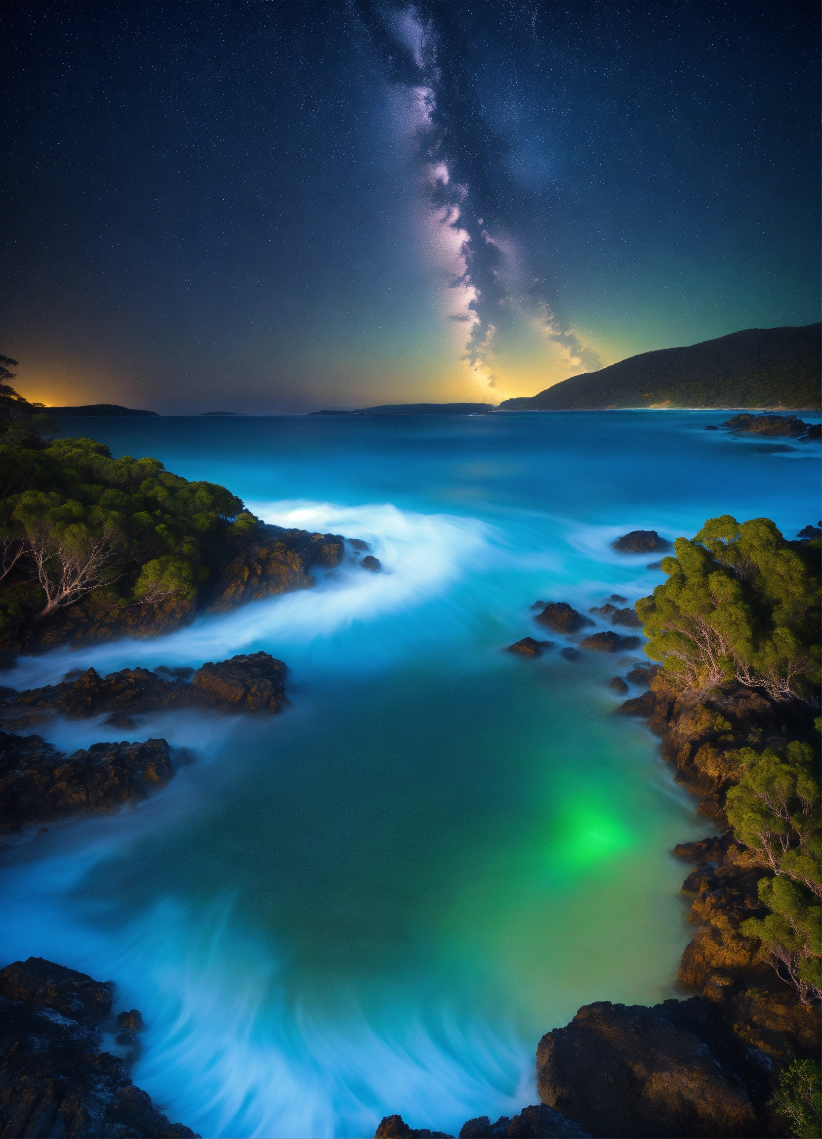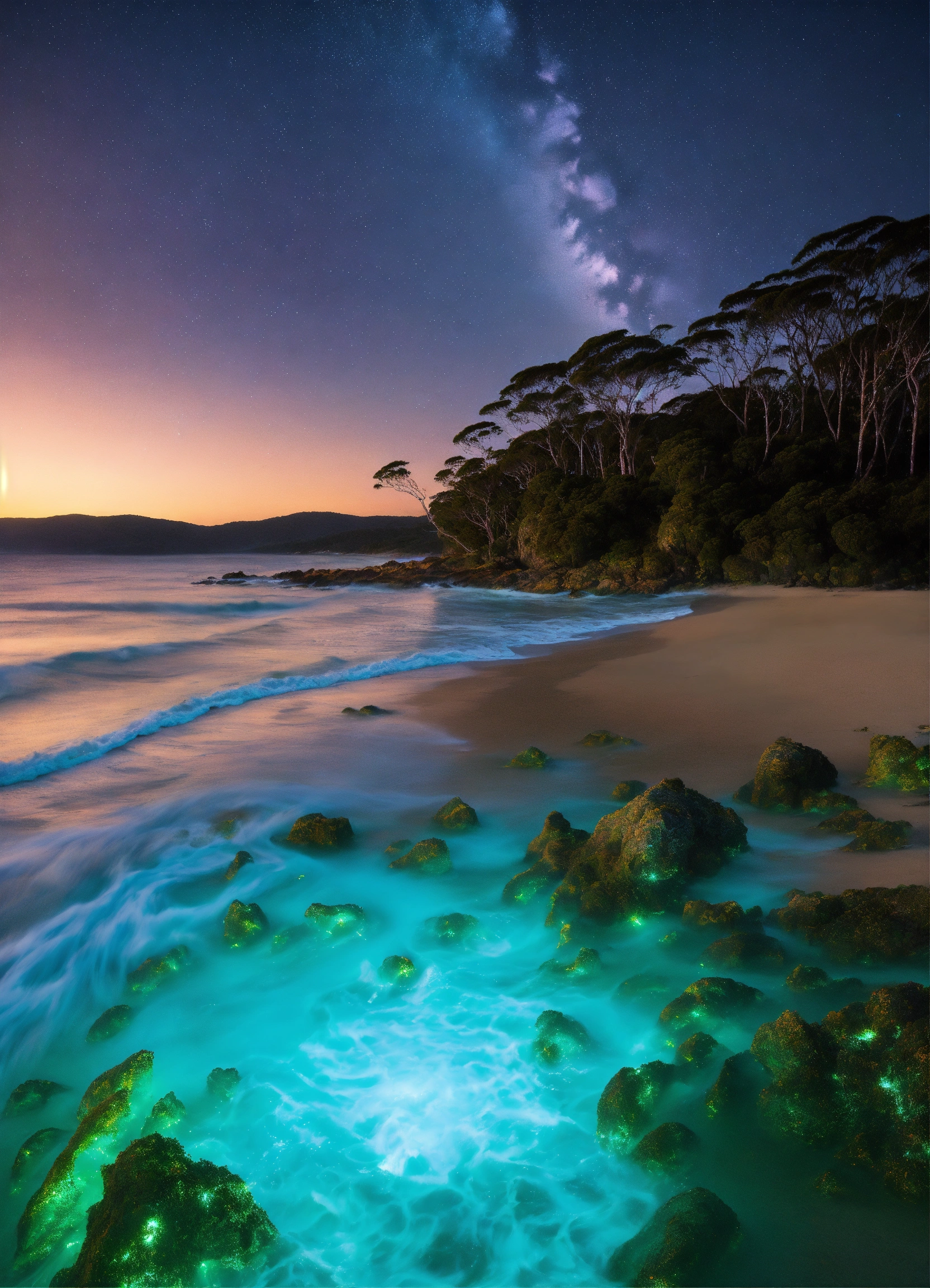 The beauty of coles bay, australia at night with its long, expansive coastline, sandy beaches, consecutive waves crashing onto the shore, the sea water exhibiting a phenomenon of luminescent blue, similar to millions of fireflies underwater, and the wave crests shining in a deeper shade of green.in the style of surrealism and greg rutkowski.