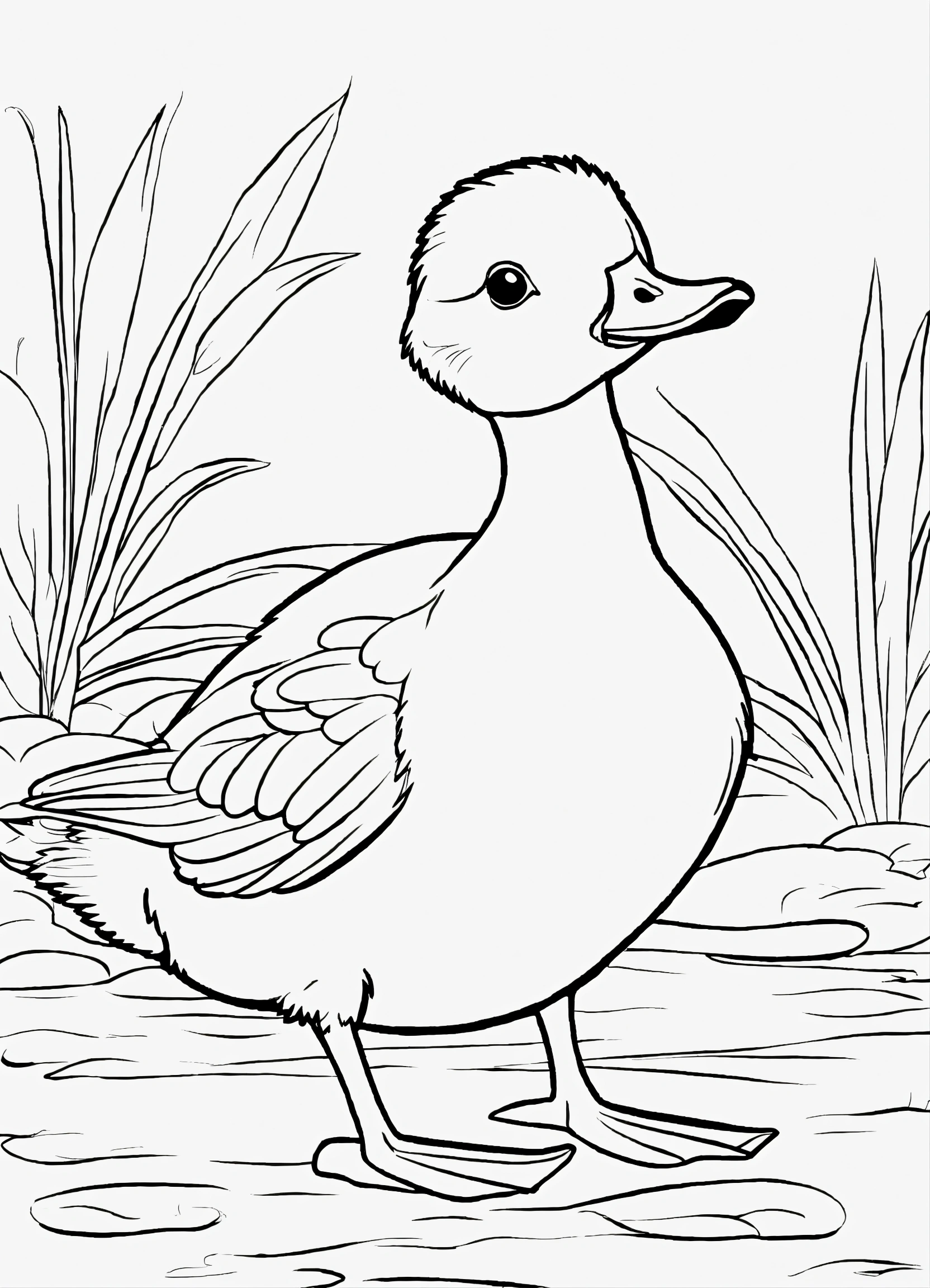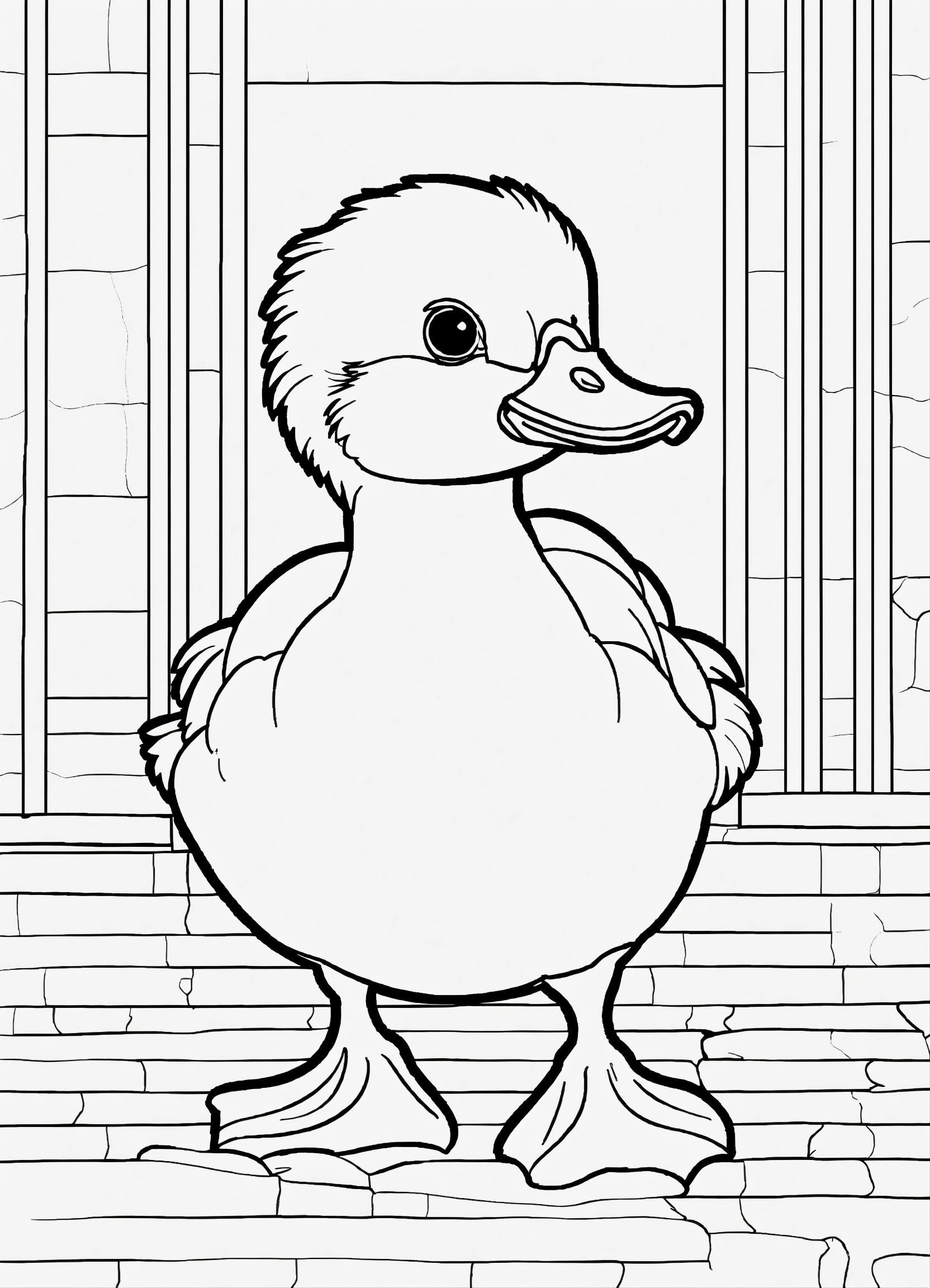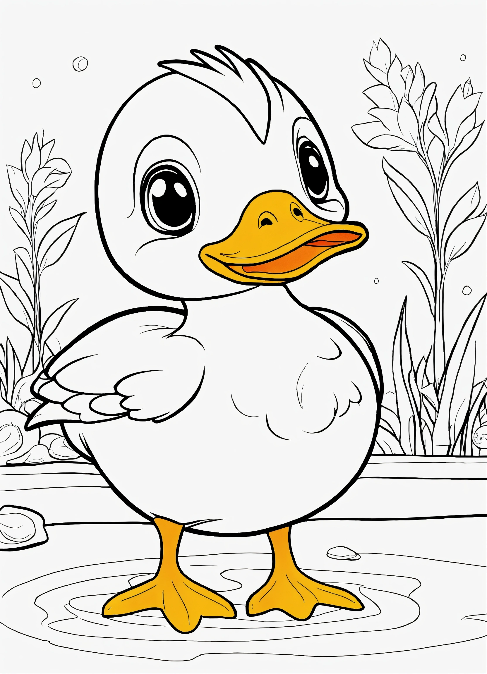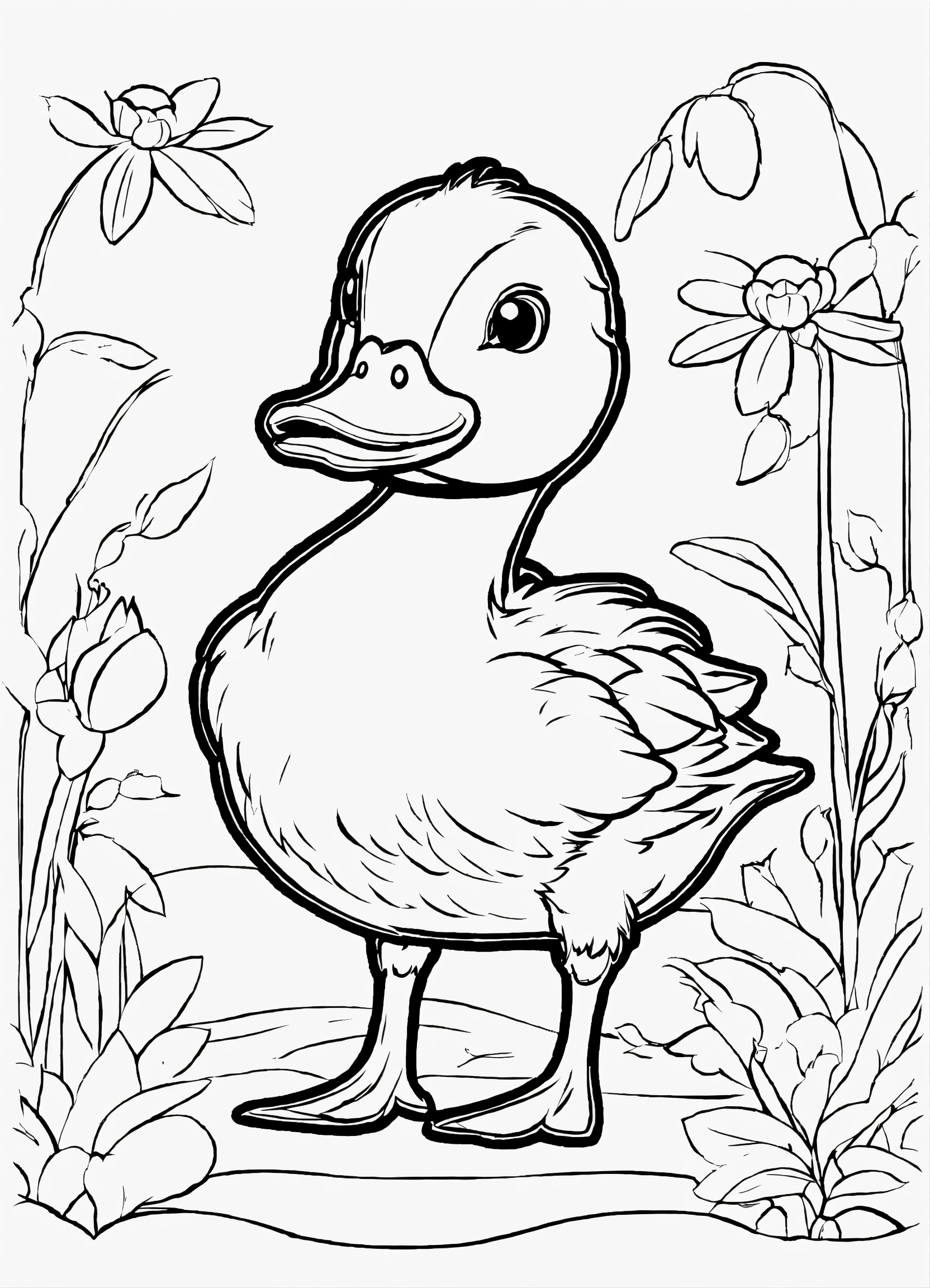 Coloring book for toddlers, simple lines drawings, no lines inside of the drawing, baby duck, cartoon, full body, outline of the drawing in bold line, symmetrical, white background., no background image, without any background image, completely white background.