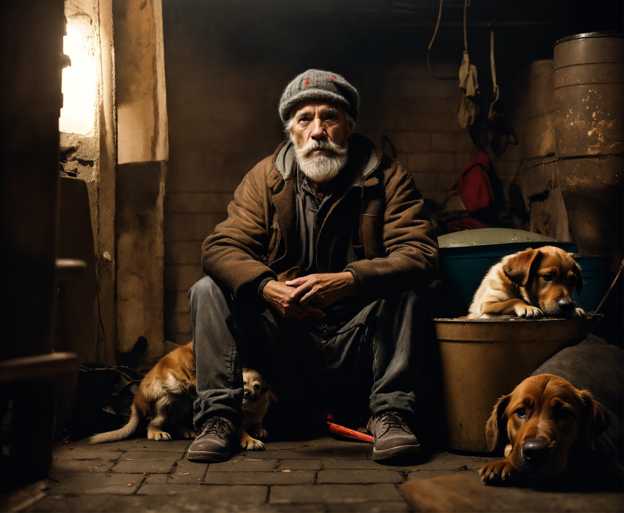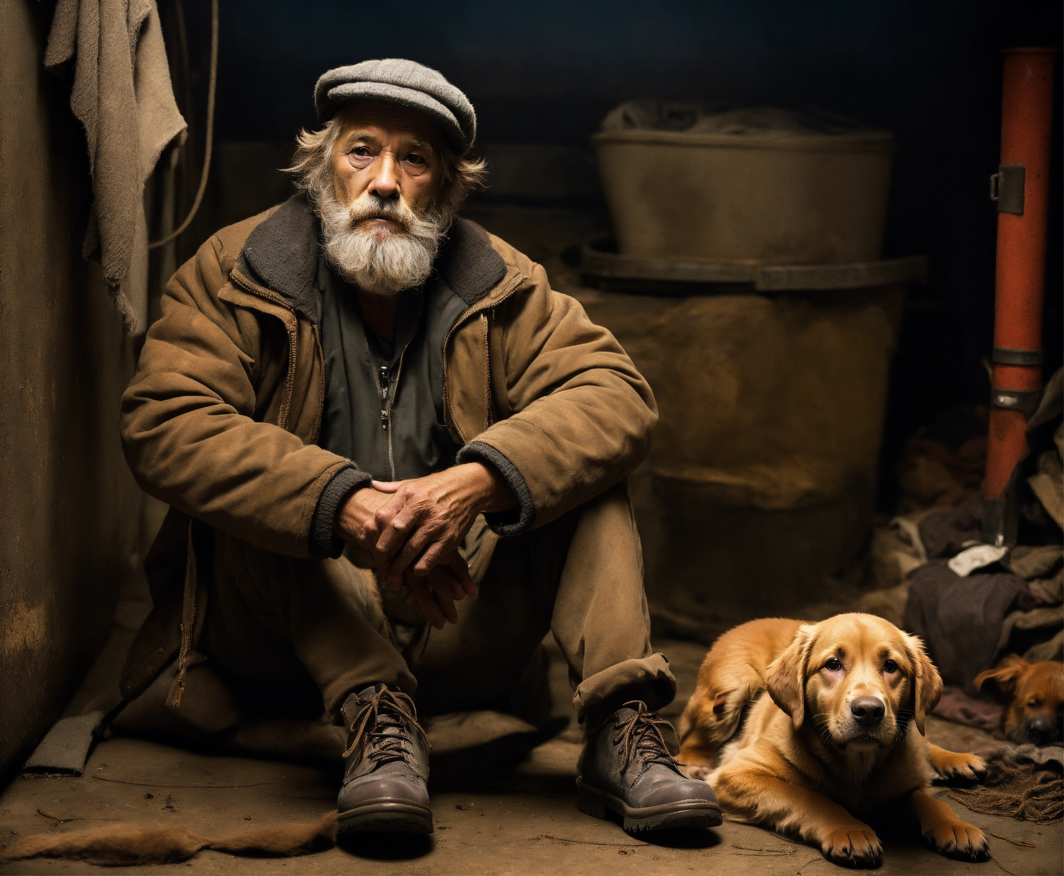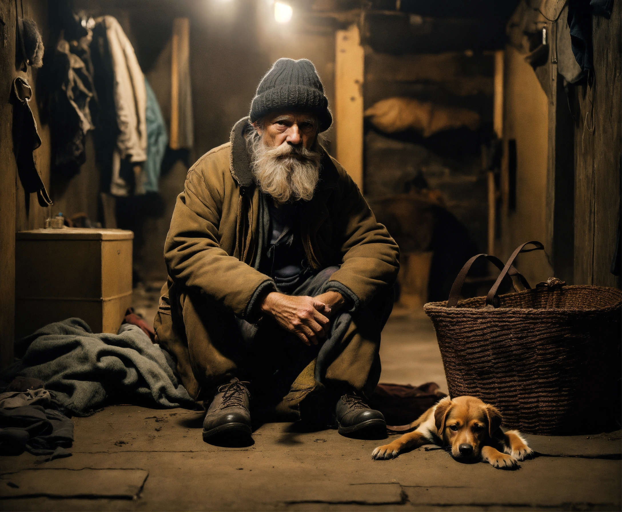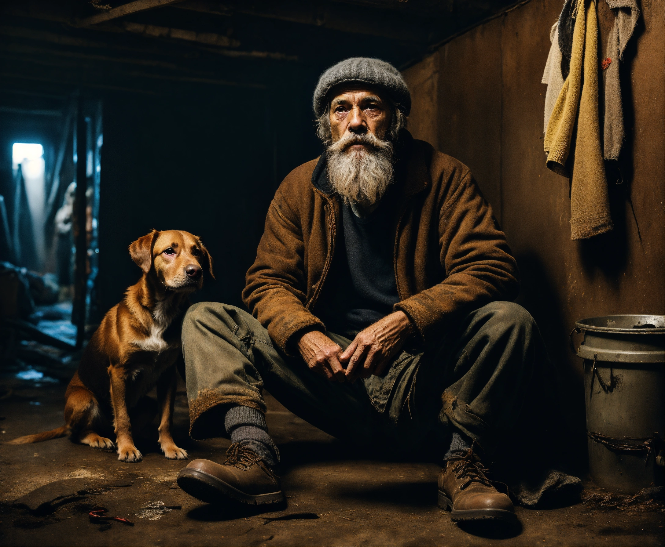 An utrarealistic dark picture of an old homless with a dirty gray beard, tattered clothing, wearing a woolen hat, sitting in the floor of a dingy basement. next to him, a little brown labrador puppy sitting.