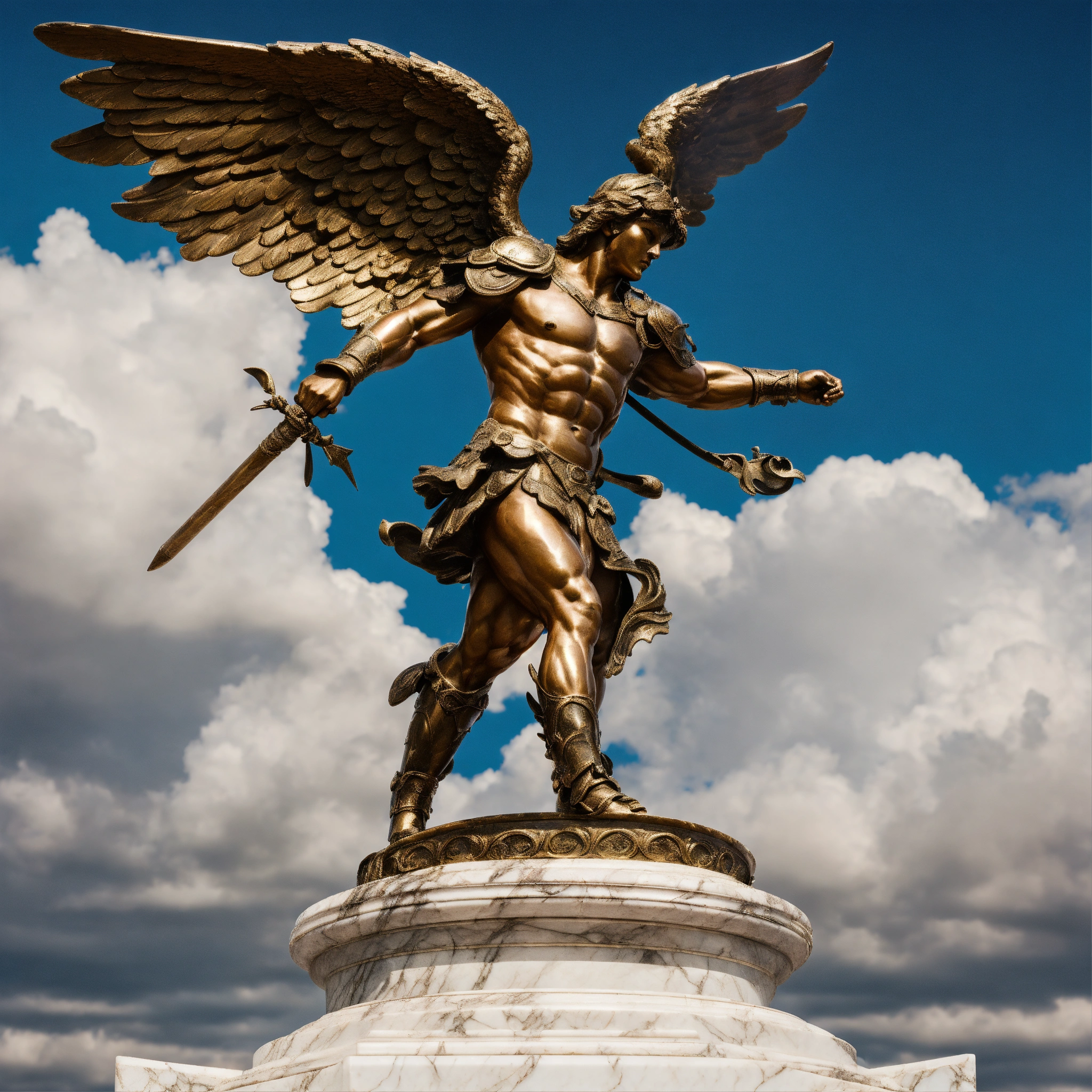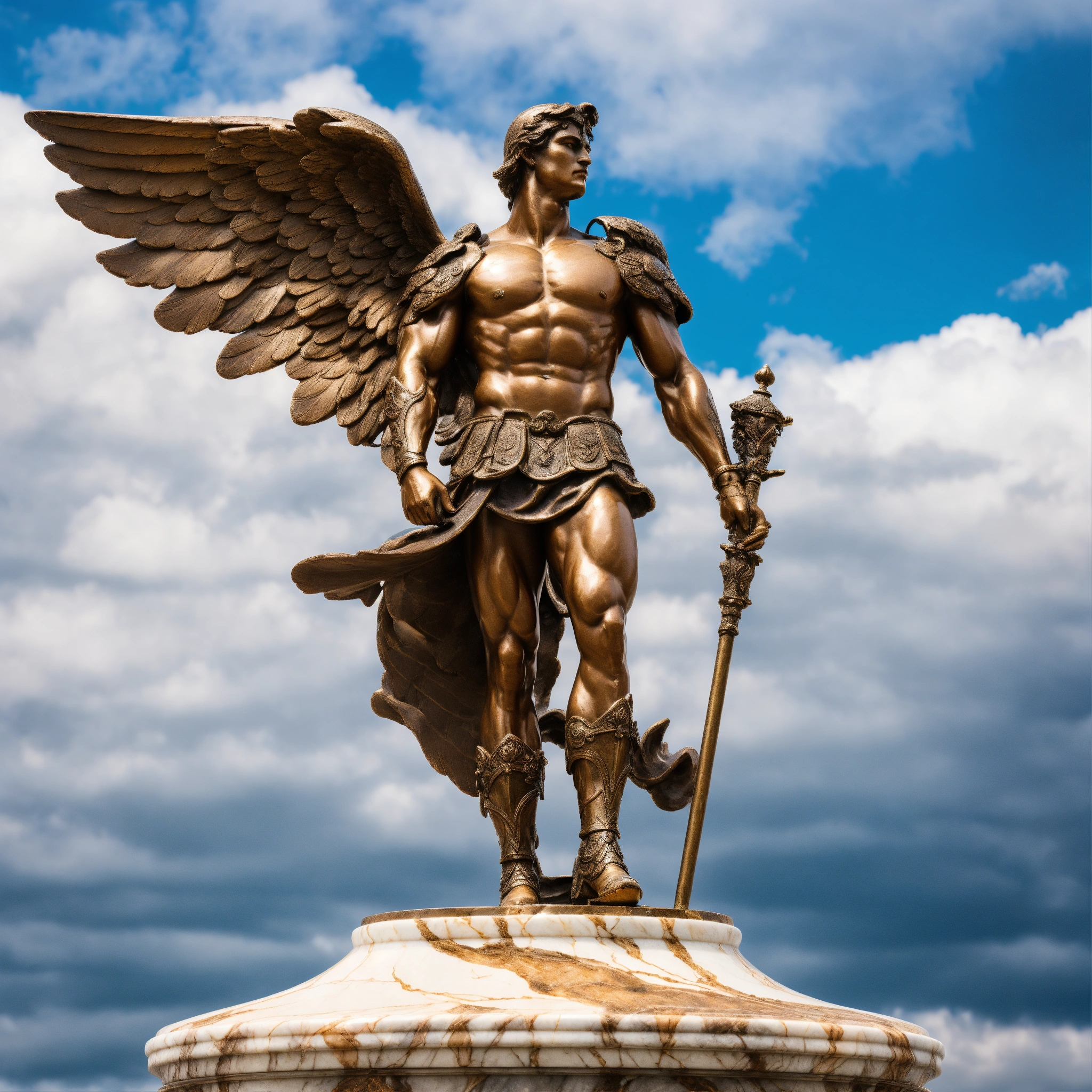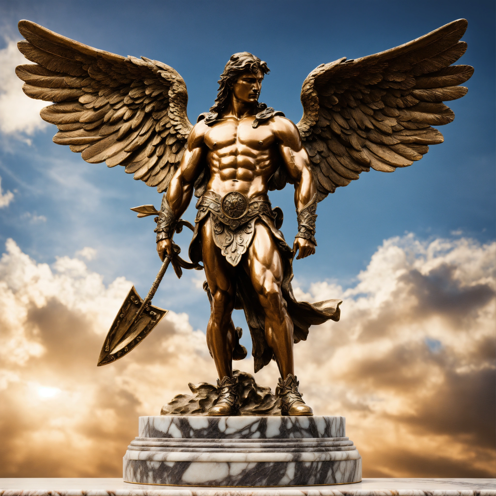 Aged bronze sculpture full body of a muscular warrior celestial angel with armor on top of a marble base ultra realistic ultra definition 32k photography style, sky background with clouds