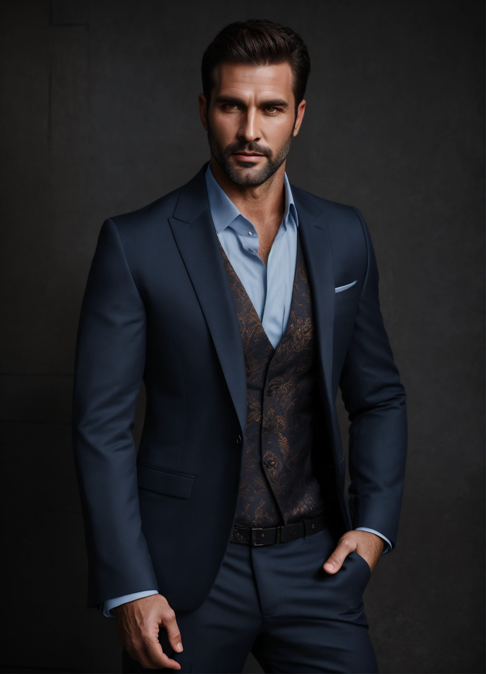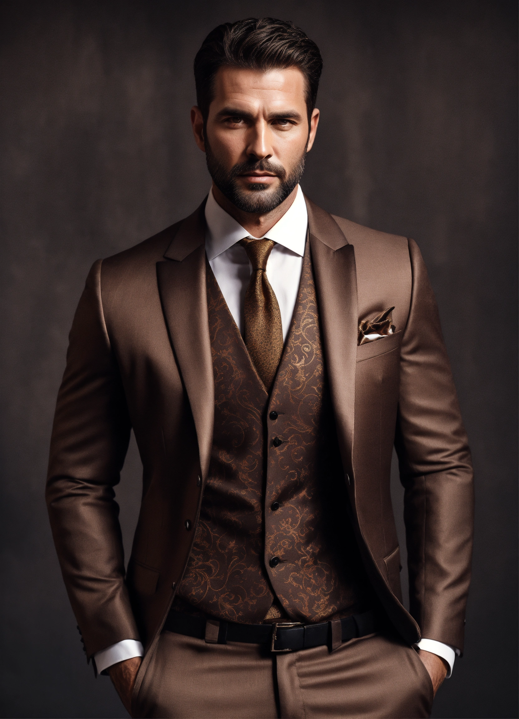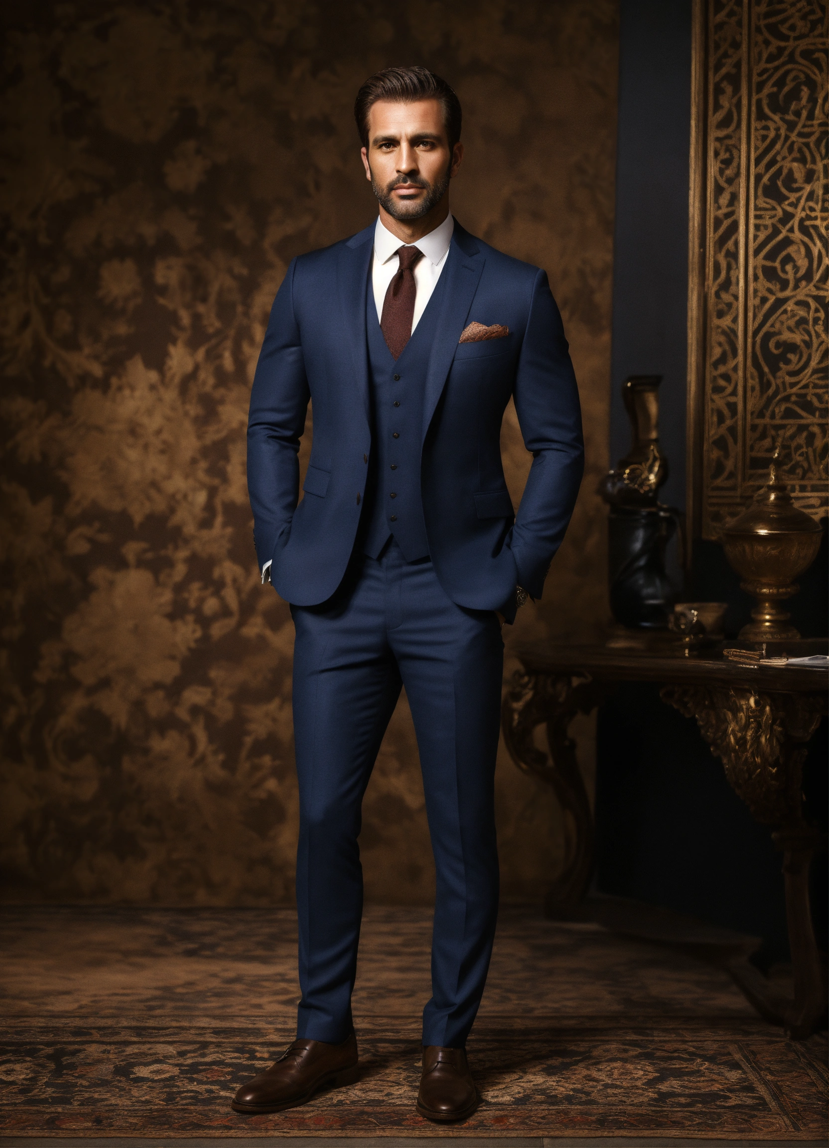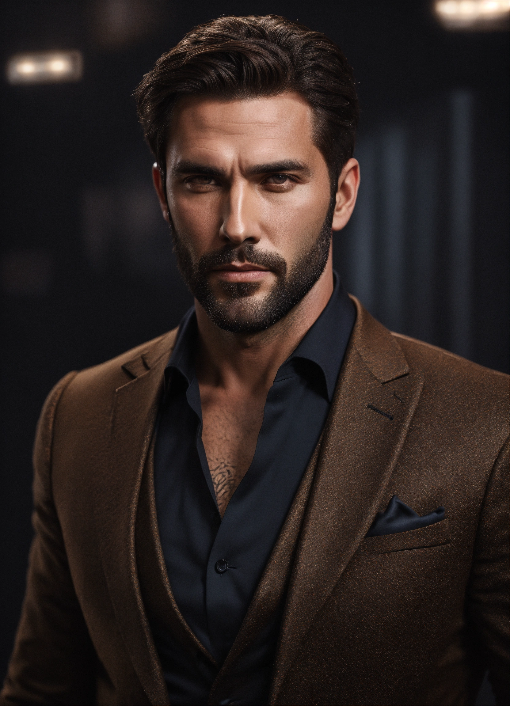Ultra-realistic handsome brutal 38-year-old man with brown hair, model with light eyes, arabic european origin, fashionable black formal high fashion suit, full length, dark background, photorealistic.