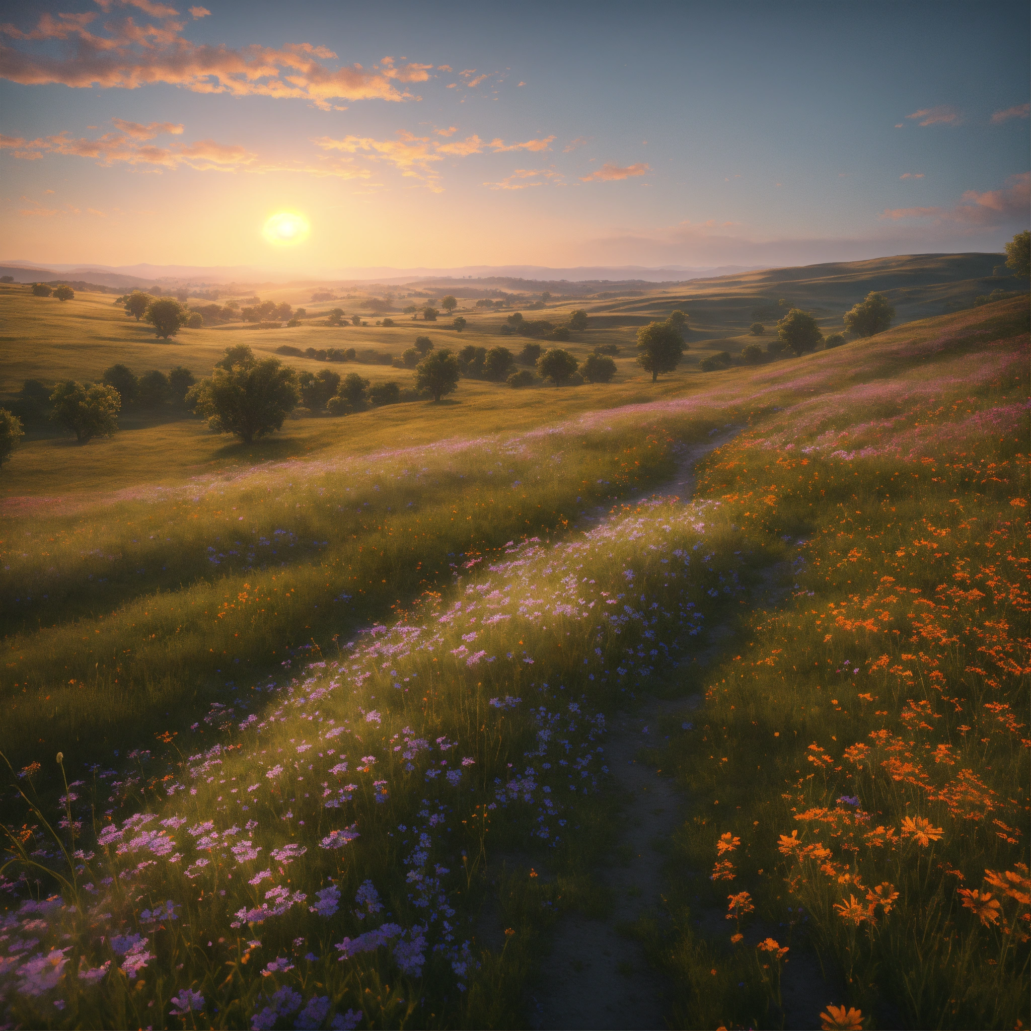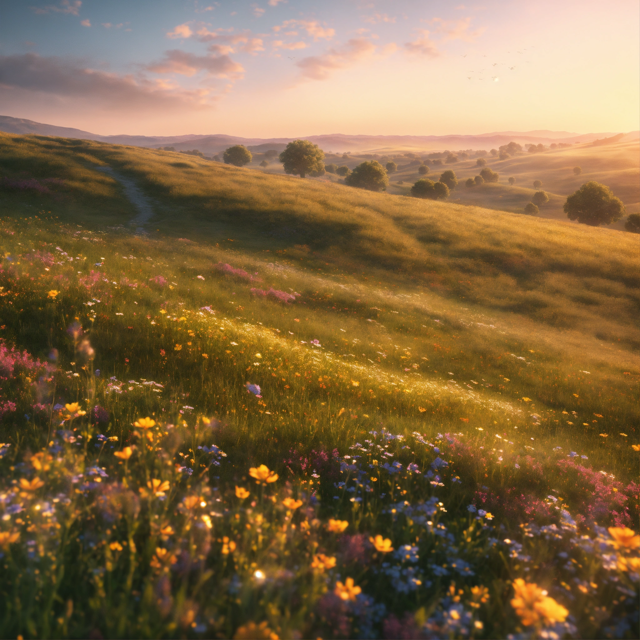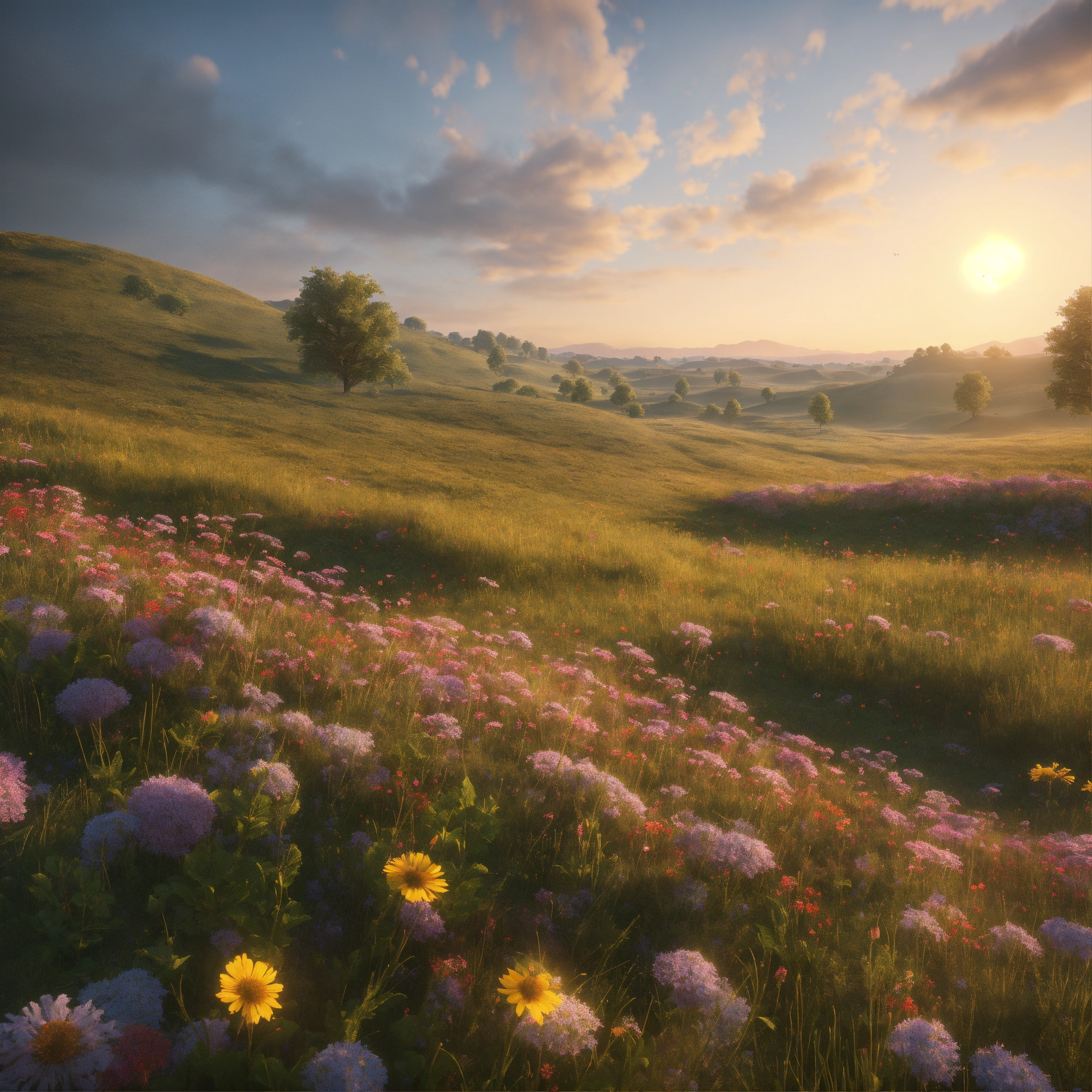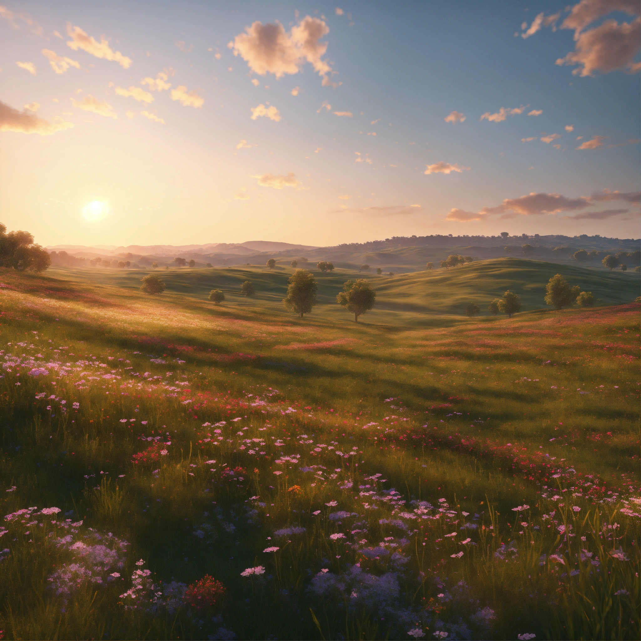 Vast open field, rolling hills, wild flowers, cinematic style, high detail, hr, realistic physics, photorealistic, early morning, bright clear sky, unreal engine, hdr, 8k