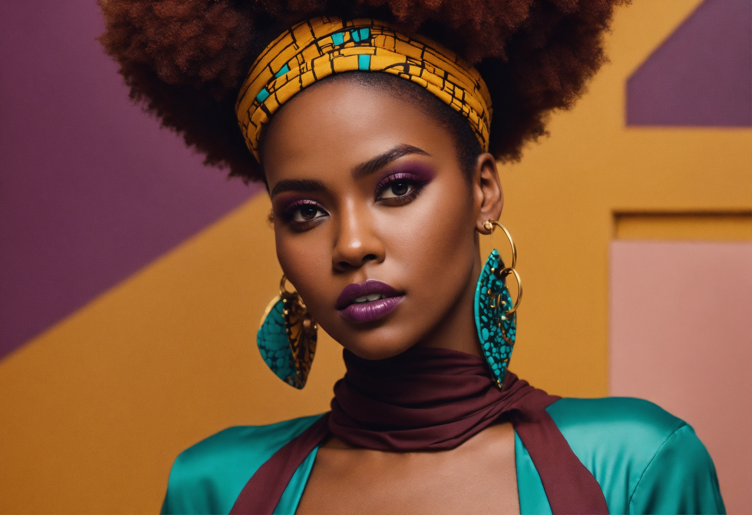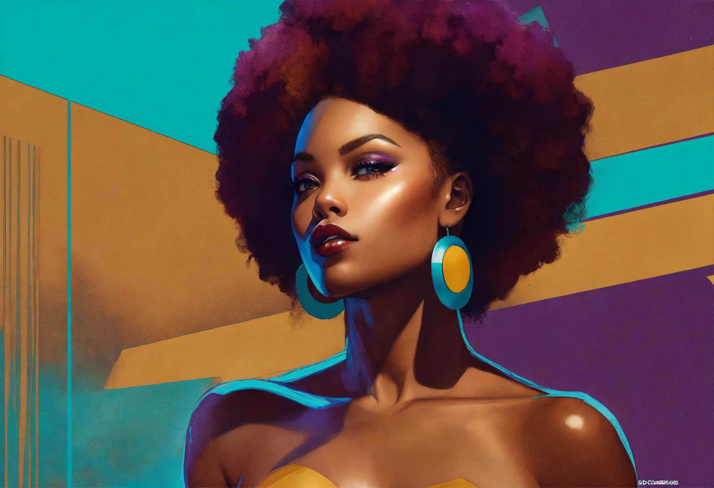 Art ‘yes you can breakout and something new’, a beautifully majestic afrocentric woman, color palette; turquoise rich mahogany burnt umber mustard shades of violet, rule of thirds, dc comics aesthetic styling