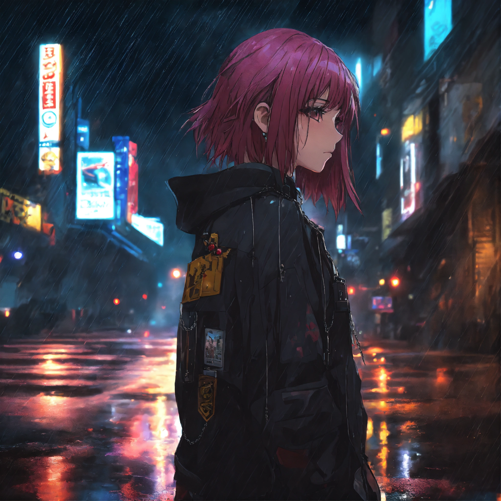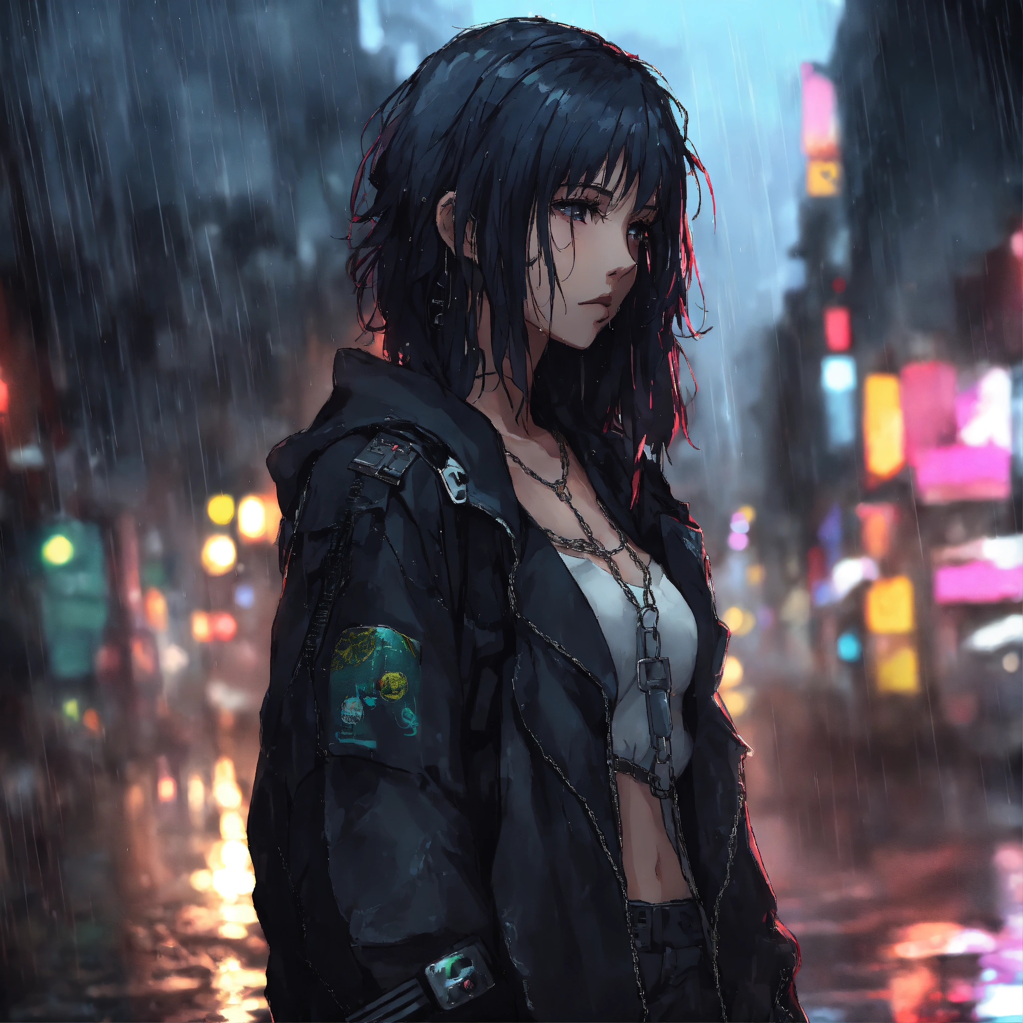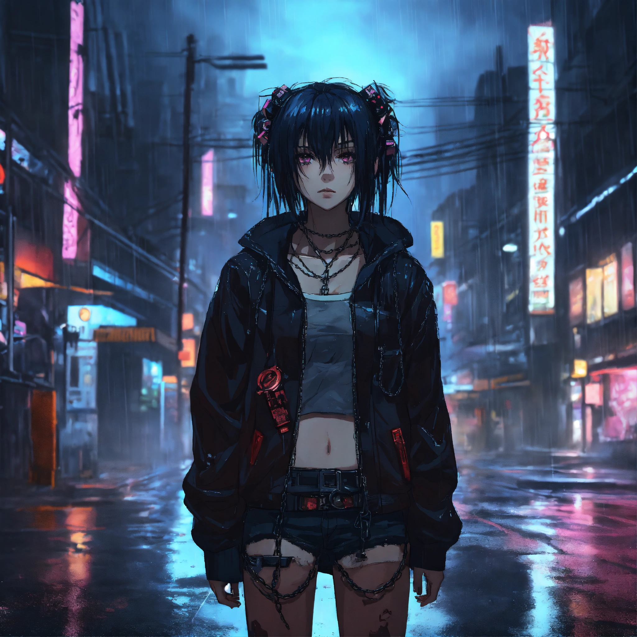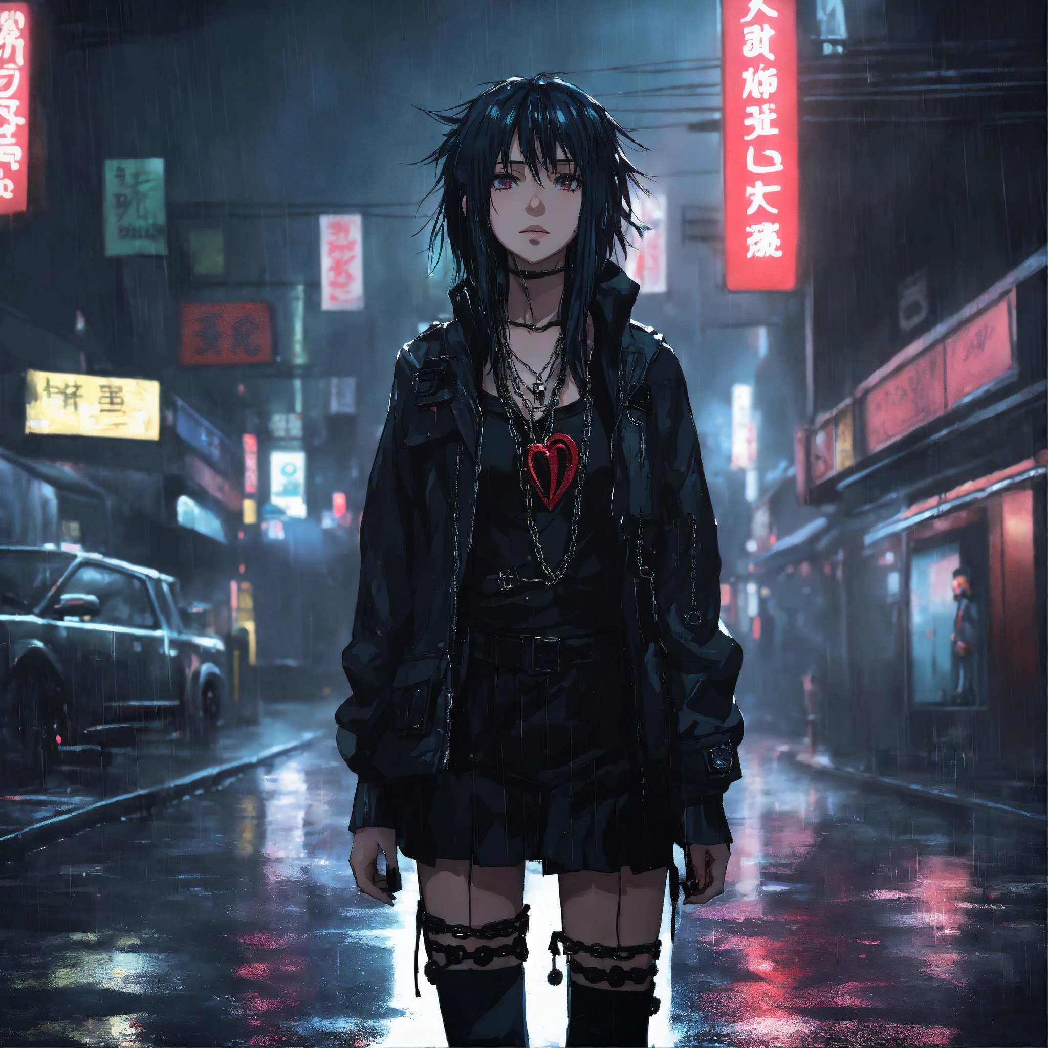 Cyberpunk city heart broken gothic girl with hair standing in the middle of the street while it is a rainy dark night anime style studio ghibli, looking away from the camera emo girl wearing chains