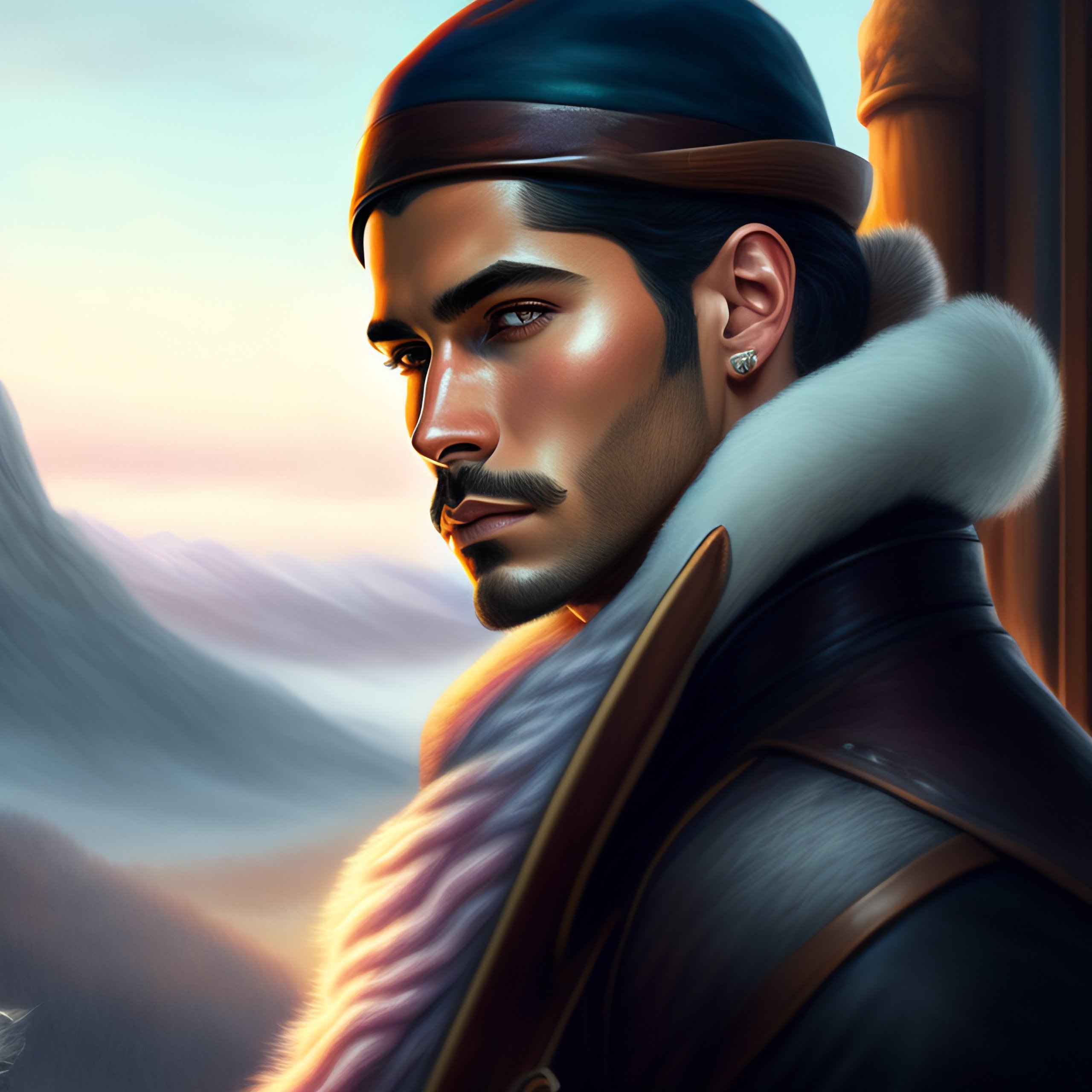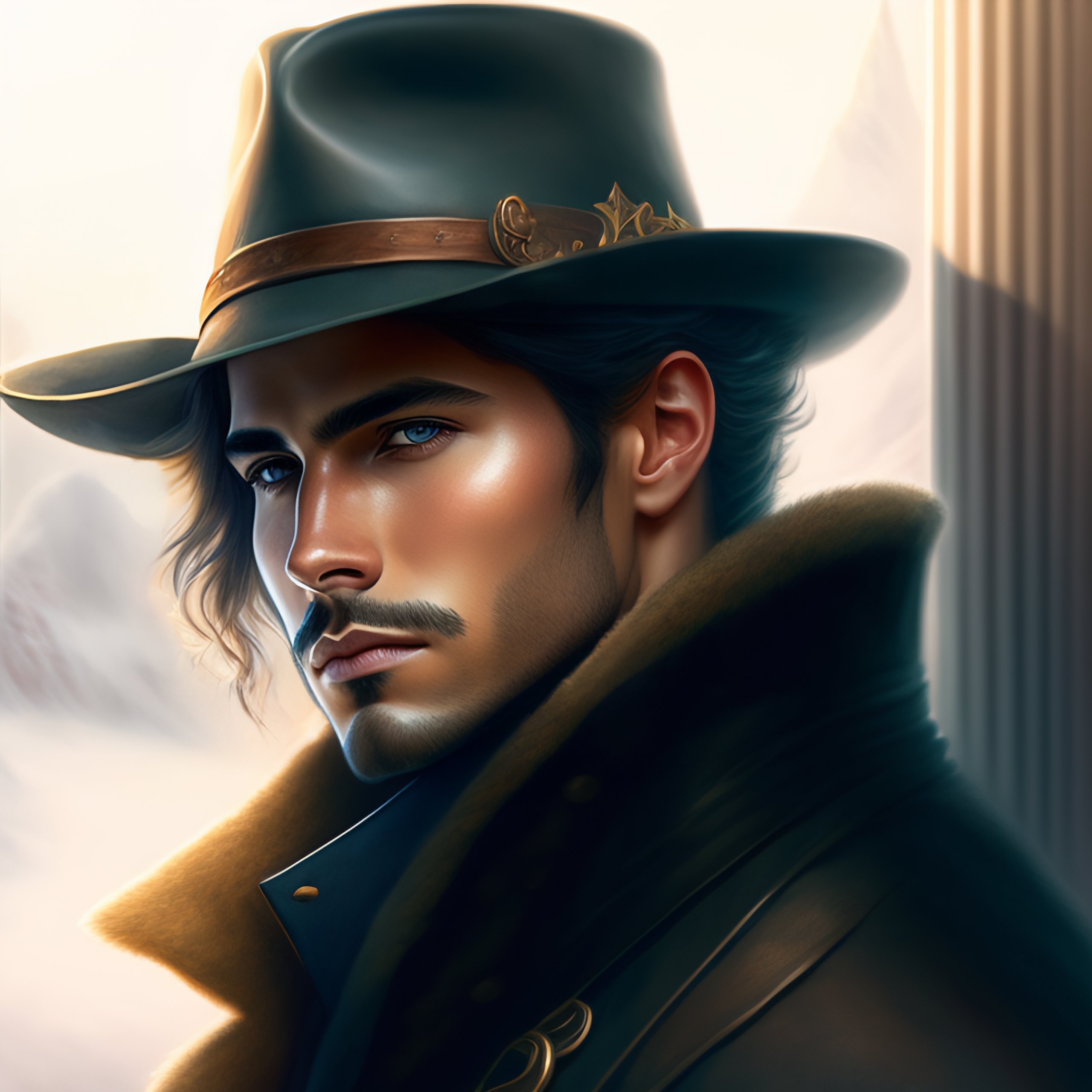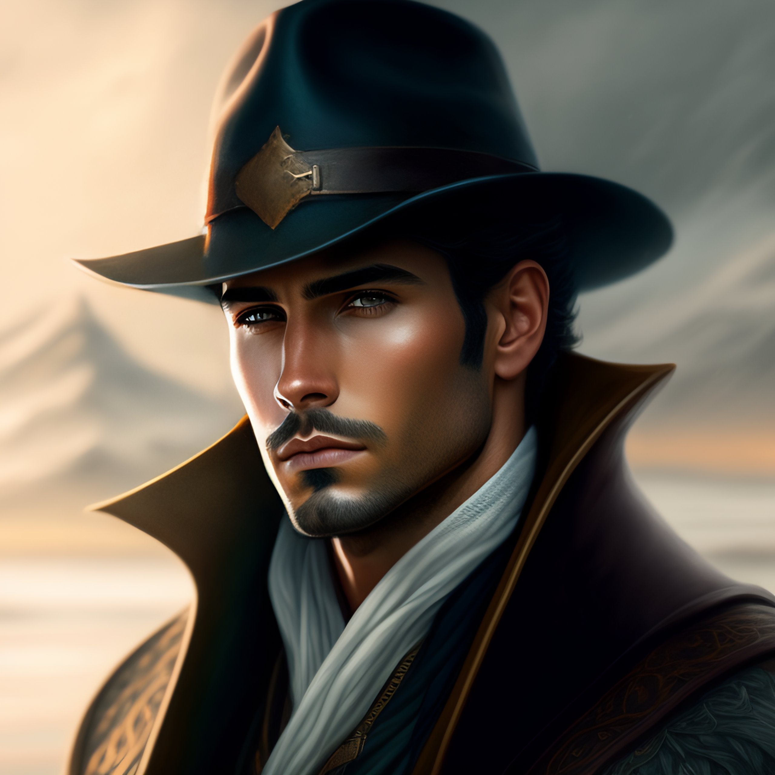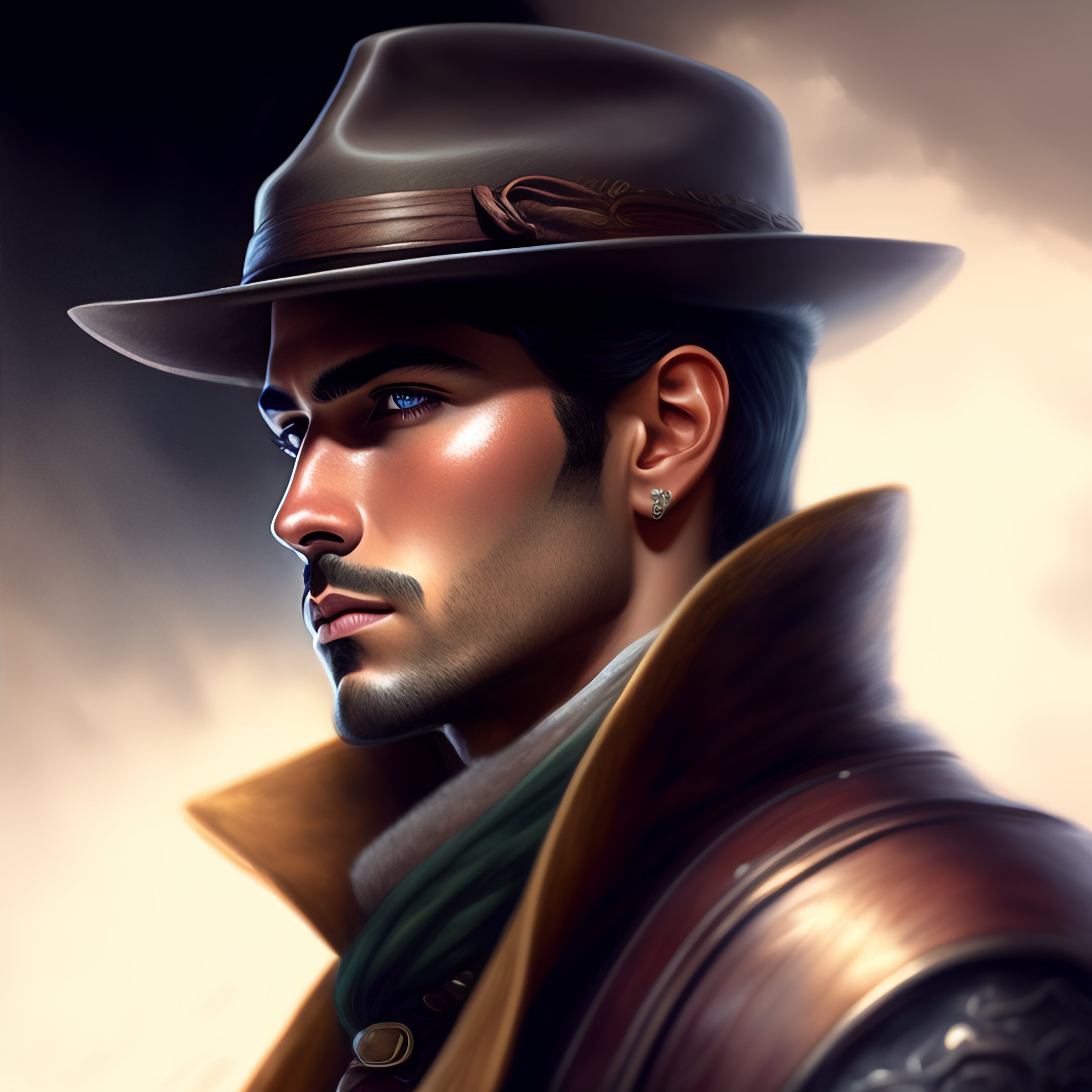 Detailed illustration, pastel sketch, male adventurer, hispanic, fantasy, long coat, hat, focus intense eyes