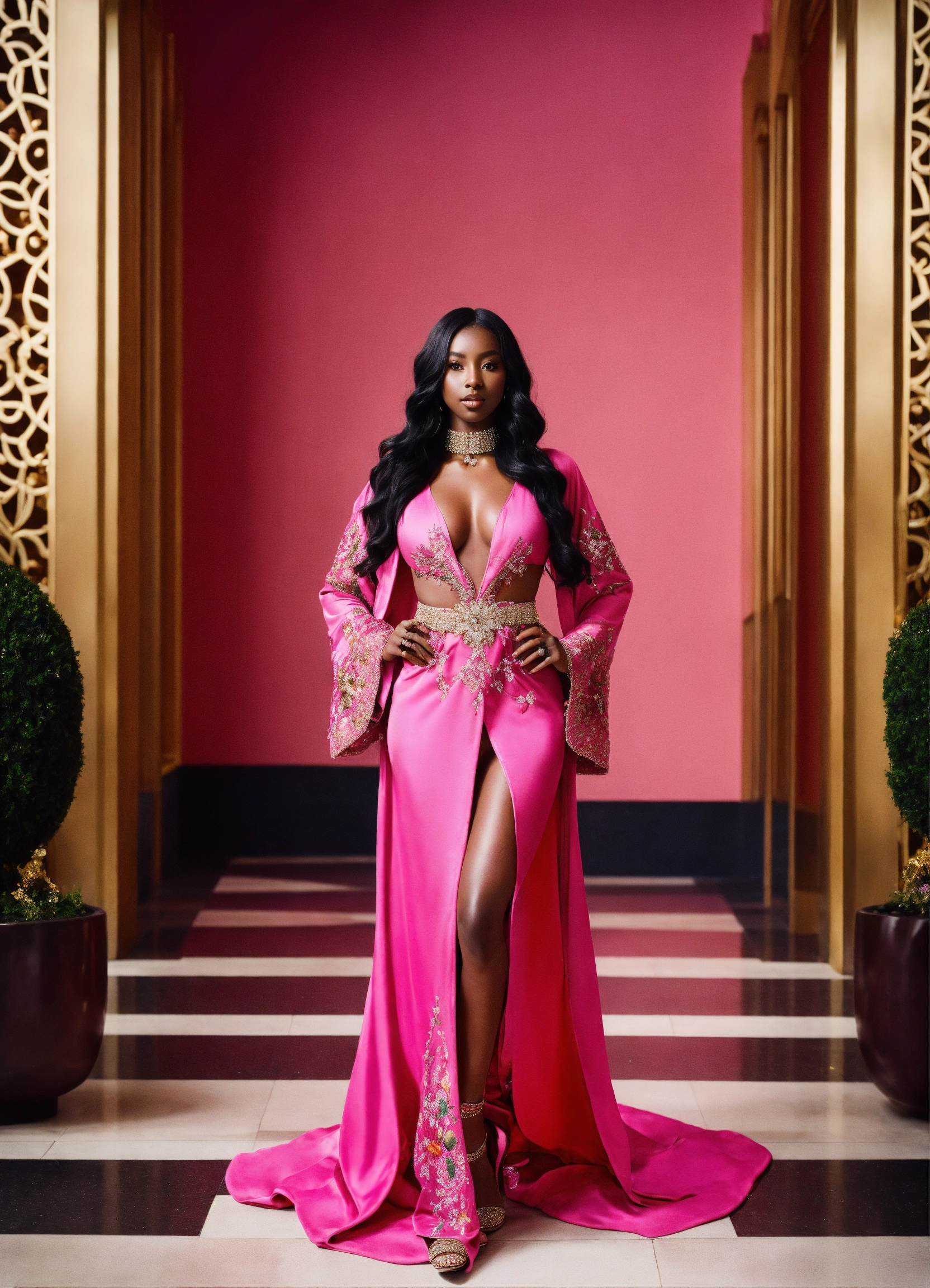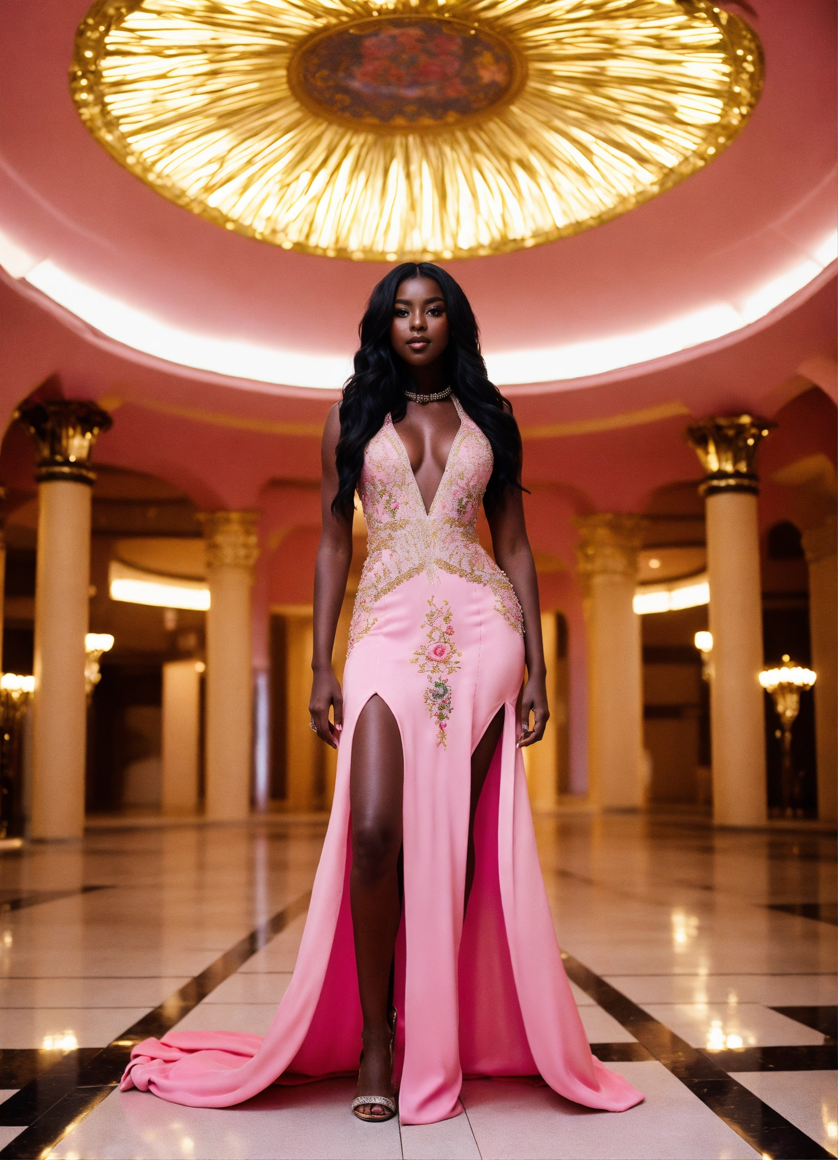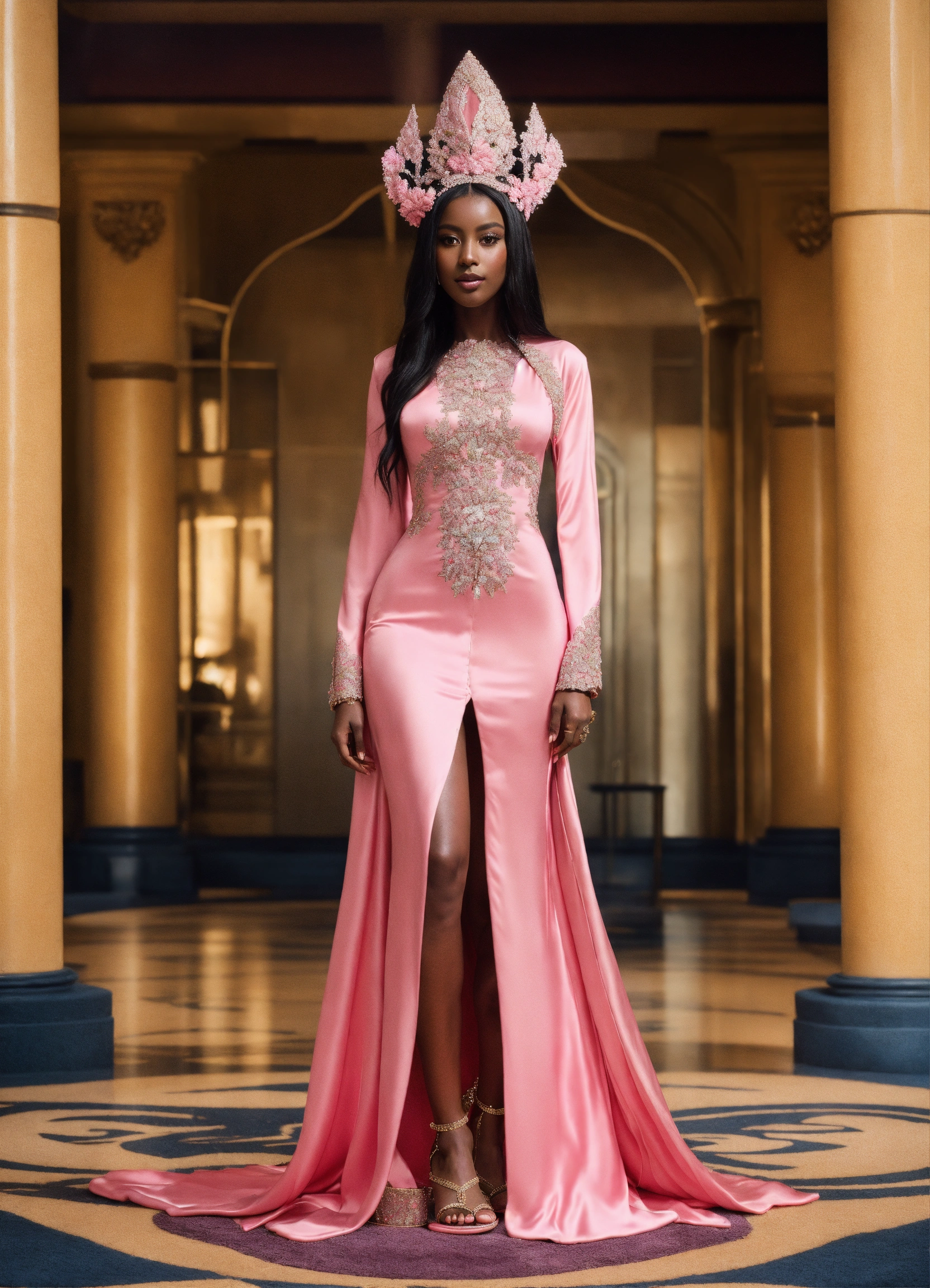 Alien female, dark skin, long dark hair. gem studded headpeice, wide hips. dressed in pink fitted haute couture embroidered robe dress and open toe heels, standing in a luxurious atrium during daylight. outgoing persona.