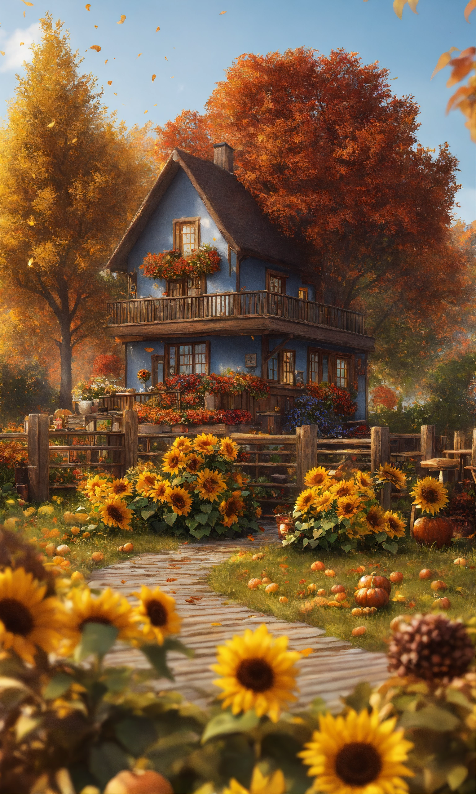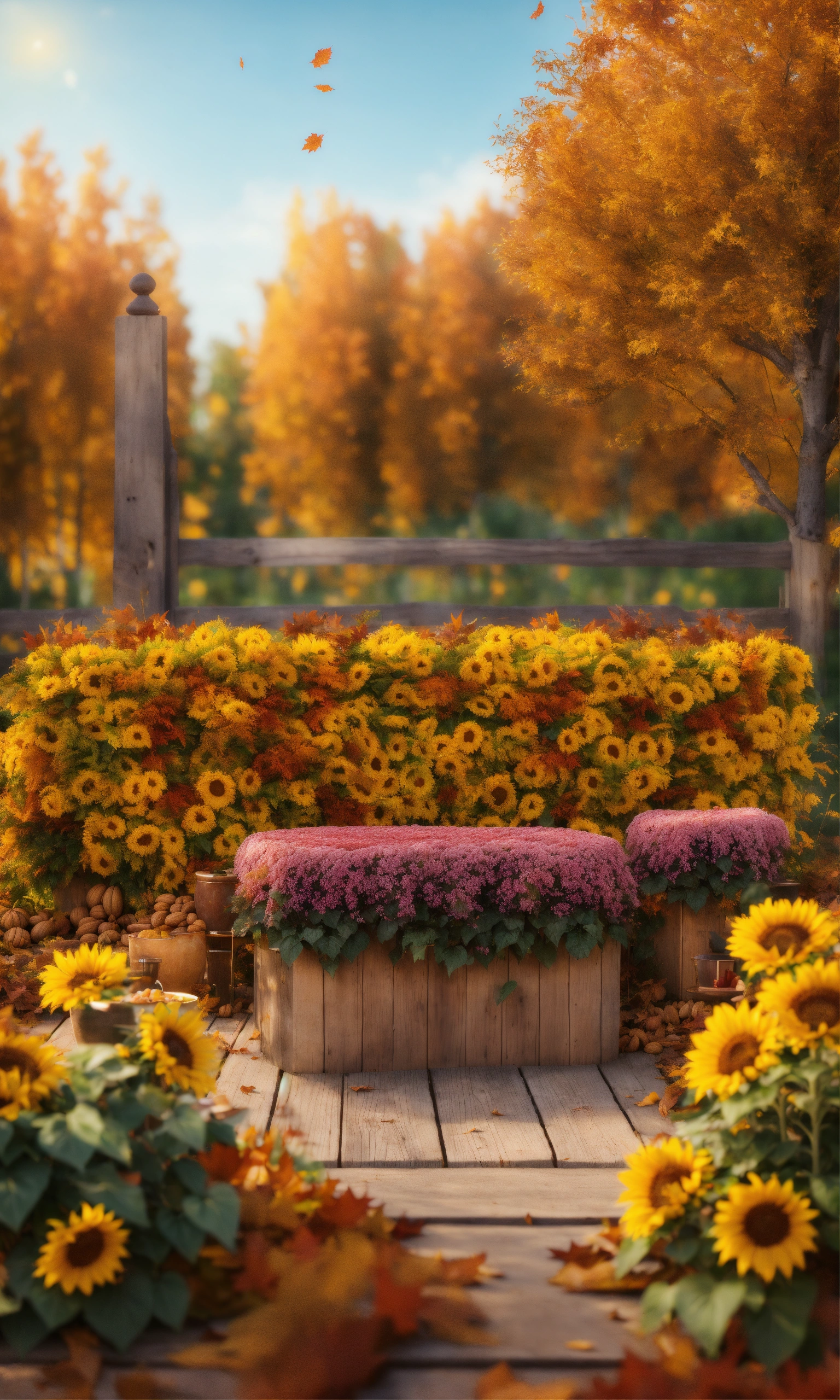 Spacious autumn garden with bushes and flowers, autumn sunflowers, golden grass, realistic, detailed, detailing, 8k. in front place over a wooden table a cake made of autumn leaves and nuts.