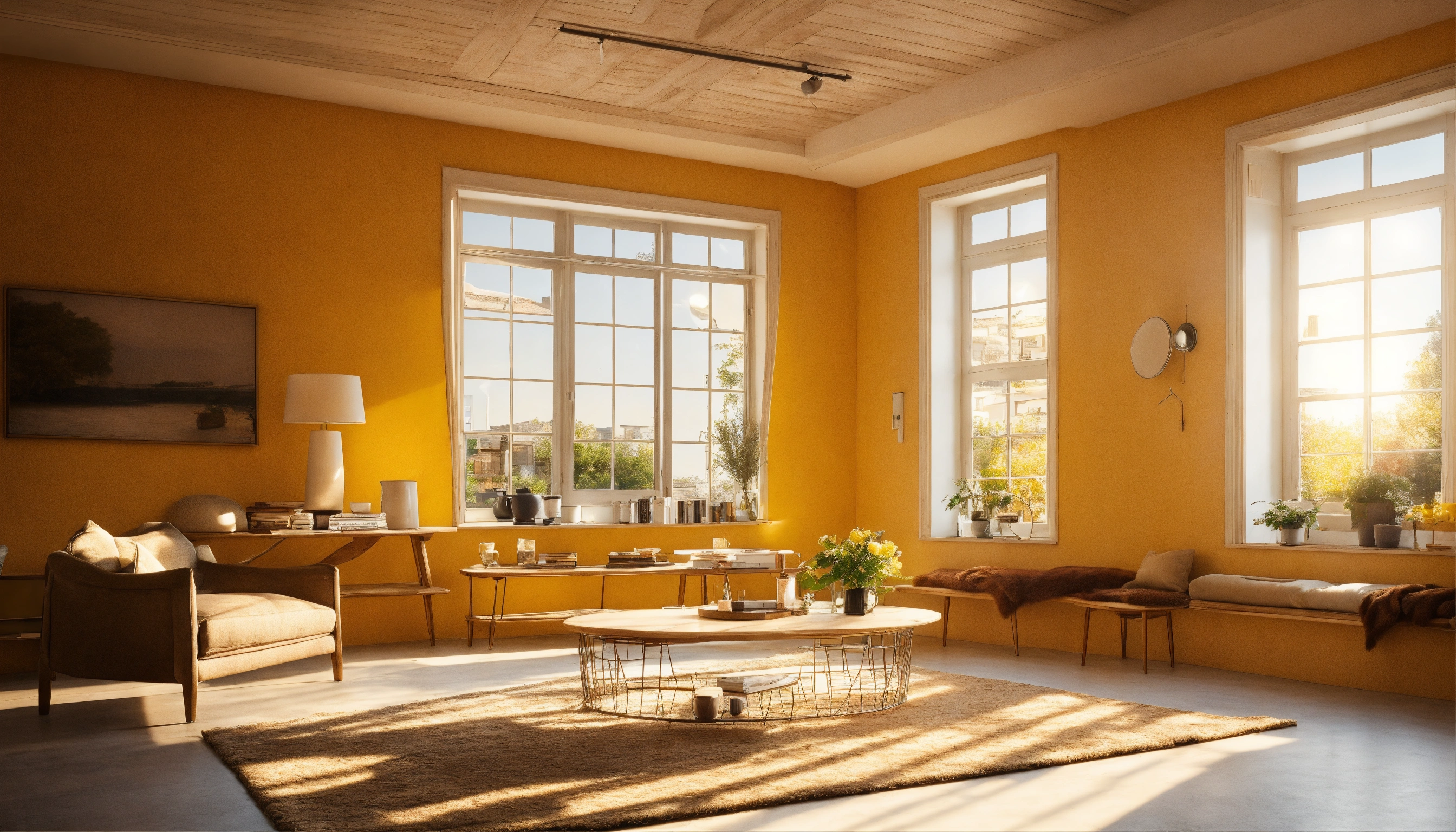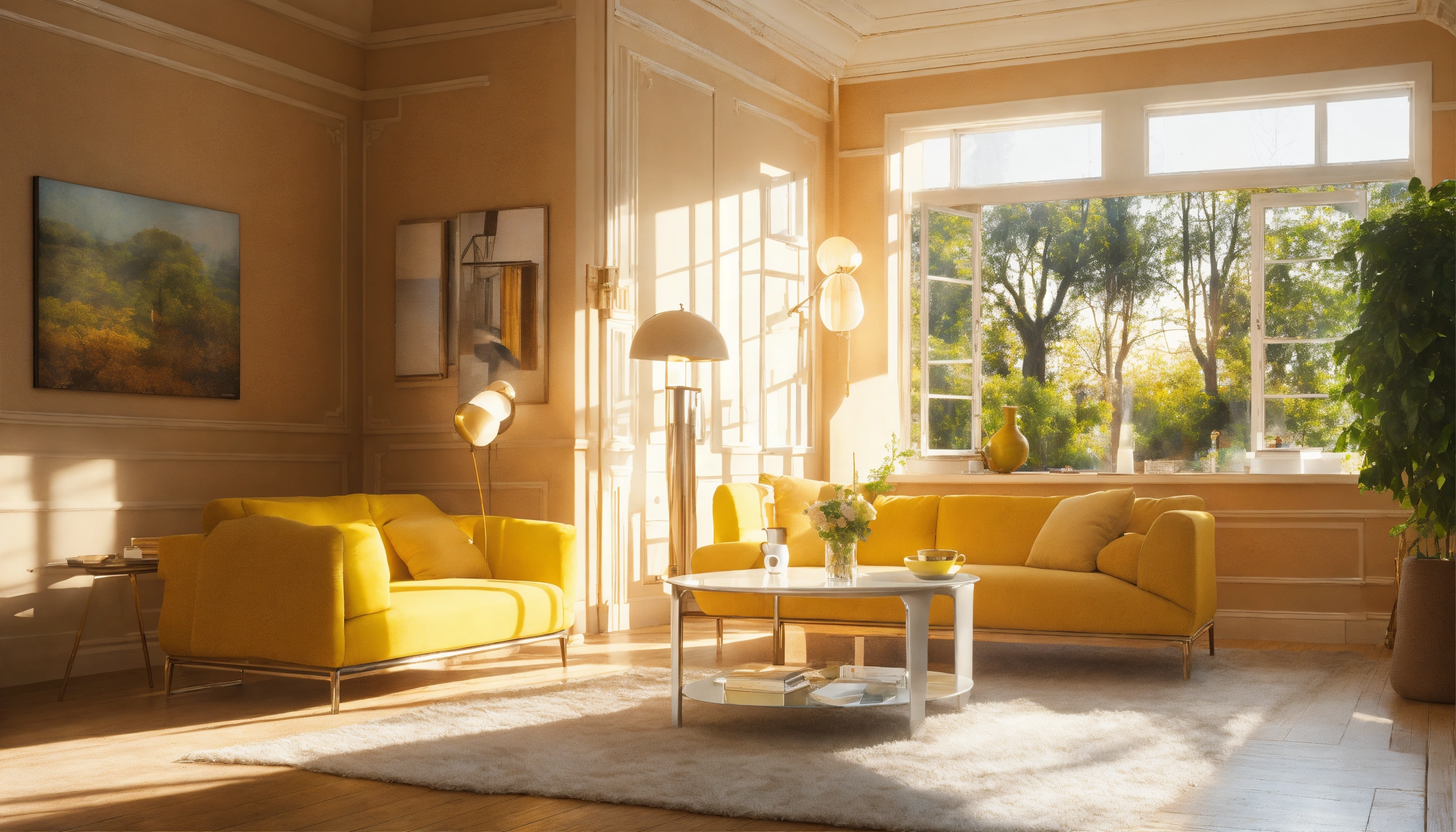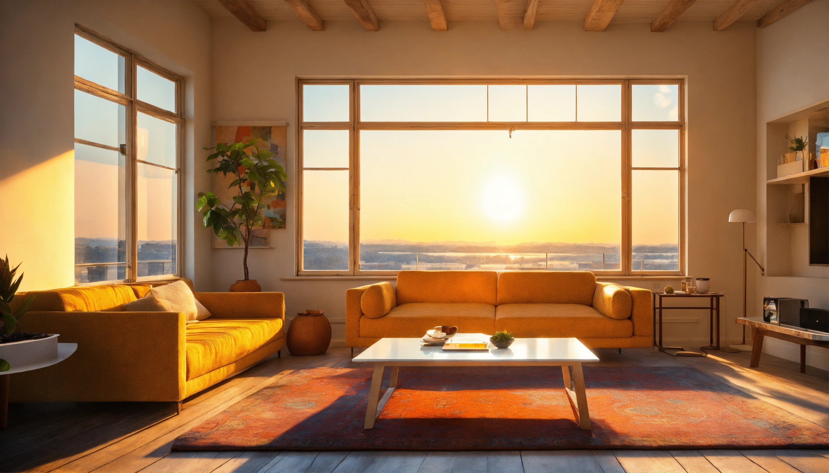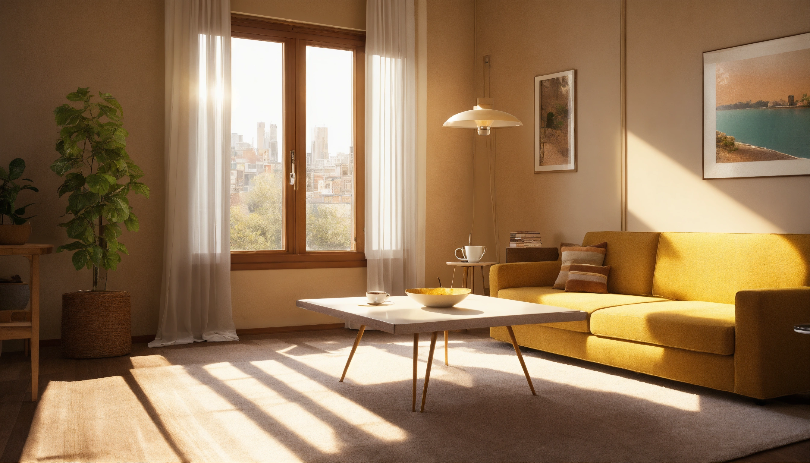 A bright room with a window from which the sun shines, there is a coffee table in the room on which there is a cup of coffee