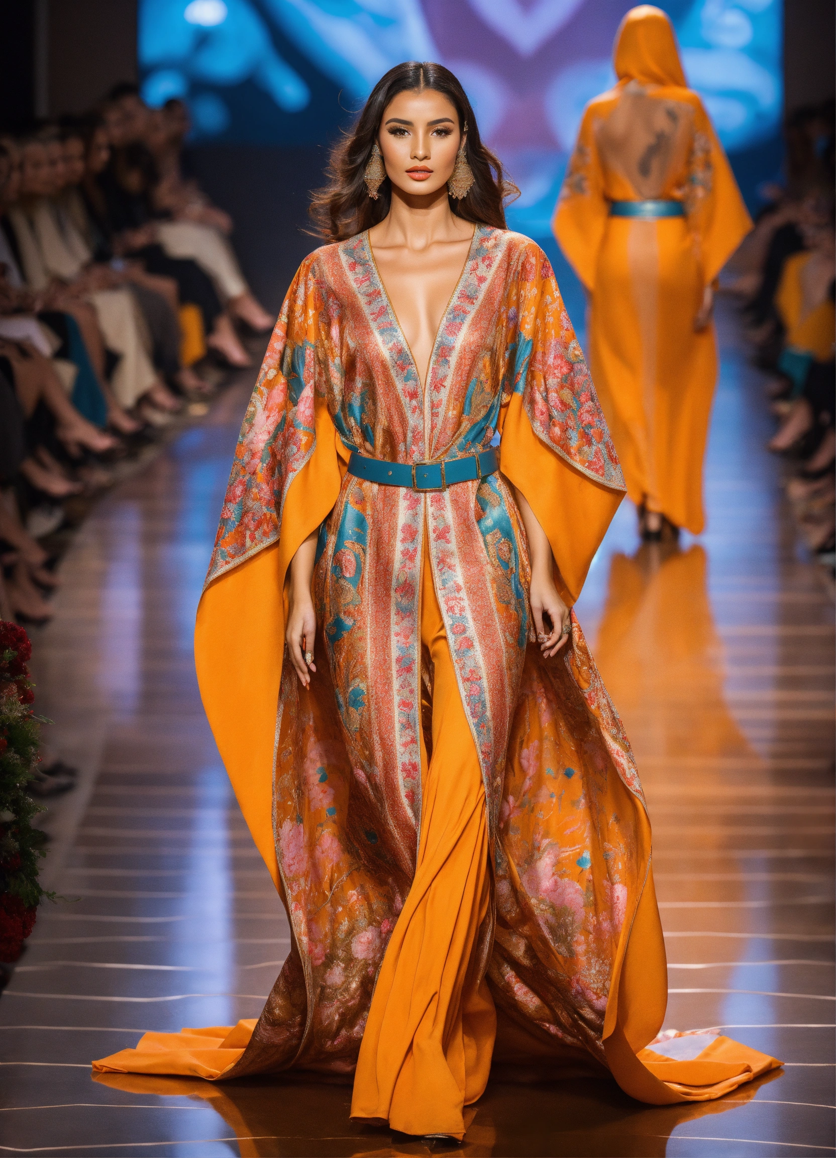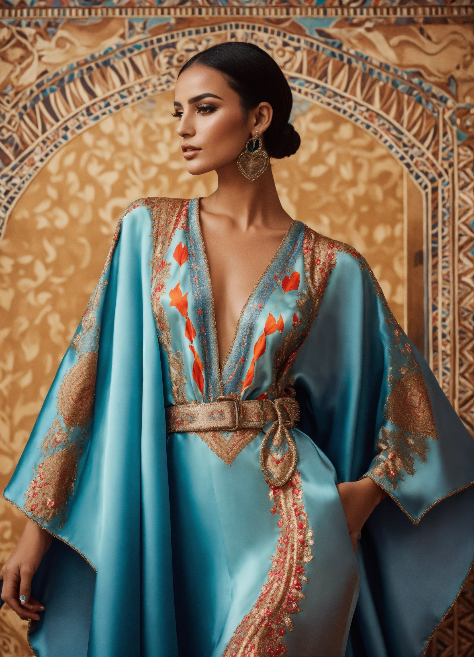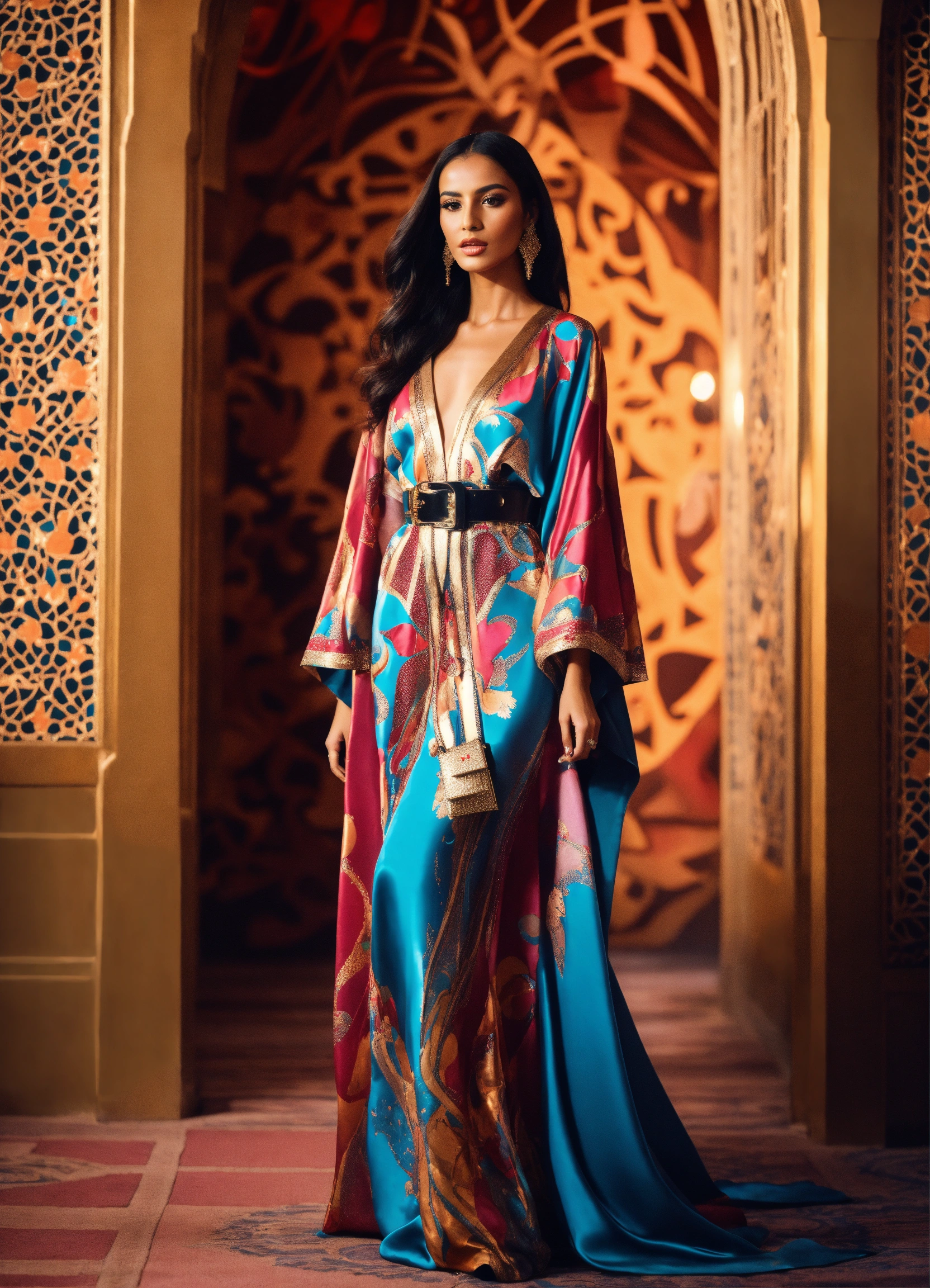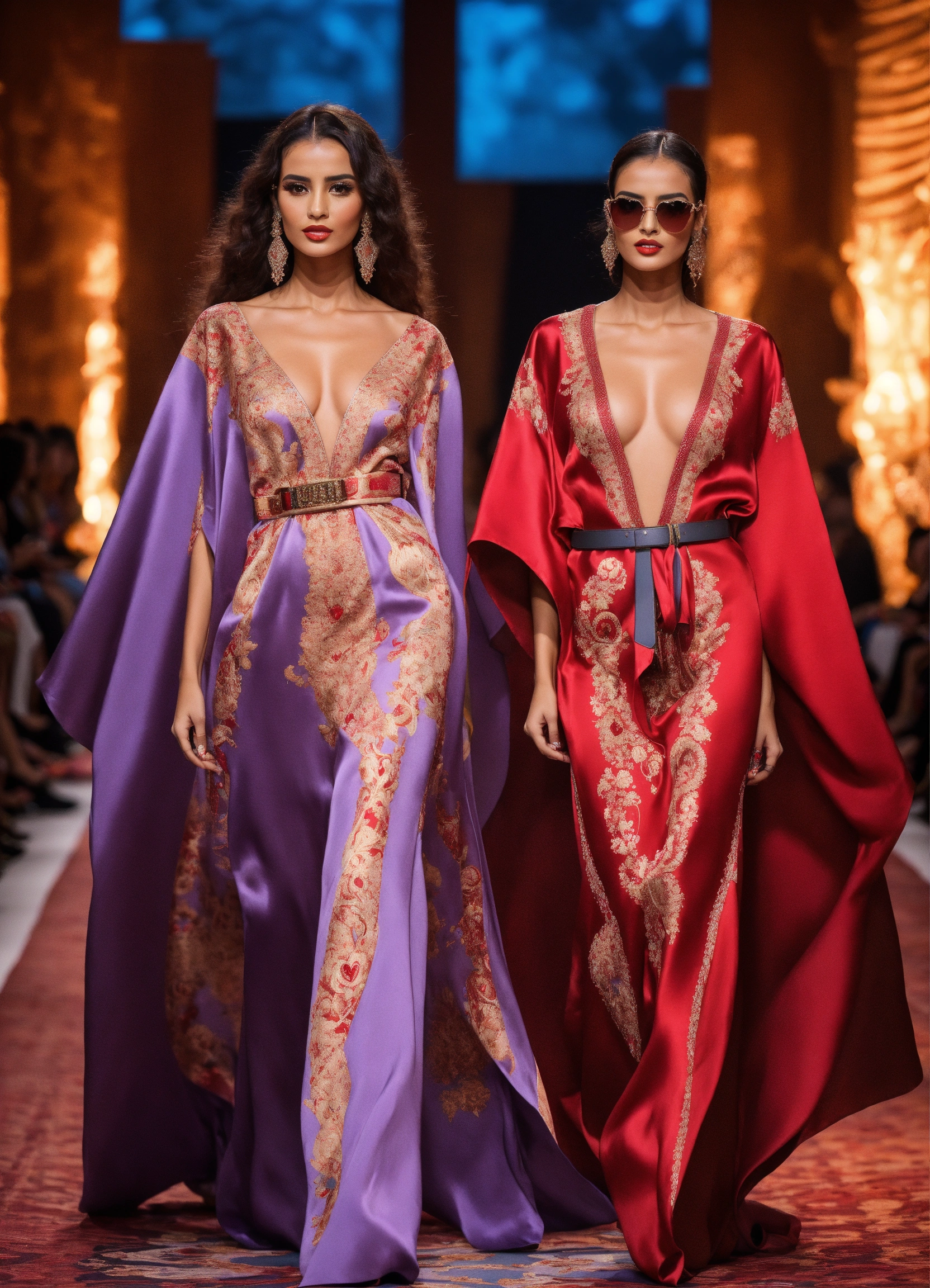 Beautiful morrocan women wearing morrocan heart-shaped kaftan haute couture, luxury fabric silk, with belt morrocan hyperrealistic futurism in front decor runaway walk fashion show