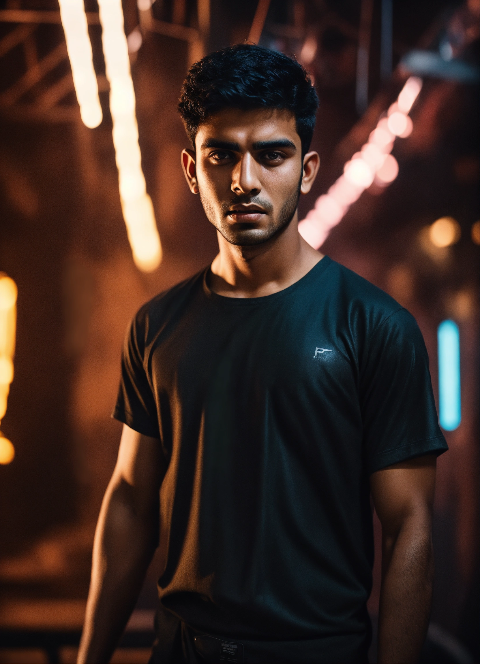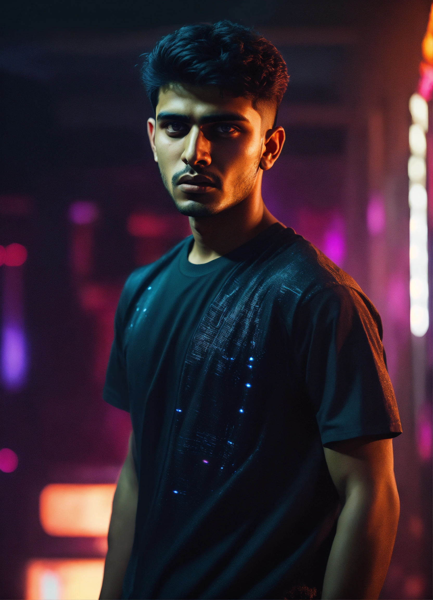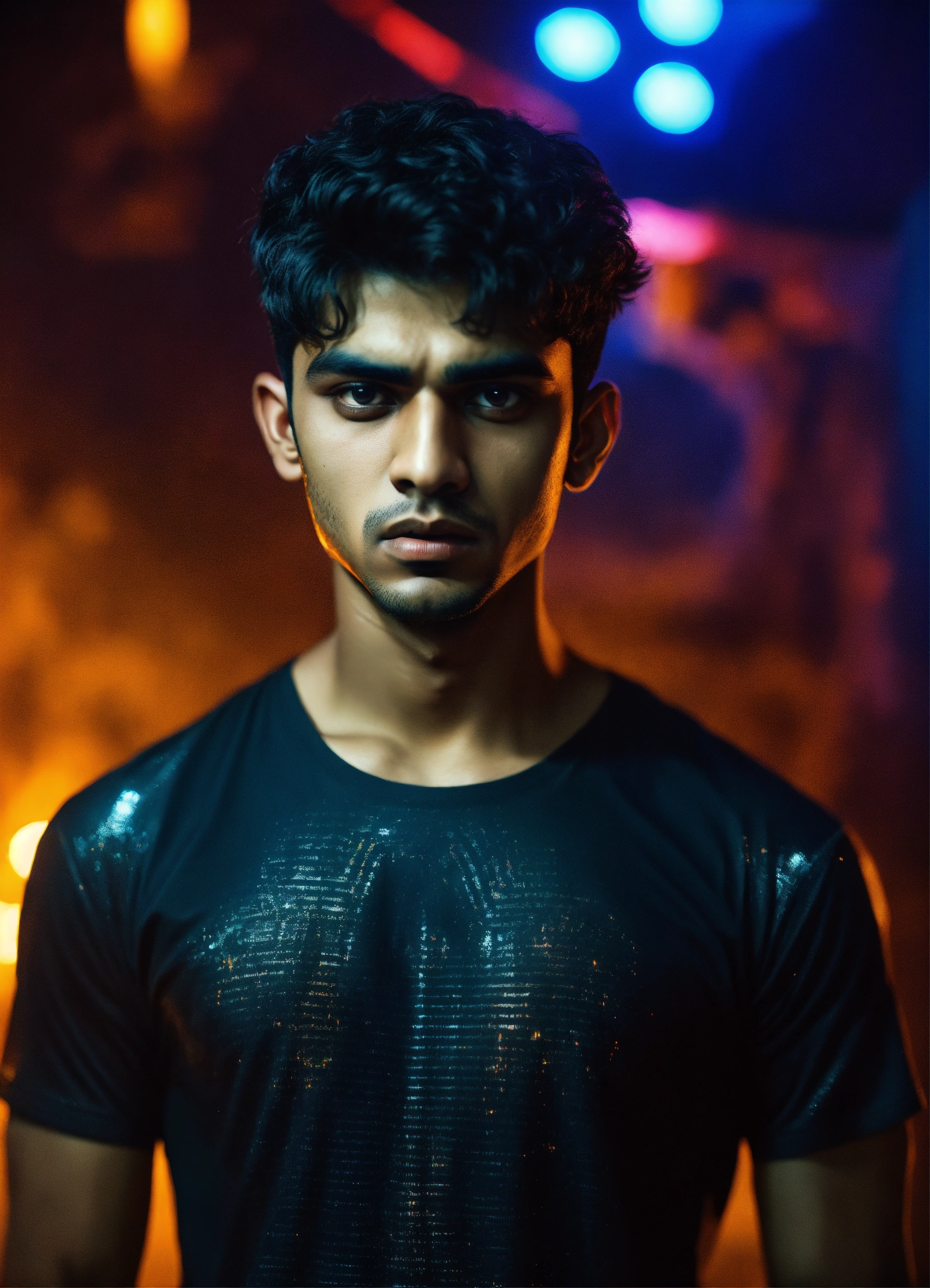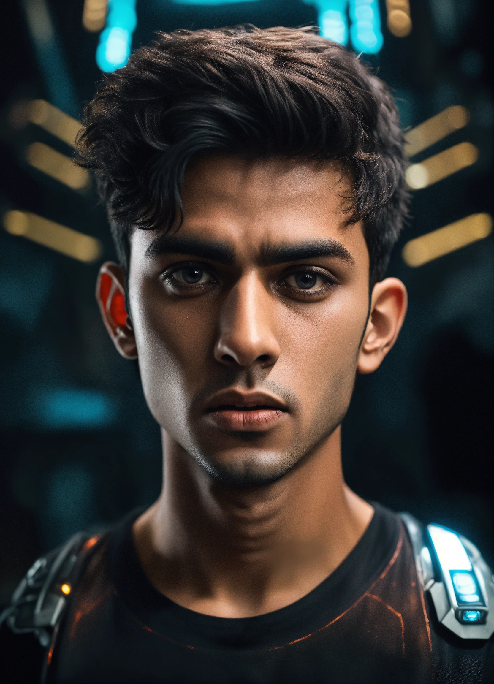 A realistic photograph of an ugly pakistani 20-year-old boy, with a serious expression, strong fit body, with very short hair, tanned skin, scary face, deep eyes, wearing a black sci-fi polymer shirt, dramatic illumination, in a dark sci-fi background, hyperdetailed, hyperrealistic, 8 k