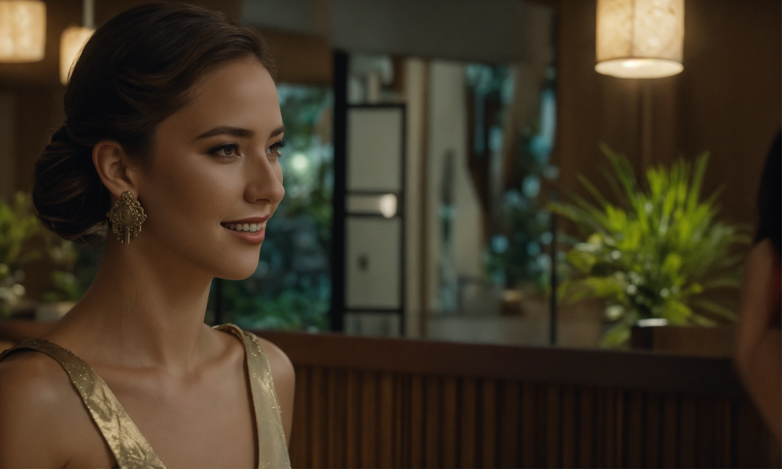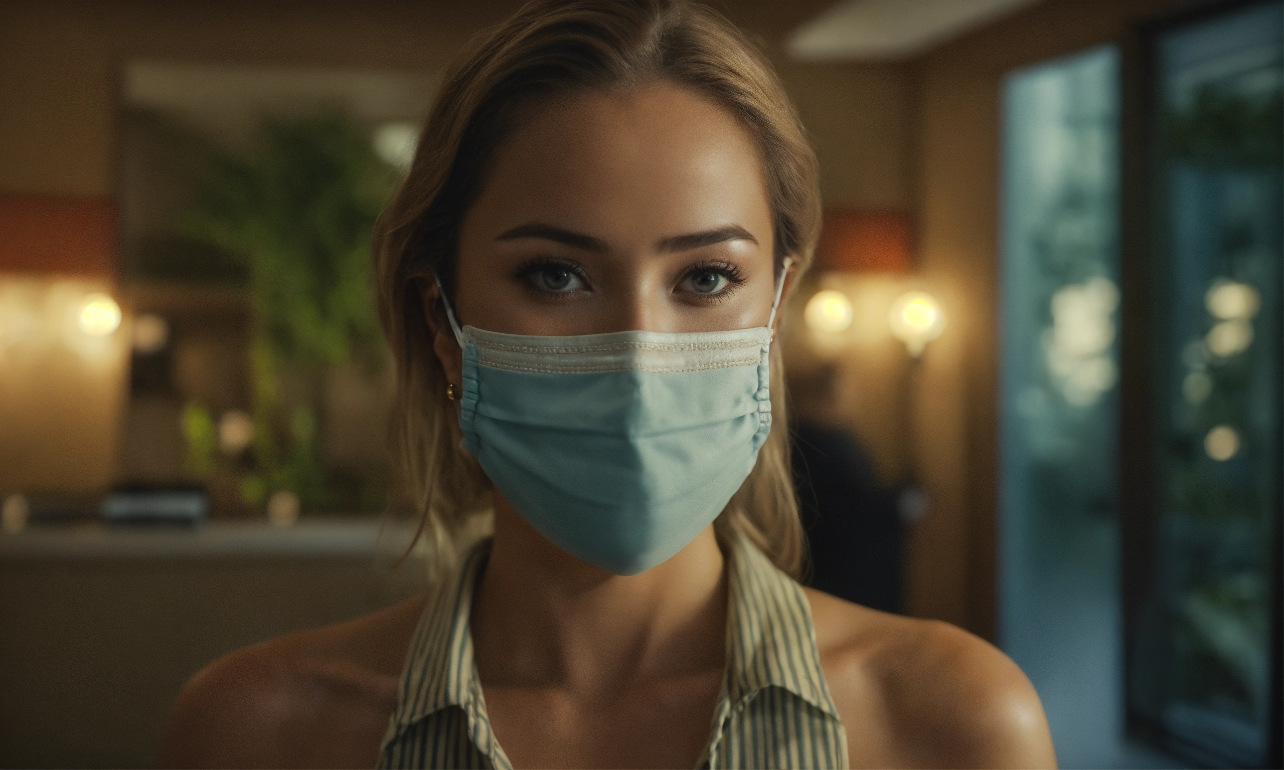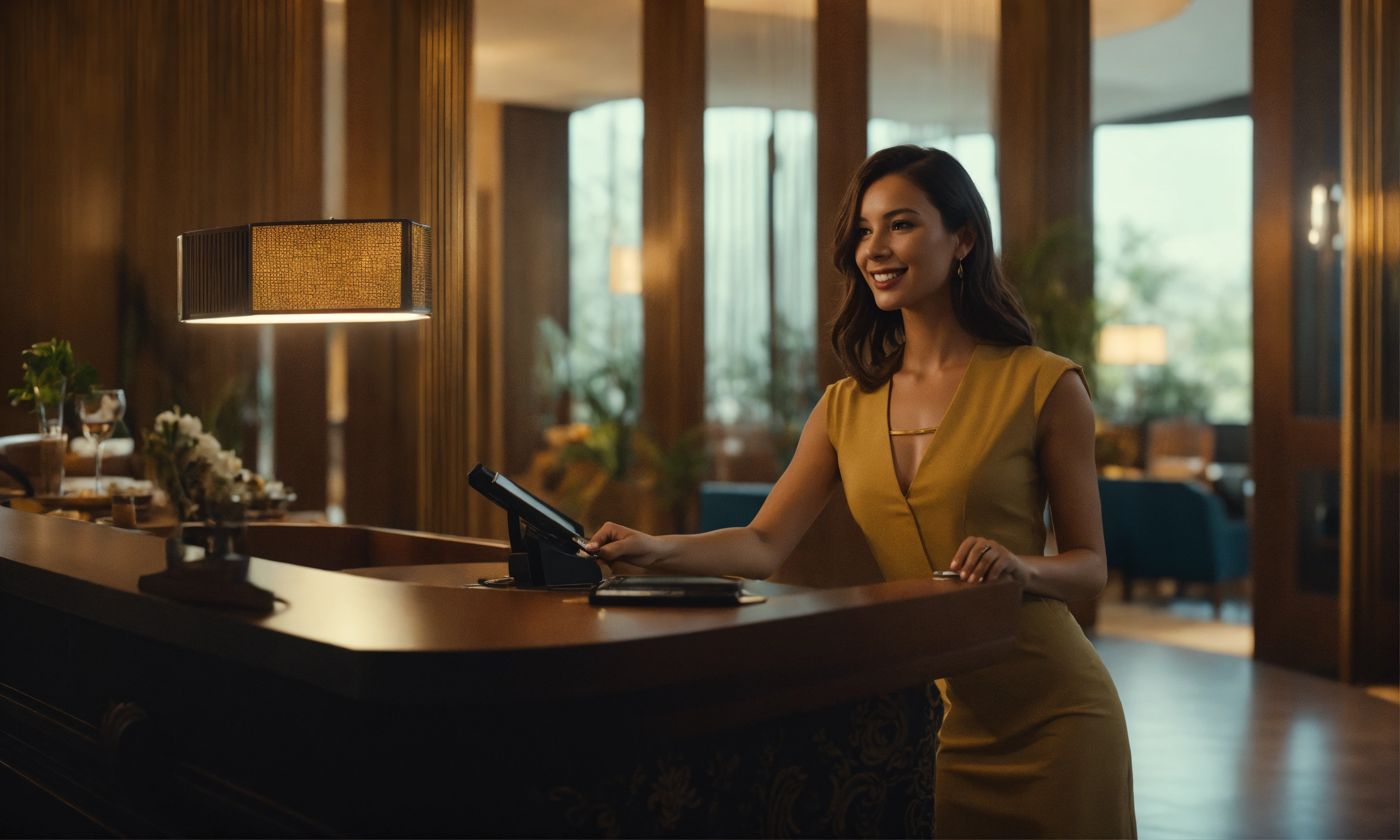 The excited female model at small resort reception takes the keys from the mask worn male receptionist, interior day time, mood lighting, front shot, 8k, luxcorerender, earthly colour, cinematic photography, real humans, real images, matte finish, shot on arri anamorphic, extreme wide shot, smooth, sharp focus, ornate, highly dynamic, particulate, hyperreal, wide shot