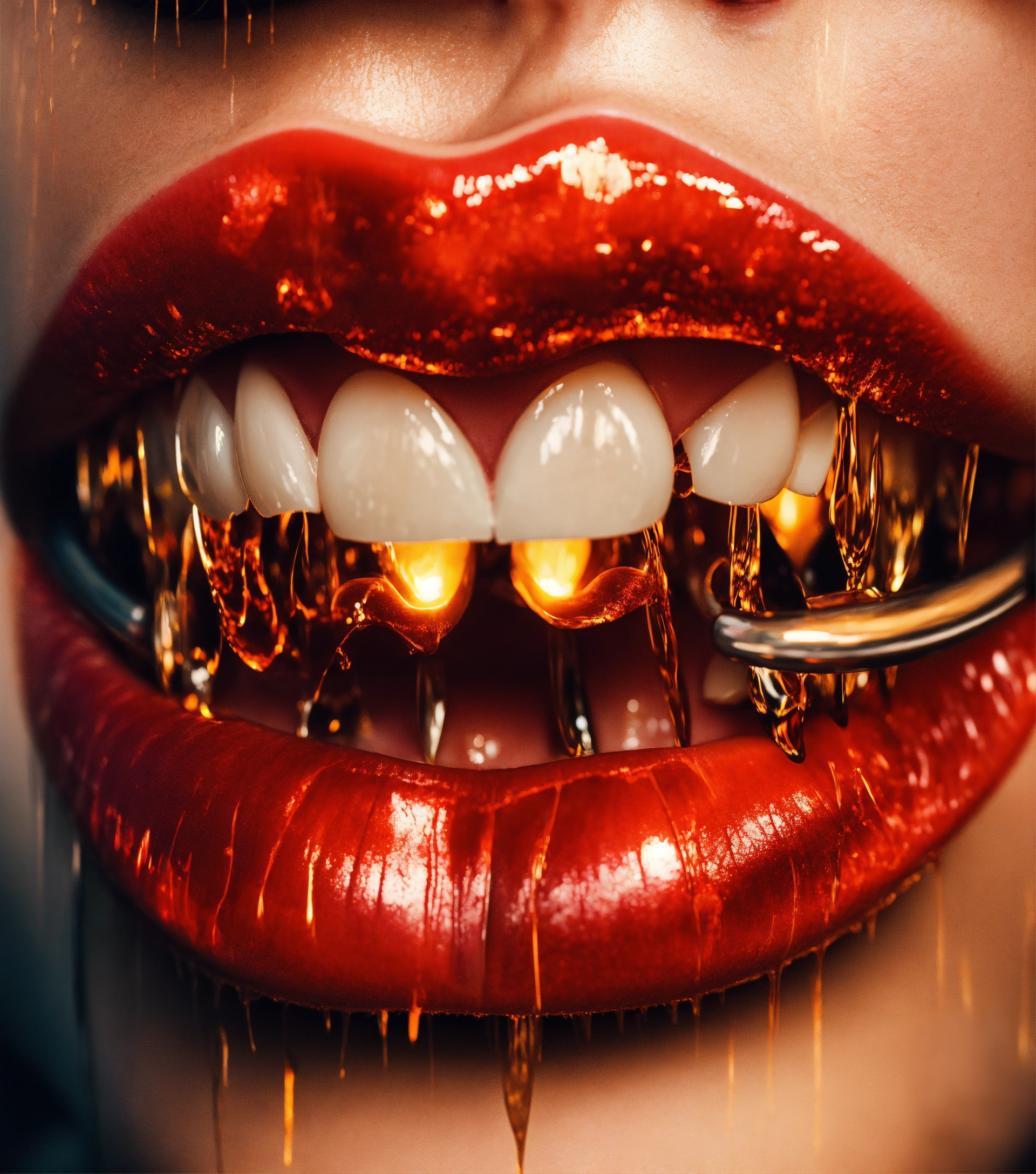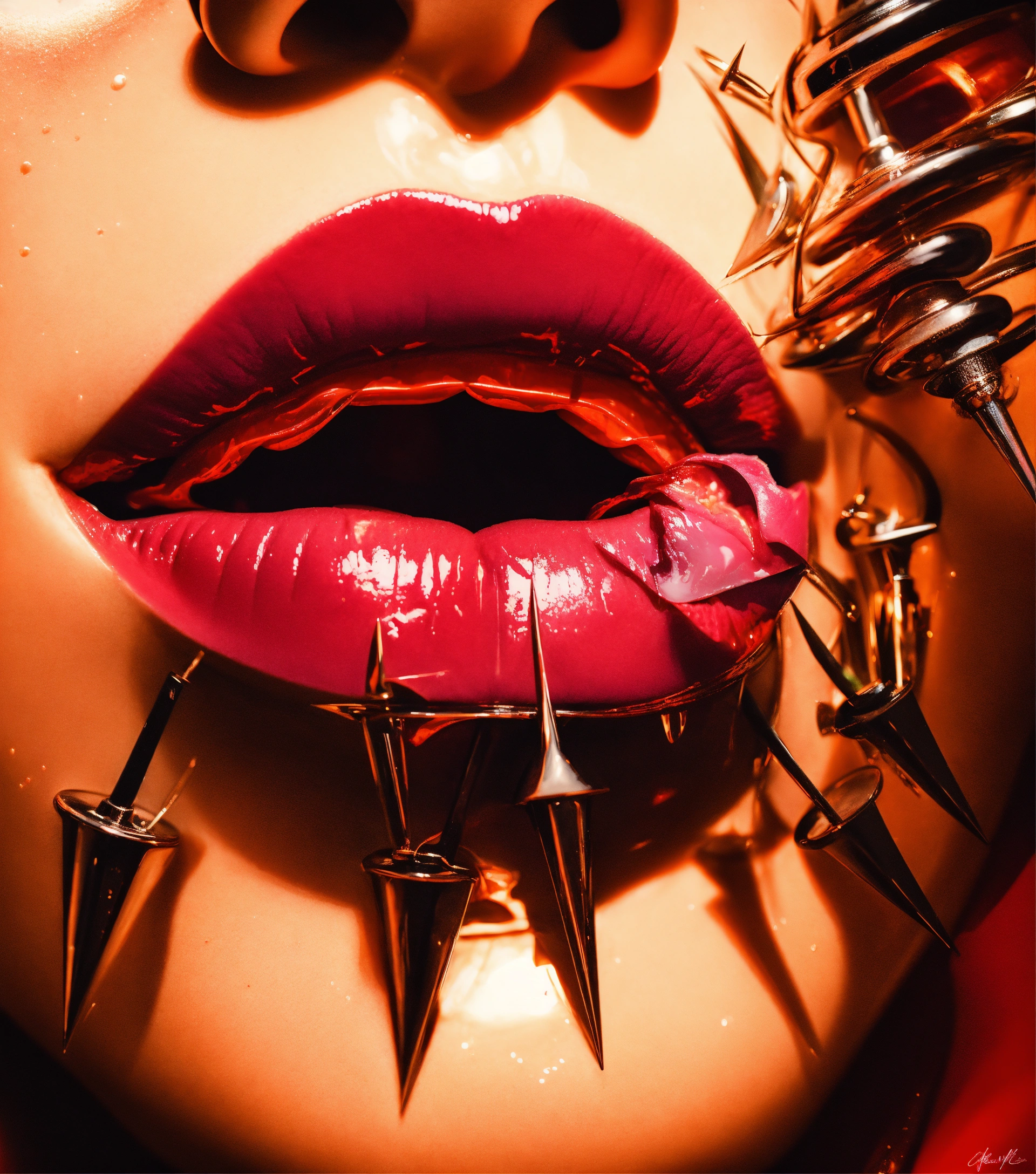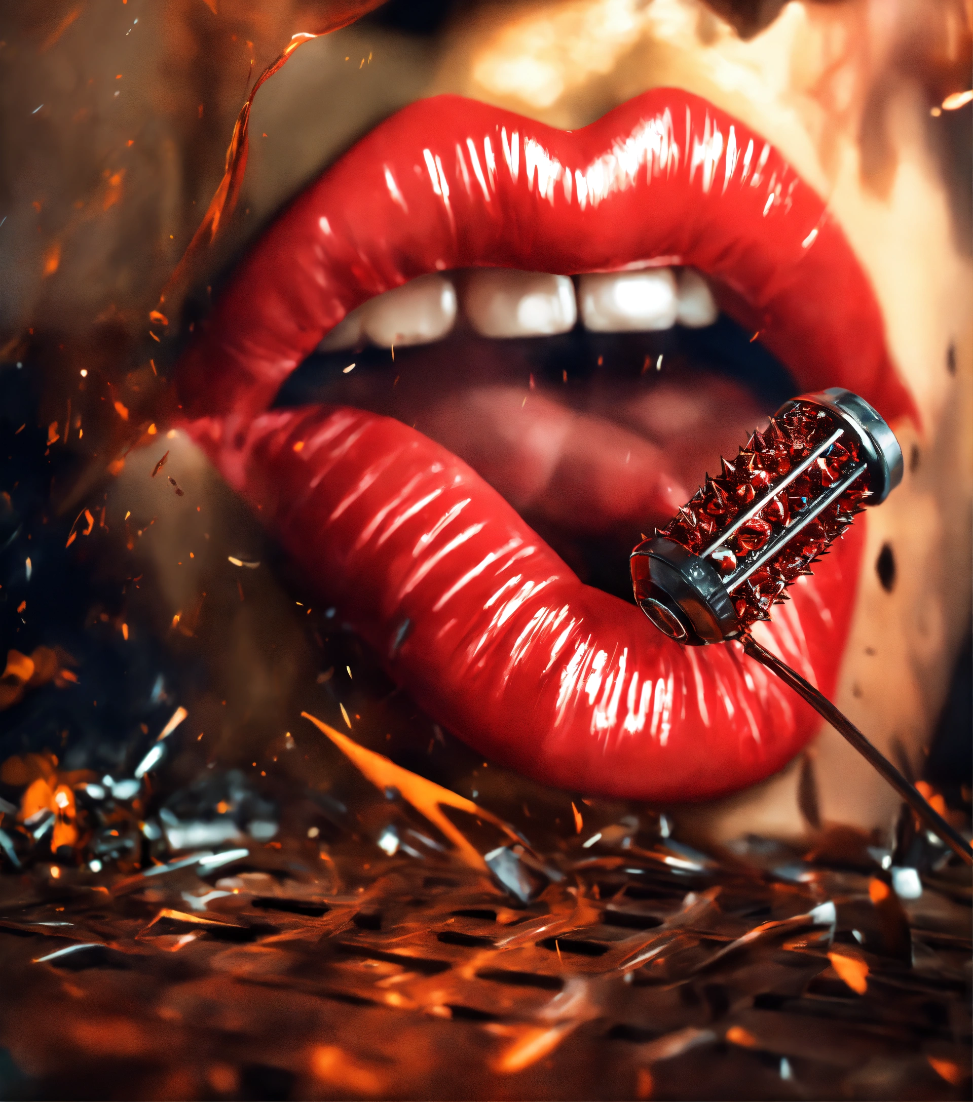 A pair of lips, with spiked grills, tornado swirling indoors, vr, impressionistic, cinematic light., sophisticated, warm colors