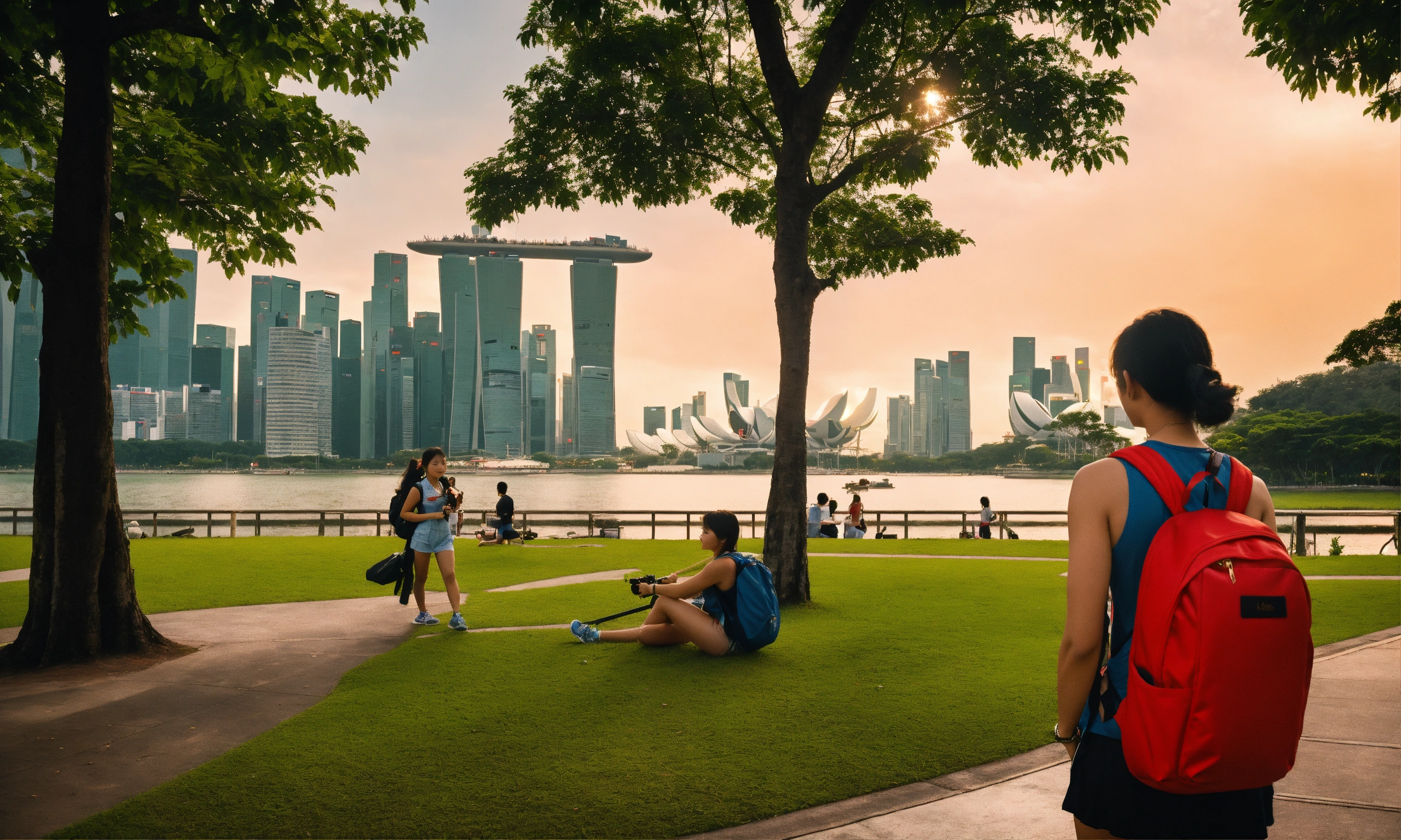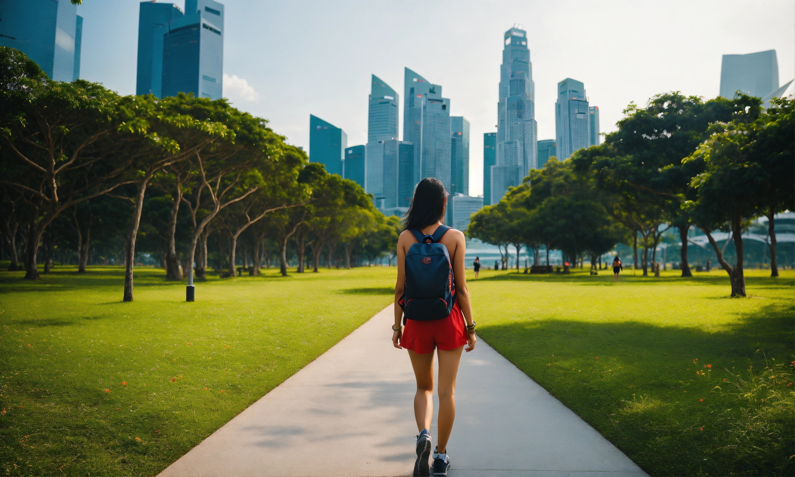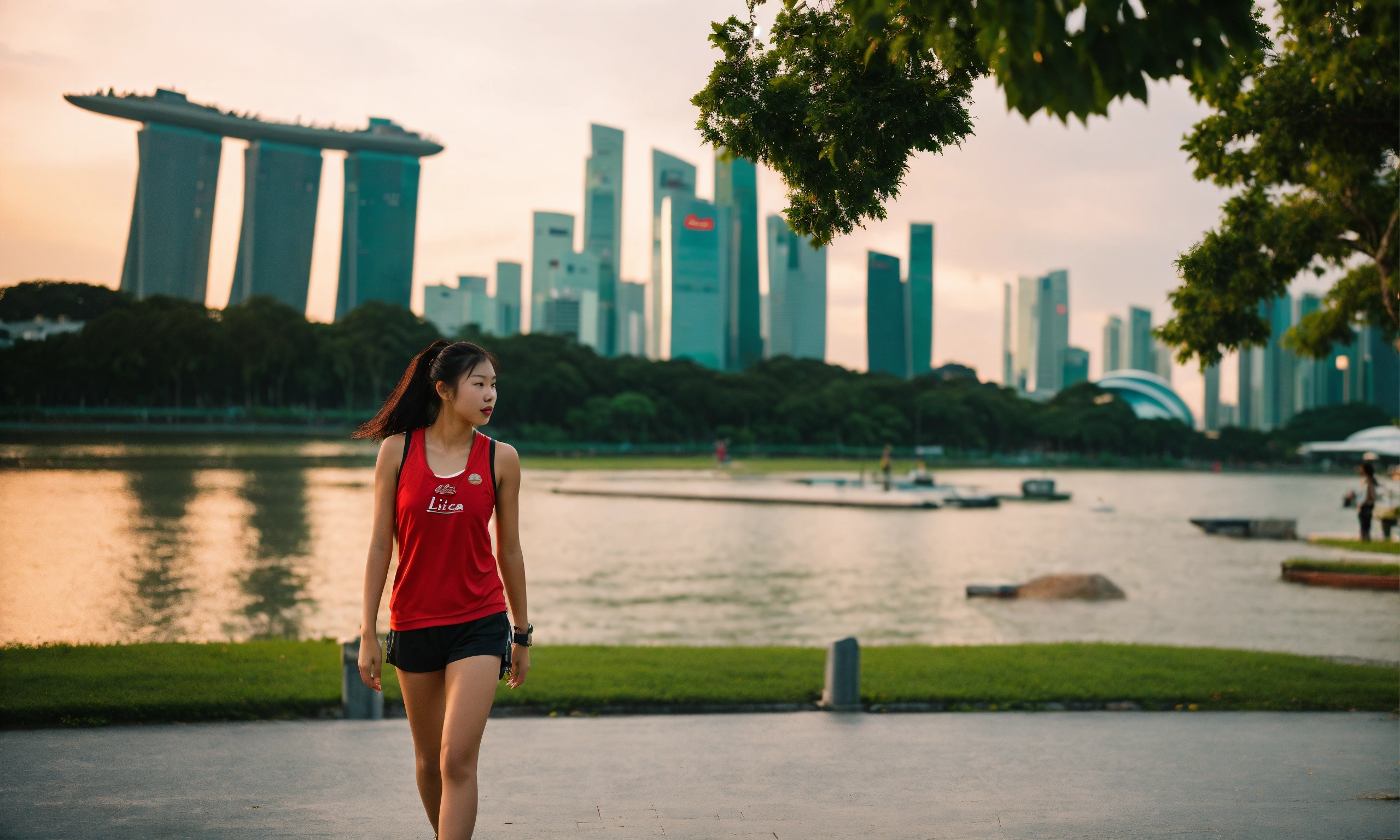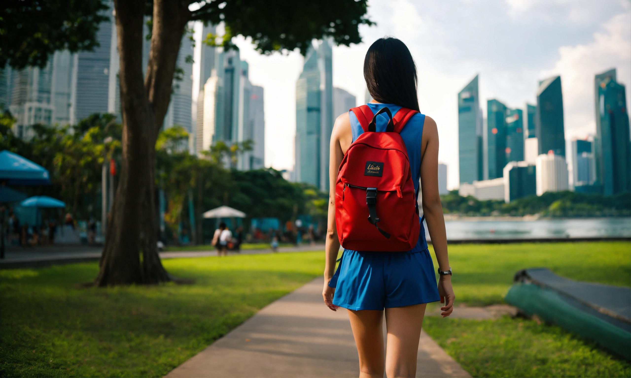 Medium shot of an athletic 18-year-old asian girl walking in singapore's east coast park, head tilts back, a sleeveless plain red singlet, determined and slightly annoyed expression, looking into the water, black backpack, towering trees, backdrop is the iconic singapore cityscape rises with modern skyscrapers and marina barrage, and vibrant attire symbolize the energy of this unique urban park, a leica summicron 35mm f2.0 lens to enhance the colors, shooting with kodak portra 400 film to add cinematic richness.