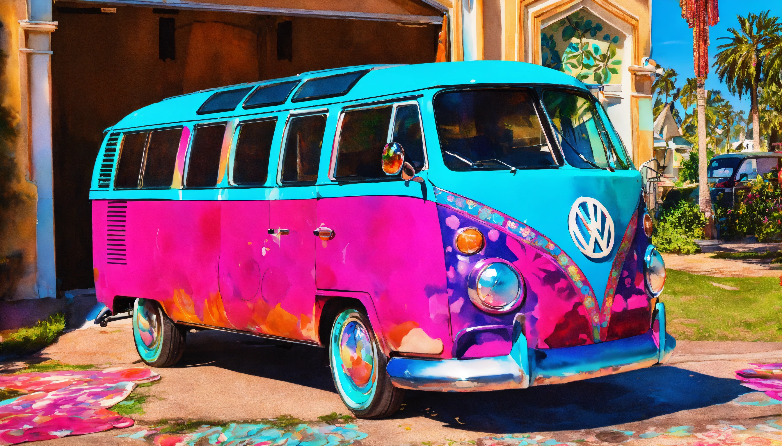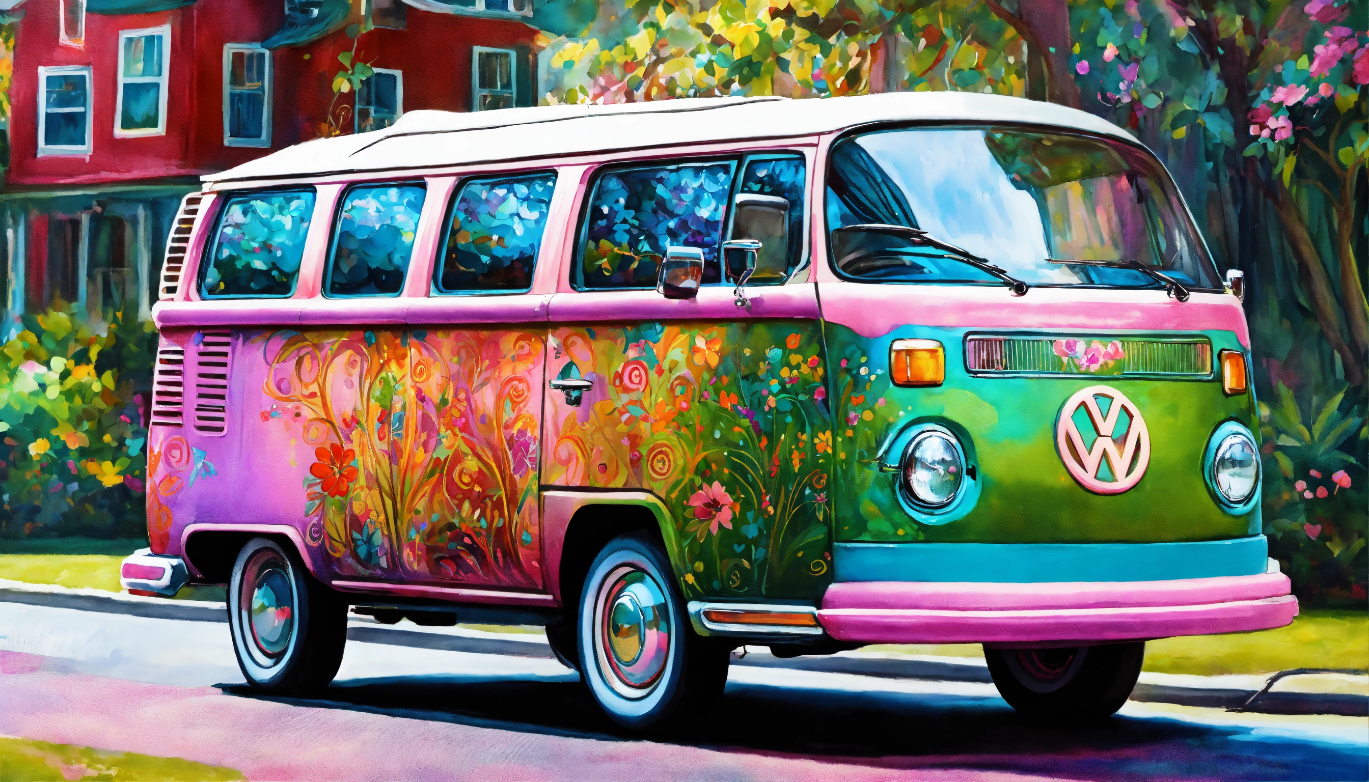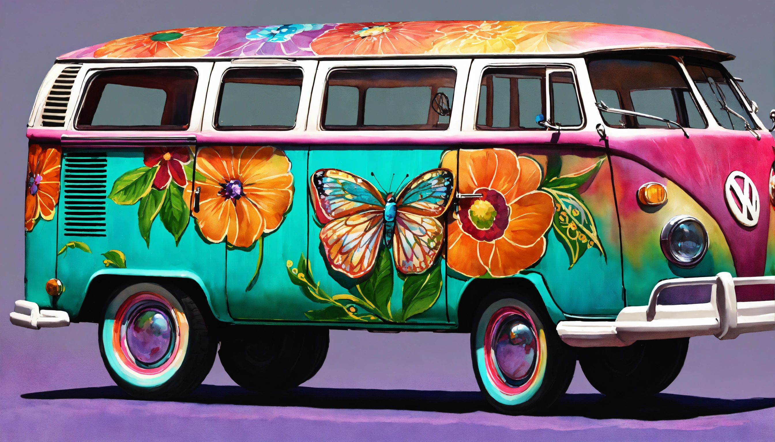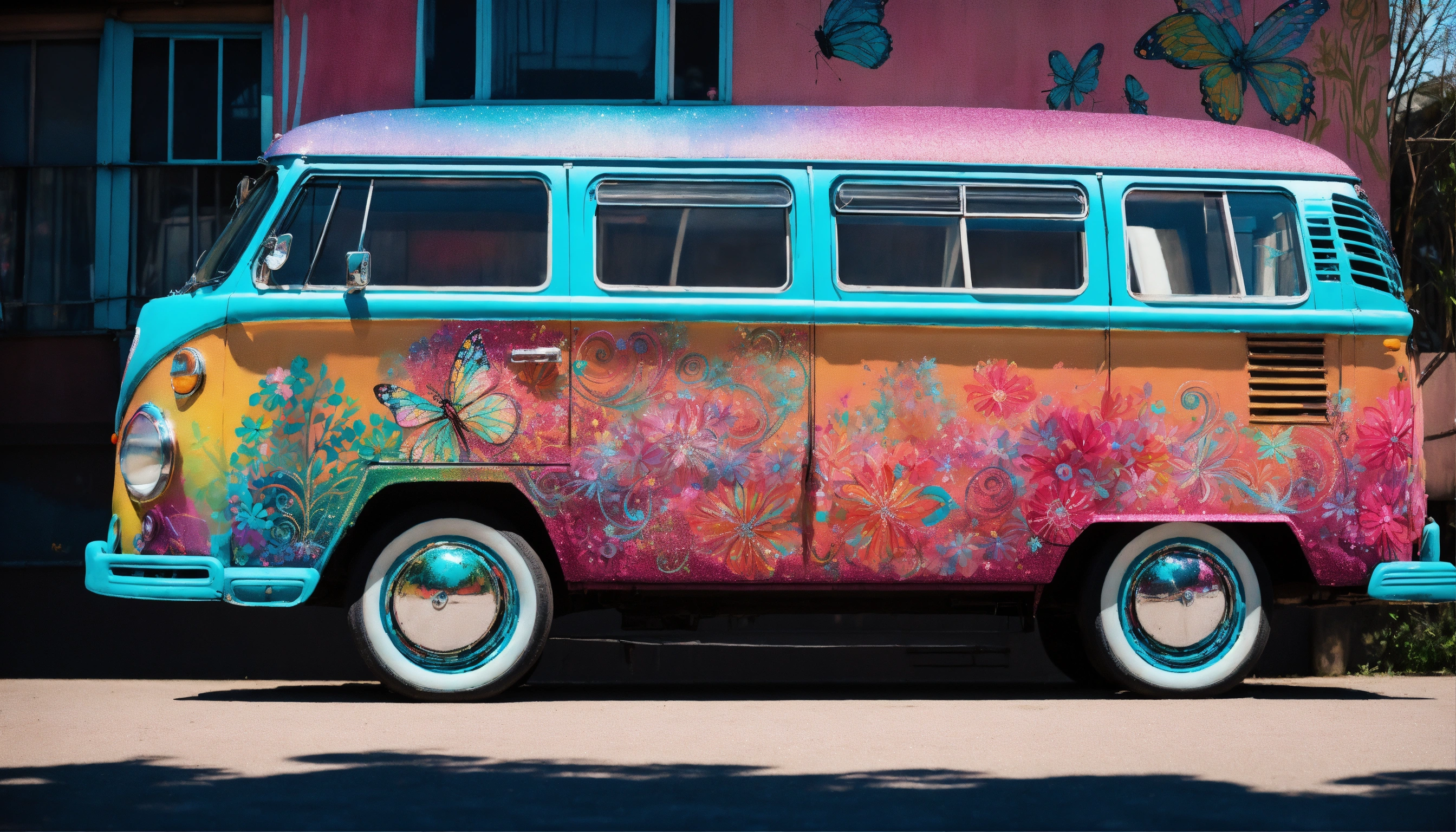 Concept art of hyper realistic turquoise volkswagen bus, paint on side of bus, personalized, girly, feminine, handpainted, artsy, boho, hyper realistic, realistic, hyper realism, painted, symmetrical, unique, floral, vintage, hippie, view from side, colorful, swirls, hyper realistic image, beautiful painted flowers on the side of the car, bohemian, decorated, perfect, painted mandala design, sequins, glitter, glitter swirls, beautiful embroidered curtains on windows, turquoise, glitter painted on side with elaborate tail, detailed, intricate, butterflies painted, designs painted all over the van, sparkle, mandala, artsy paint, personalized van, multicolored, colorful, hippie, dragonflies painted, boho bus, mural, ombre, artistic design painted on the bus, vintage watercolor magenta multicolored painting on side of van, sequins, sparkle, glitter, curtains on windows inside, purple, tangerine, pink, green turquoise, magenta, fuchsia, intricate swirls, multicolored ombre sequins