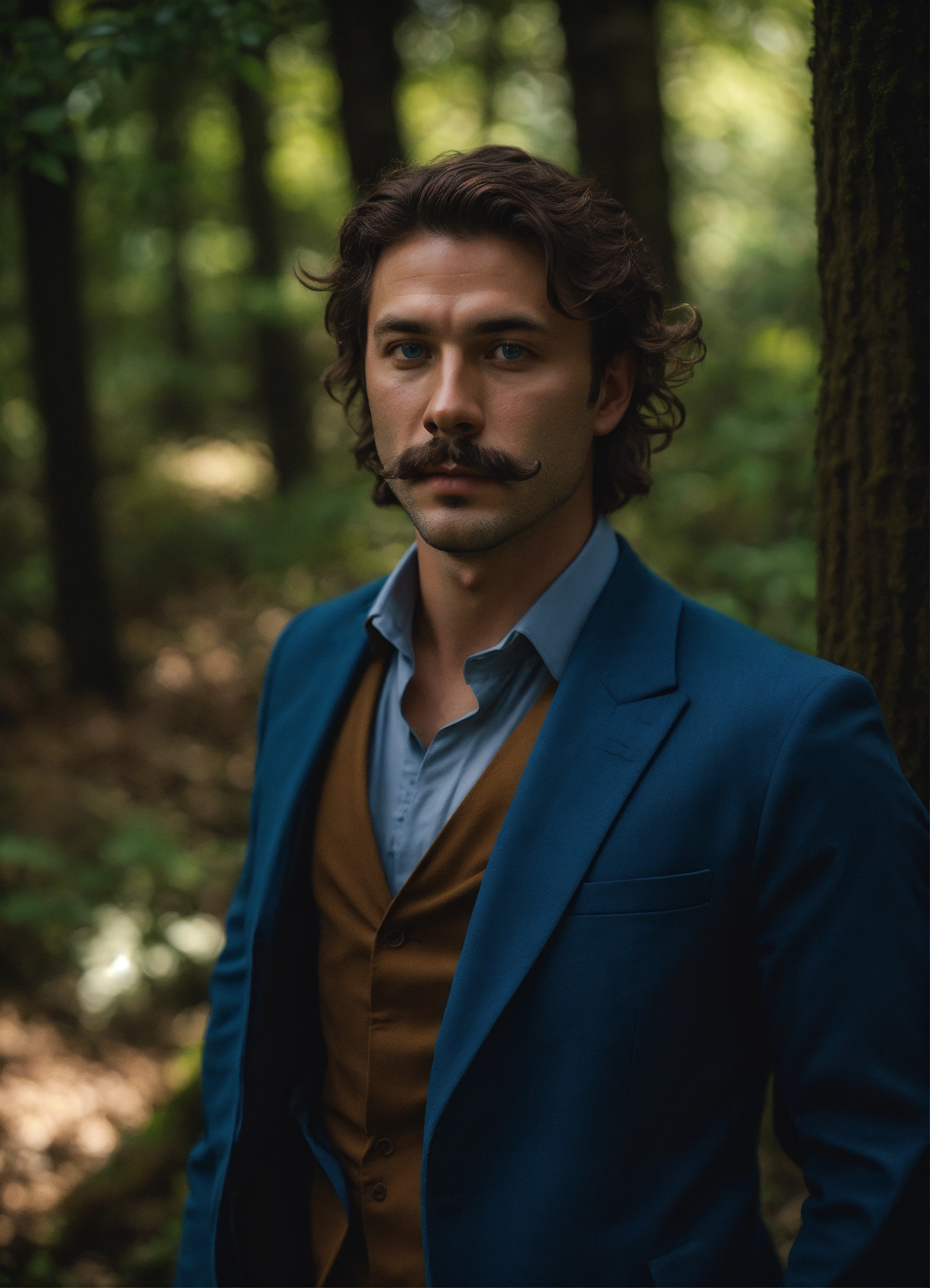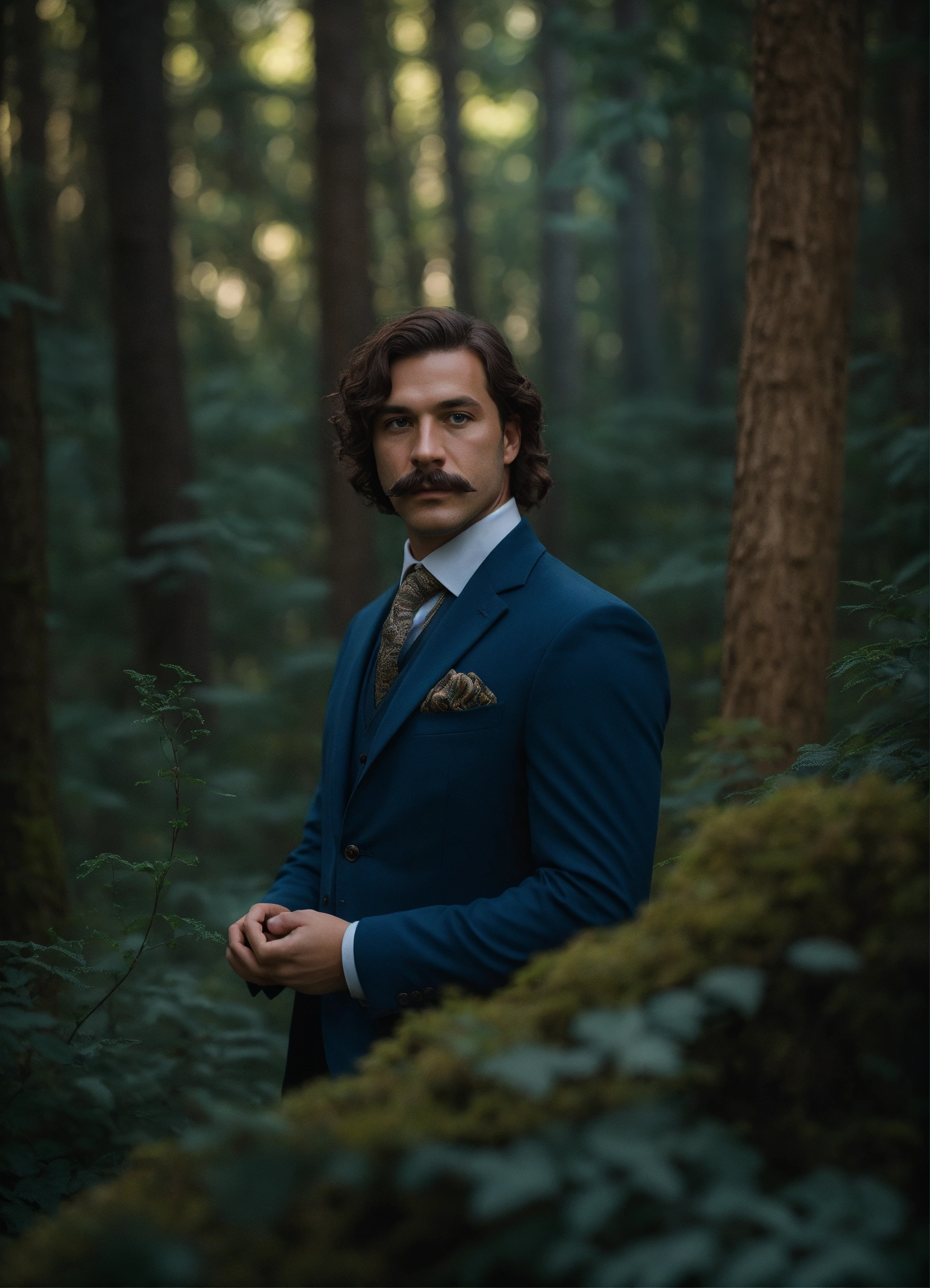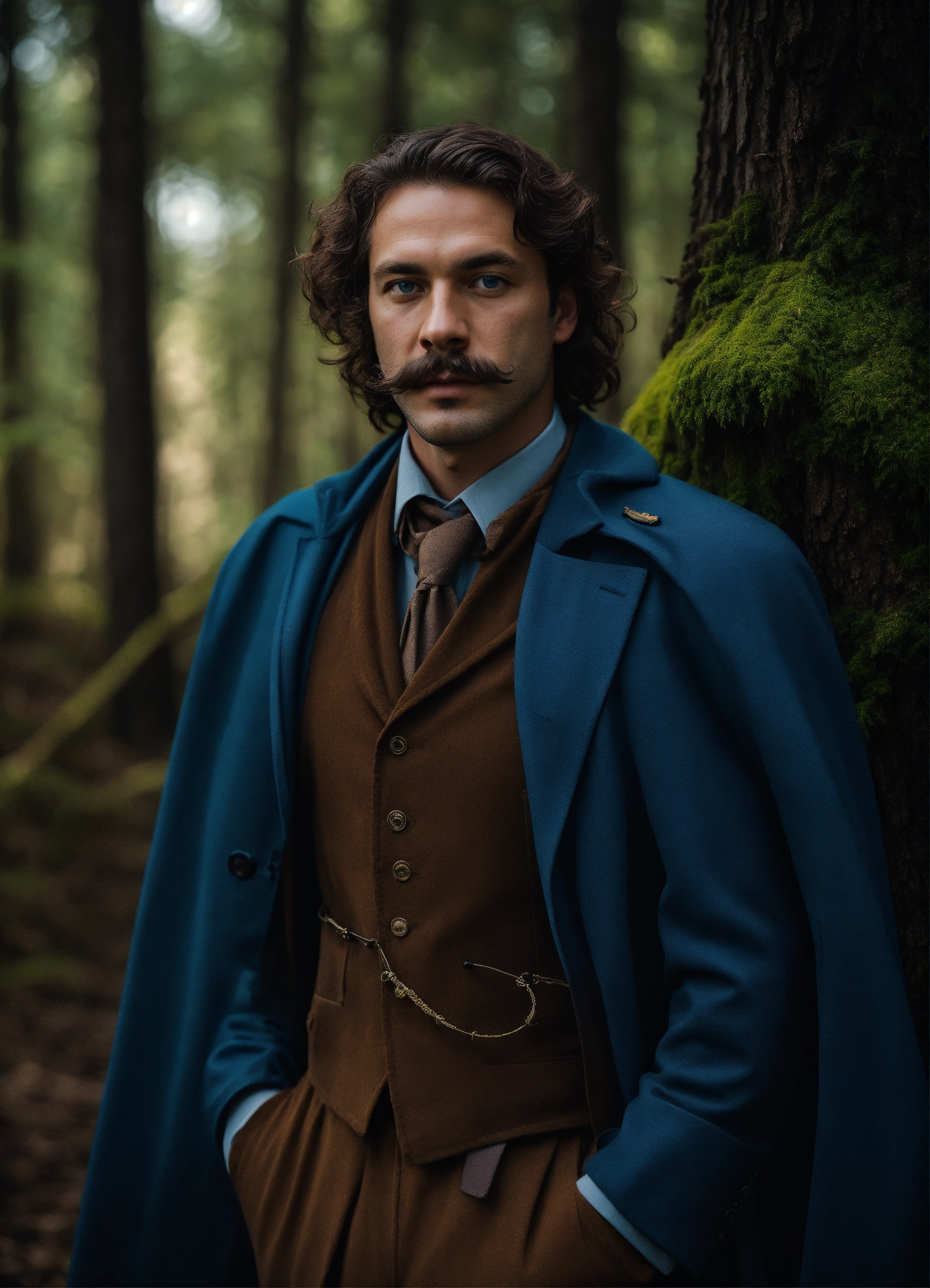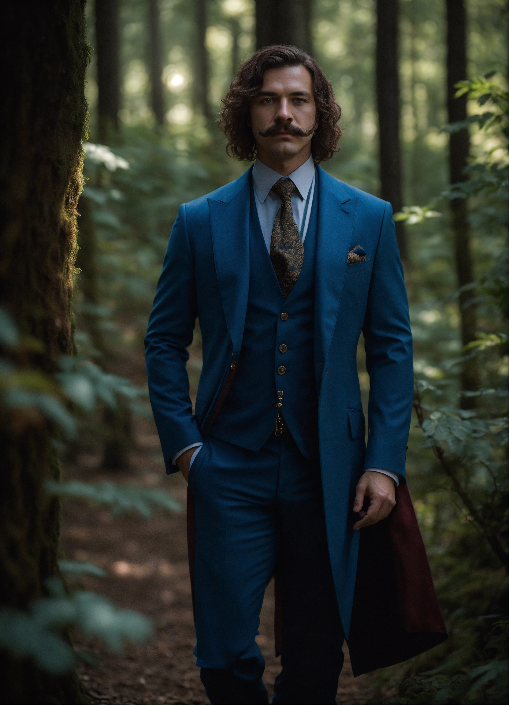 Slick salesman, blue suit and cloak, blue eyes, shoulder length brown hair, curled mustache, in a forest, moody lighting, best quality, full body portrait, real picture, intricate details, depth of field, in a forest, fujifilm xt3, outdoors, bright day, beautiful lighting, raw photo, 8k uhd, film grain, unreal engine 5, ray tracing