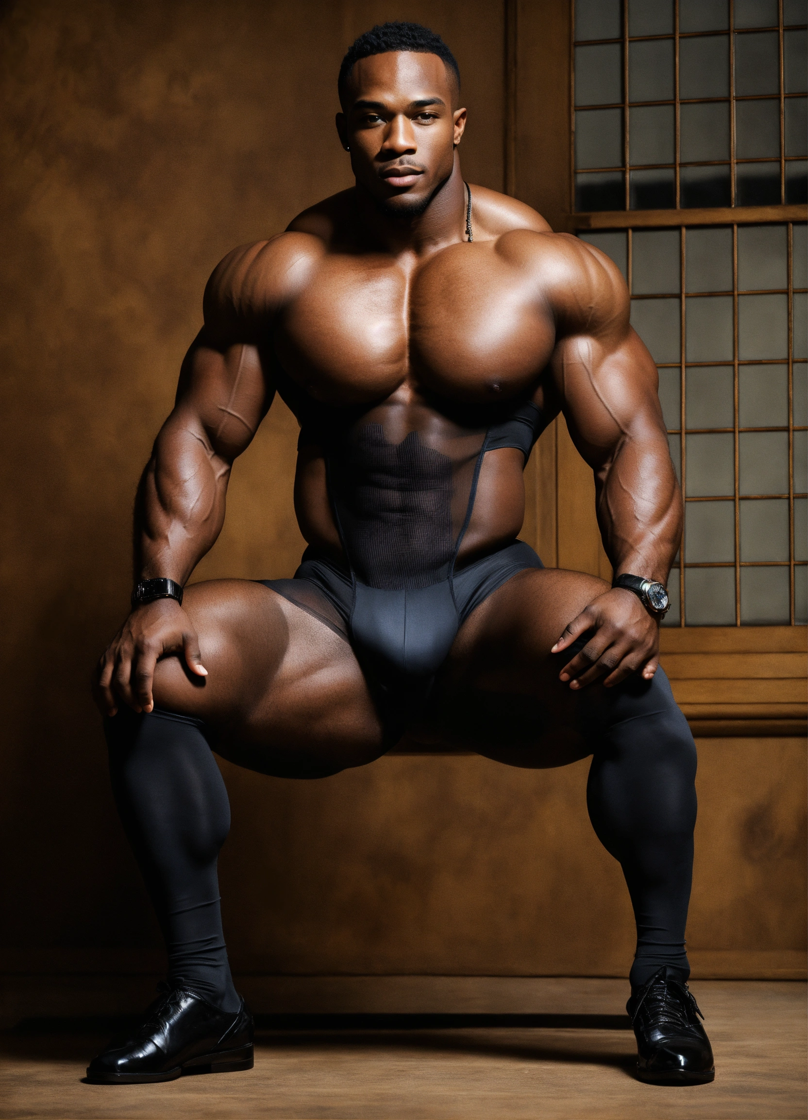 A full picture of a handsome black bodybuilder wearing a sheer leotard and stockings on legs, detailed.