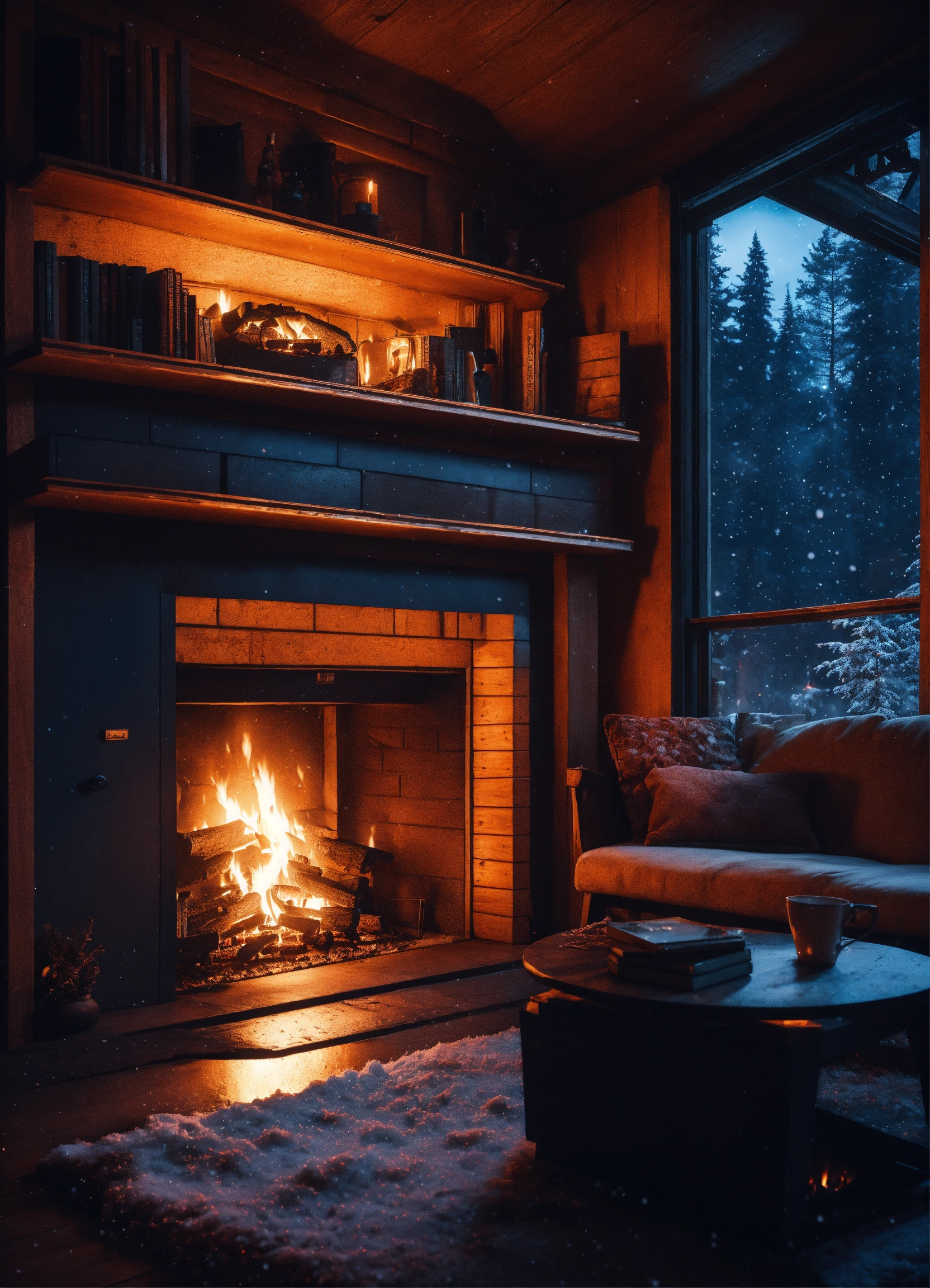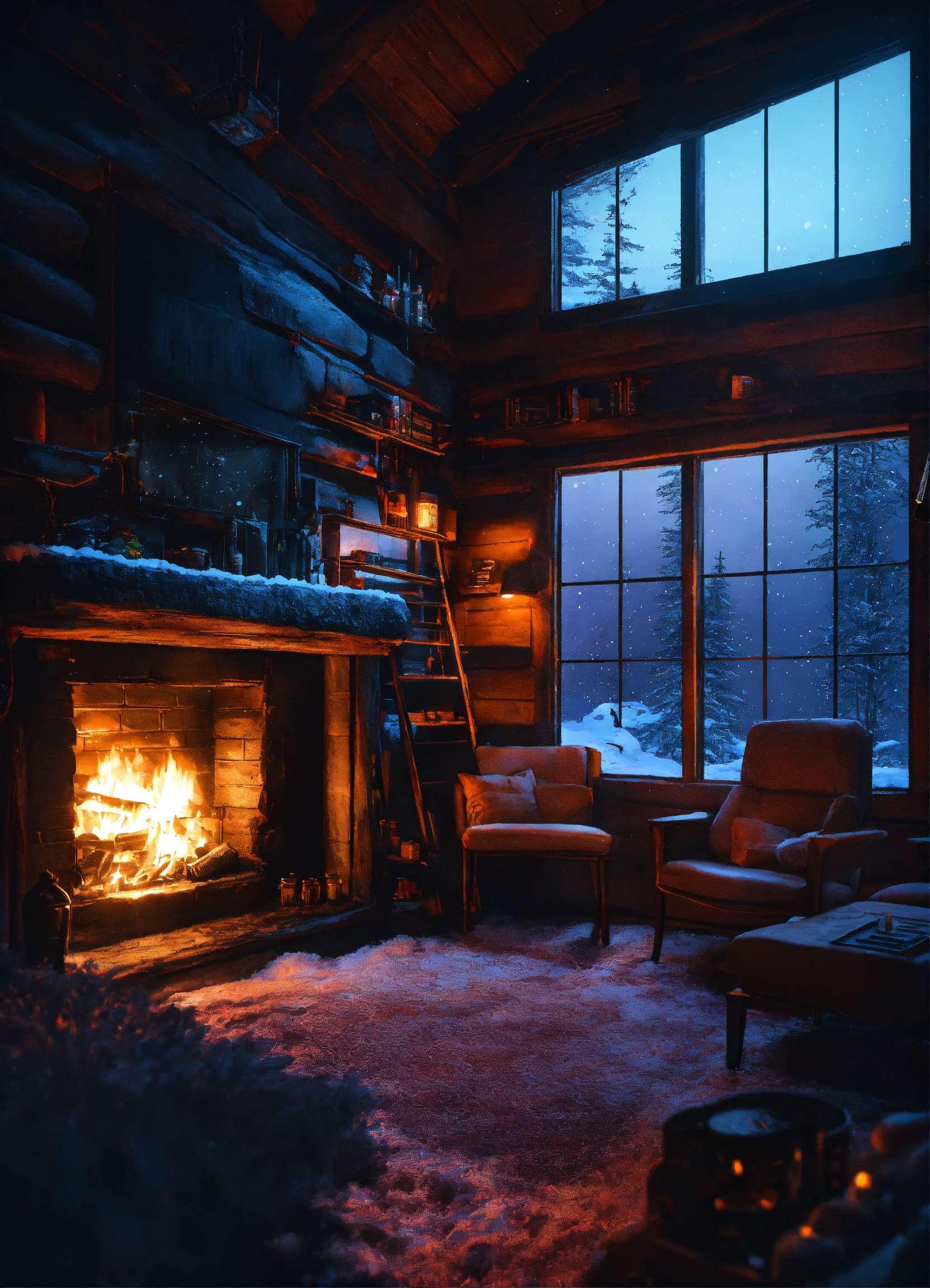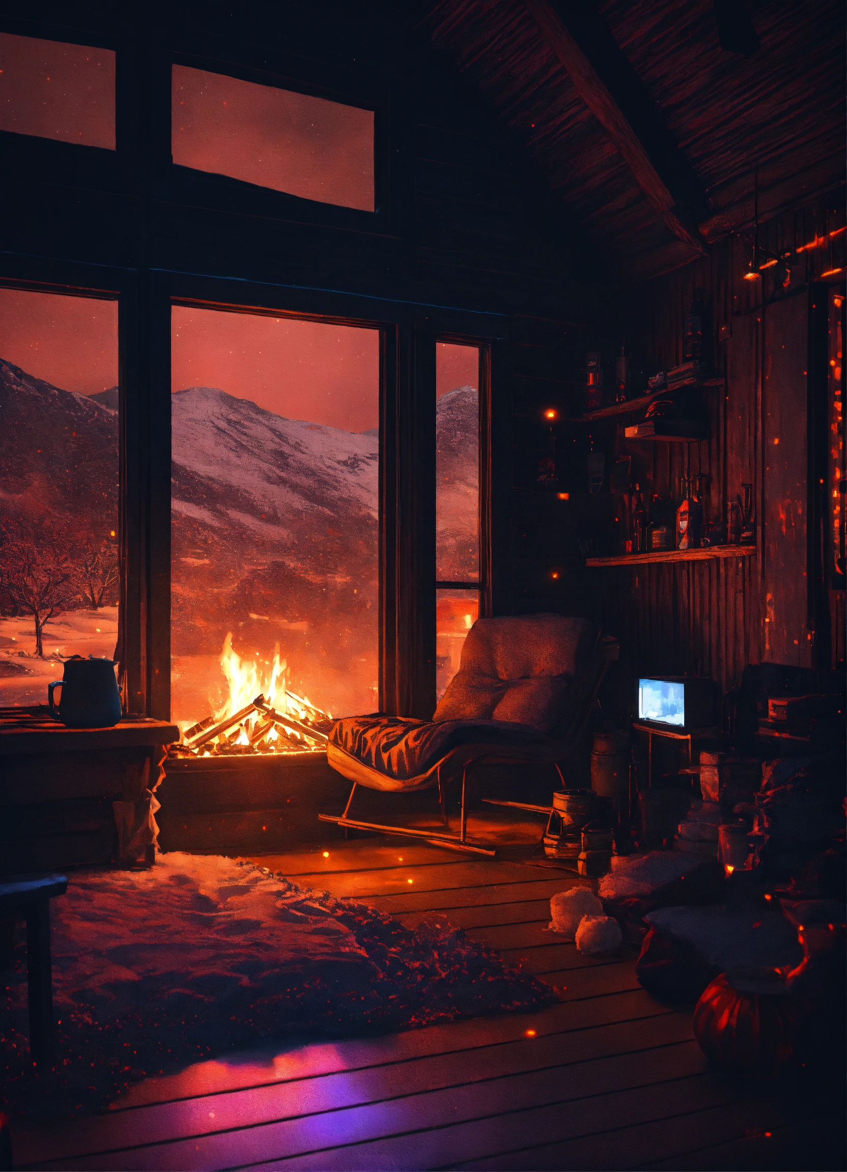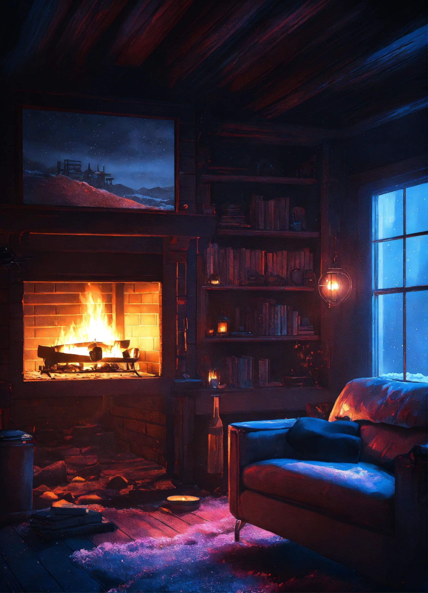 Snowy dark night by the fireplace in a cyberpunk cabin